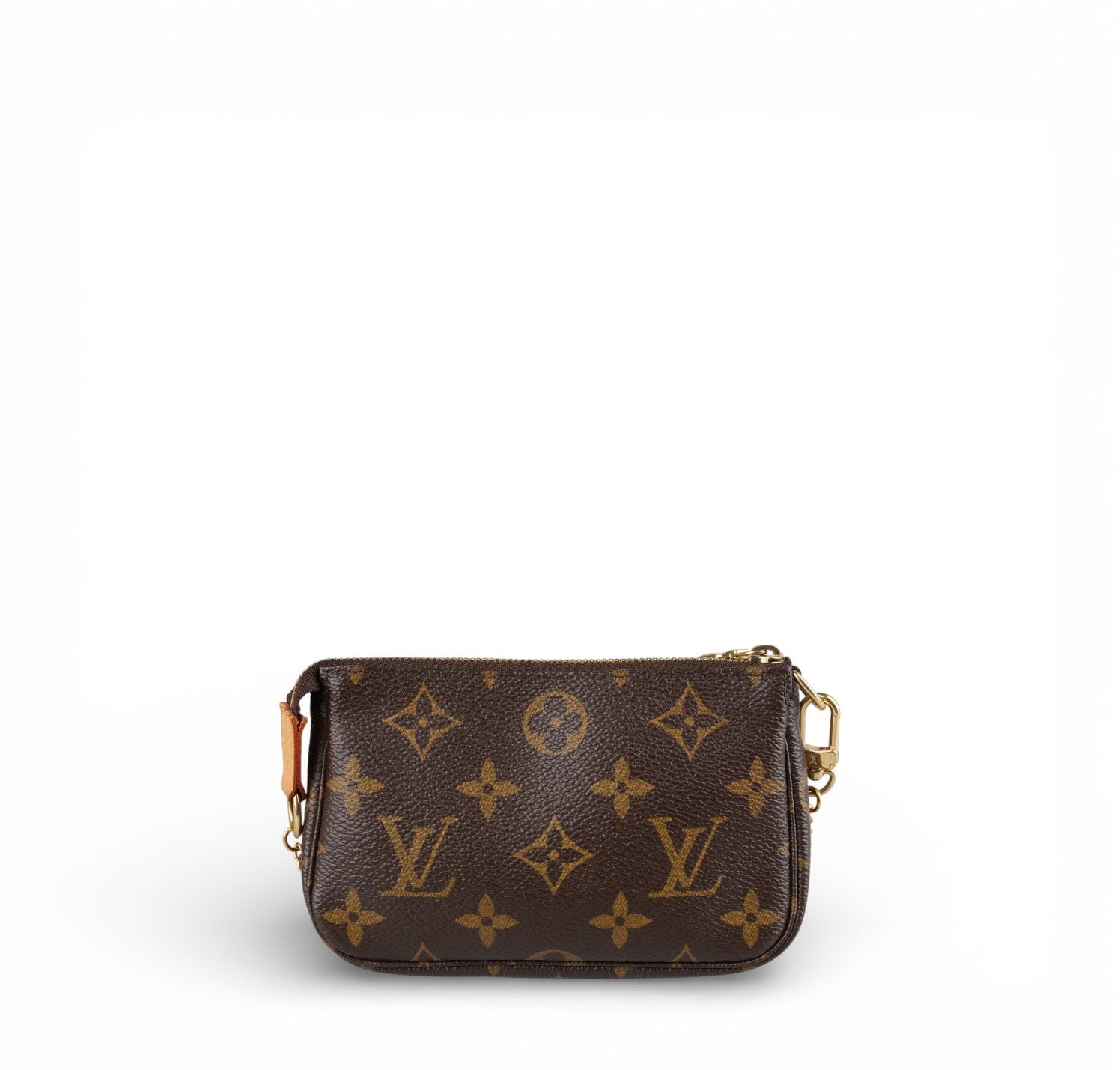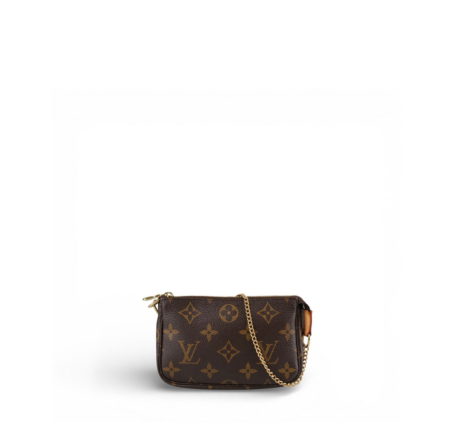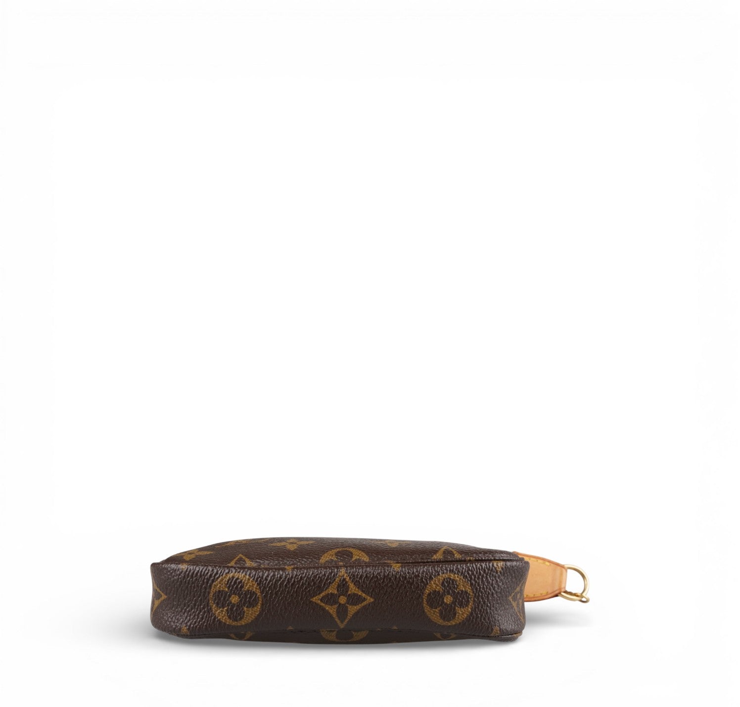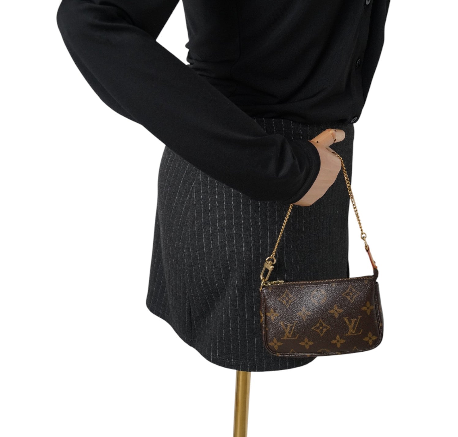 Louis Vuitton Mini Pochette, Accessoires model, made in the iconic Damier Ebene checkered canvas. Brown shiny cowhide finishing. Gold-colored metal parts. Top zip closure. Interior lined in Cherry Red Fabric. Equipped with a top chain handle with hook. Compact in size, ideal for use by hand or as an accessory for larger bags. Very slight general signs of aging.