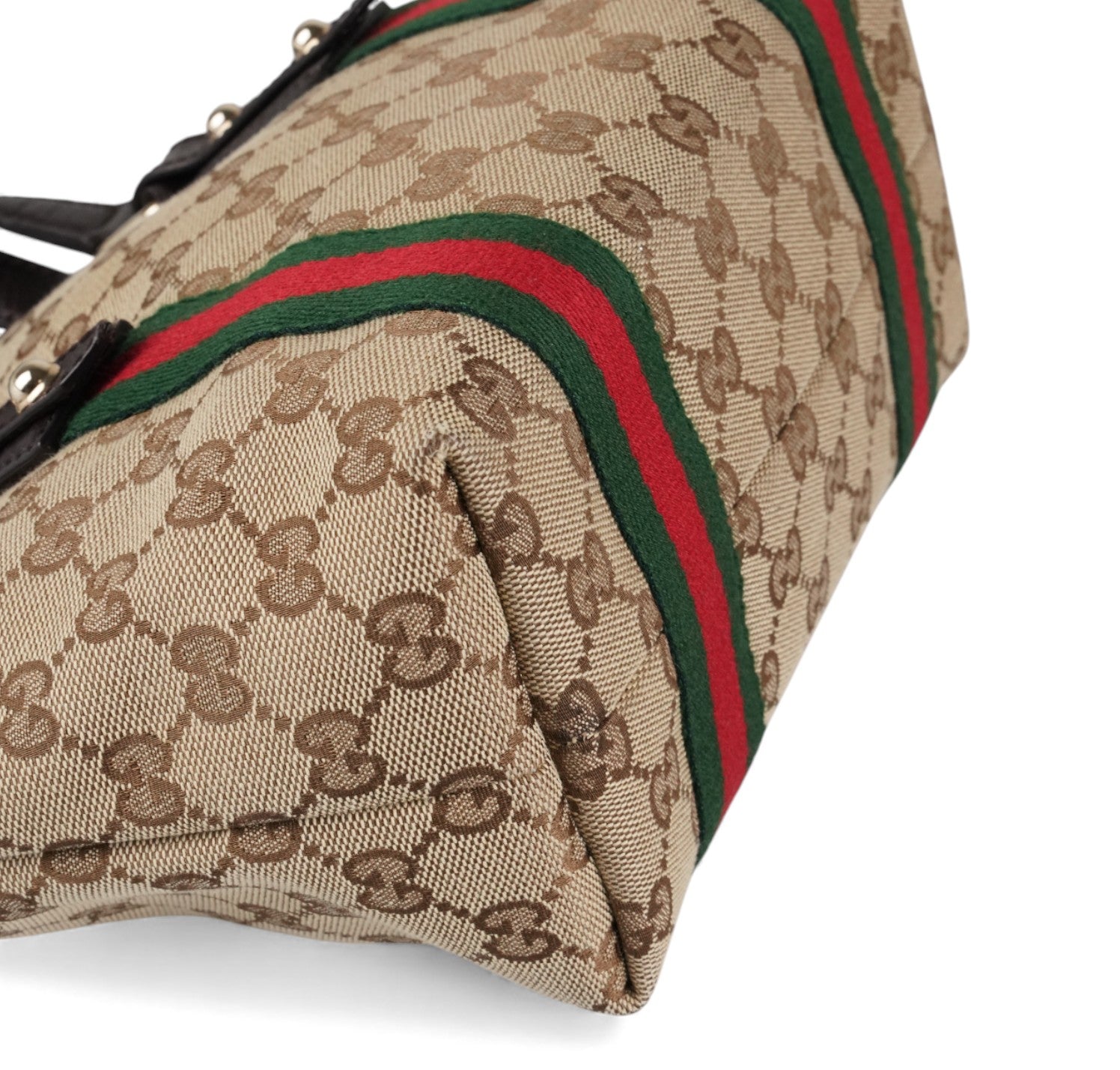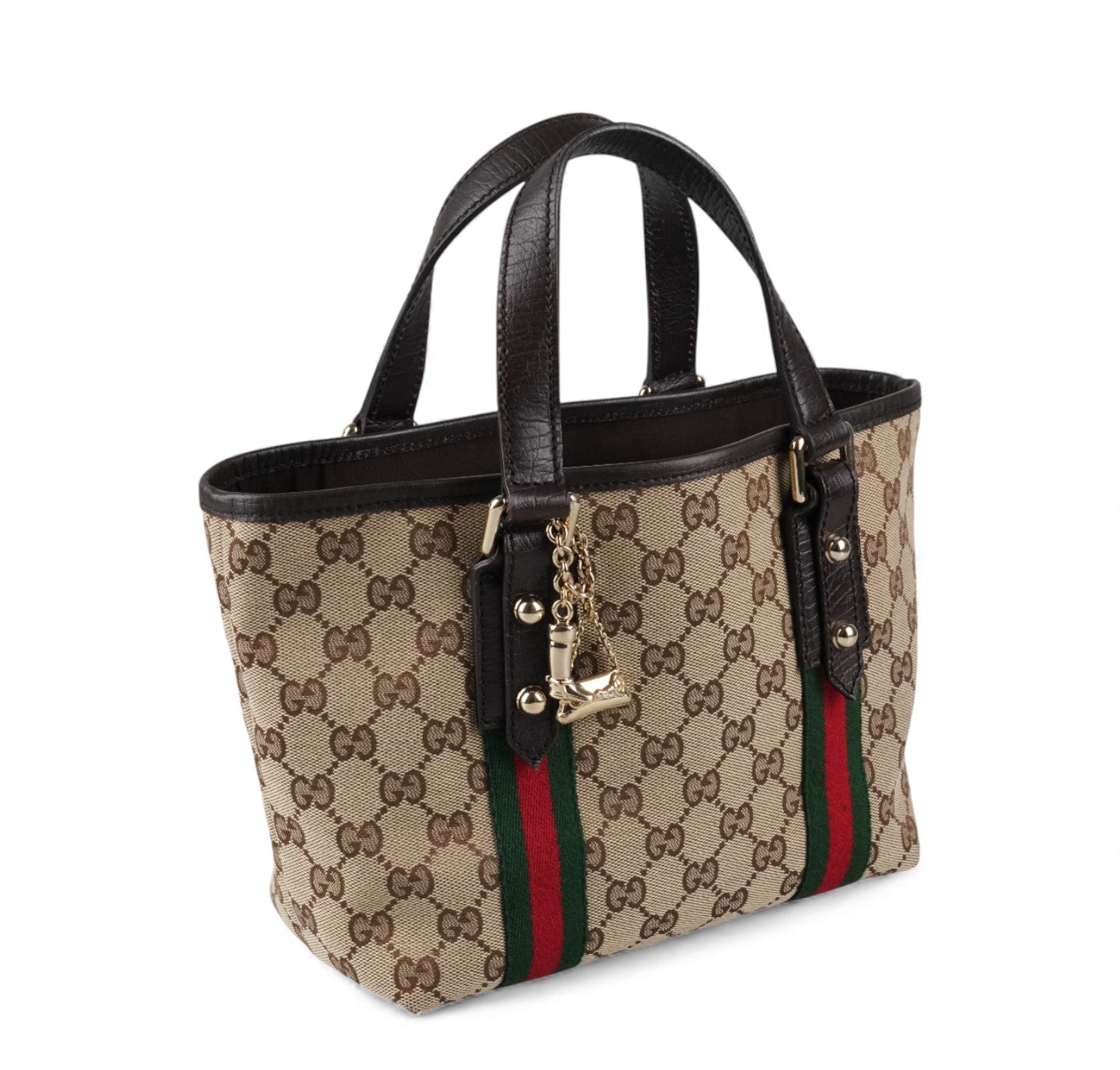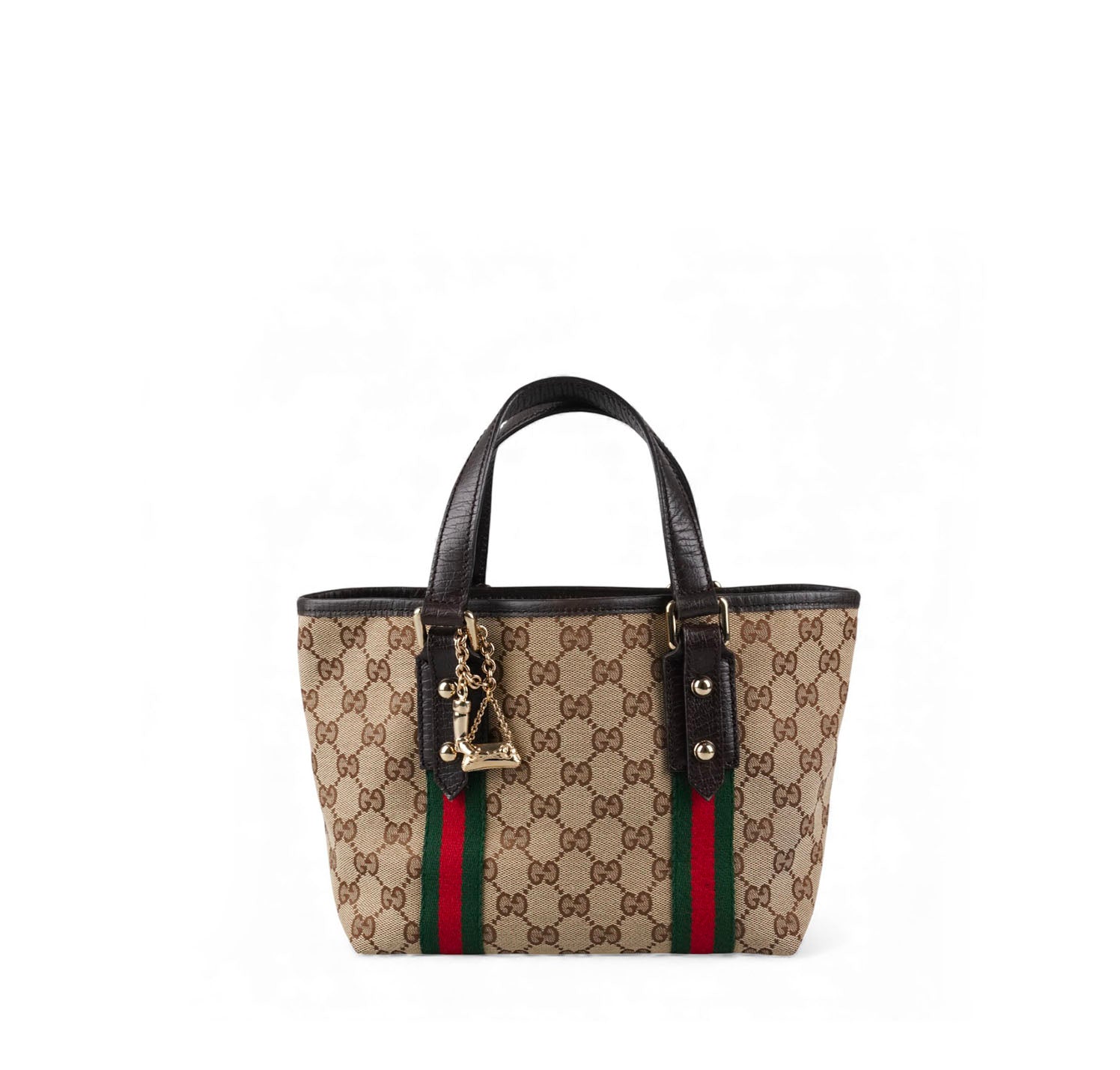 Gucci bag, Mini Tote Jolicoeur model, made of Monogram Canvas embellished with Web band. Ivory leather parts. Gold hardware. Compact but roomy dimensions. It has double upper handles for carrying by hand. Internally lined in fabric with Horsebit print, zip pocket. Enriched by Charm with Horsebit Bag and boot. Slight general signs of aging on leather, hardware. Base width 22 cm, total width 30 cm.
