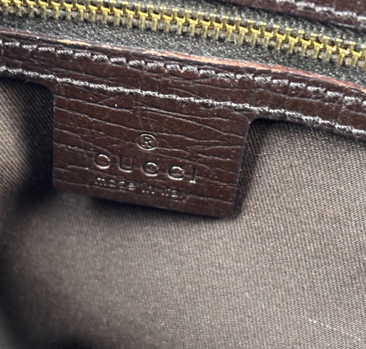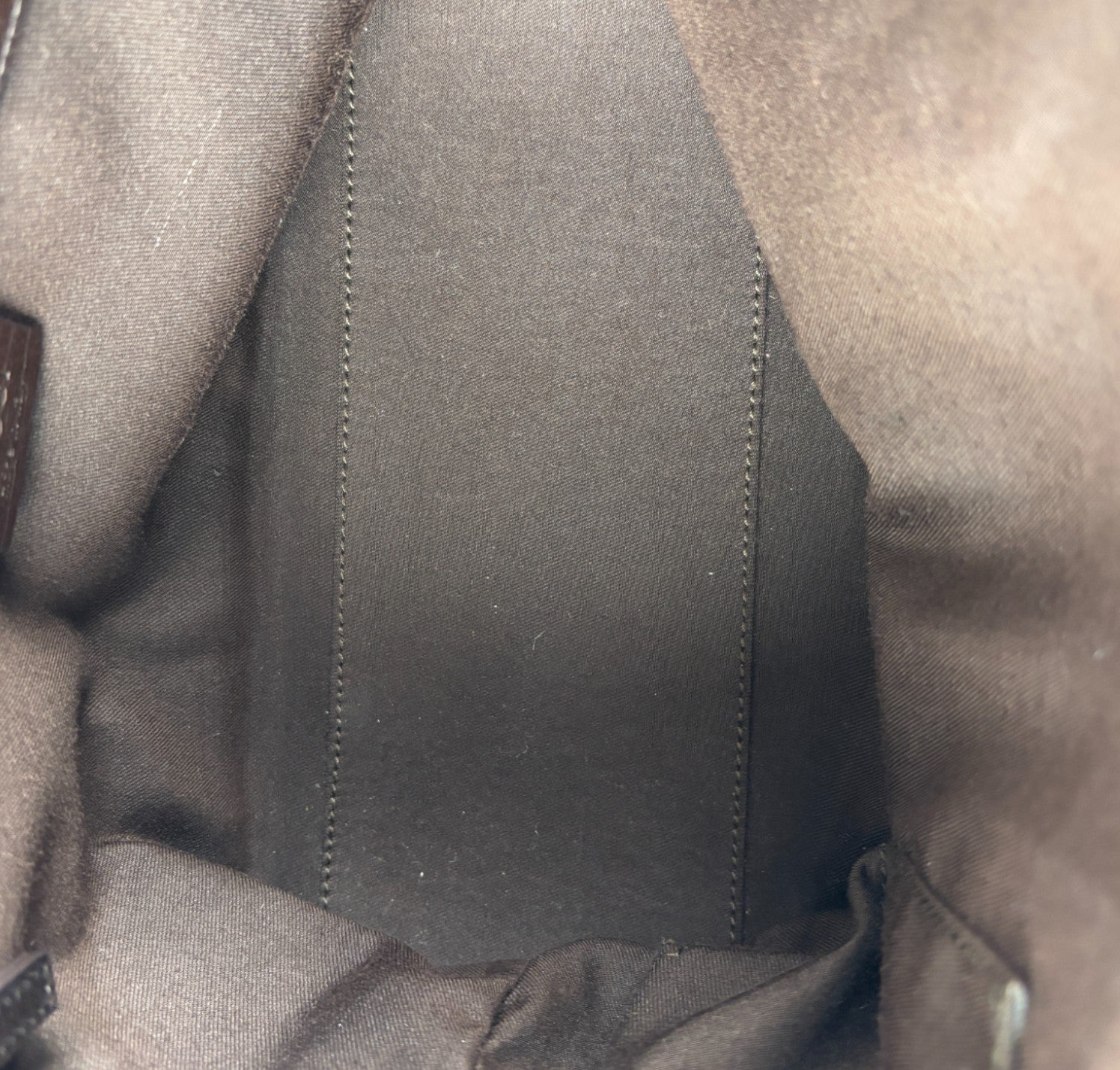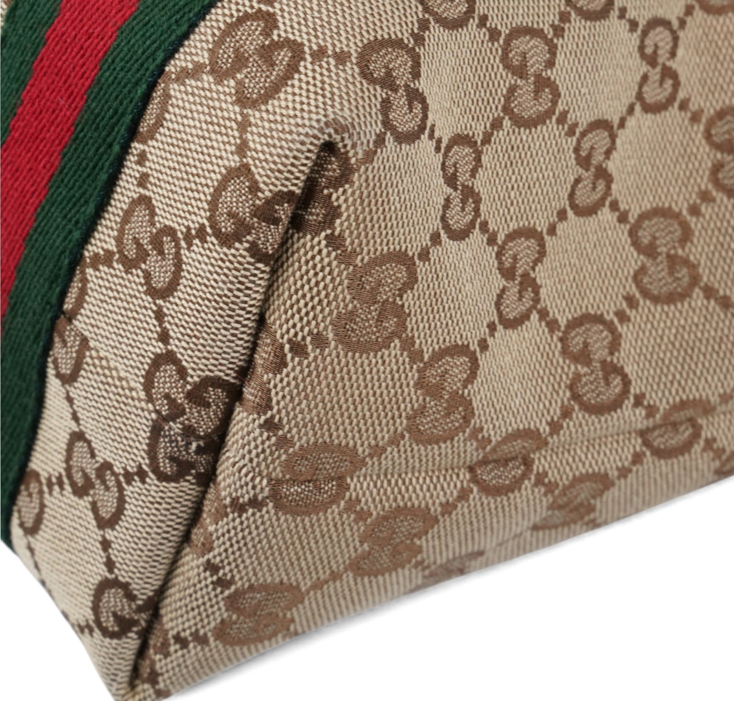 Gucci bag, Mini Tote Jolicoeur model, made of Monogram Canvas embellished with Web band. Ivory leather parts. Gold hardware. Compact but roomy dimensions. It has double upper handles for carrying by hand. Internally lined in fabric with Horsebit print, zip pocket. Enriched by Charm with Horsebit Bag and boot. Slight general signs of aging on leather, hardware. Base width 22 cm, total width 30 cm.