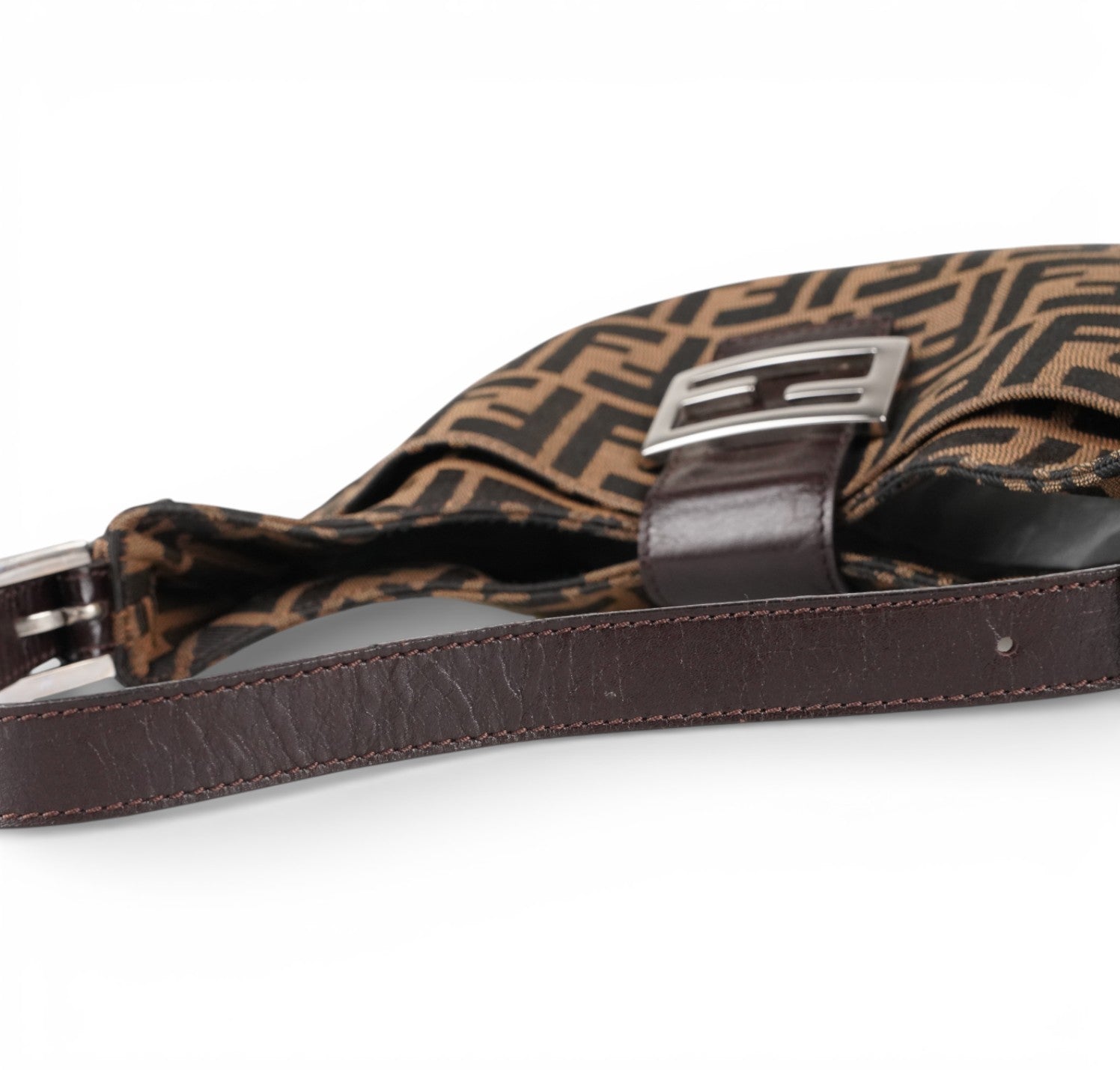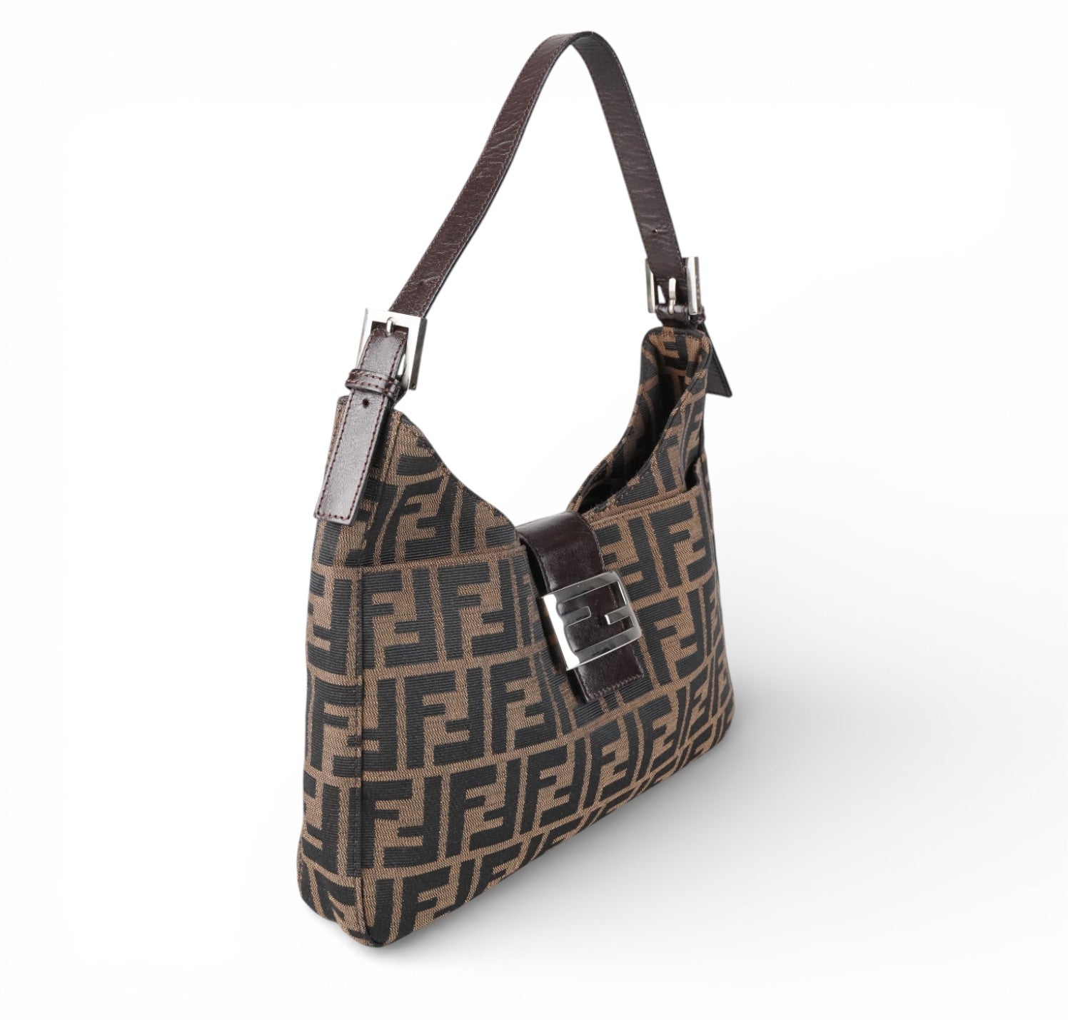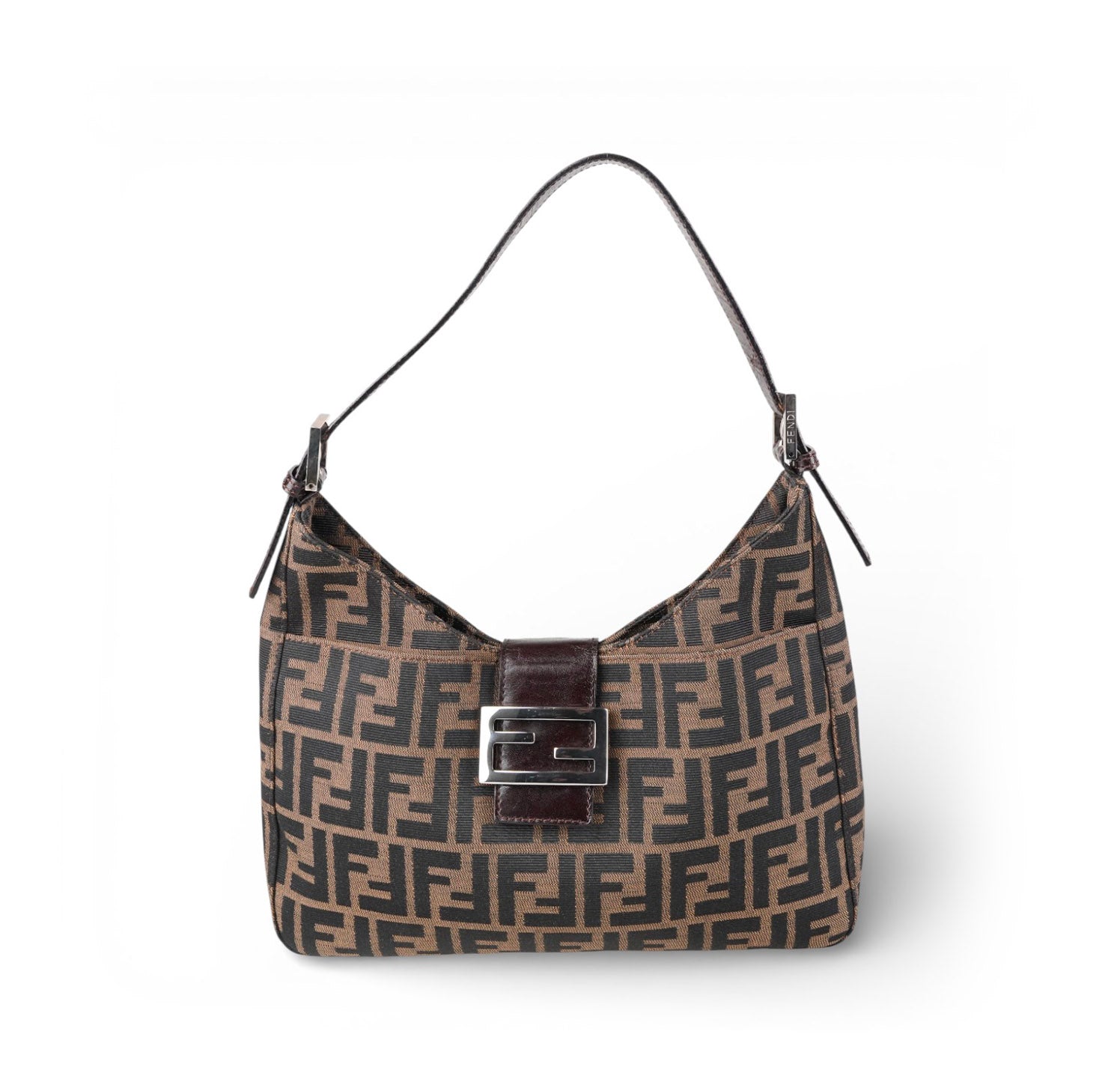 Fendi Bag, Mamma Baguette Moon model, made of Brown Zucca Canvas with tone-on-tone Leather details and shiny silver metal parts. The compact half-moon design features a flap closure with magnetic button and FF logo. The interior is lined in fabric and has a practical zip pocket. In excellent general condition, with normal signs of use and micro scratches on metal parts.