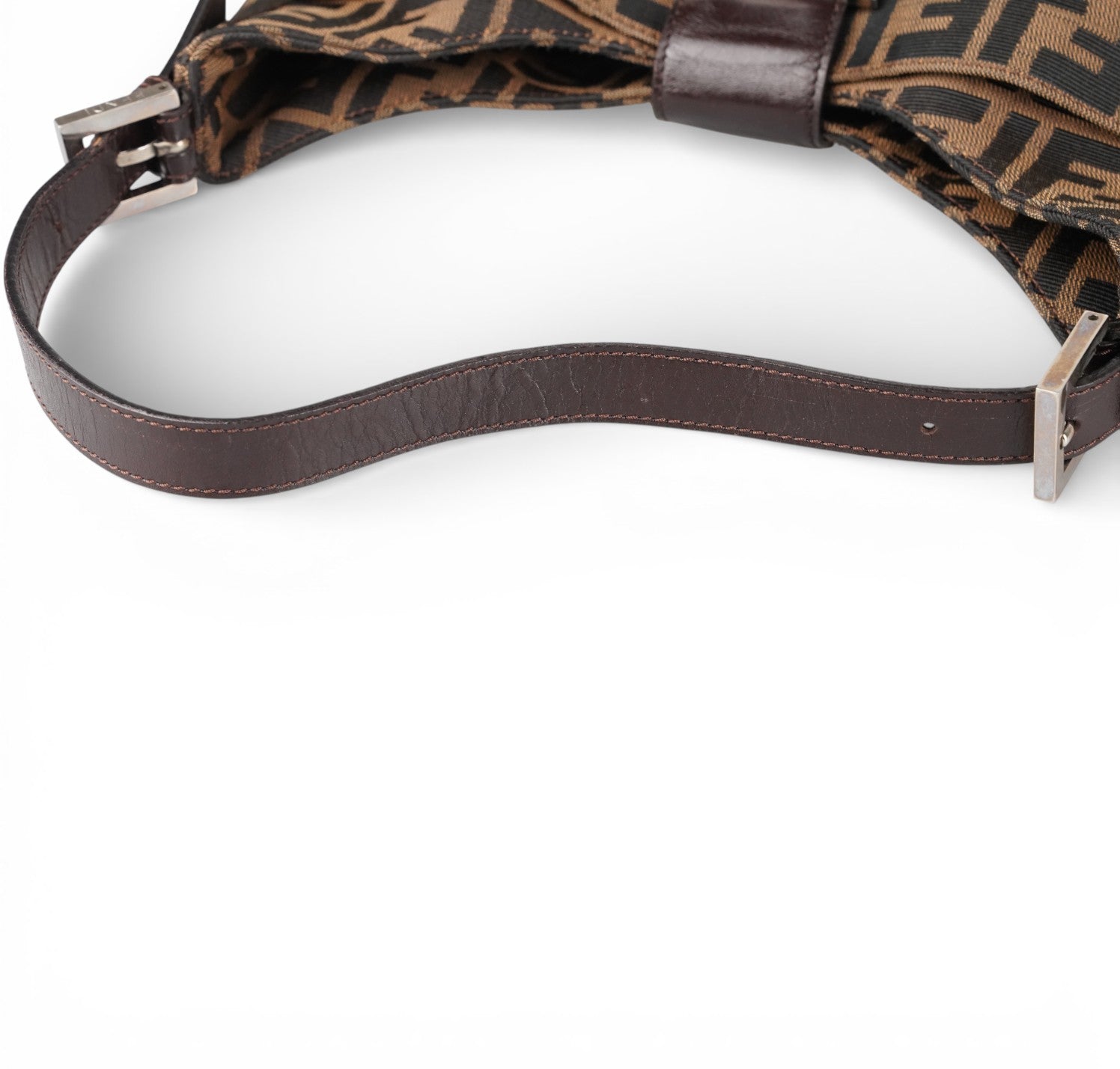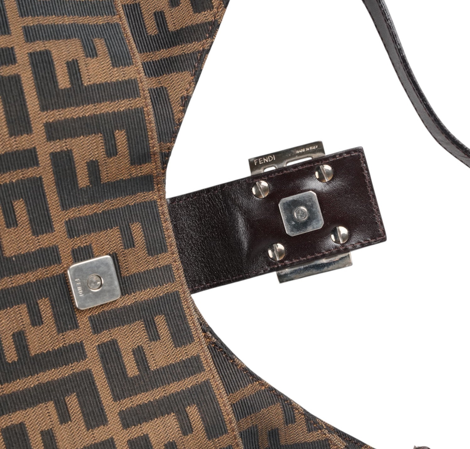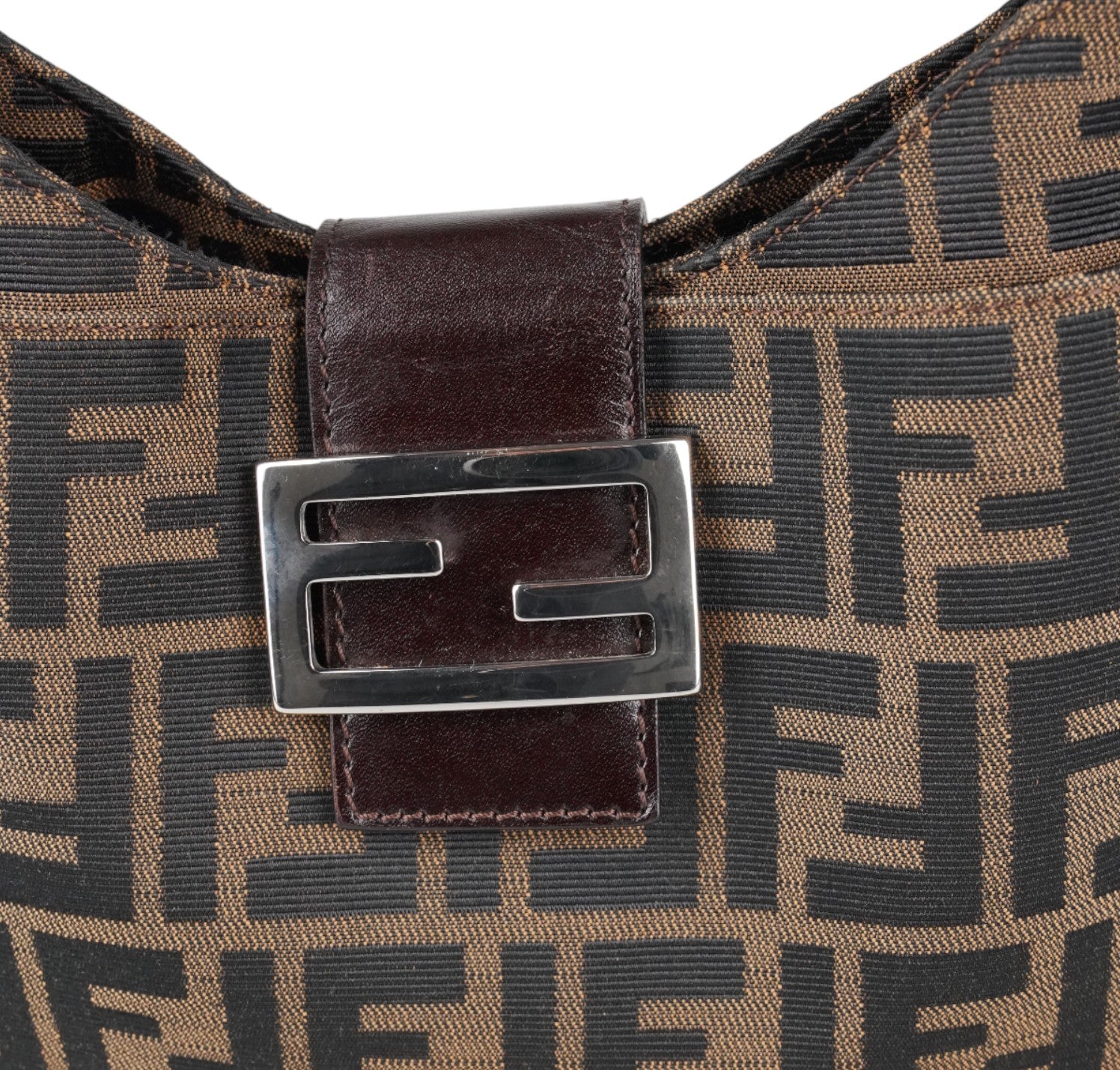 Fendi Bag, Mamma Baguette Moon model, made of Brown Zucca Canvas with tone-on-tone Leather details and shiny silver metal parts. The compact half-moon design features a flap closure with magnetic button and FF logo. The interior is lined in fabric and has a practical zip pocket. In excellent general condition, with normal signs of use and micro scratches on metal parts.
