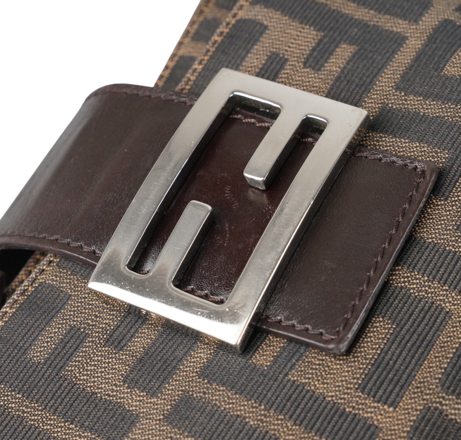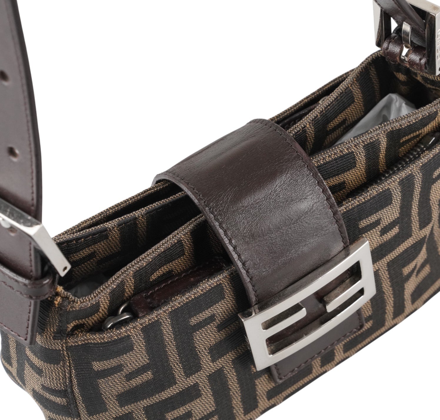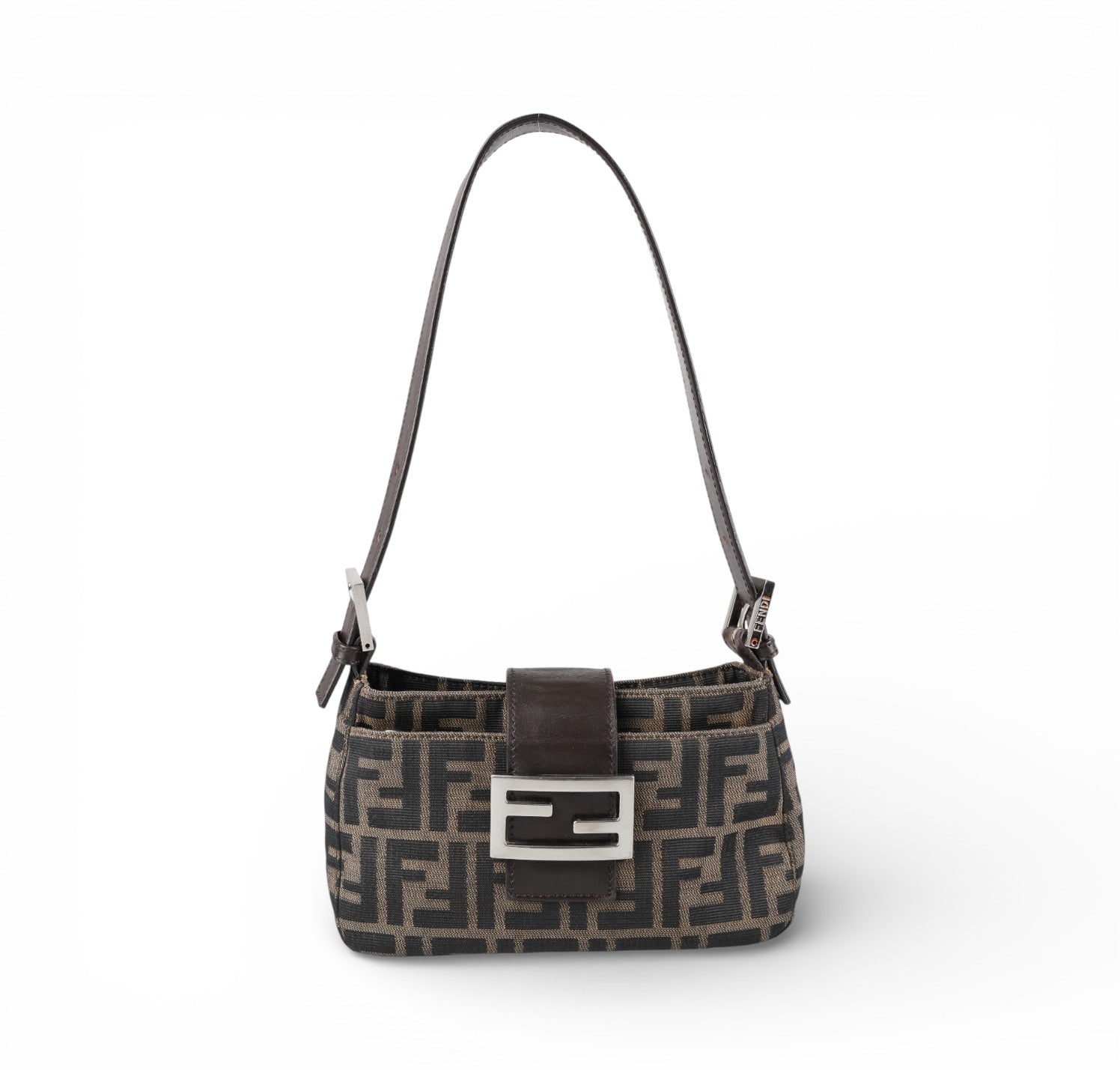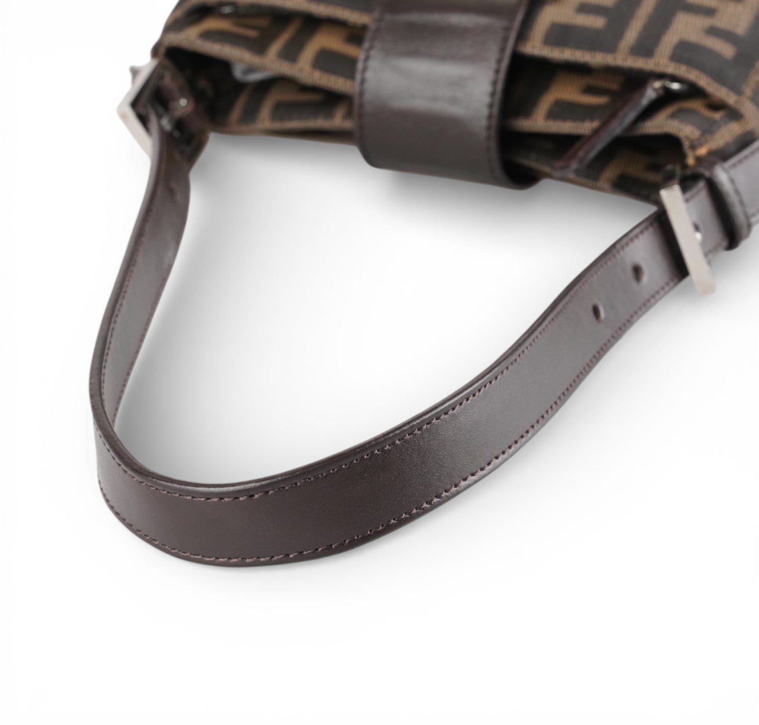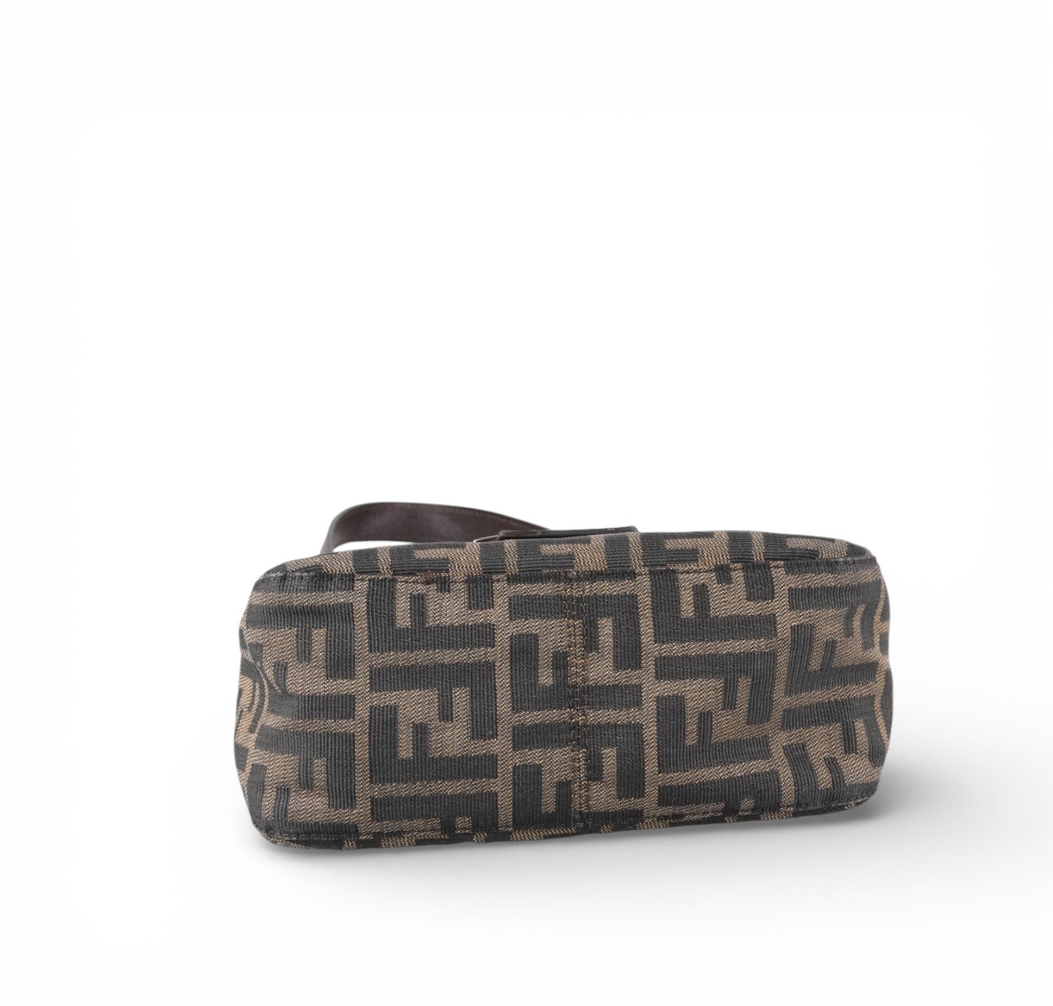 Fendi Bag, Mamma Baguette Moon model, made of Brown Zucca Canvas with tone-on-tone Leather details and shiny silver metal parts. The compact half-moon design features a flap closure with magnetic button and FF logo. The interior is lined in fabric and has a practical zip pocket. In excellent general condition, with normal signs of use and micro scratches on metal parts.