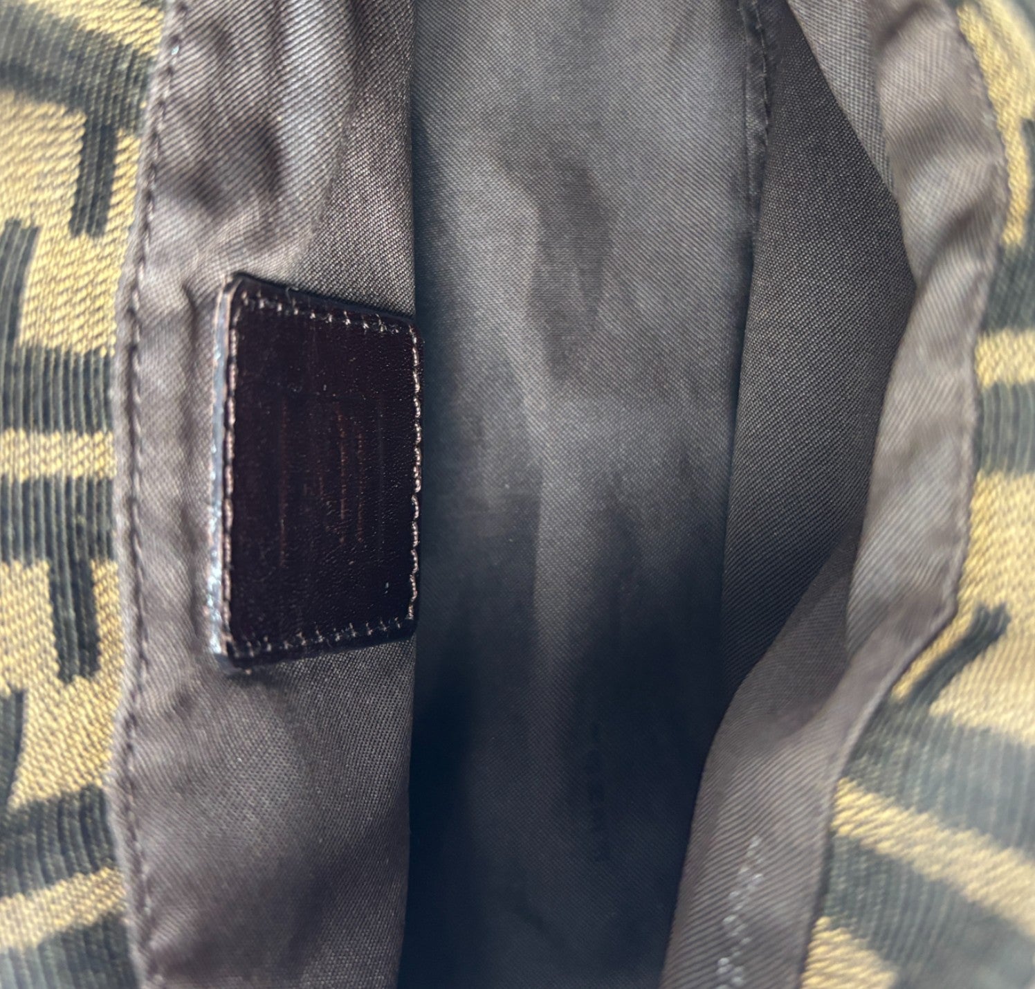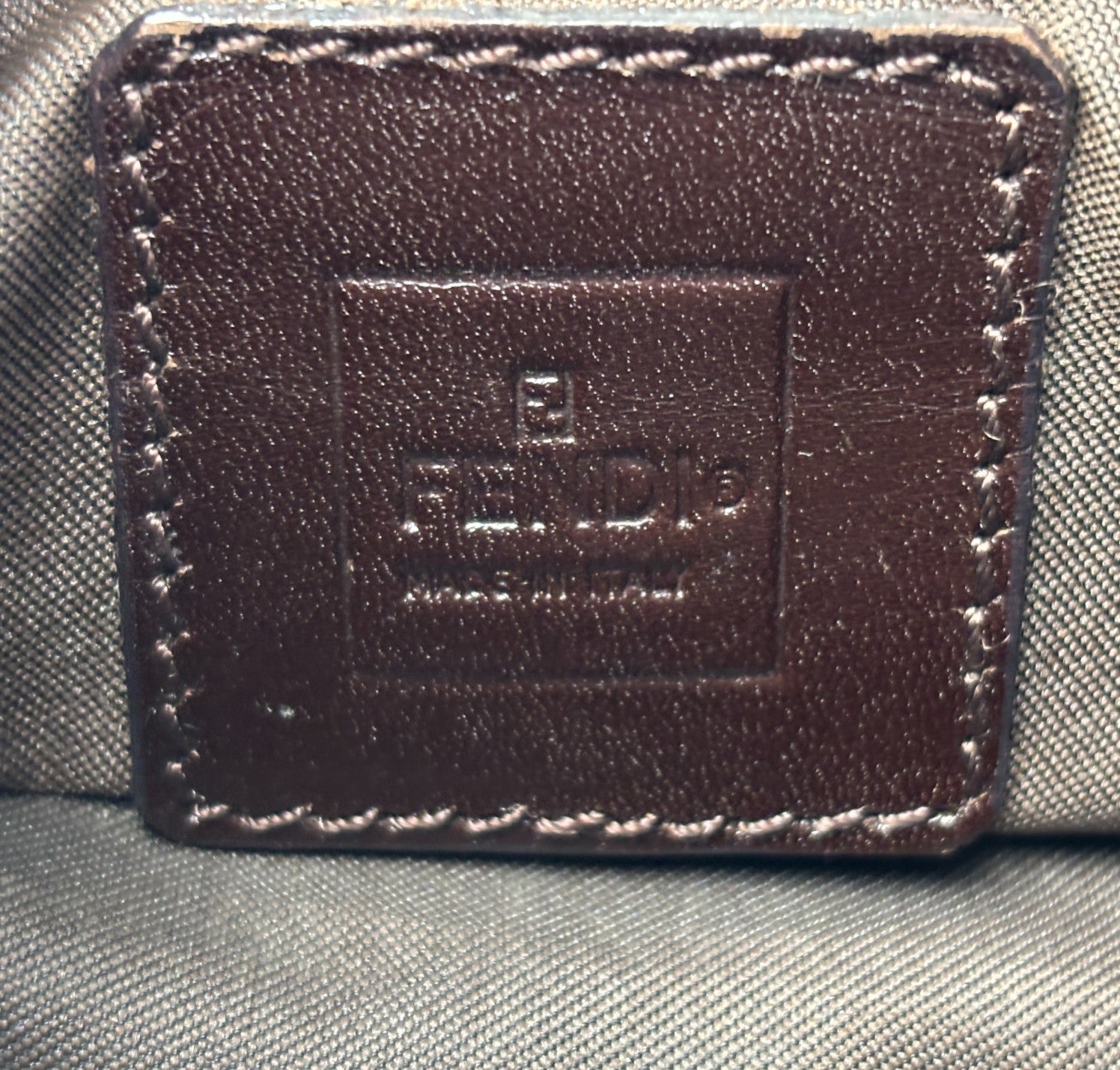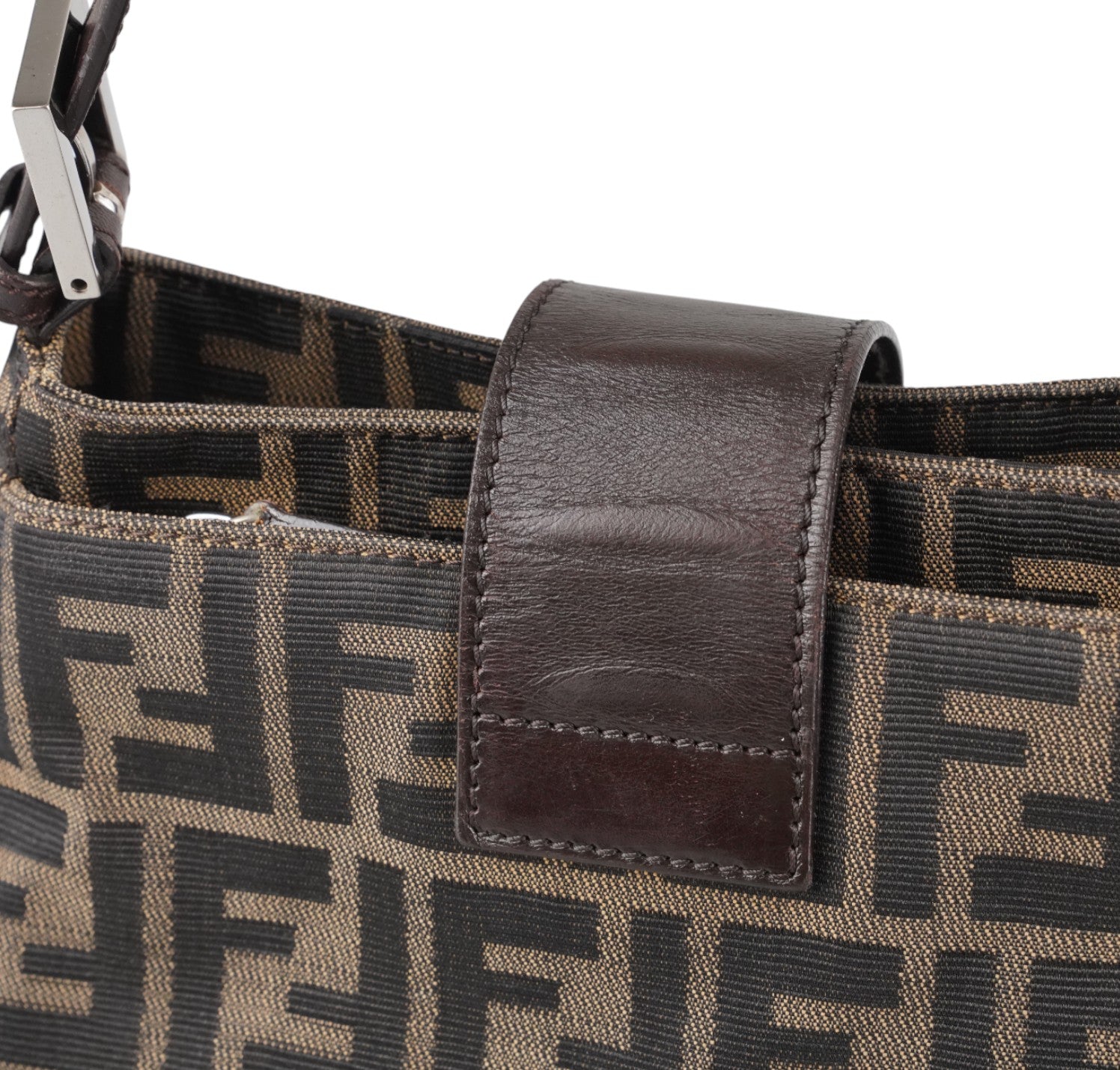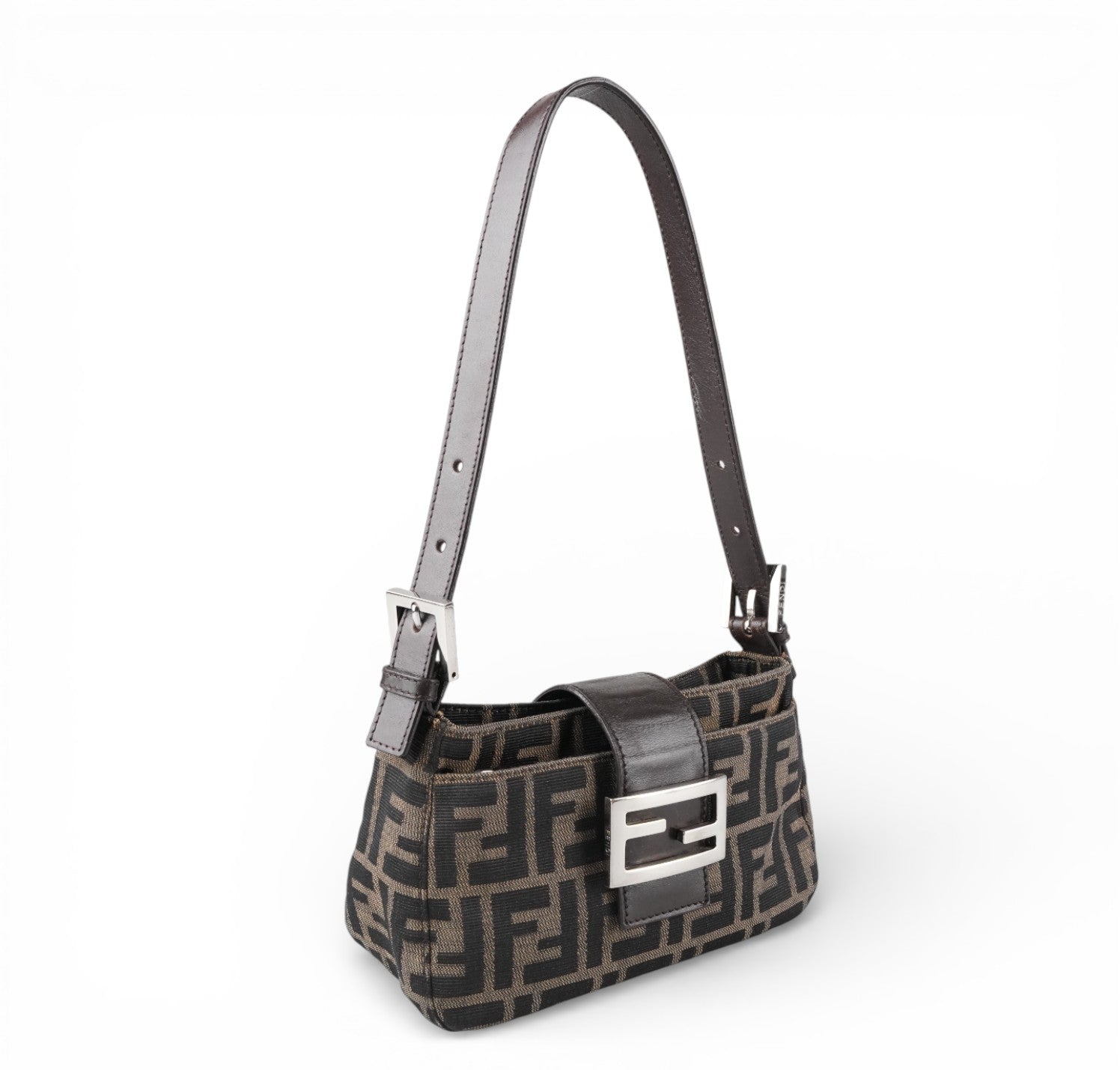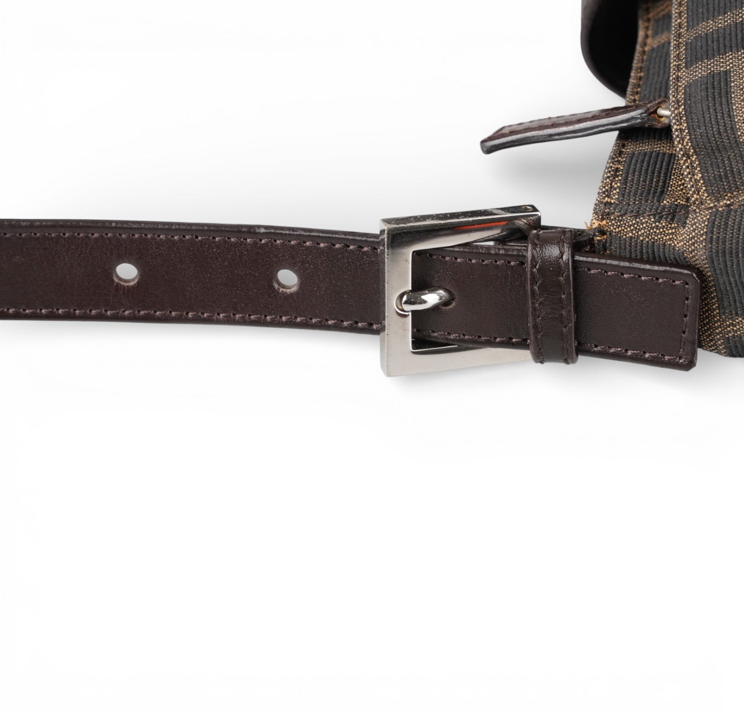 Fendi Bag, Mamma Baguette Moon model, made of Brown Zucca Canvas with tone-on-tone Leather details and shiny silver metal parts. The compact half-moon design features a flap closure with magnetic button and FF logo. The interior is lined in fabric and has a practical zip pocket. In excellent general condition, with normal signs of use and micro scratches on metal parts.