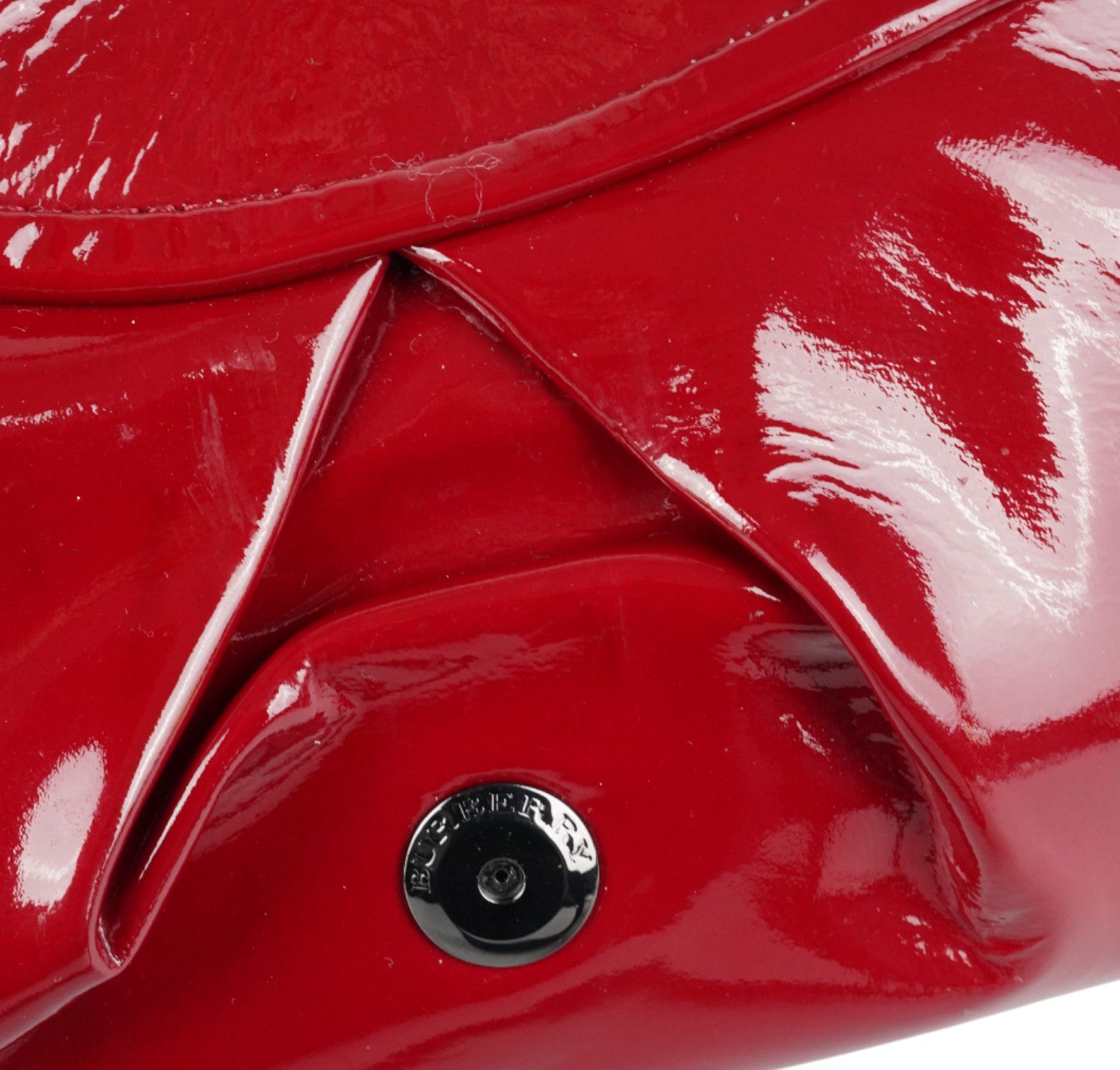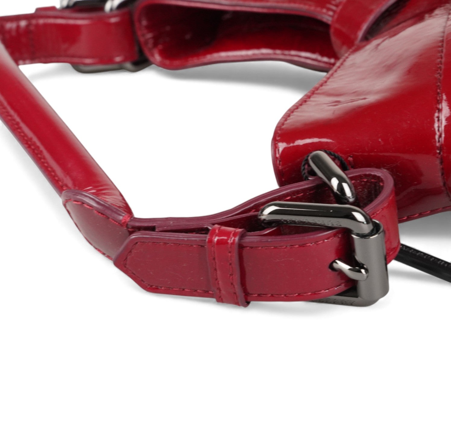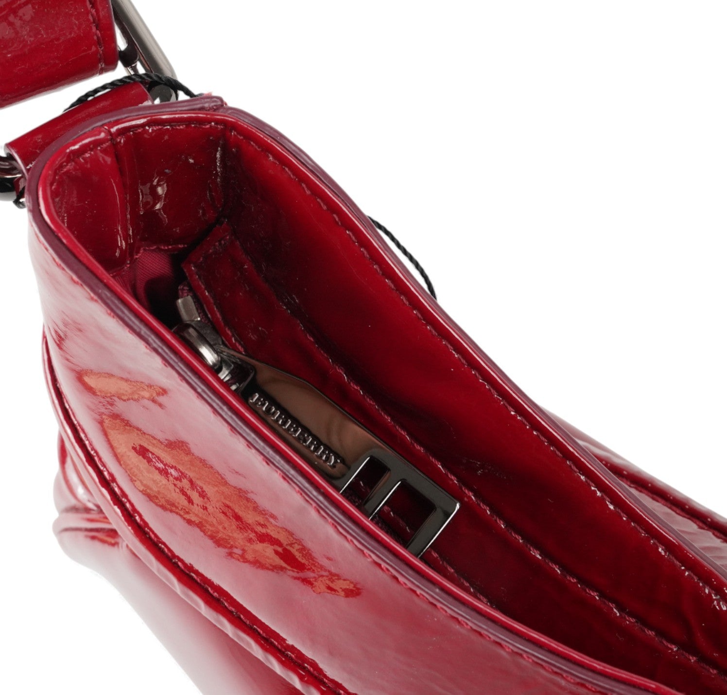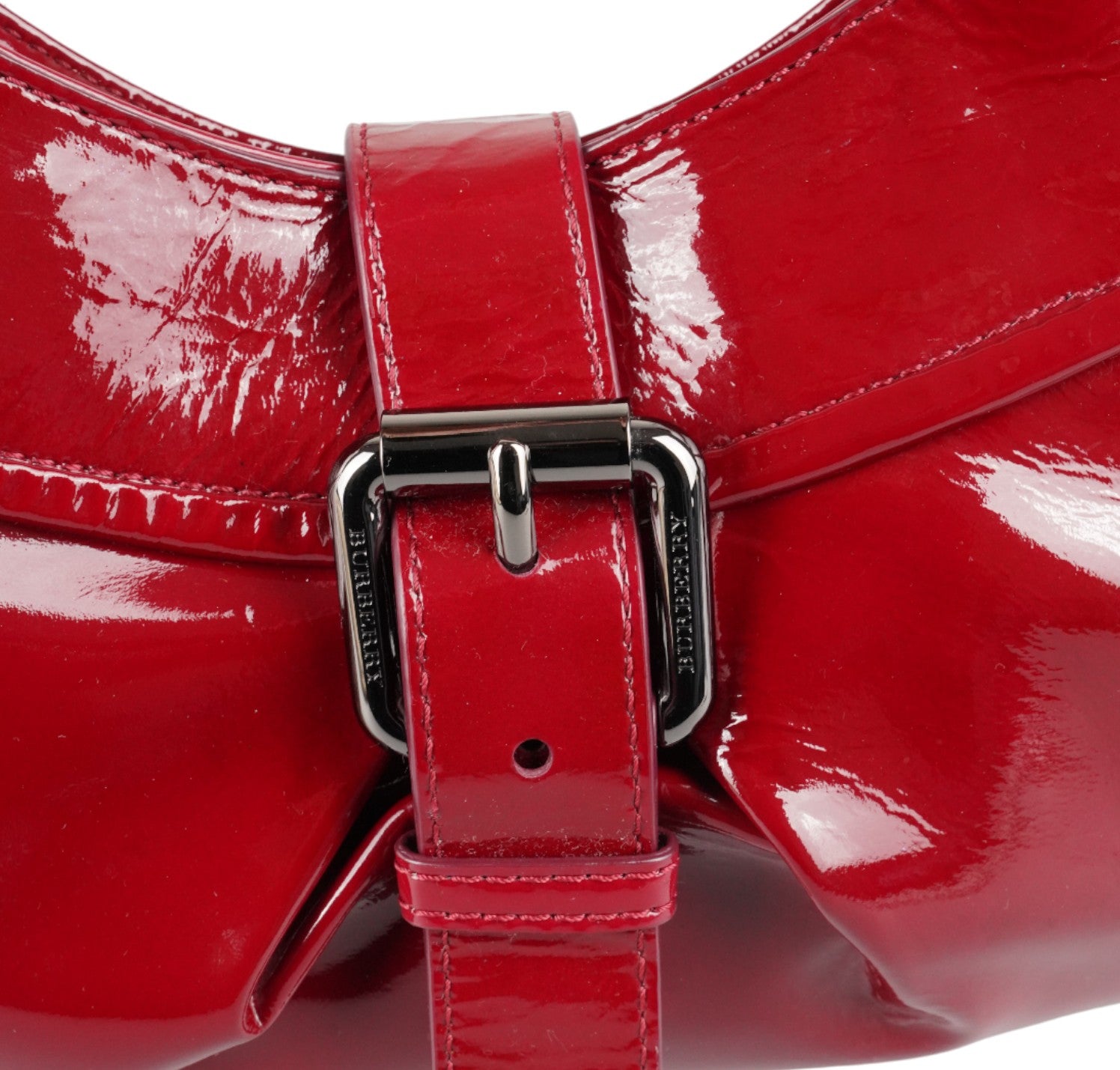 Borsa Burberry, modello Moon, in pelle lucida Rosso Ciliegia, con chiusura a fibbia magnetica centrale e metalleria canna di fucile. La forma a mezzaluna e il manico regolabile rendono il modello un sottospalla chic e versatile. Interno in tessuto con tasca con zip. Lievi aloni superficiali su pelle, micro graffi metalleria.