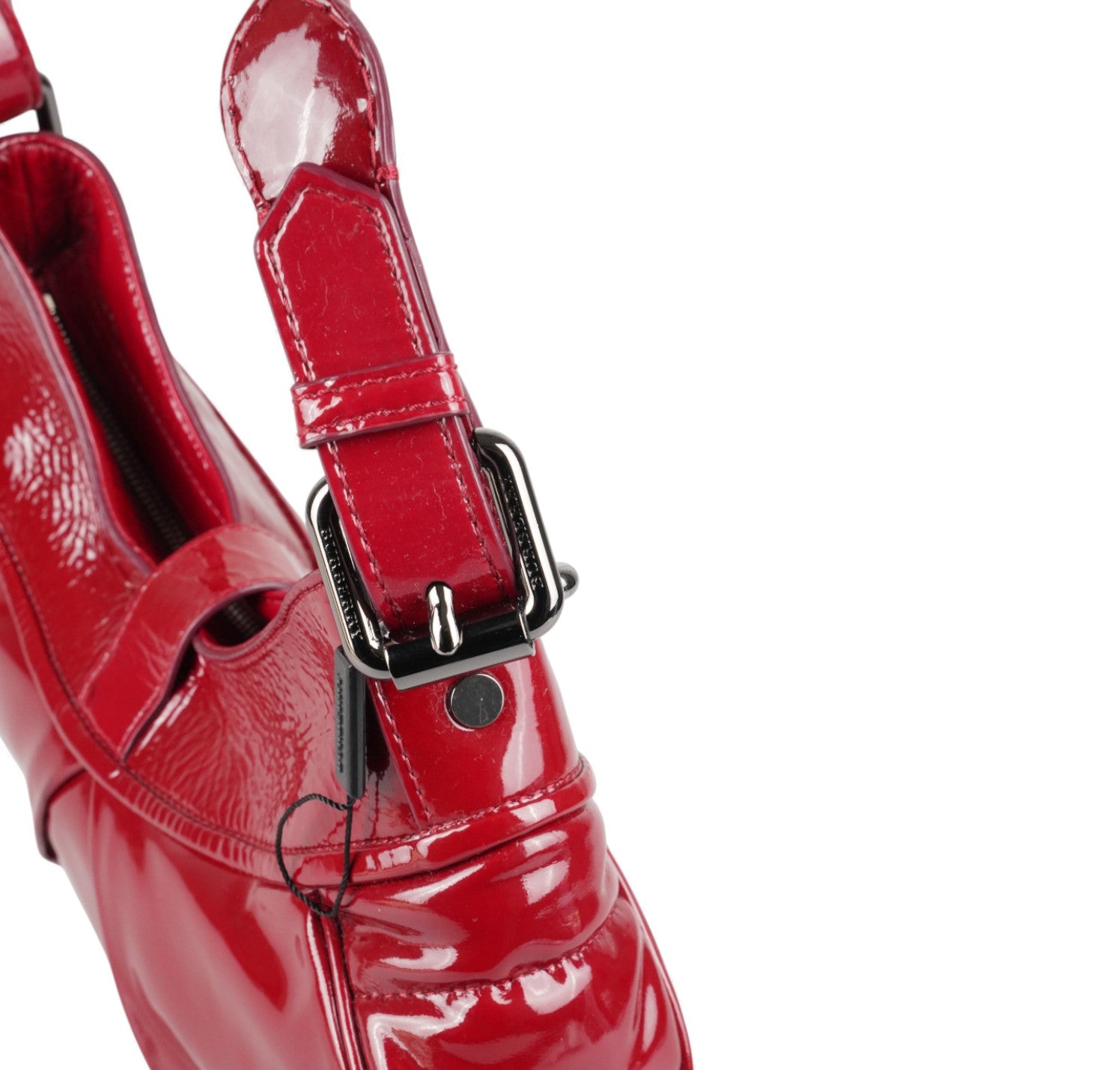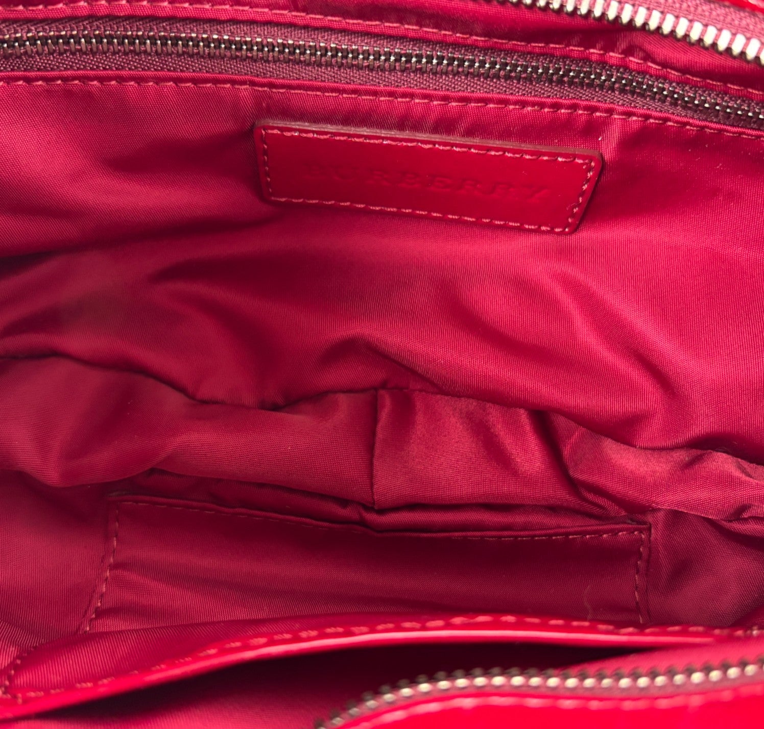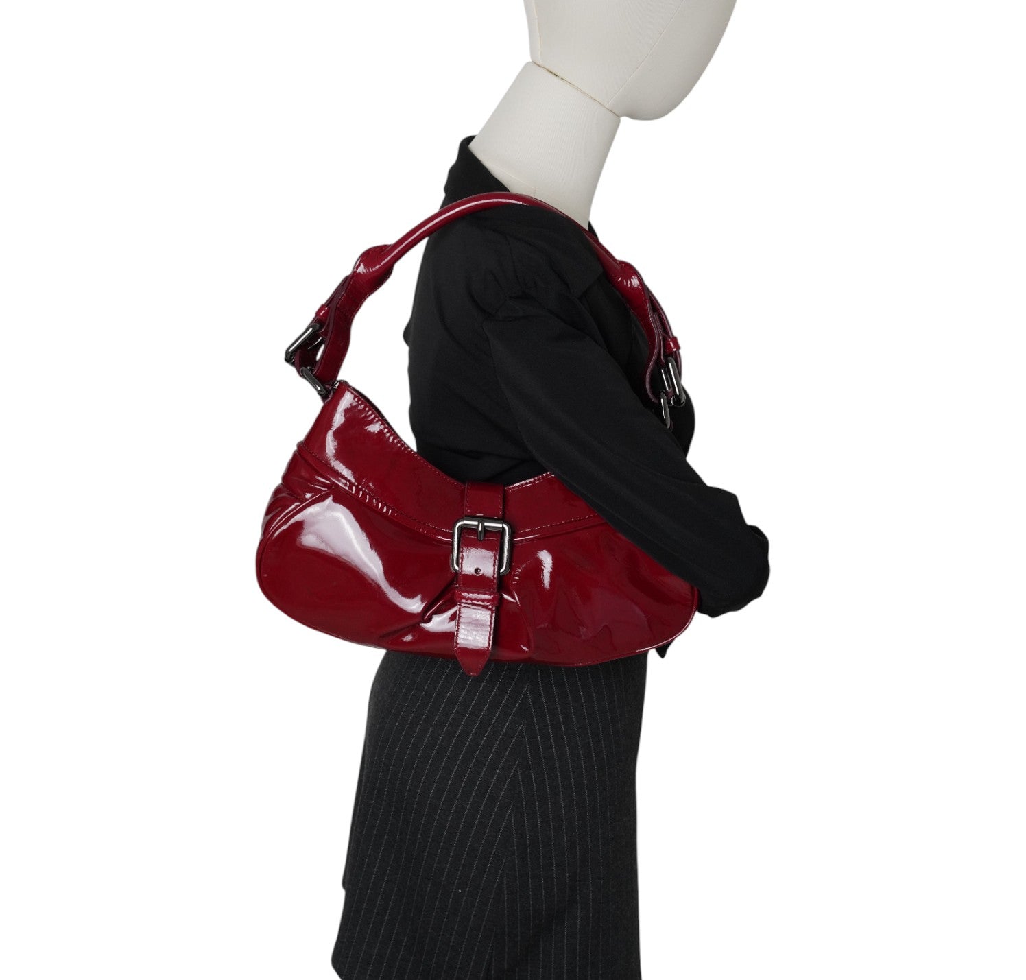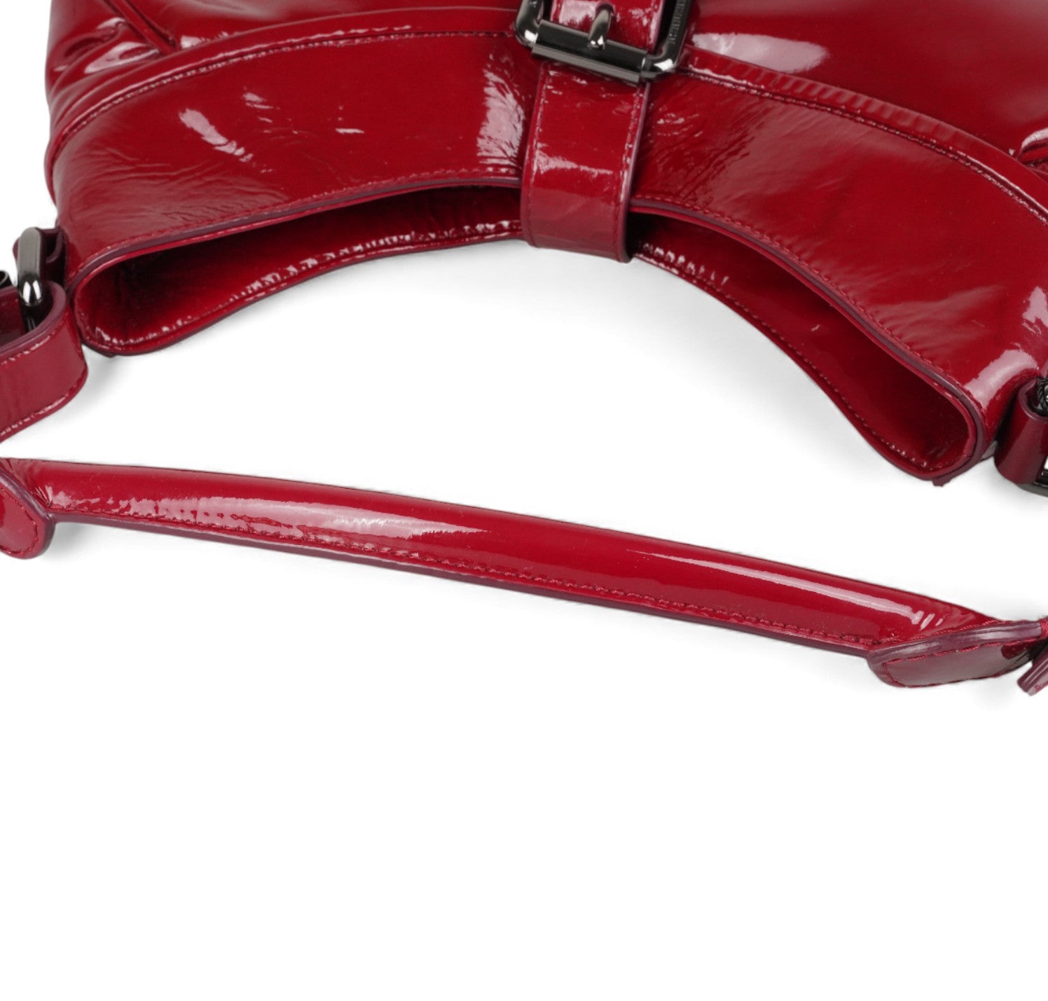 Borsa Burberry, modello Moon, in pelle lucida Rosso Ciliegia, con chiusura a fibbia magnetica centrale e metalleria canna di fucile. La forma a mezzaluna e il manico regolabile rendono il modello un sottospalla chic e versatile. Interno in tessuto con tasca con zip. Lievi aloni superficiali su pelle, micro graffi metalleria.