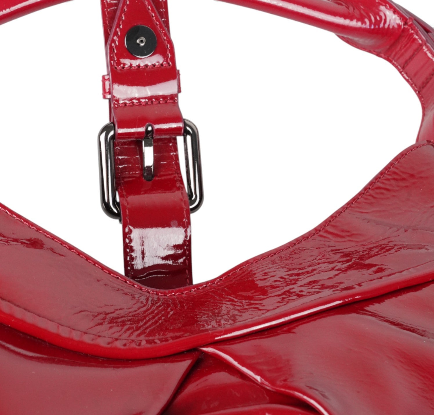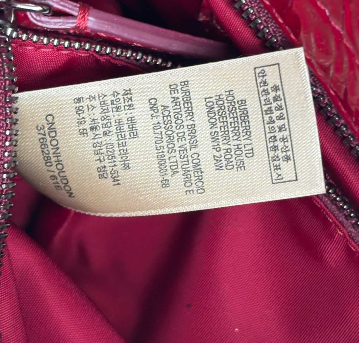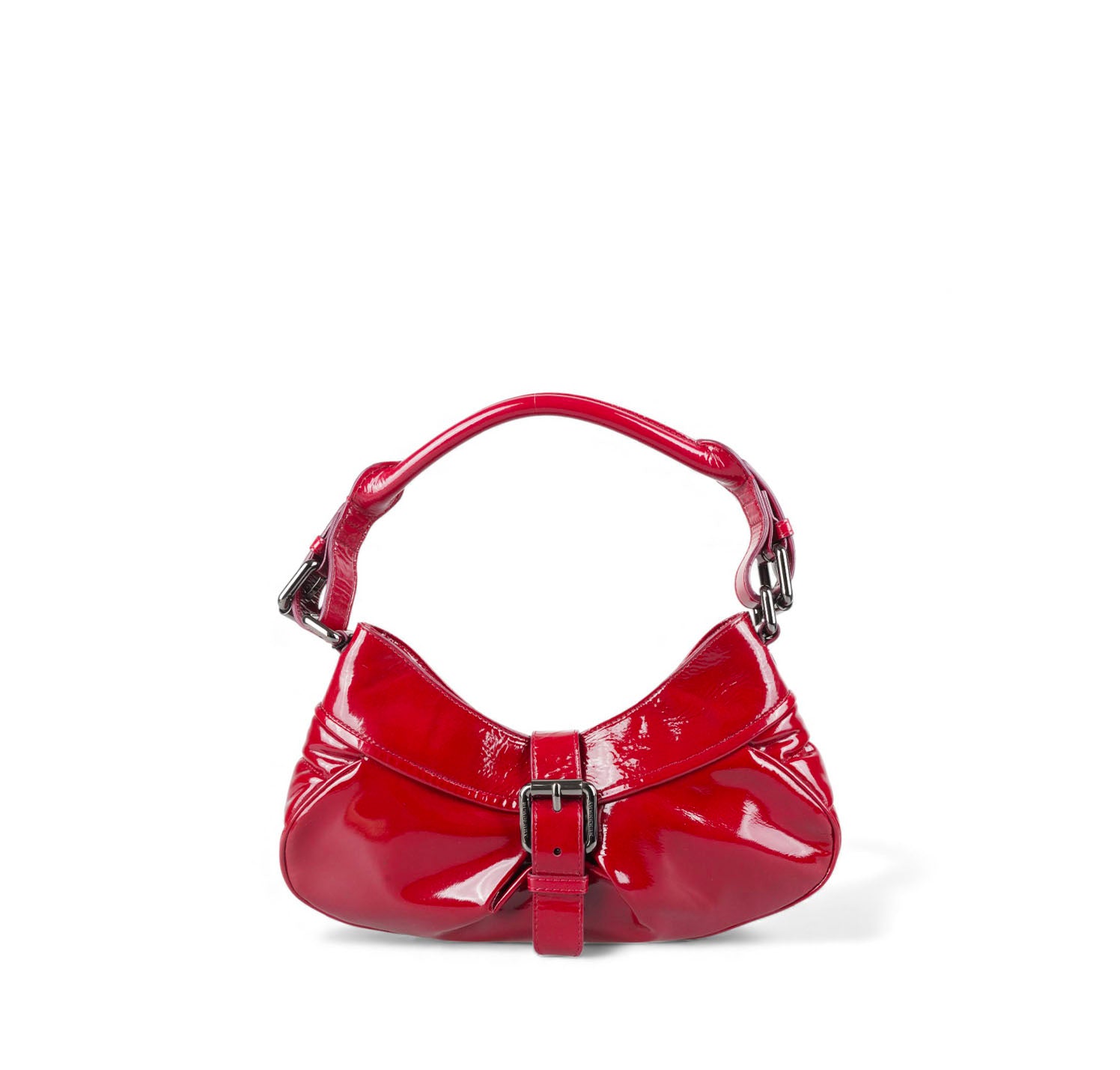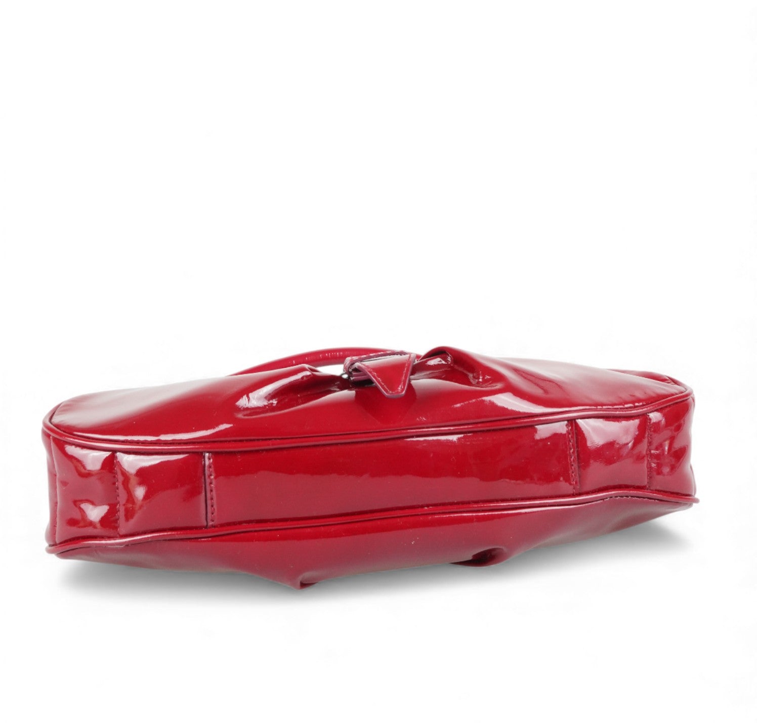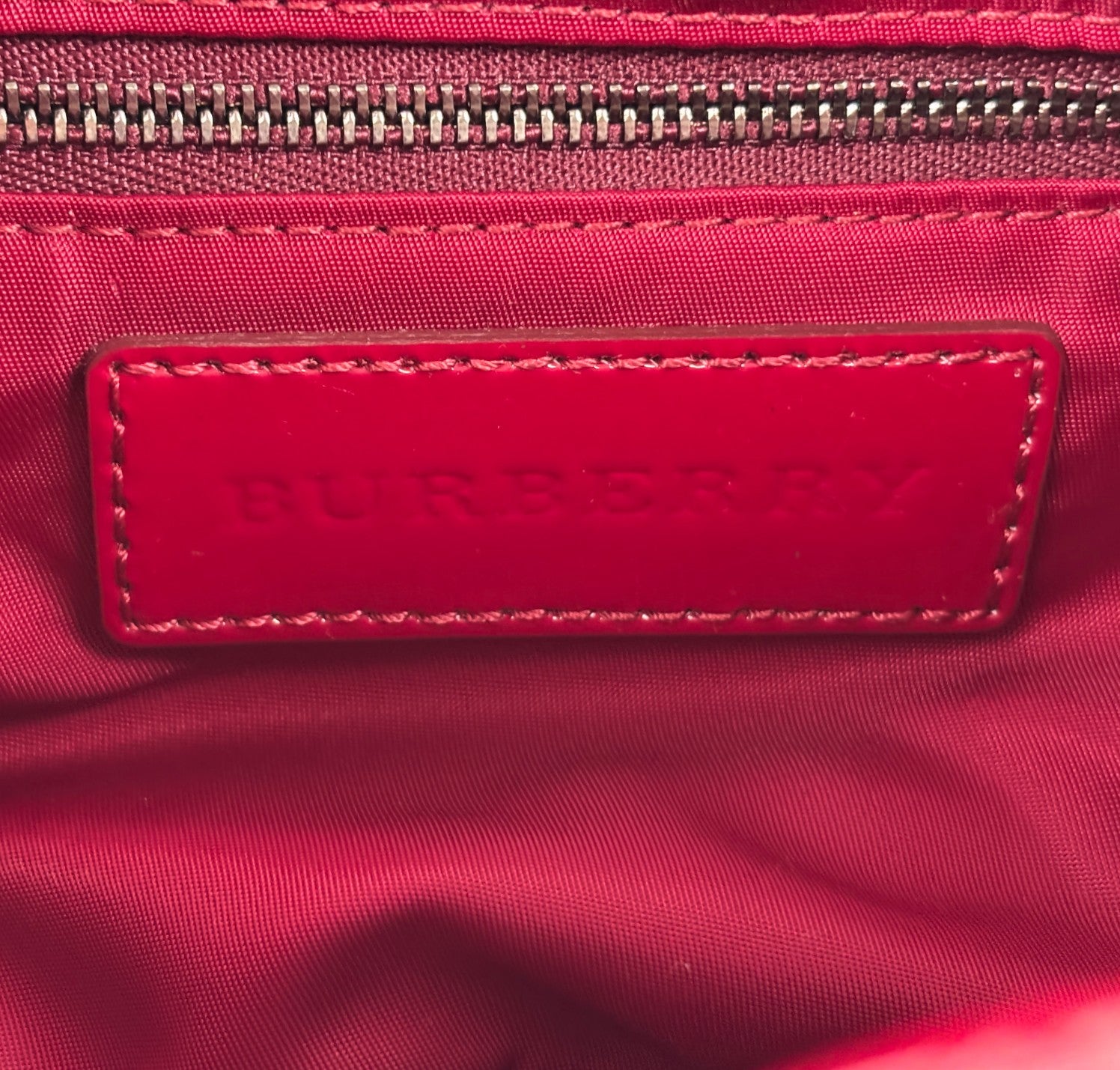 Borsa Burberry, modello Moon, in pelle lucida Rosso Ciliegia, con chiusura a fibbia magnetica centrale e metalleria canna di fucile. La forma a mezzaluna e il manico regolabile rendono il modello un sottospalla chic e versatile. Interno in tessuto con tasca con zip. Lievi aloni superficiali su pelle, micro graffi metalleria.