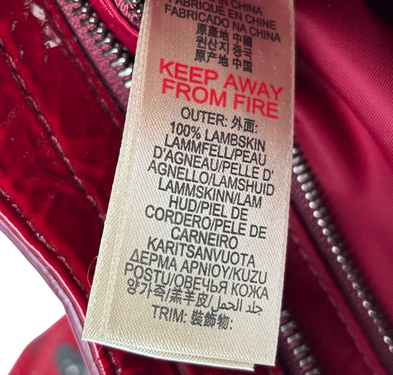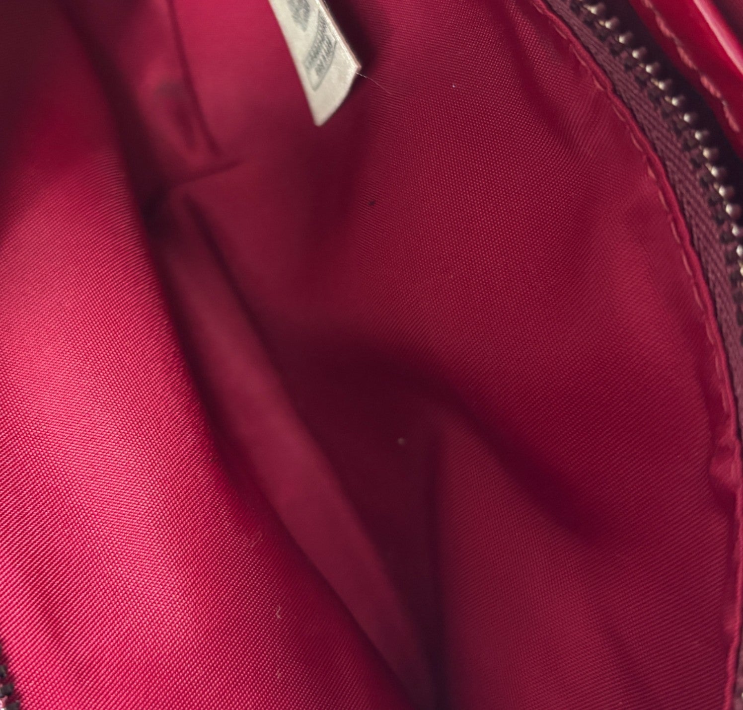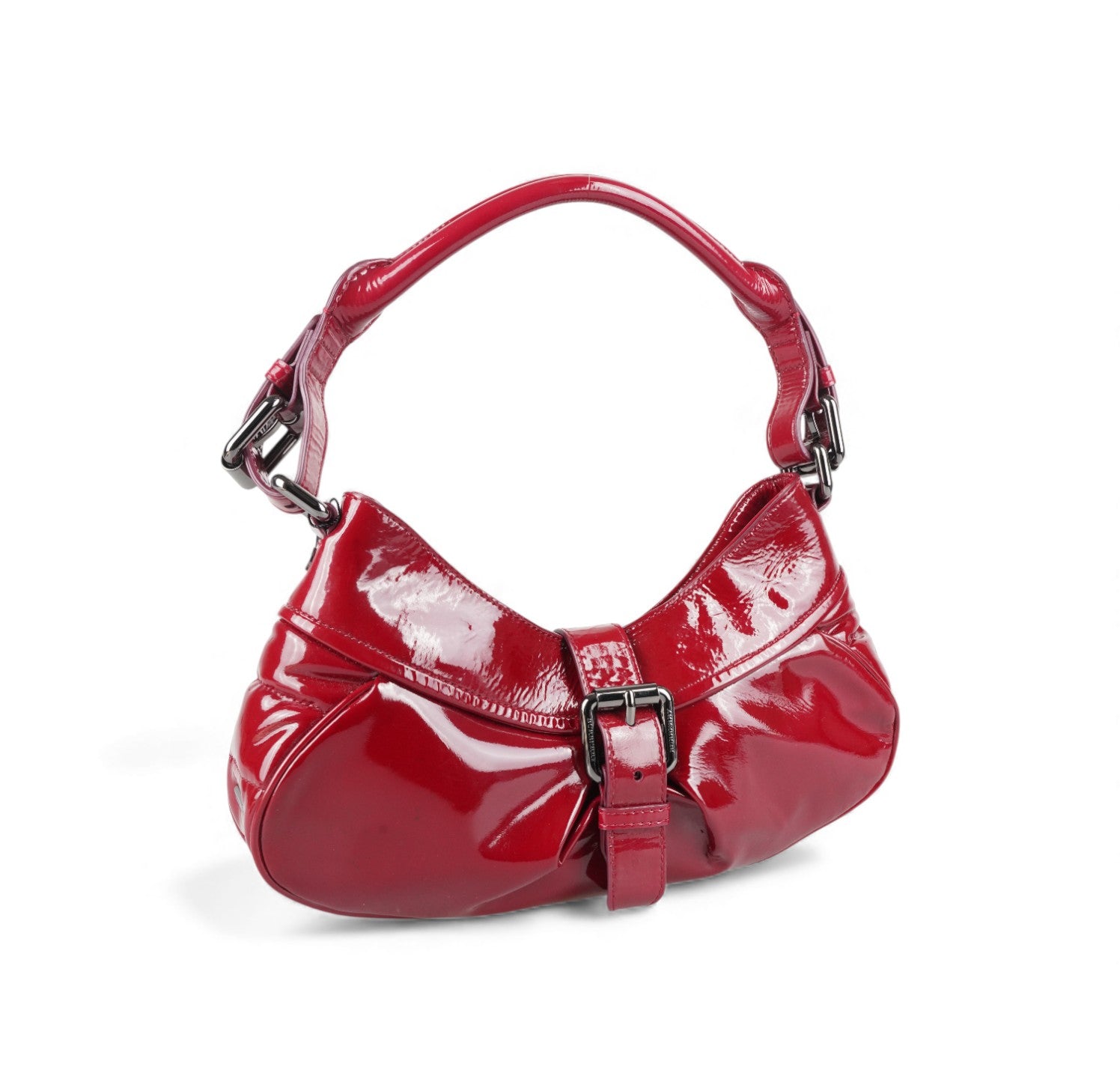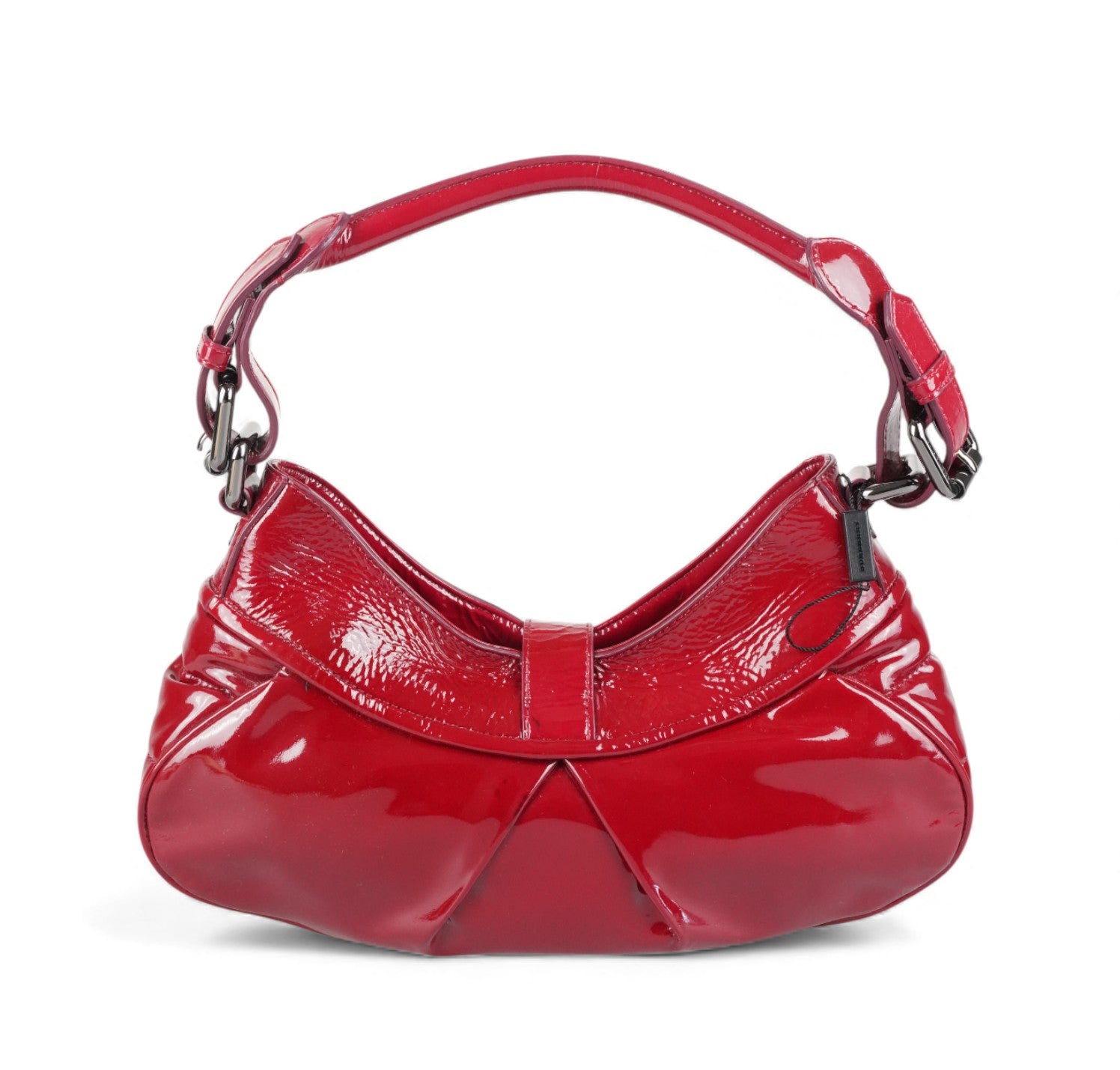 Borsa Burberry, modello Moon, in pelle lucida Rosso Ciliegia, con chiusura a fibbia magnetica centrale e metalleria canna di fucile. La forma a mezzaluna e il manico regolabile rendono il modello un sottospalla chic e versatile. Interno in tessuto con tasca con zip. Lievi aloni superficiali su pelle, micro graffi metalleria.