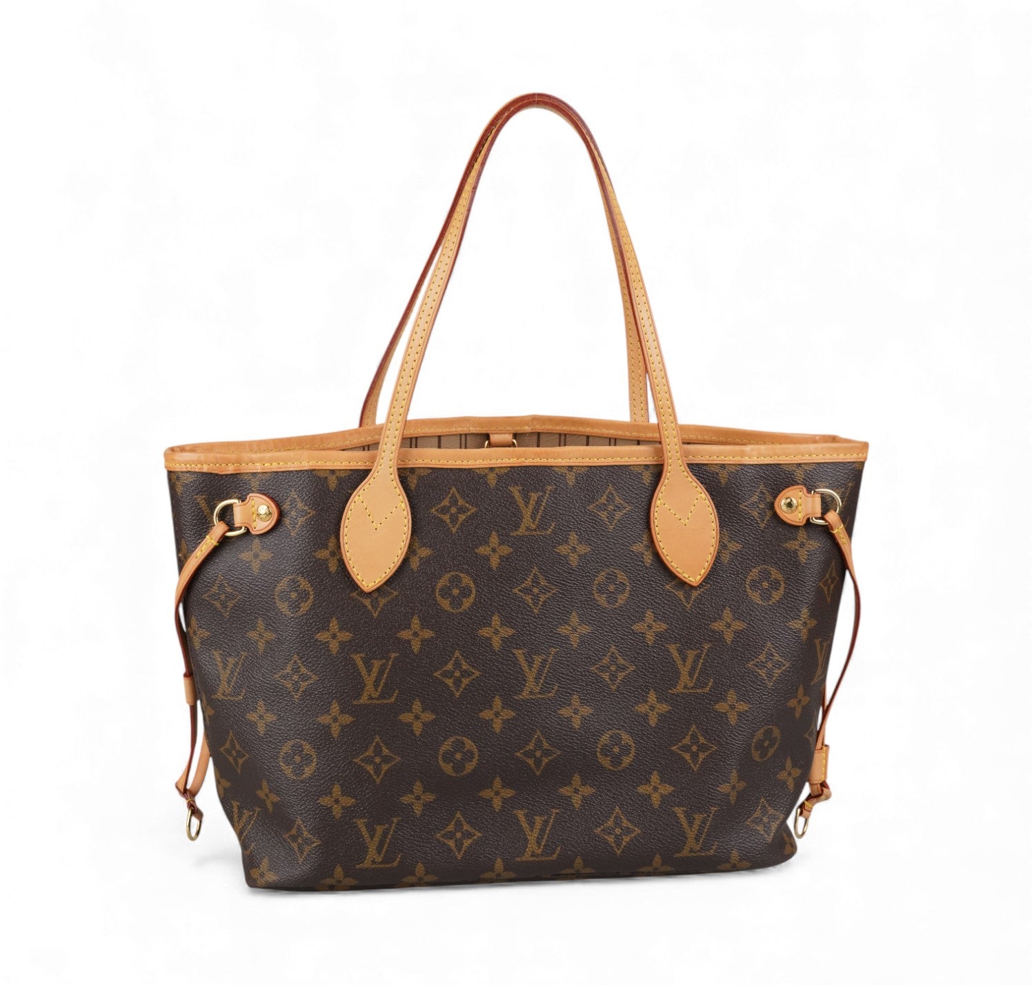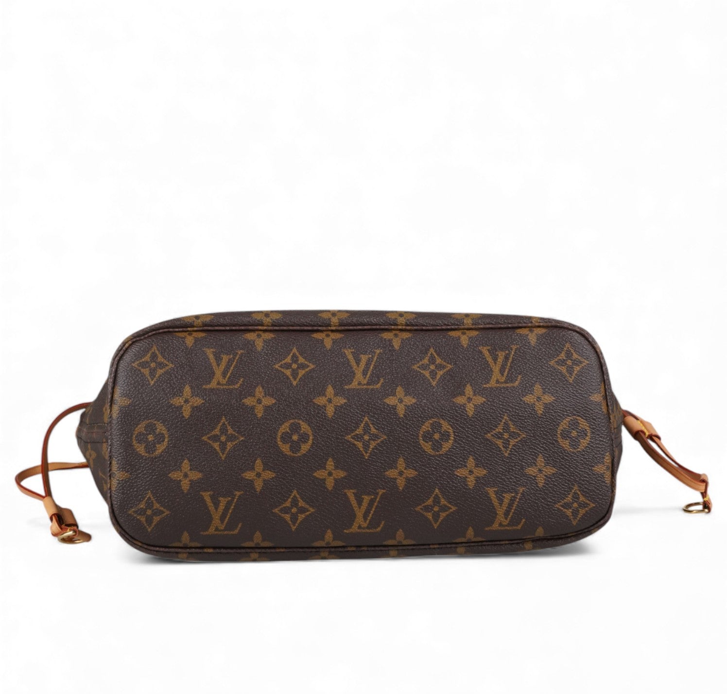 Louis Vuitton bag, Neverfull model, size PM made of Monogram Canvas. Honeyed Natural Cowhide finishing. Gold Brass hardware. Beige Fabric lined interior, zip pocket. Top handles for shoulder carry. Top closure with snap hook. Equipped with side laces to customize its capacity. Signs of rubbing, slight stains, signs of use on the cowhide. Minimal internal signs. Slight general signs of use.