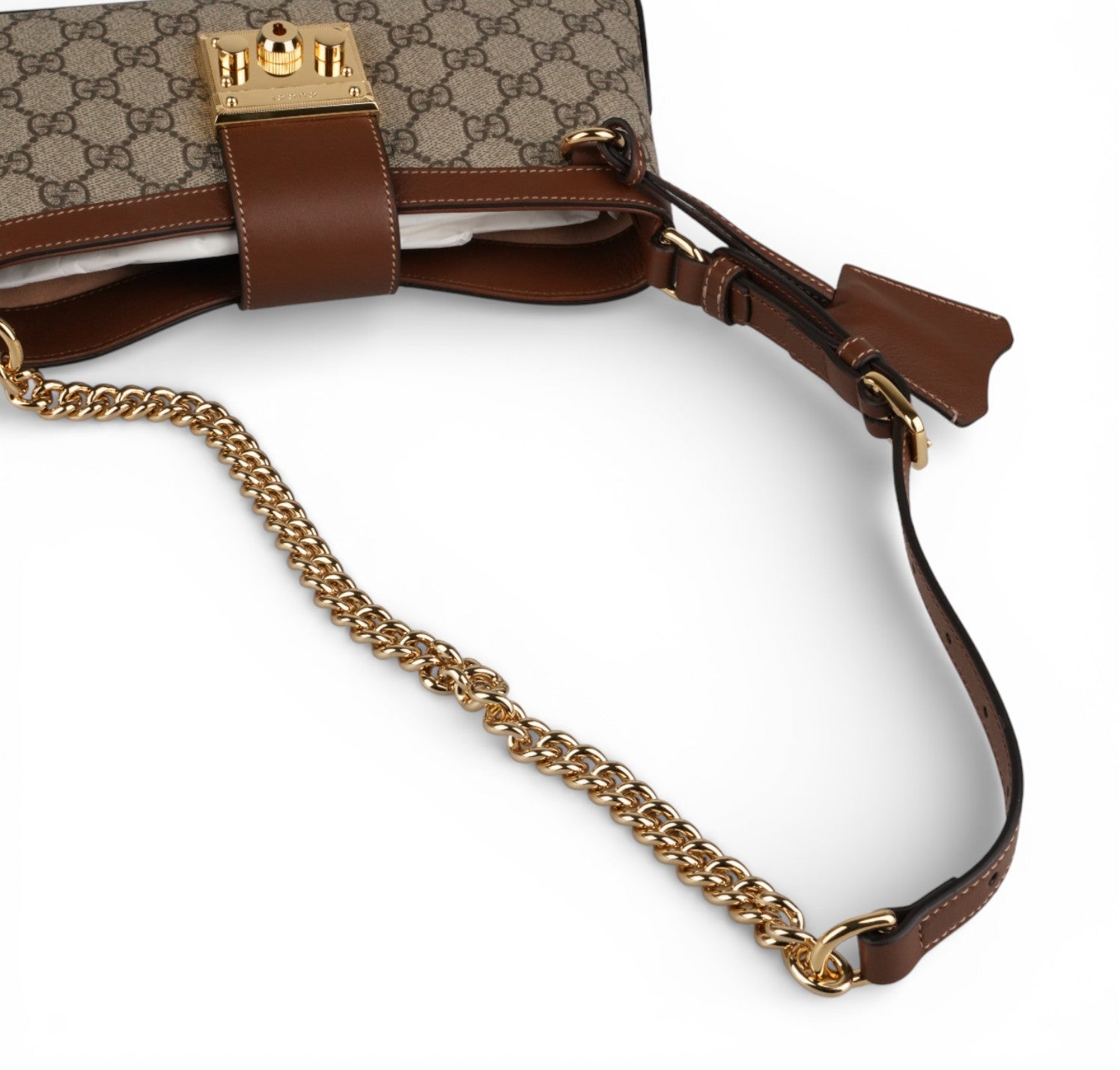 Borsa Gucci, modello Padlock, realizzata in tela GG Supreme beige/ebano con finiture in pelle marrone. Design iconico con chiusura frontale in metallo color Oro. Tracolla regolabile in pelle e catena. Interno foderato in tessuto effetto suede con tasche funzionali. Modello elegante e versatile, perfetto da giorno e sera. Pari al nuovo, in condizioni eccellenti. Potrebbe presentare micro segni di stoccaggio.