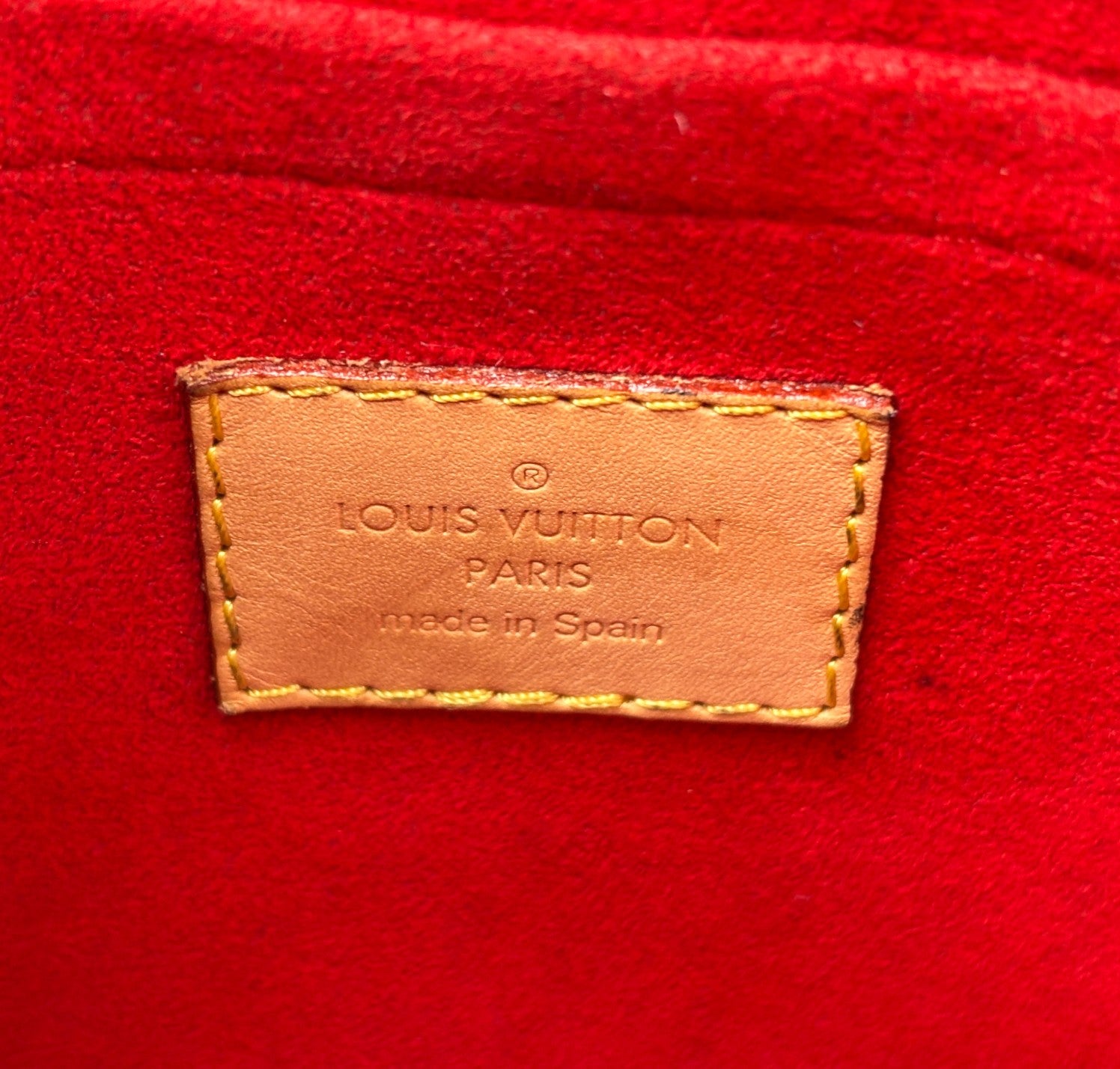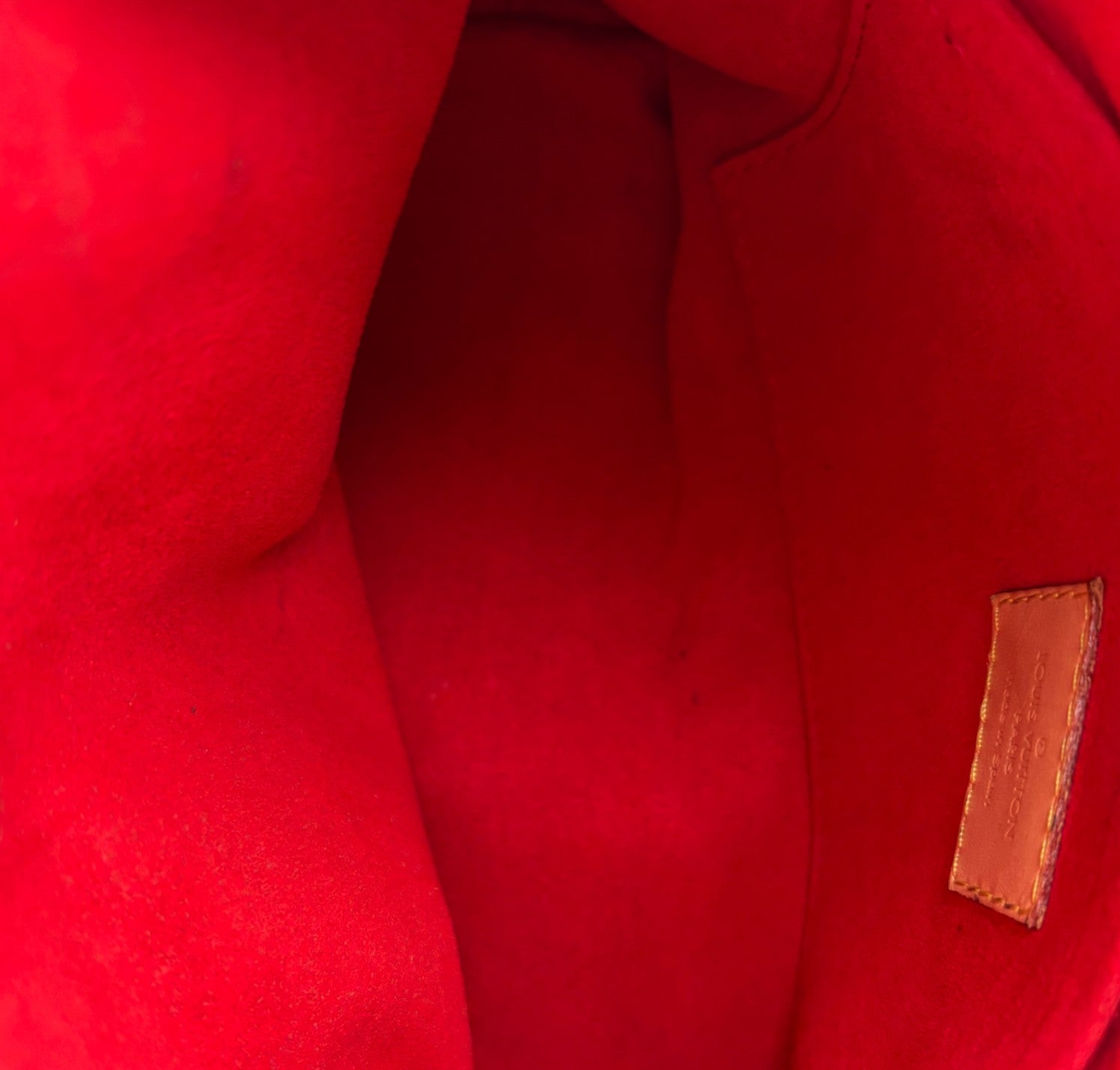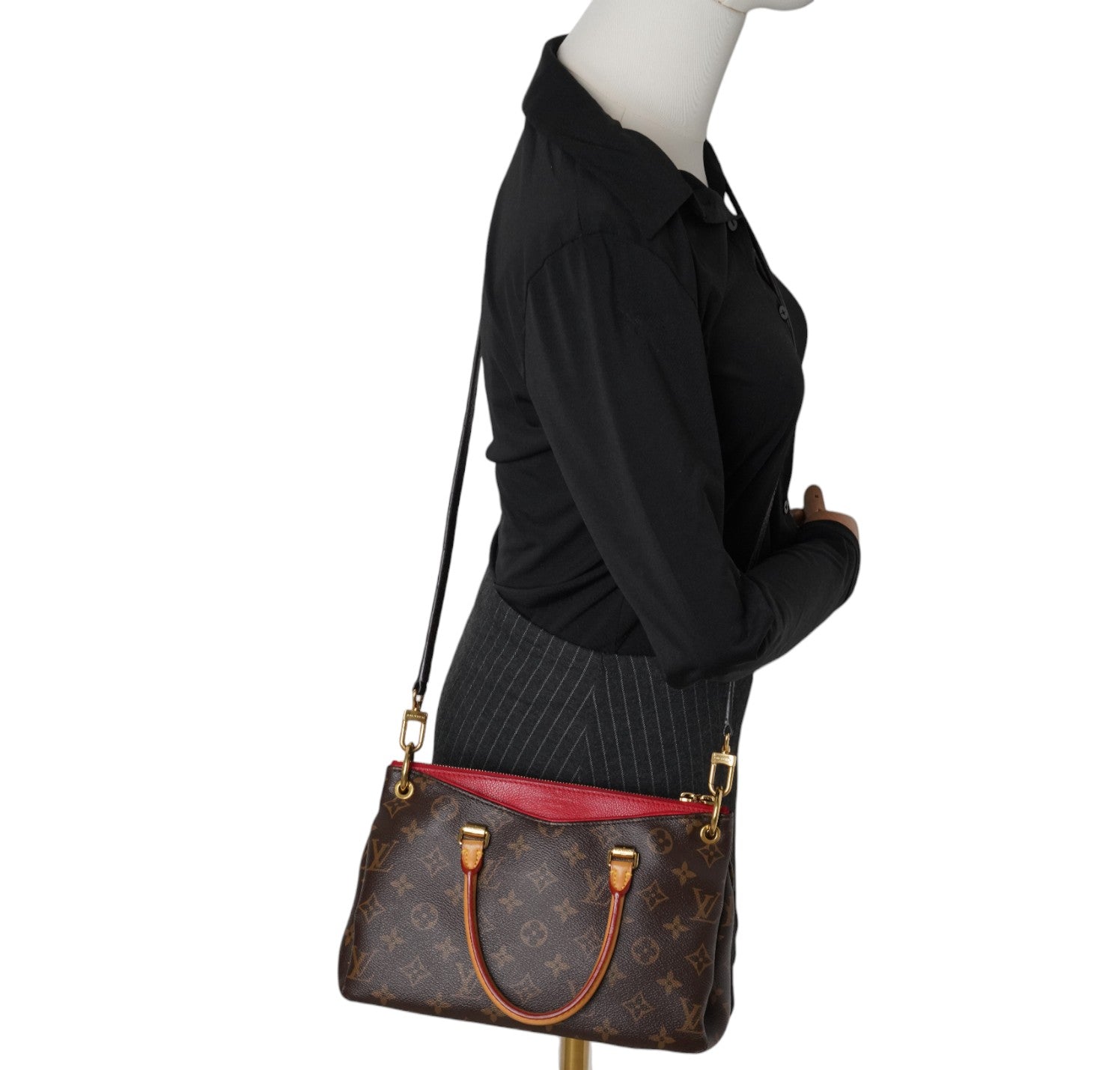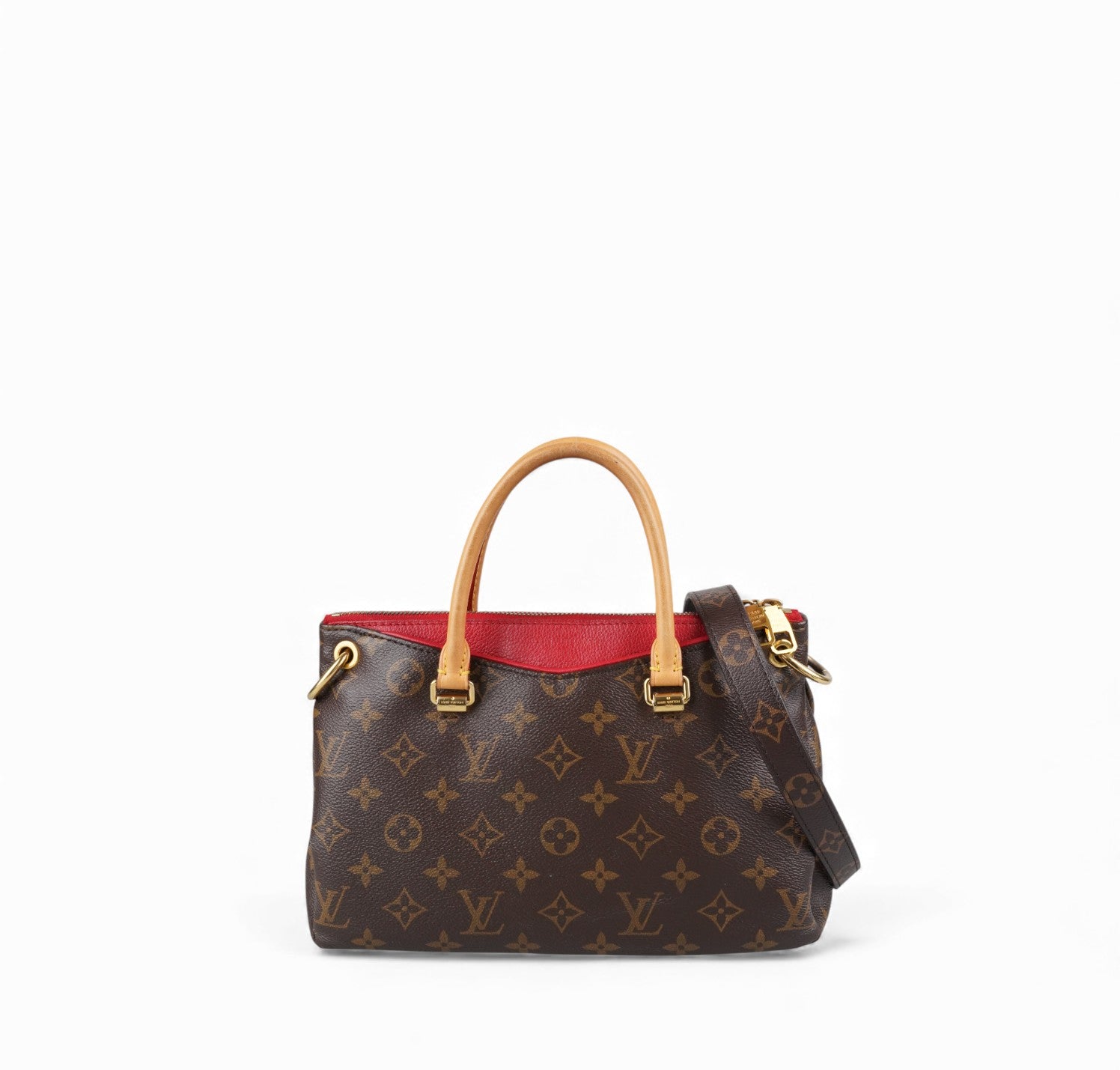 Borsa Louis Vuitton, modello Pallas BB, realizzata in Tela Monogram con inserti in pelle Rossa. Finiture in vacchetta naturale. Metalleria dorata. Chiusura superiore con zip. Interno foderato in microfibra, tasca piatta. Munita di doppi manici per l'uso a mano e tracolla rimovibile in canvas per l'uso a bandoliera o spalla. Presenta lievissimi segni del tempo sulla vacchetta e minimi segni d’uso generali. In ottimo stato complessivo.
