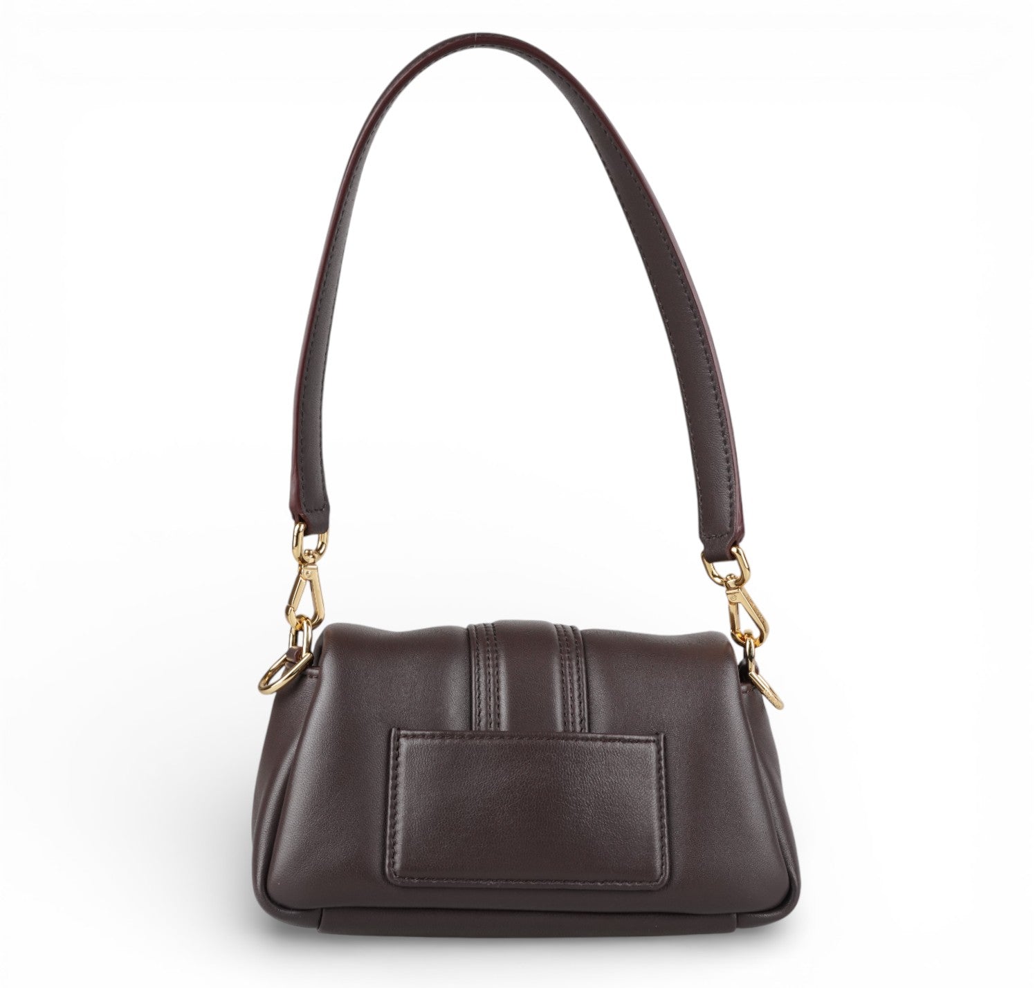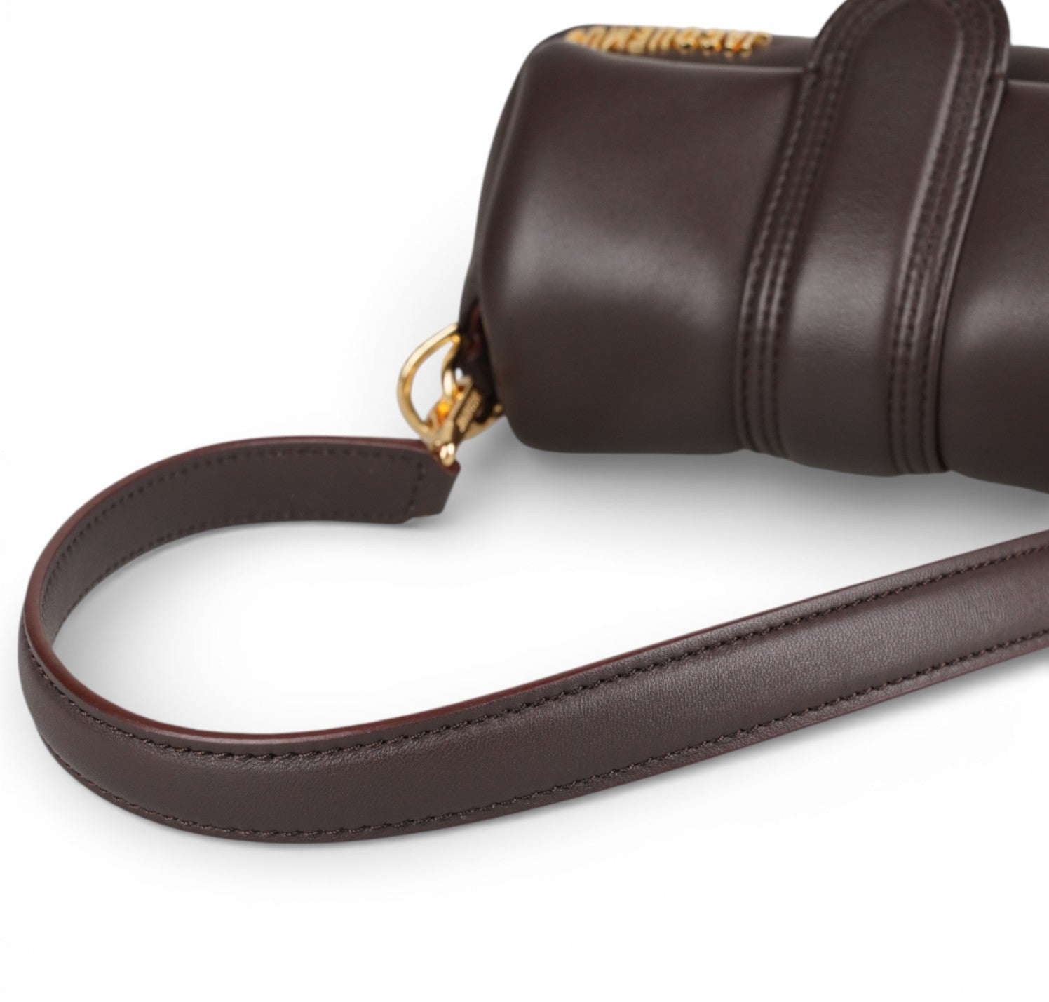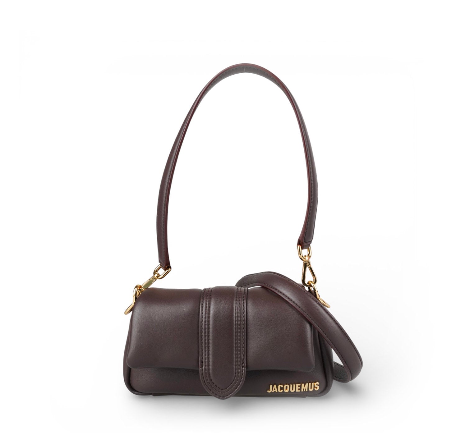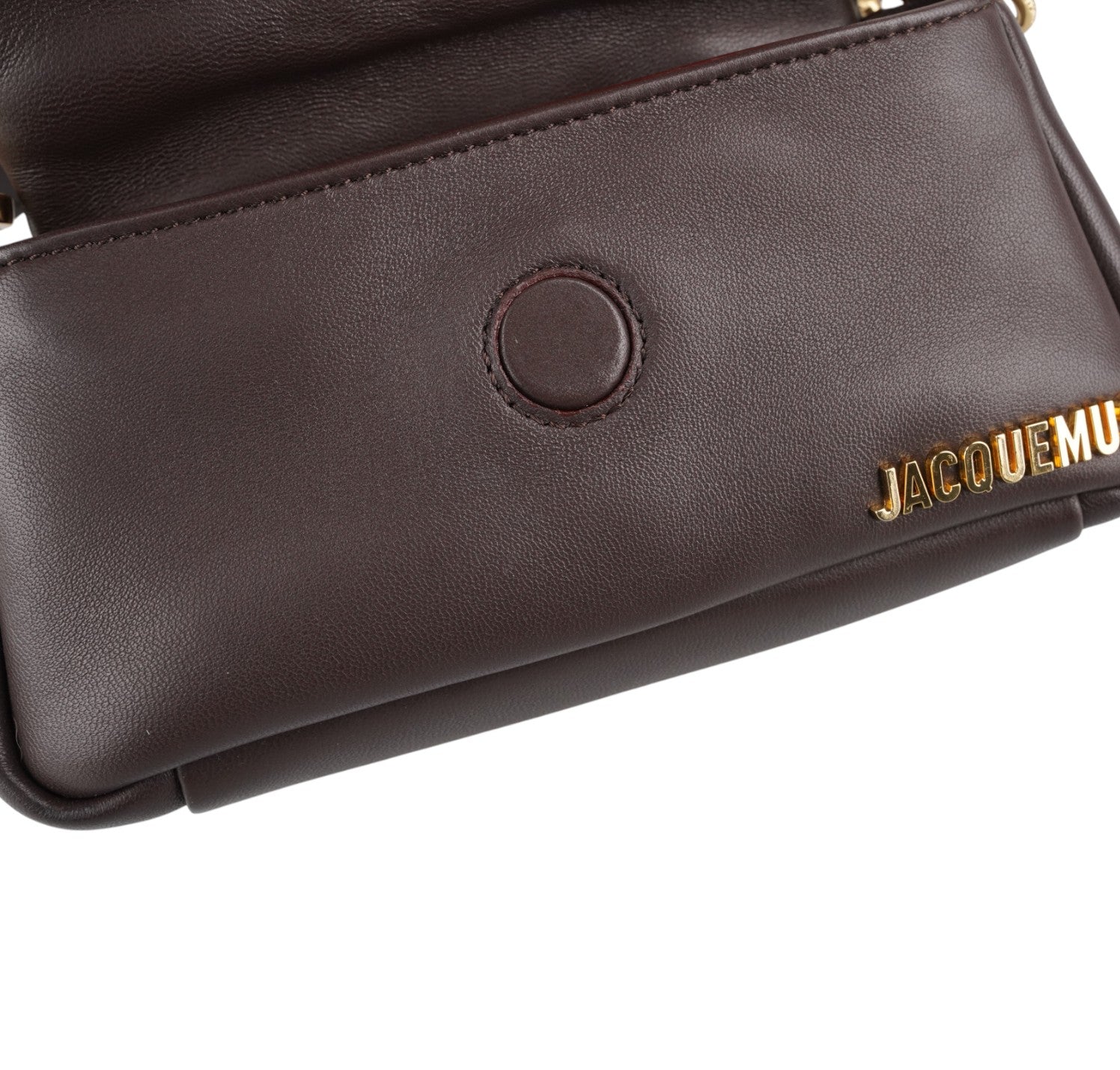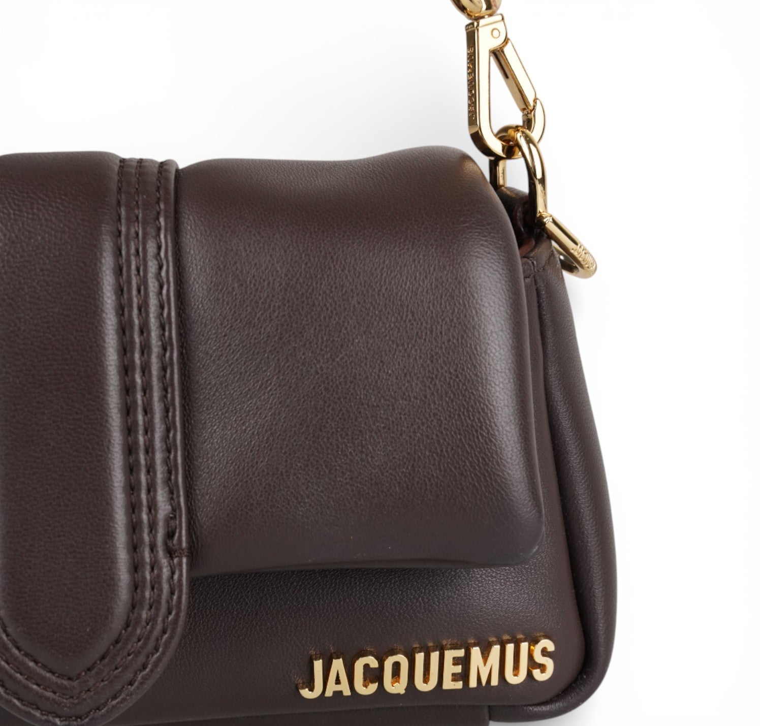 Mini borsa Jacquemus, modello Le Petit Bambimou, realizzata in pelle Marrone Scuro, parti metalliche color Oro. Munita di doppia tracolla per l'uso a spalla o a bandoliera. Chiusura frontale con patta magnetica. Interno foderato in tessuto, capiente per l'essenziale, taschino laterale. Condizioni eccellenti.