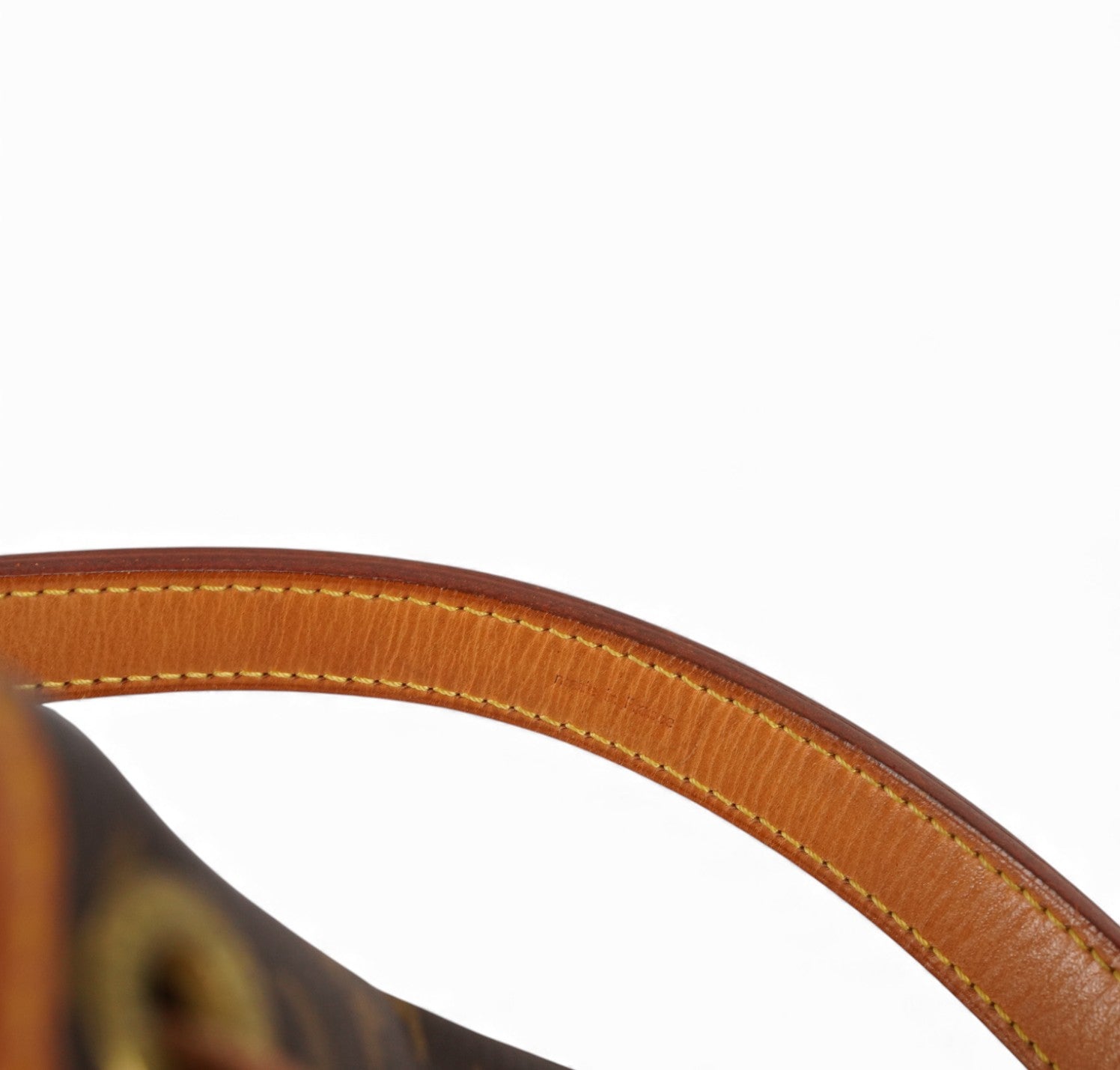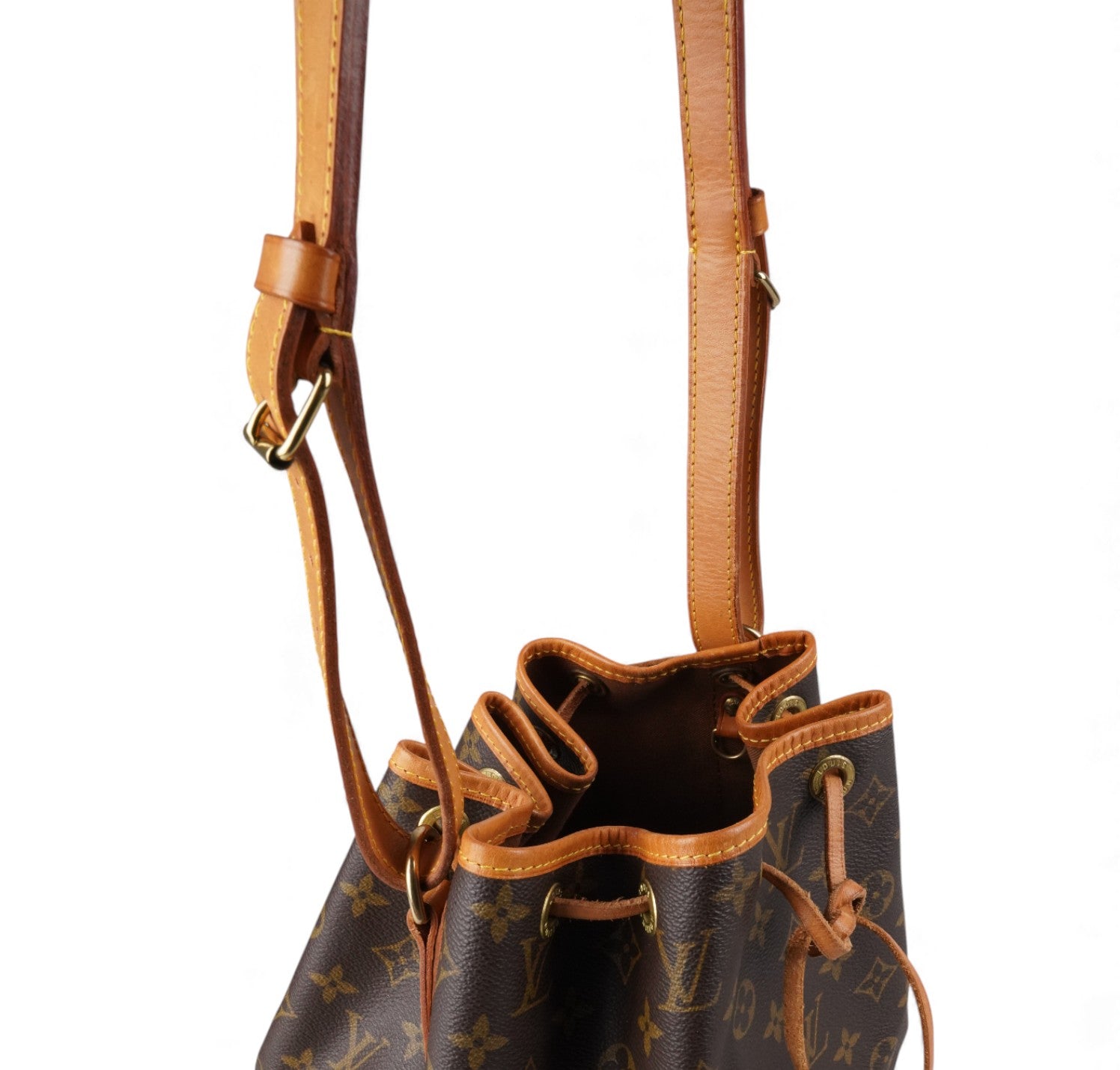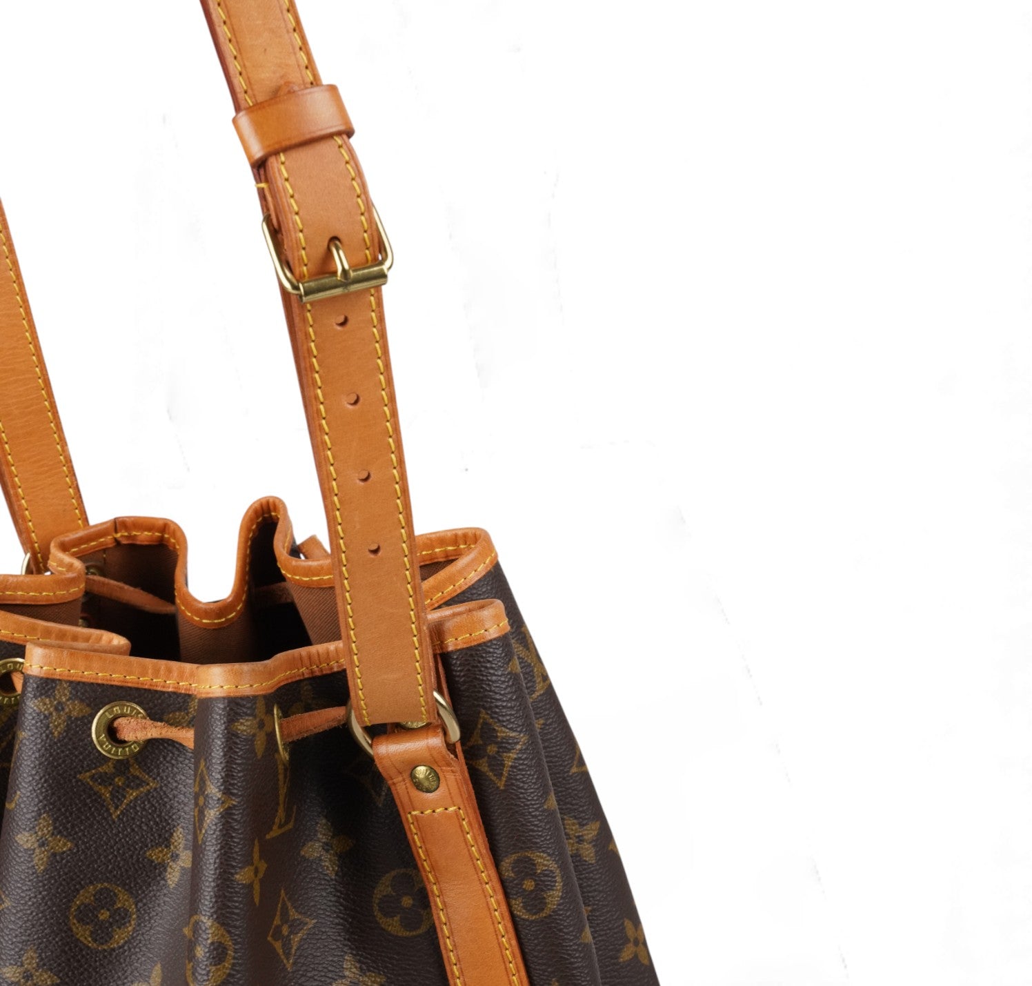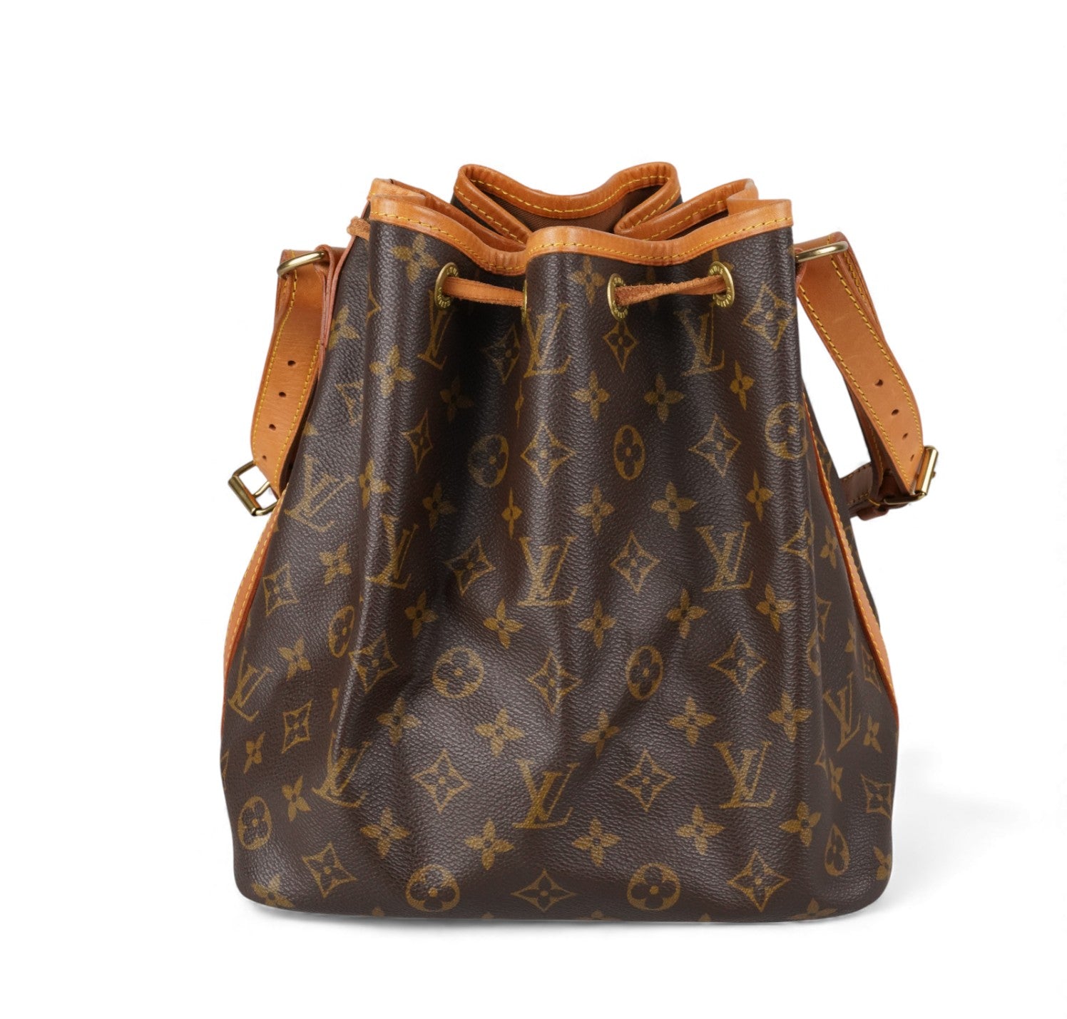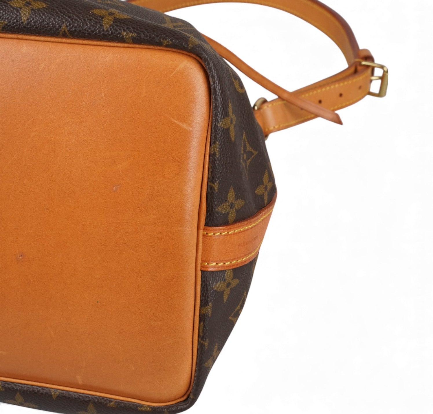 Louis Vuitton bag, Noé model. Made of Monogram Canvas. Details in natural cowhide. Gold hardware. Interior lined in Brown Fabric. Wearable both on the shoulder and across the body. Top closure with drawstring. Slight stains on cowhide, slight stains inside. The top edge has been replaced in the Official Boutique.