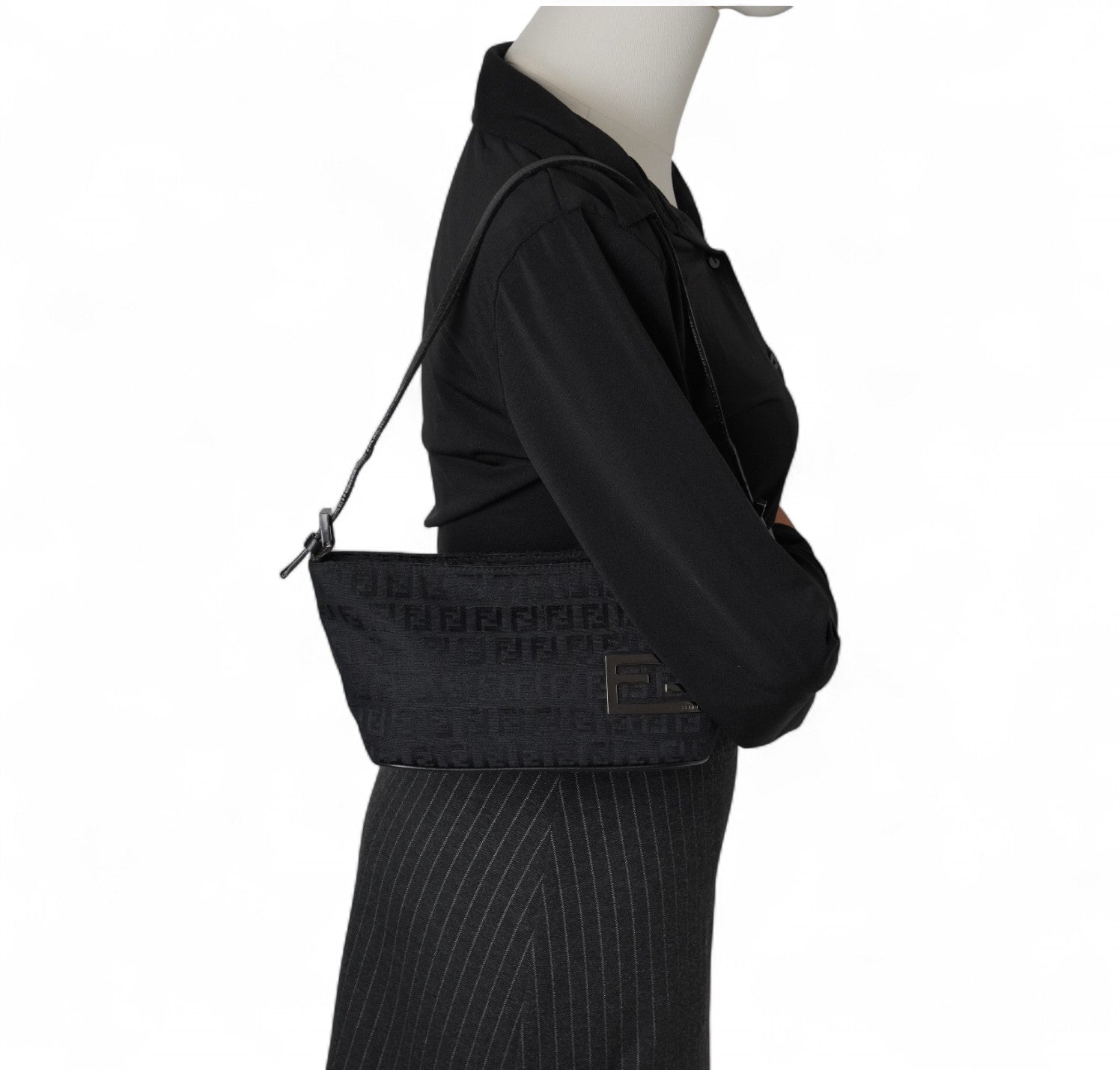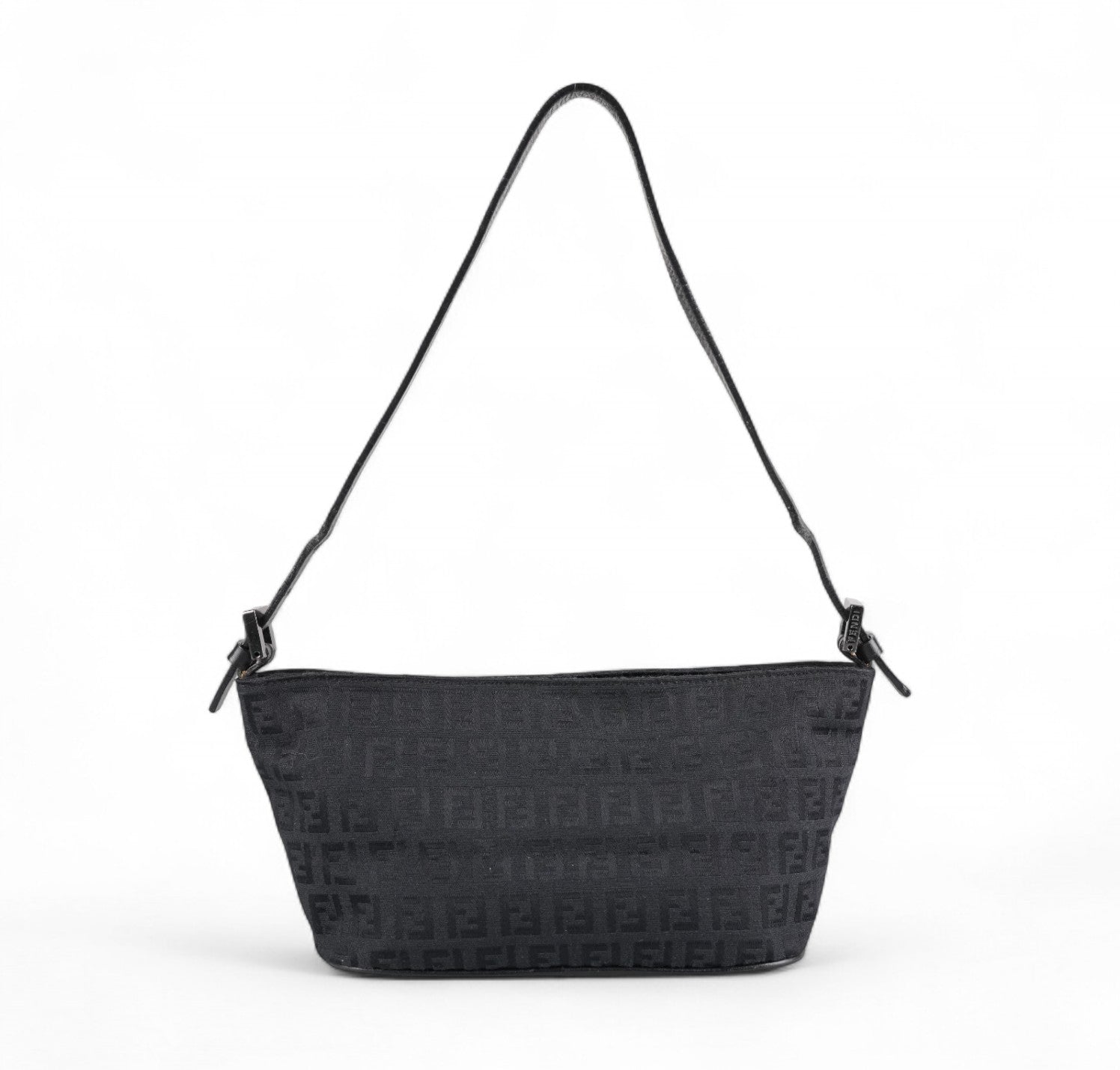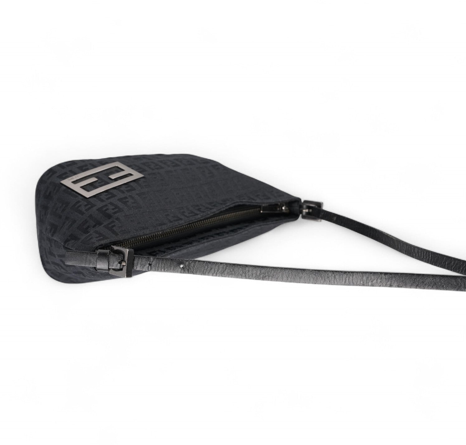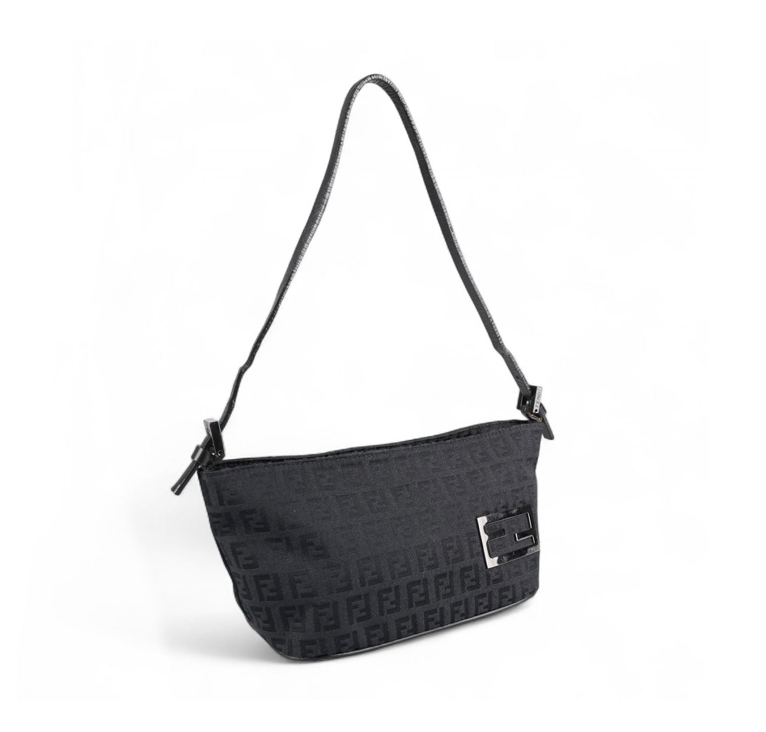 Pochette Fendi, realizzata in Tela Nera impreziosita da motivo Monogram FF Zucchino a contrasto. Finiture in pelle tono su tono, placca FF frontale e metalleria color argento. Munita di manico superiore per il trasporto a mano o a spalla, regolabile con fibbia. Interno foderato in tessuto, con unico scomparto e una piccola tasca piatta. Chiusura superiore con cerniera. Presenta segni del tempo generali, graffi generici alla metalleria. La tracolla in pelle mostra minimi segni d'uso dovuti al normale indosso.