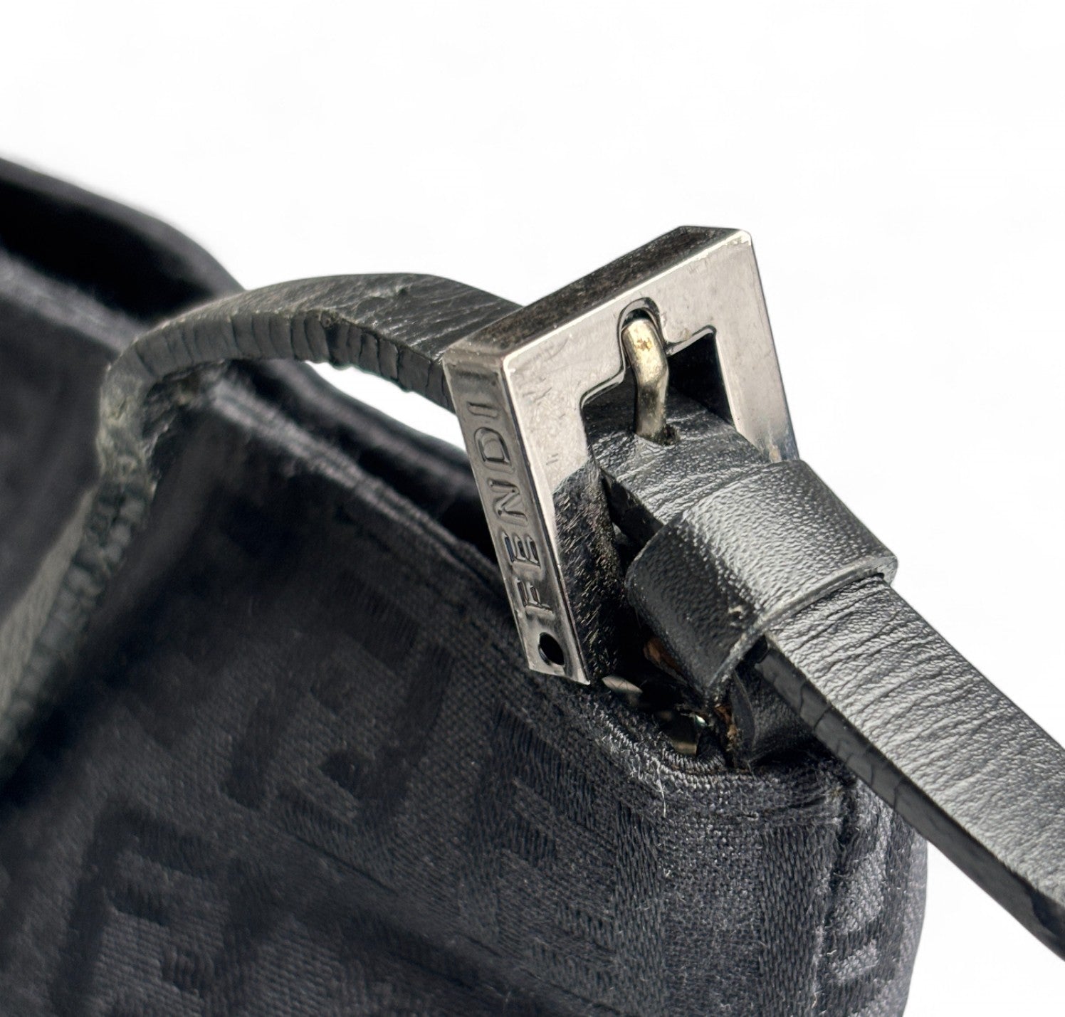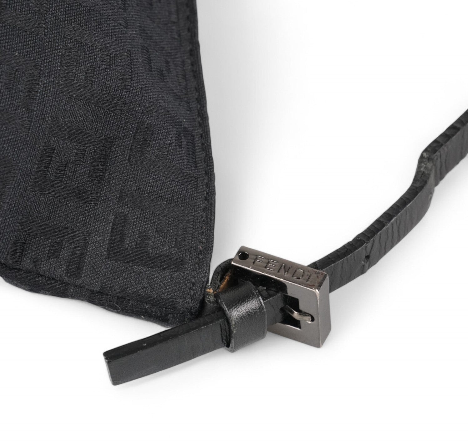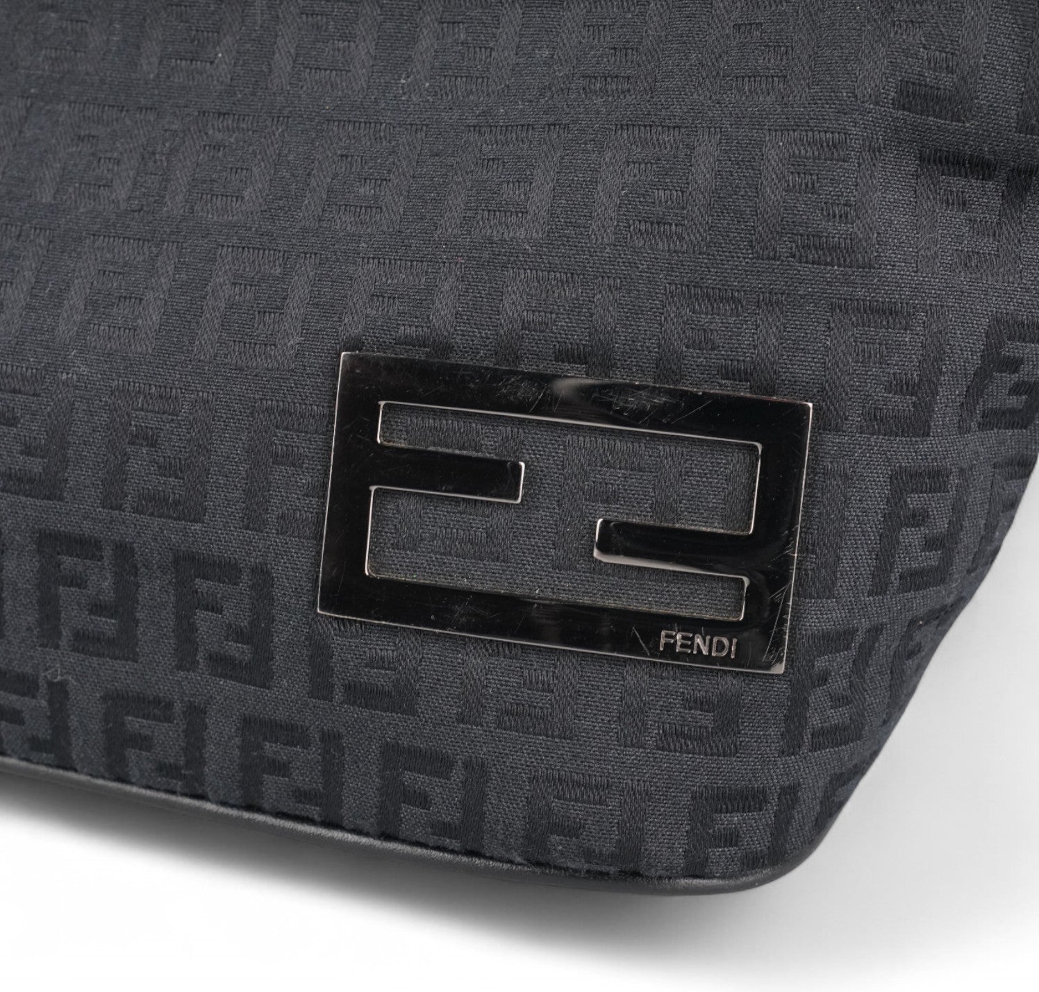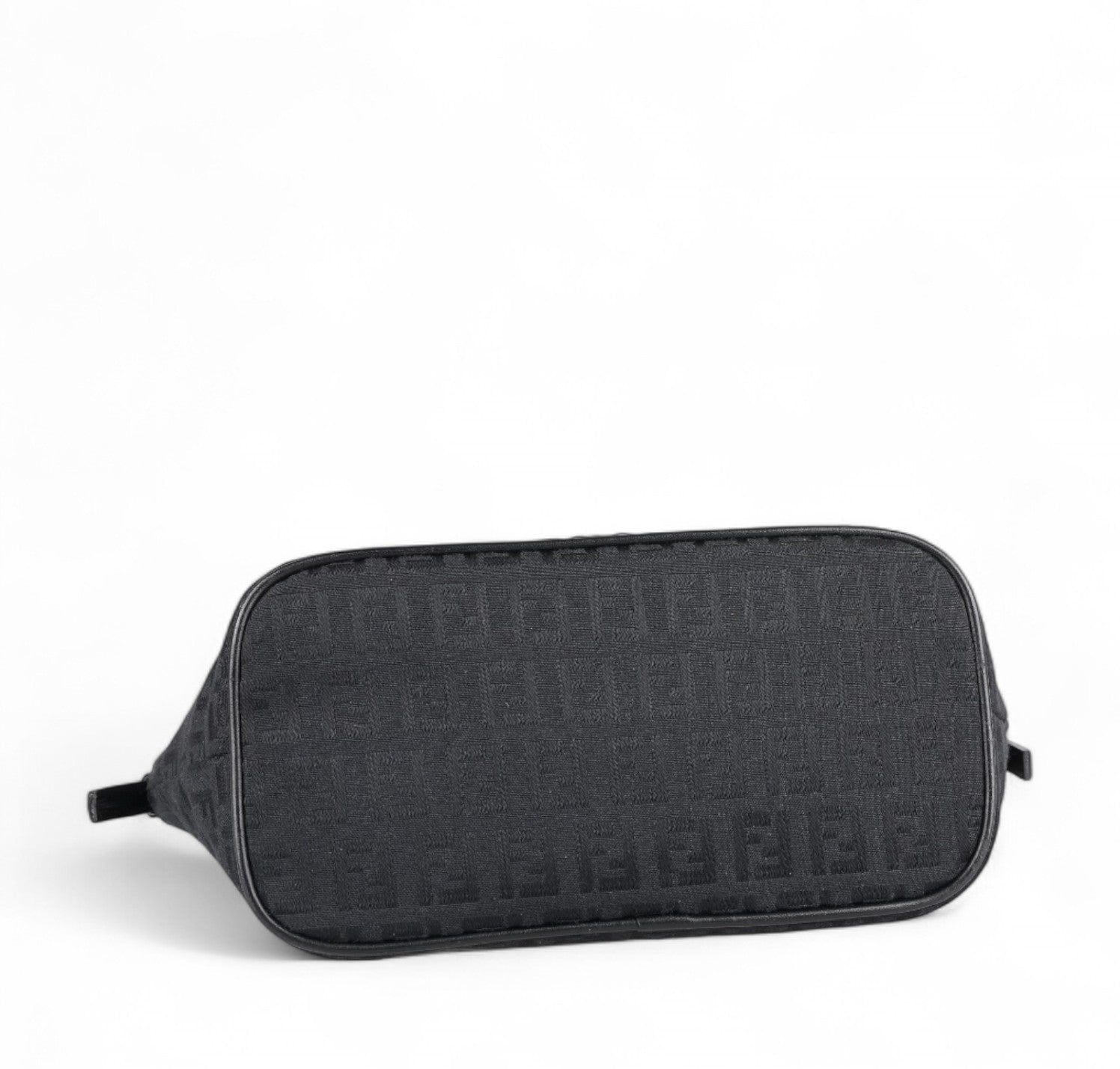Pochette Fendi, realizzata in Tela Nera impreziosita da motivo Monogram FF Zucchino a contrasto. Finiture in pelle tono su tono, placca FF frontale e metalleria color argento. Munita di manico superiore per il trasporto a mano o a spalla, regolabile con fibbia. Interno foderato in tessuto, con unico scomparto e una piccola tasca piatta. Chiusura superiore con cerniera. Presenta segni del tempo generali, graffi generici alla metalleria. La tracolla in pelle mostra minimi segni d'uso dovuti al normale indosso.