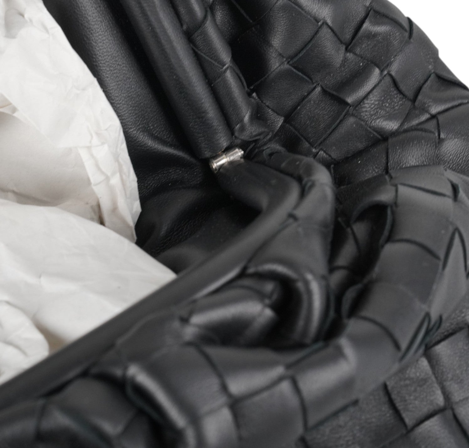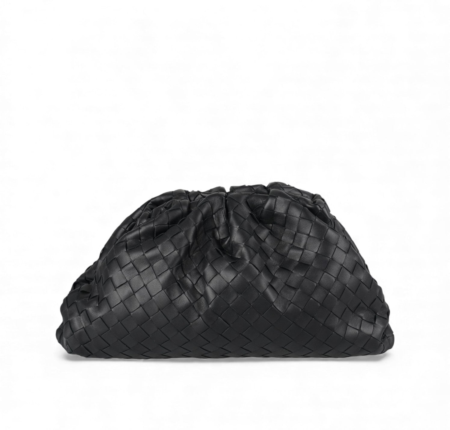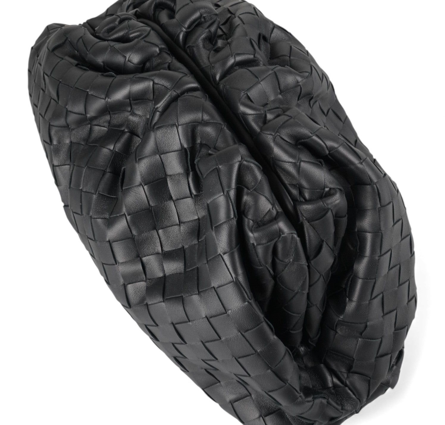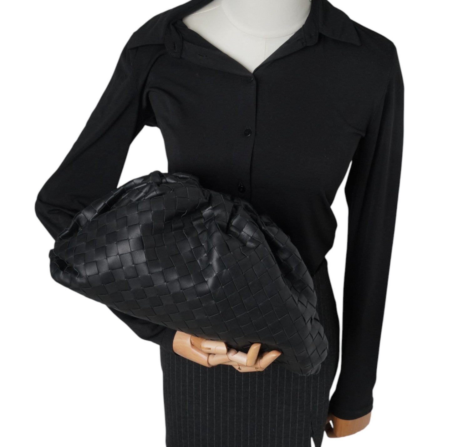Maxi Clutch Bottega Veneta, Pouch Intrecciato in Bordeaux Leather. Soft shape with particular gatherings at the closure. Features a magnetic snap closure. Leather interior with a single compartment, large and roomy. Like new condition, never worn item.