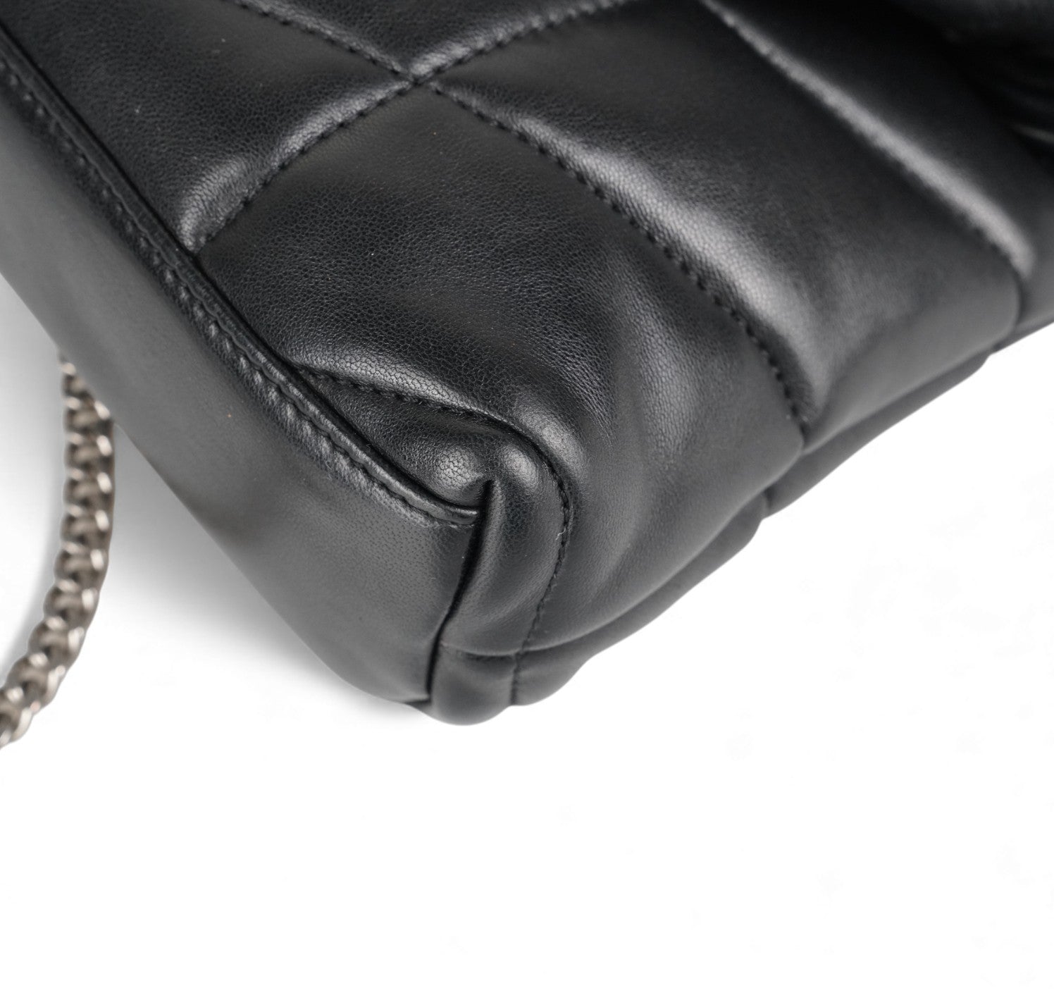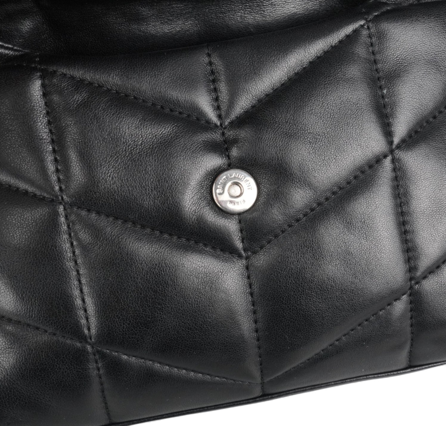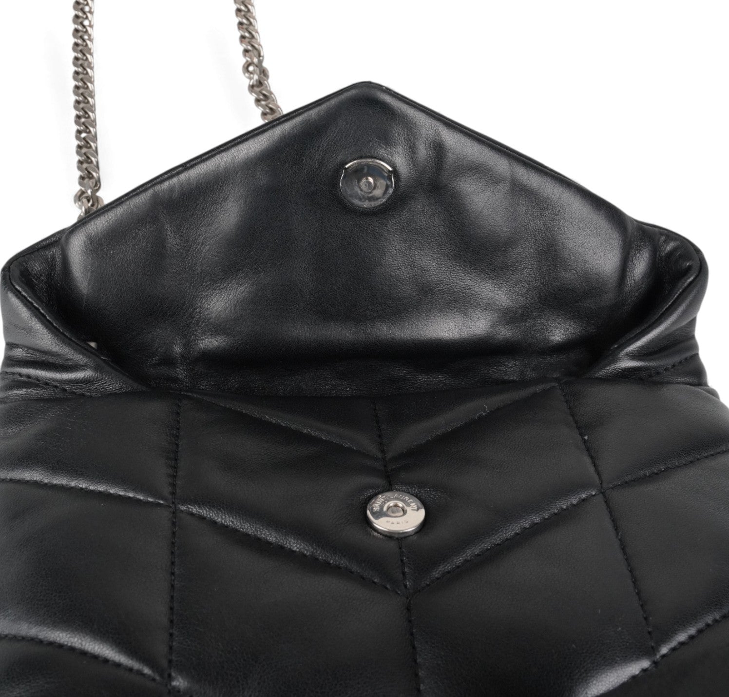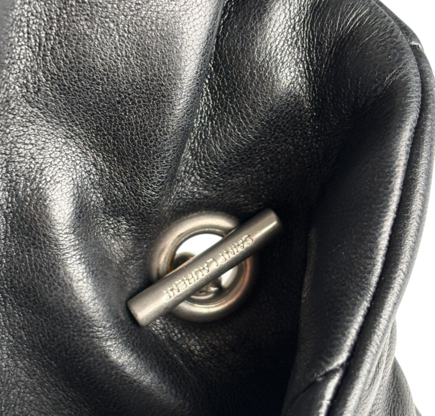 Saint Laurent bag, Puffer model, Small size, made of Black Leather. Antiqued Gold-colored metal hardware. Equipped with a chain shoulder strap with leather shoulder pad for shoulder or crossbody carry. Black fabric lined interior, zip pocket. External magnetic closure with flap embellished with YSL logo. In excellent general condition, slight embossing of the leather under the flap, minimal signs of use.