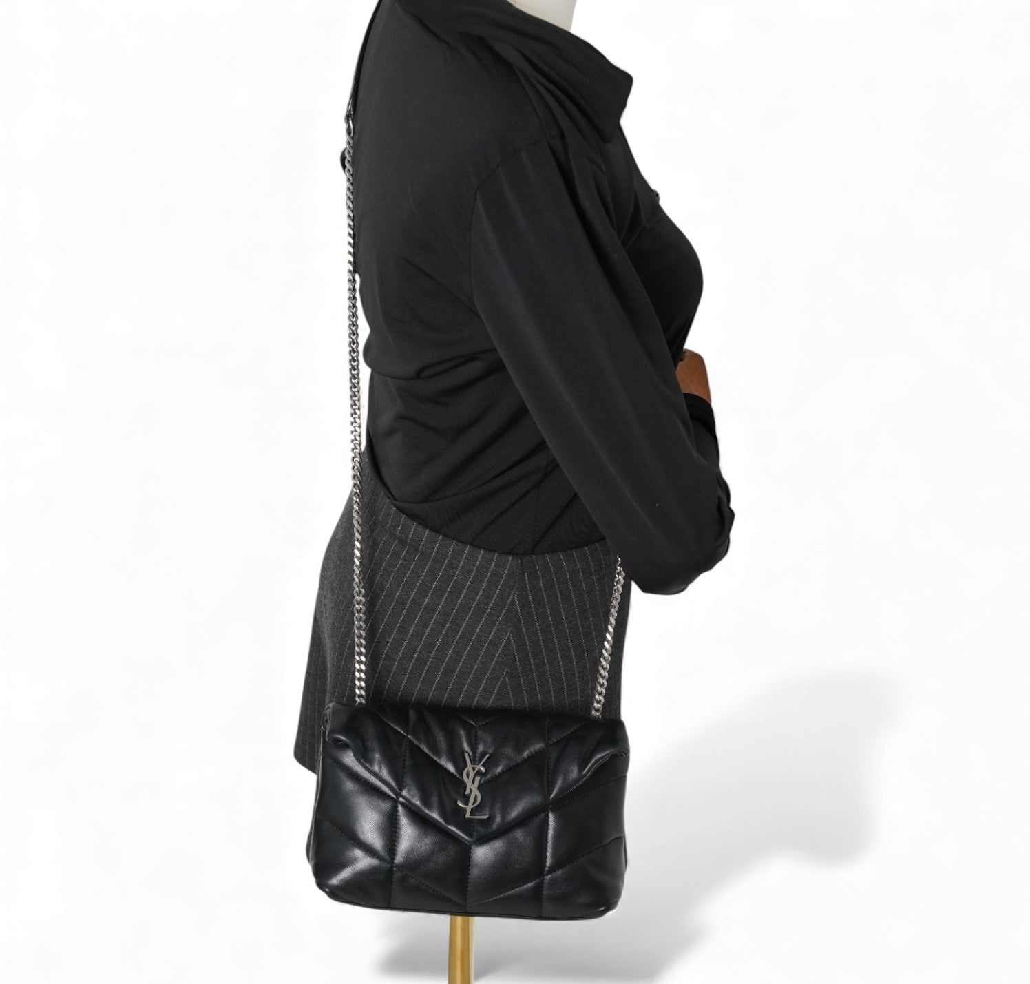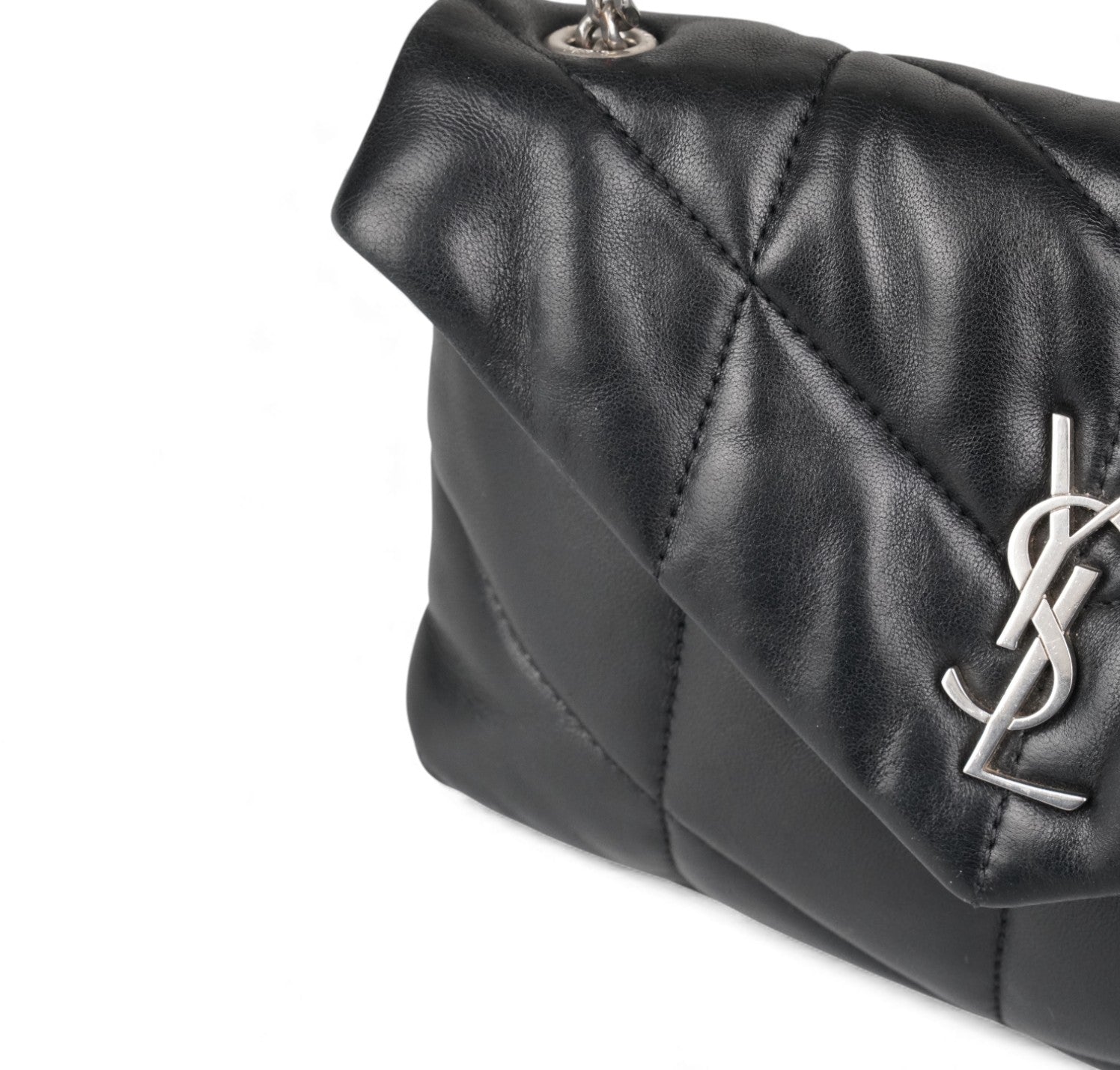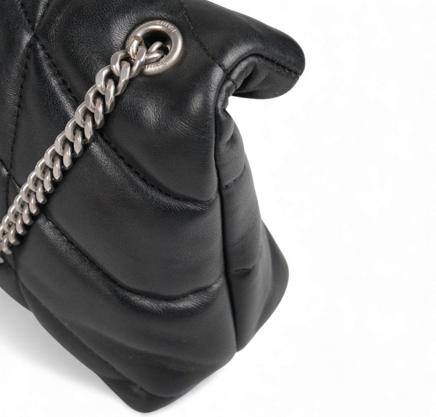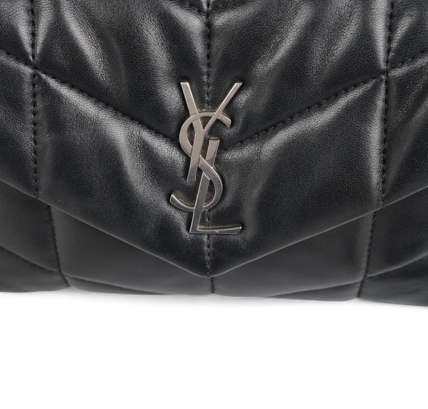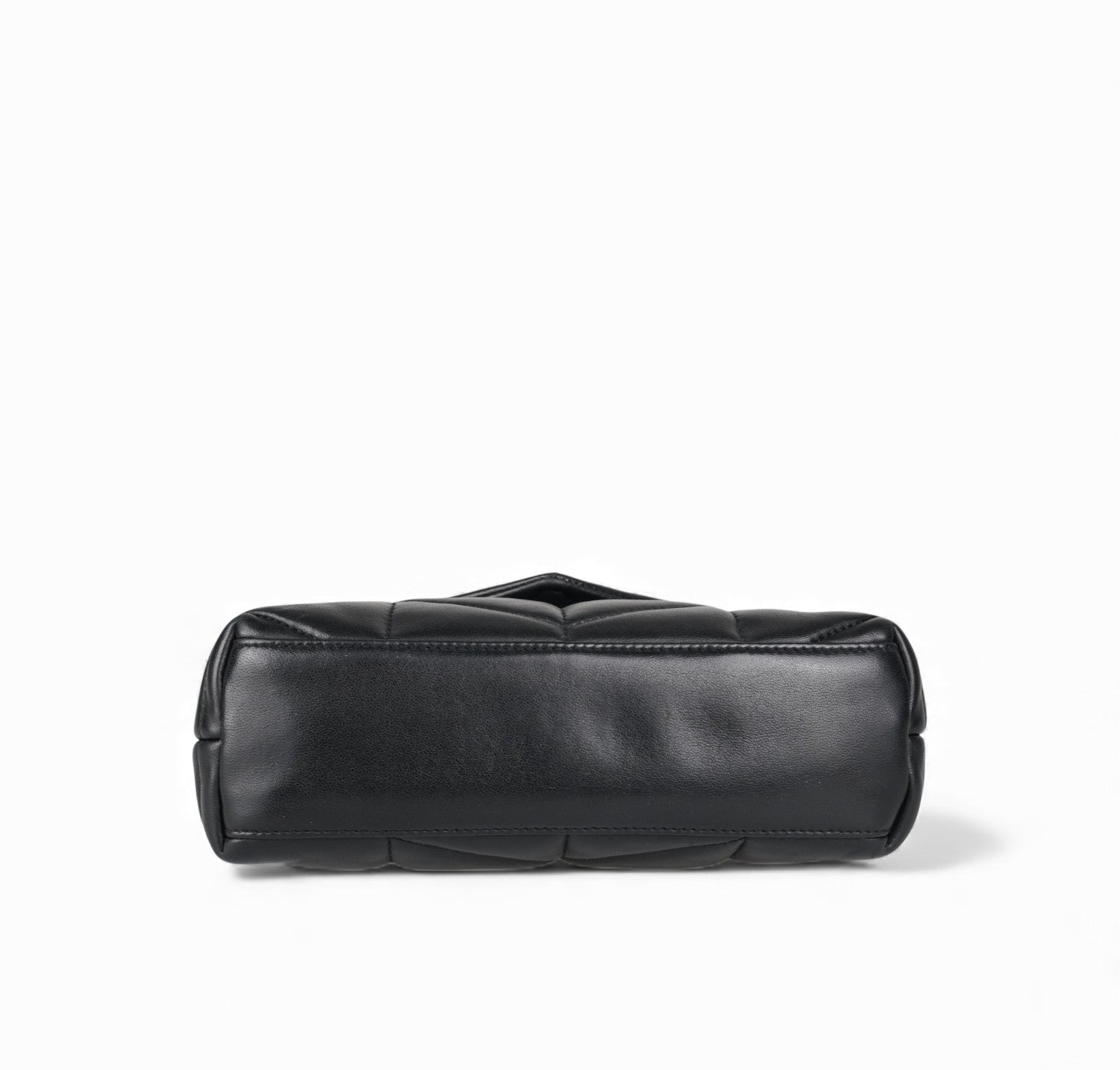 Saint Laurent bag, Puffer model, Small size, made of Black Leather. Antiqued Gold-colored metal hardware. Equipped with a chain shoulder strap with leather shoulder pad for shoulder or crossbody carry. Black fabric lined interior, zip pocket. External magnetic closure with flap embellished with YSL logo. In excellent general condition, slight embossing of the leather under the flap, minimal signs of use.