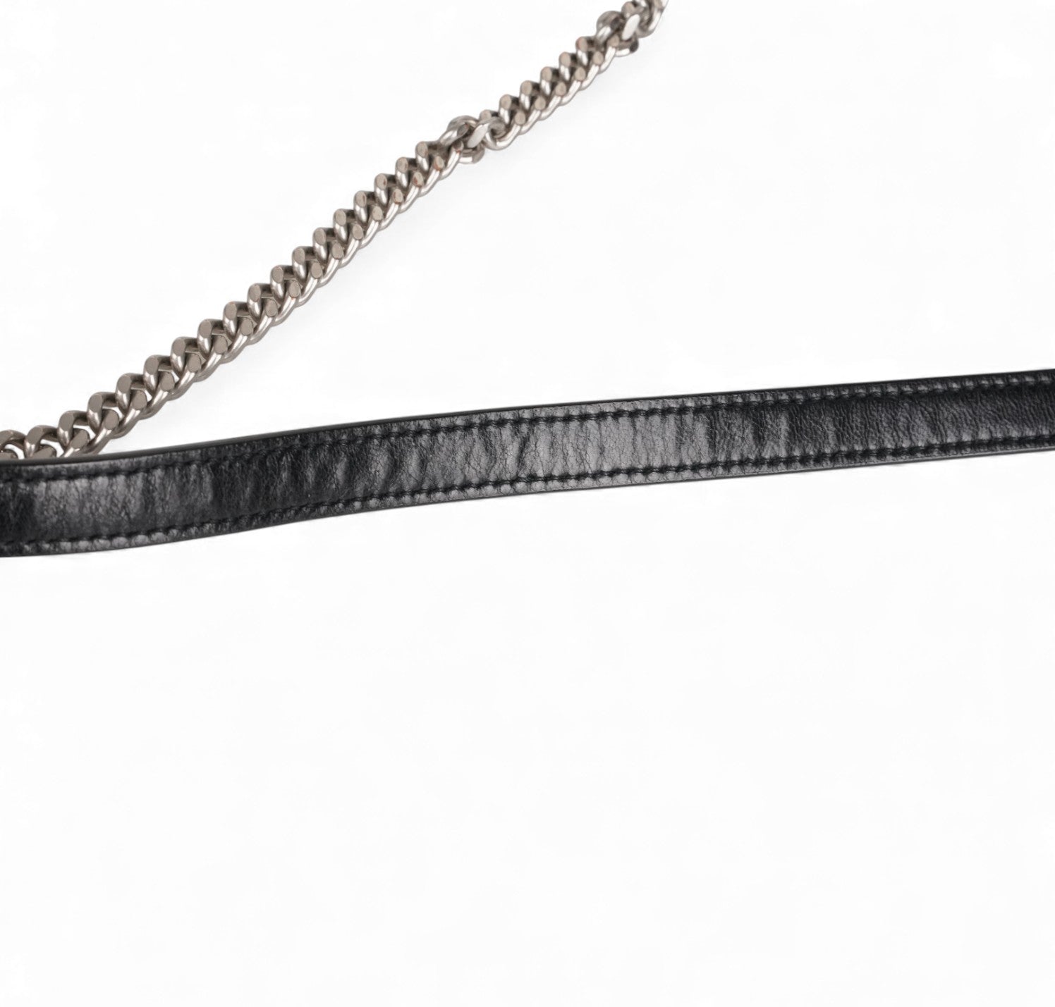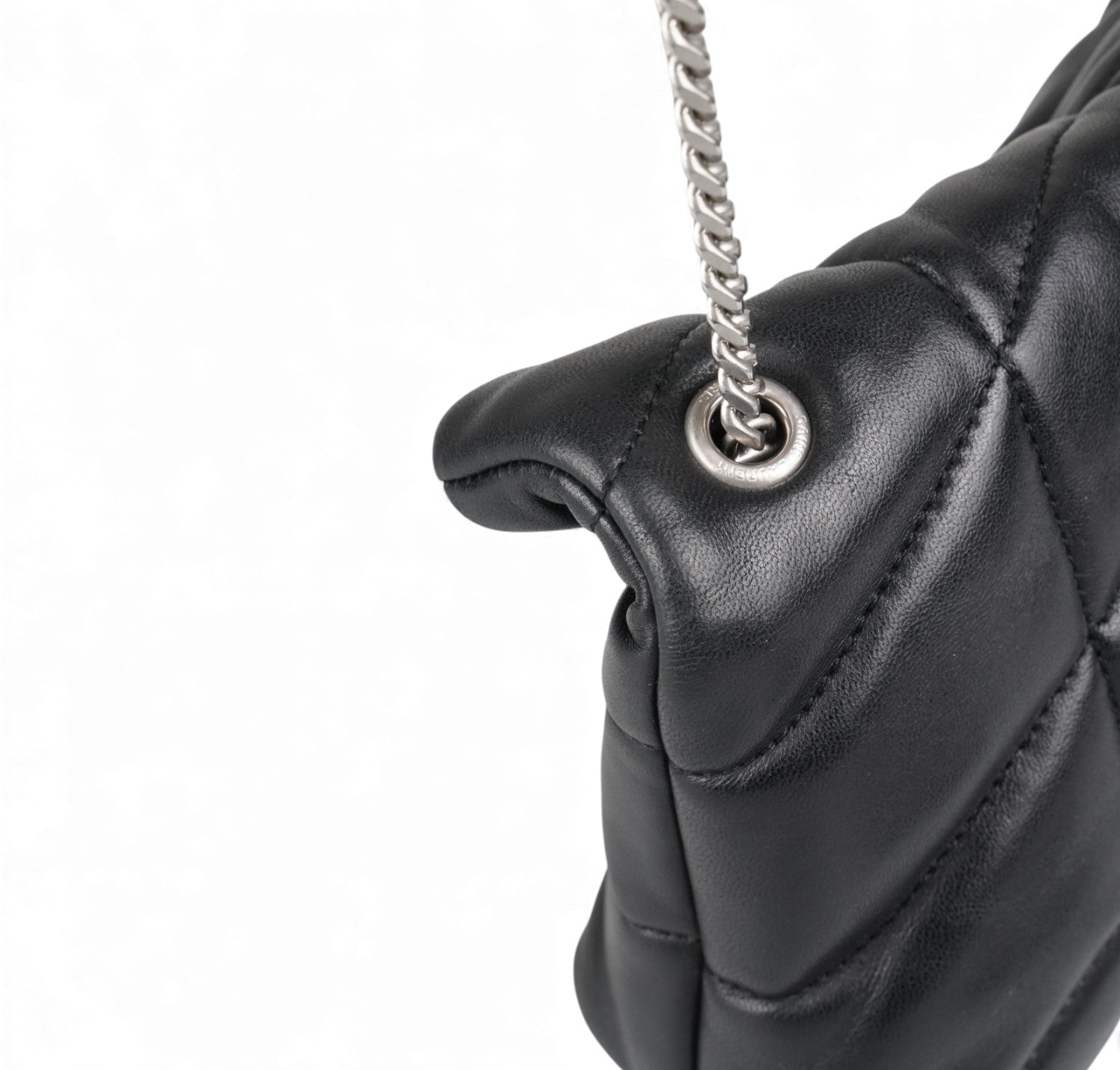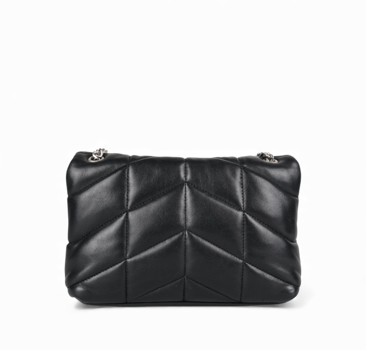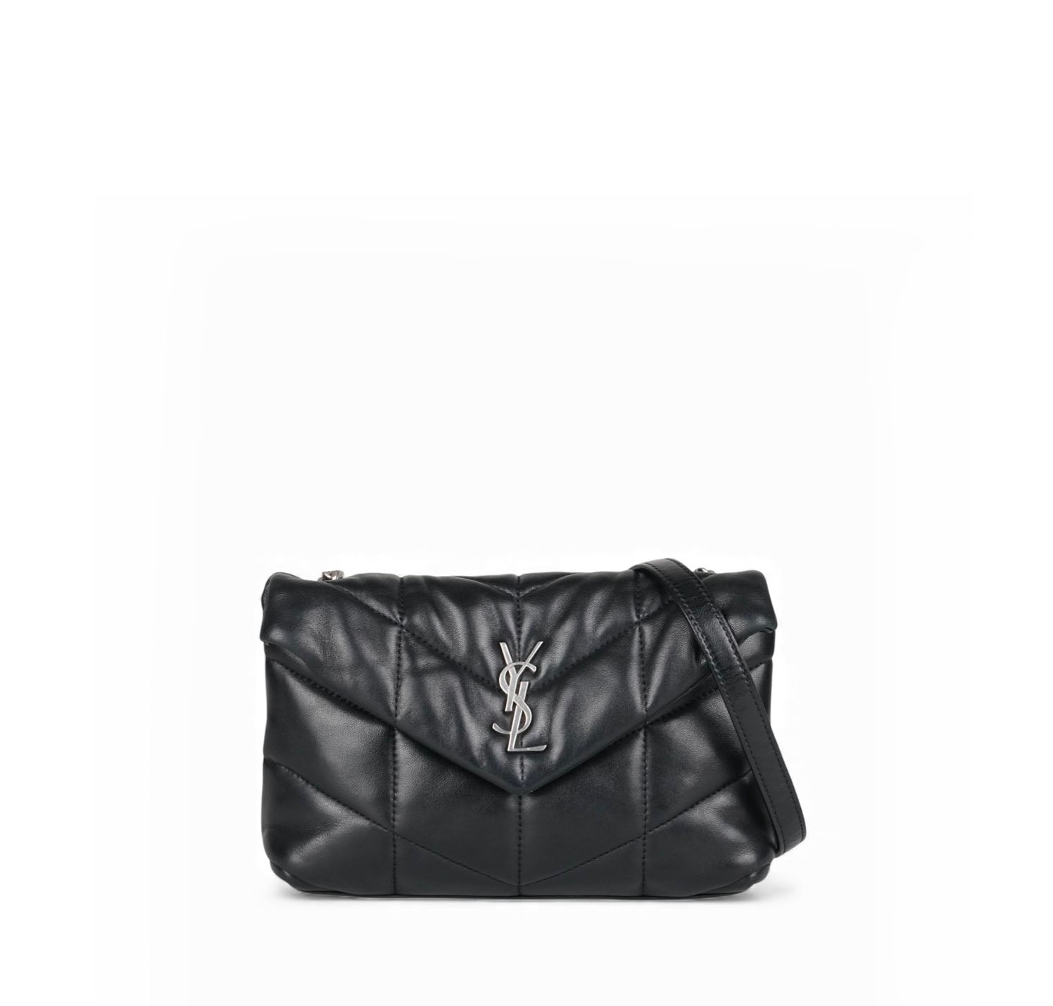 Saint Laurent bag, Puffer model, Small size, made of Black Leather. Antiqued Gold-colored metal hardware. Equipped with a chain shoulder strap with leather shoulder pad for shoulder or crossbody carry. Black fabric lined interior, zip pocket. External magnetic closure with flap embellished with YSL logo. In excellent general condition, slight embossing of the leather under the flap, minimal signs of use.