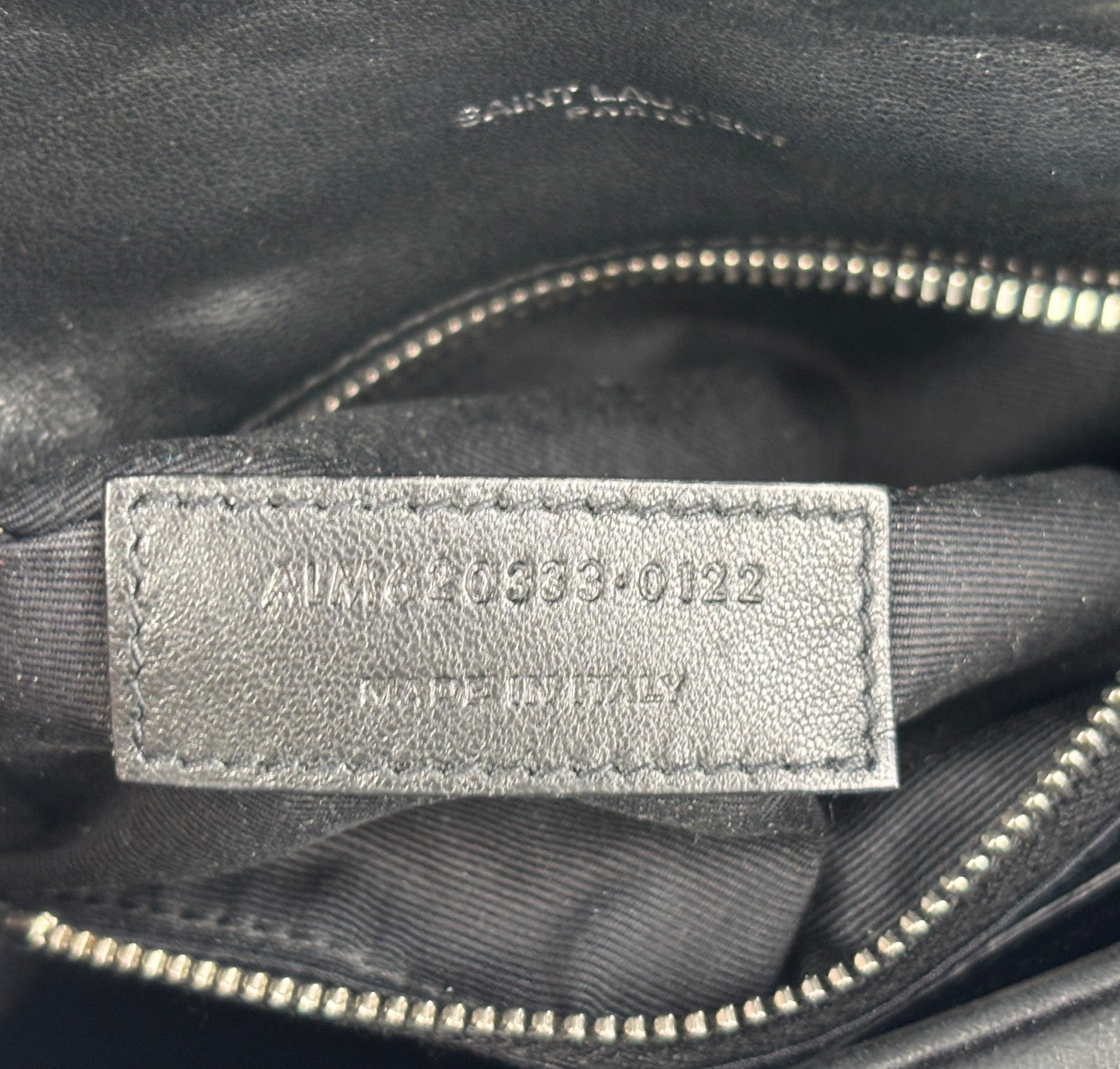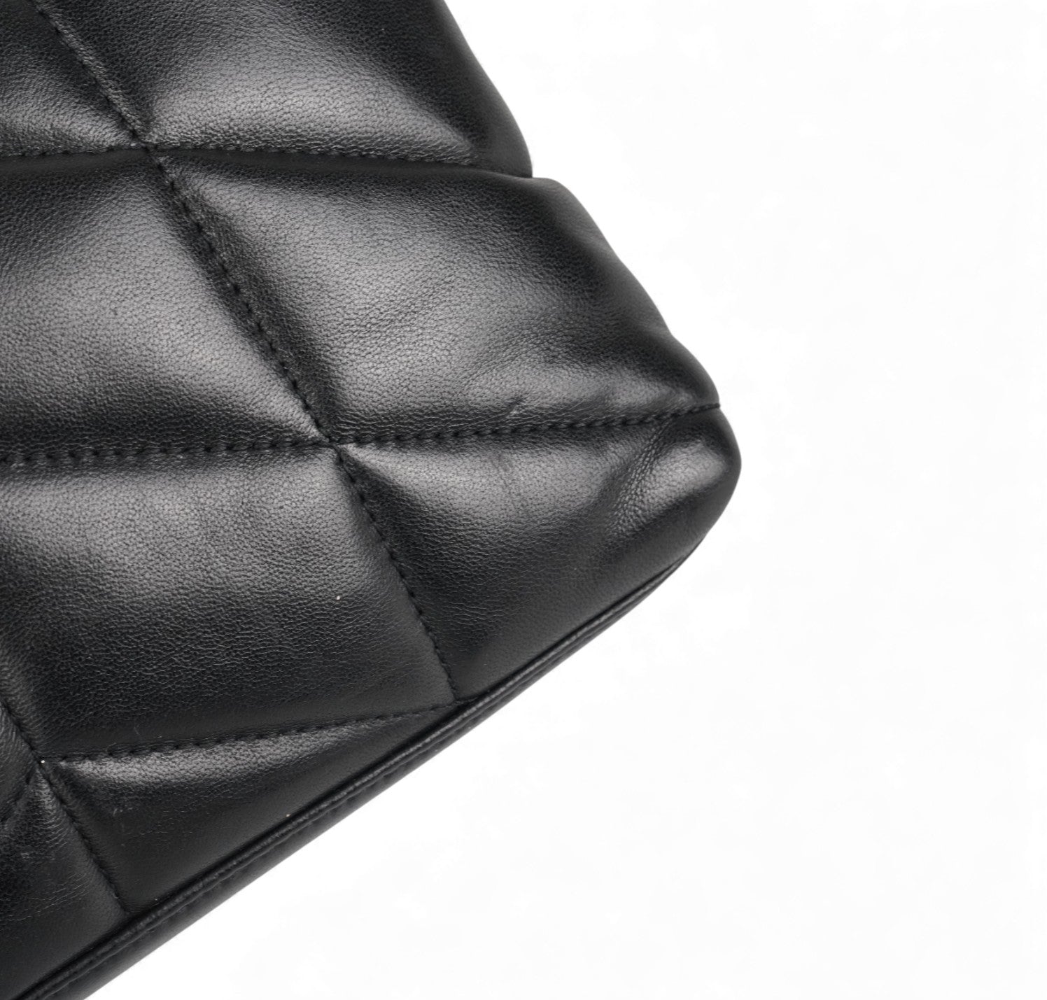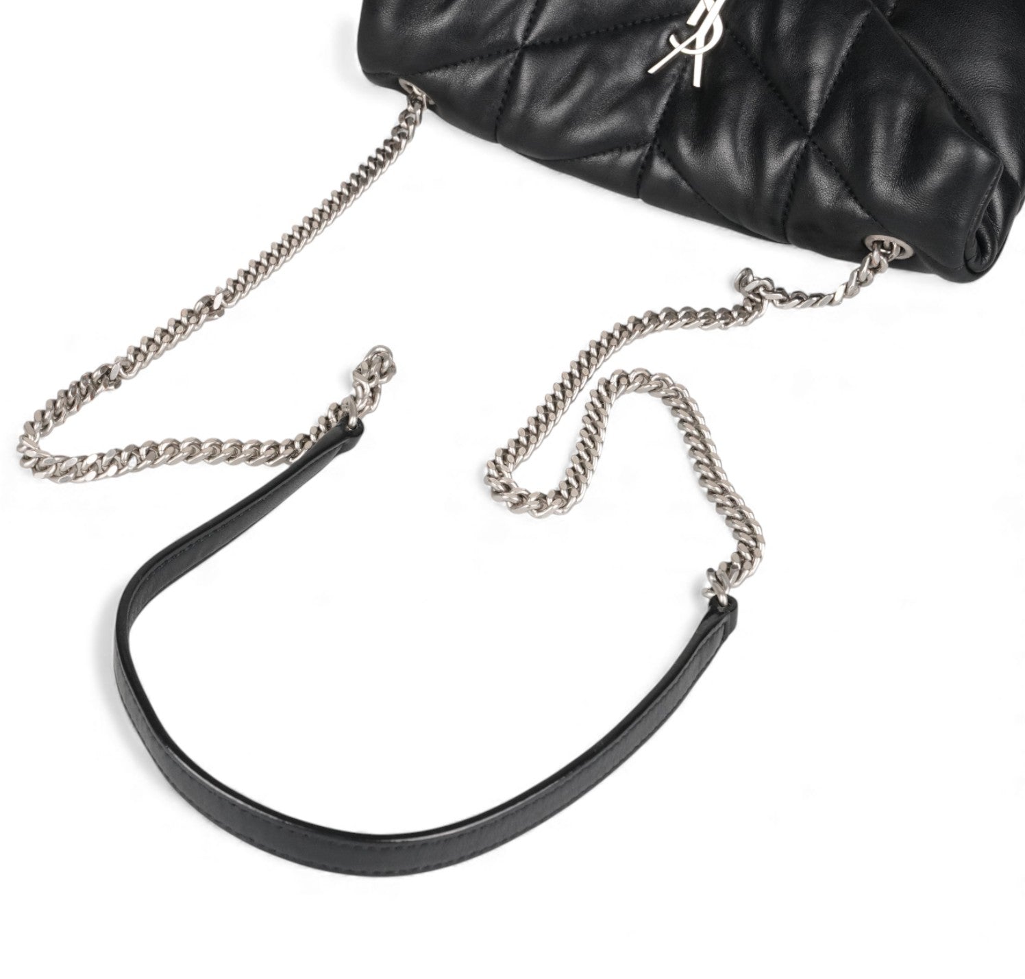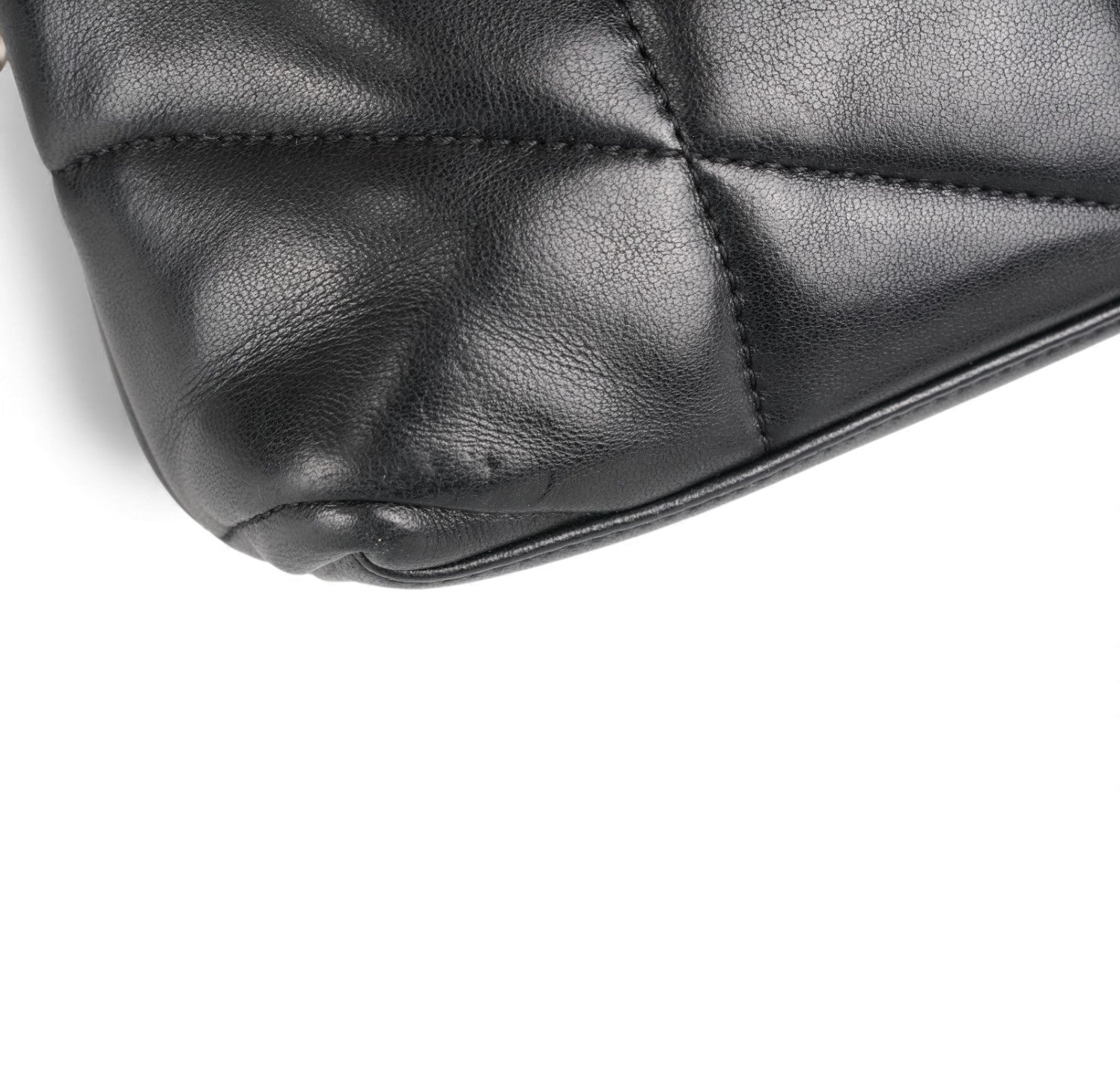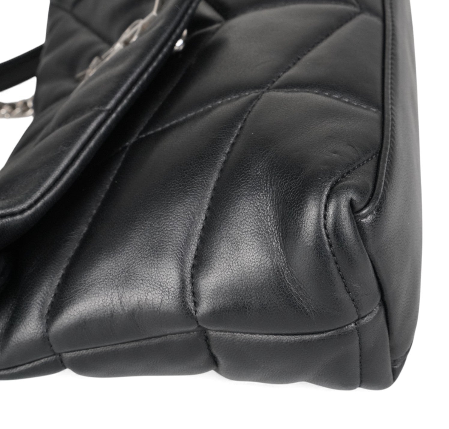 Saint Laurent bag, Puffer model, Small size, made of Black Leather. Antiqued Gold-colored metal hardware. Equipped with a chain shoulder strap with leather shoulder pad for shoulder or crossbody carry. Black fabric lined interior, zip pocket. External magnetic closure with flap embellished with YSL logo. In excellent general condition, slight embossing of the leather under the flap, minimal signs of use.