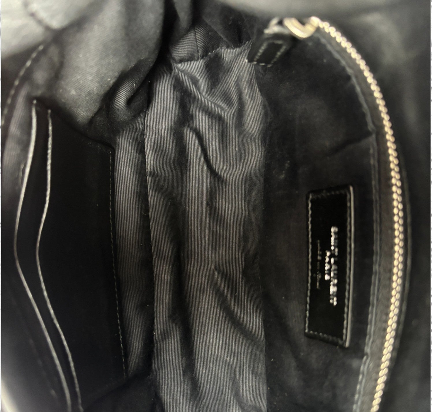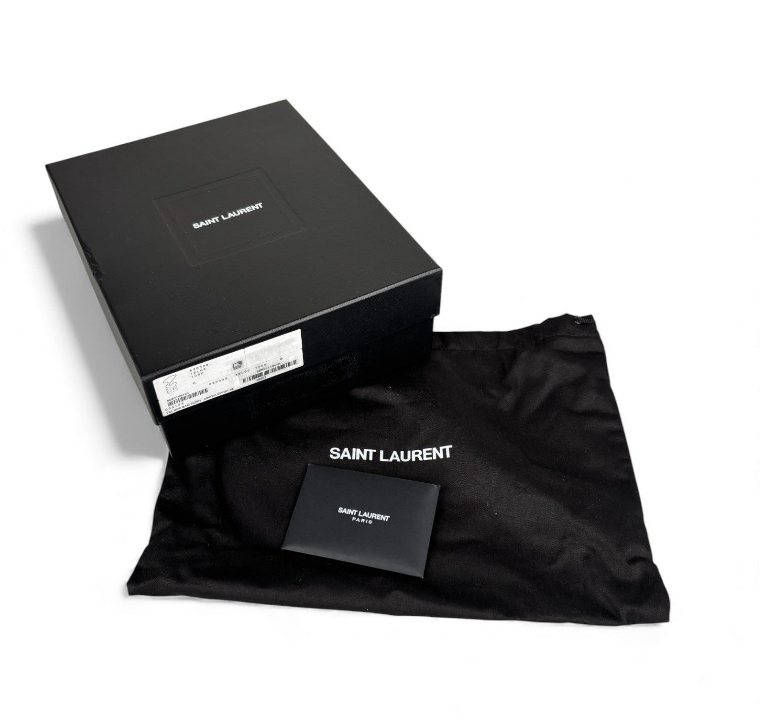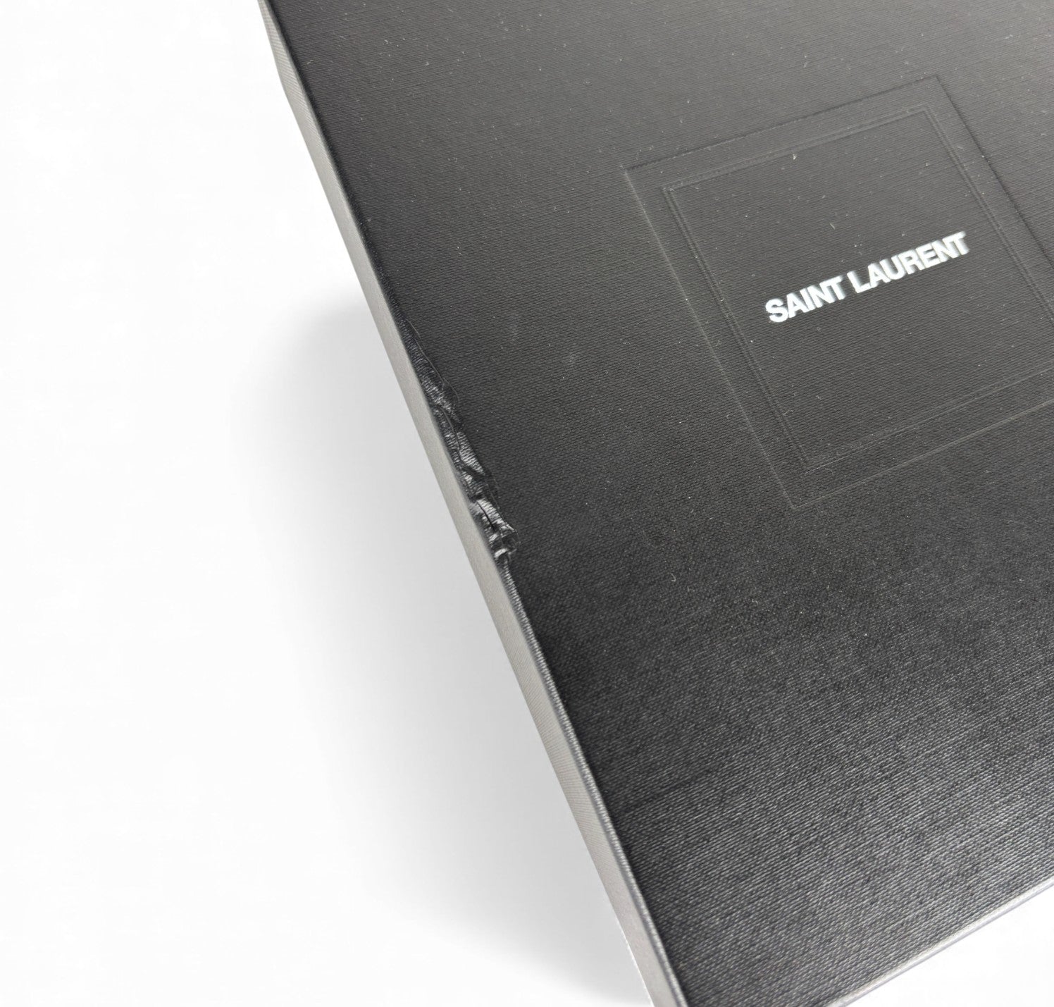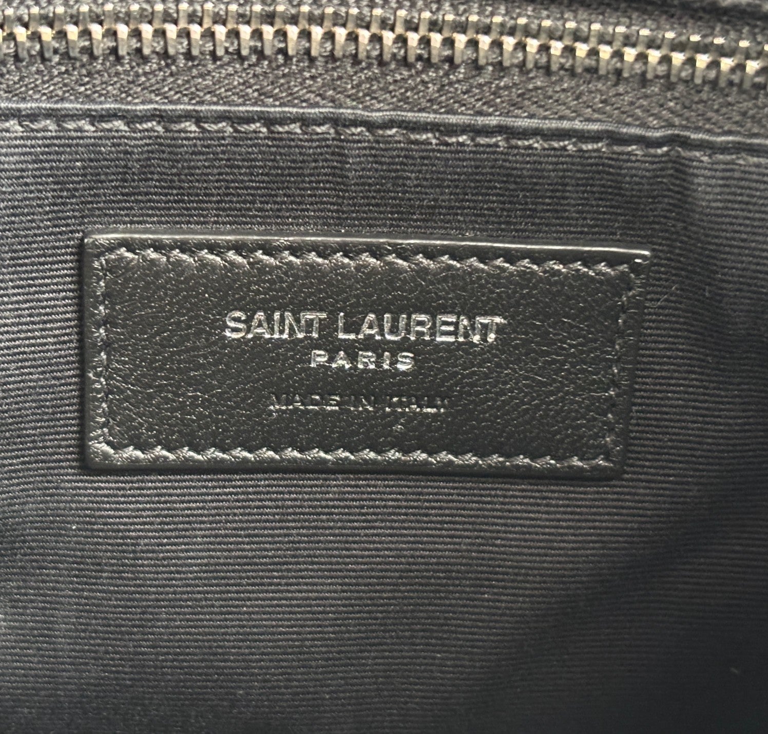 Saint Laurent bag, Puffer model, Small size, made of Black Leather. Antiqued Gold-colored metal hardware. Equipped with a chain shoulder strap with leather shoulder pad for shoulder or crossbody carry. Black fabric lined interior, zip pocket. External magnetic closure with flap embellished with YSL logo. In excellent general condition, slight embossing of the leather under the flap, minimal signs of use.