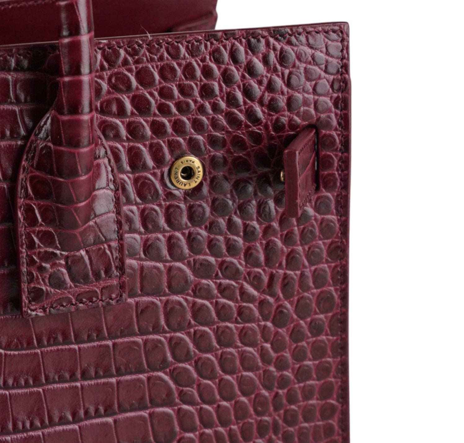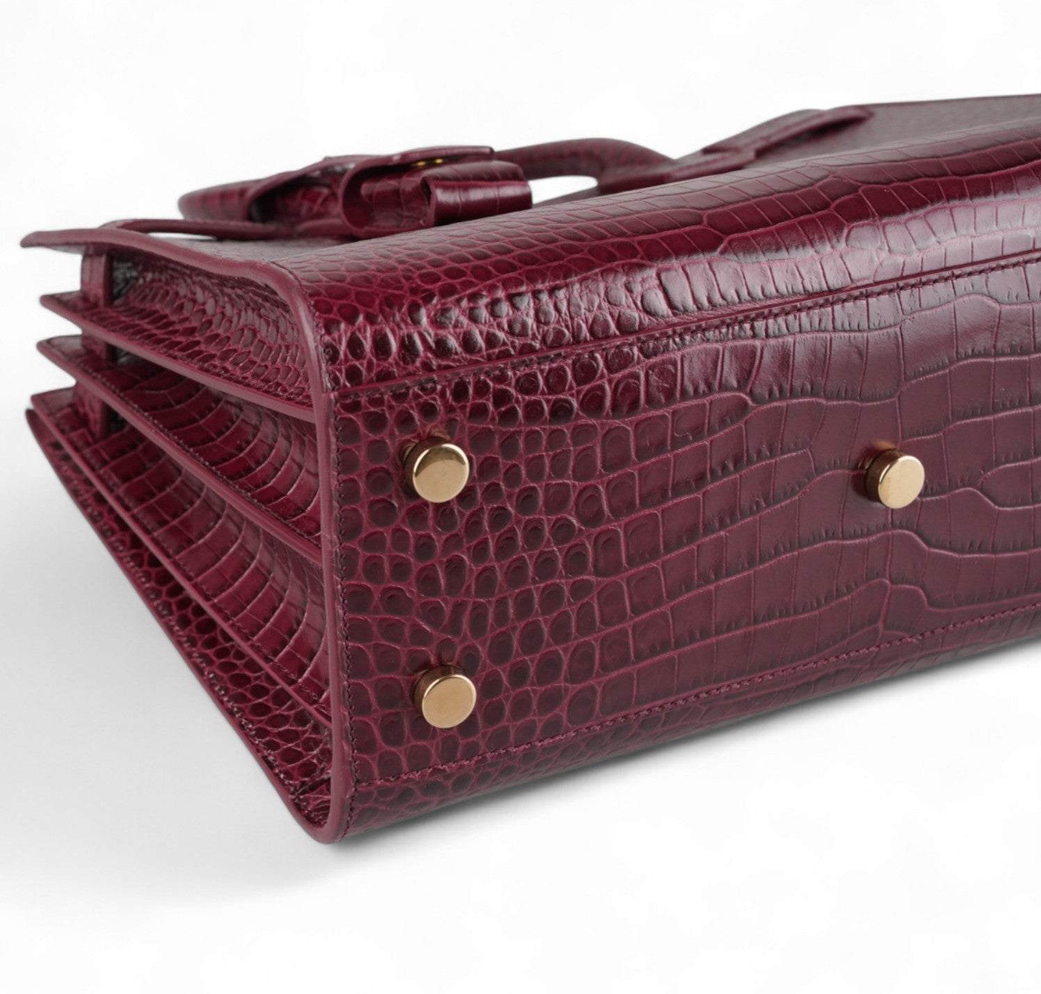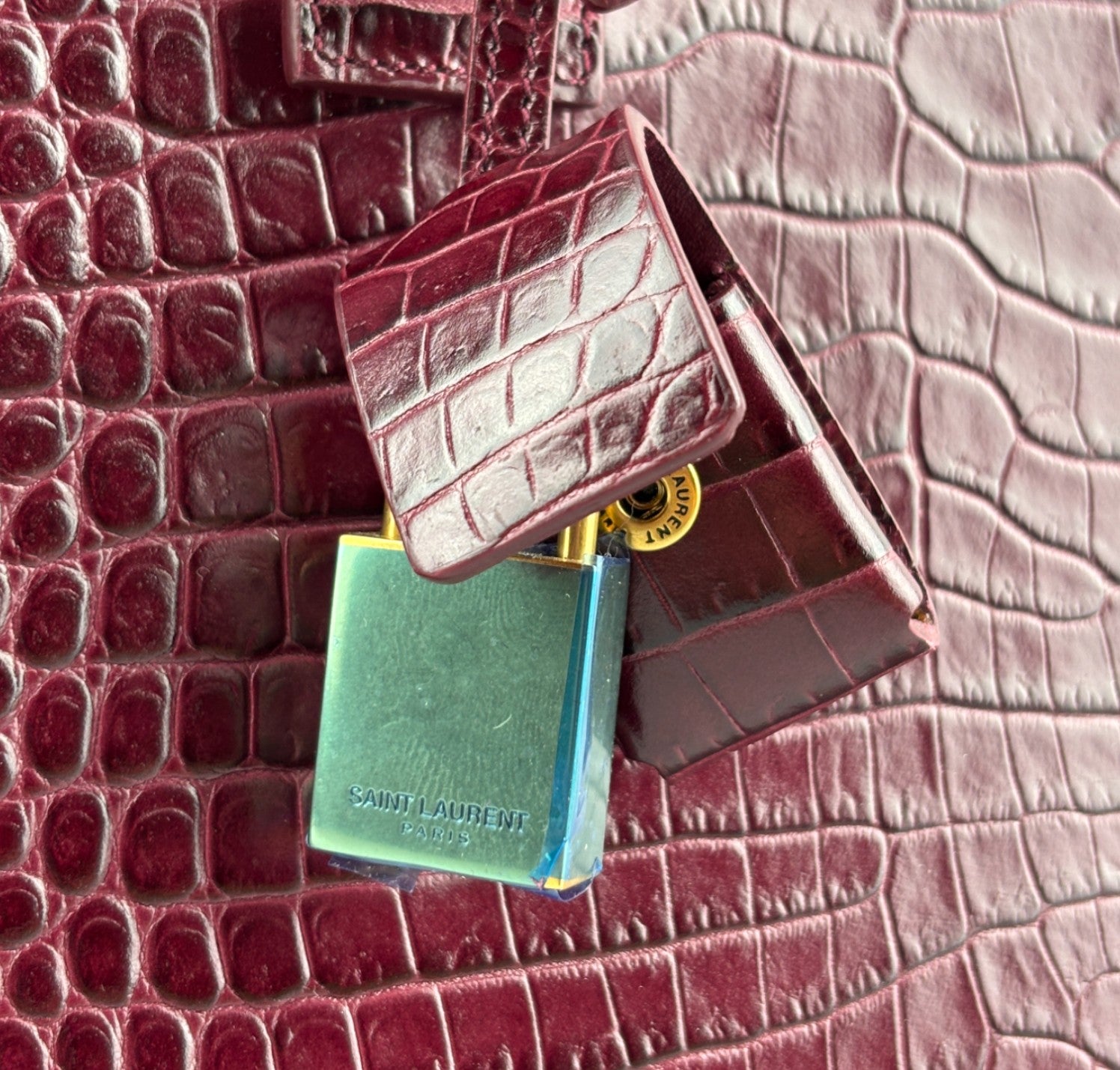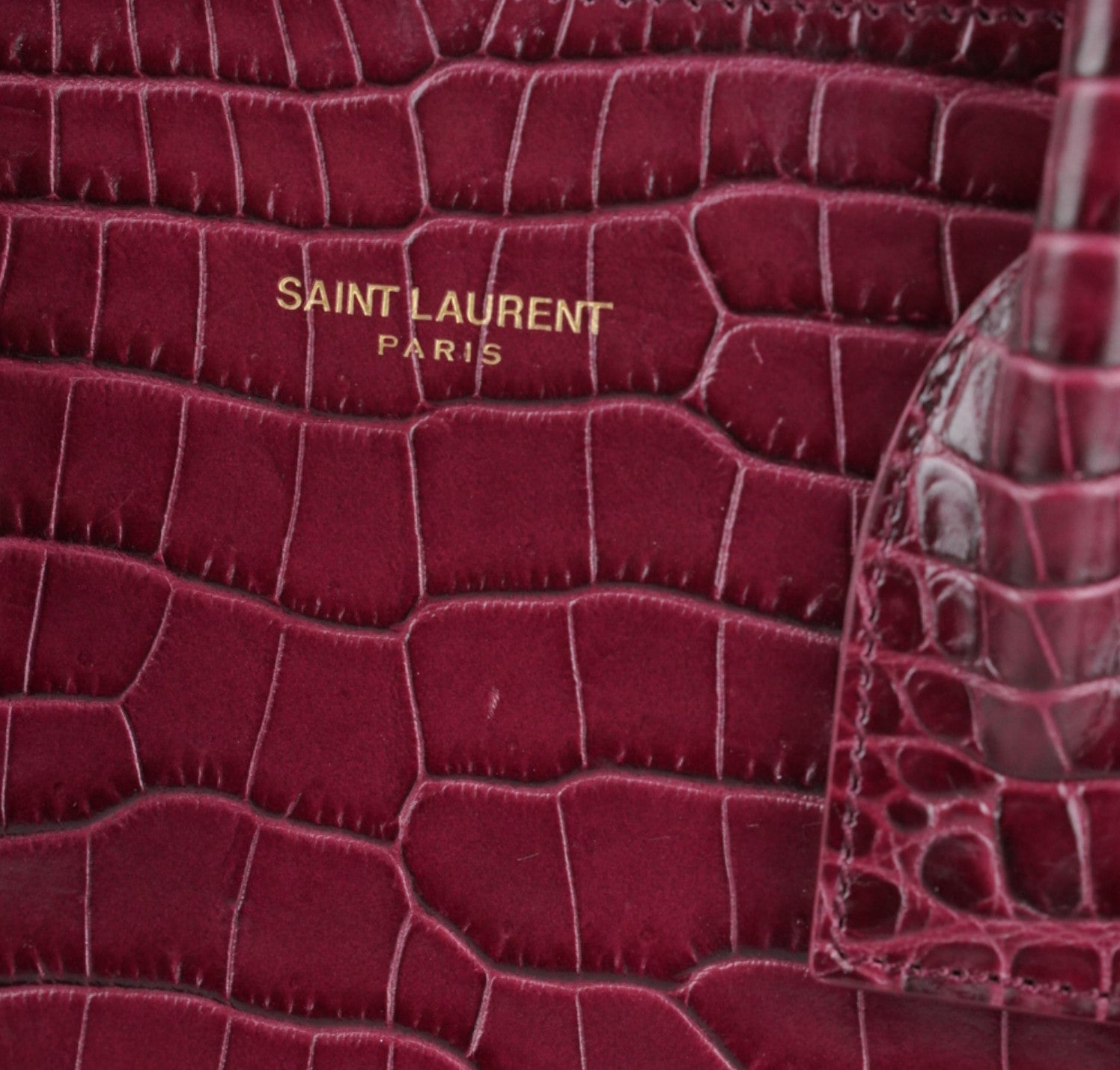 Borsa Saint Laurent, modello Sac de Jour, misura Baby in pelle effetto Coccodrillo tonalità Burgundy. Caratterizzata da linee strutturate e forma rigida. Doppi manici superiori e tracolla rimovibile e regolabile per l'indosso a spalla o crossbody. Interno spazioso con scomparti e zip centrale. Priva di chiusura superiore. Presenta qualche graffio interno dovuto al normale utilizzo ma si trova in ottimo stato complessivo. Un modello intramontabile, attualmente ancora presente nelle collezioni Saint Laurent, perfetto per completare look eleganti o daily chic.