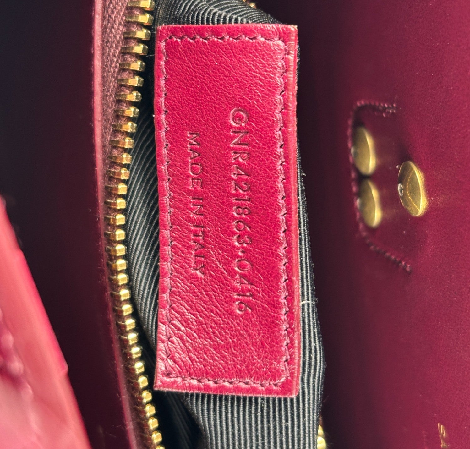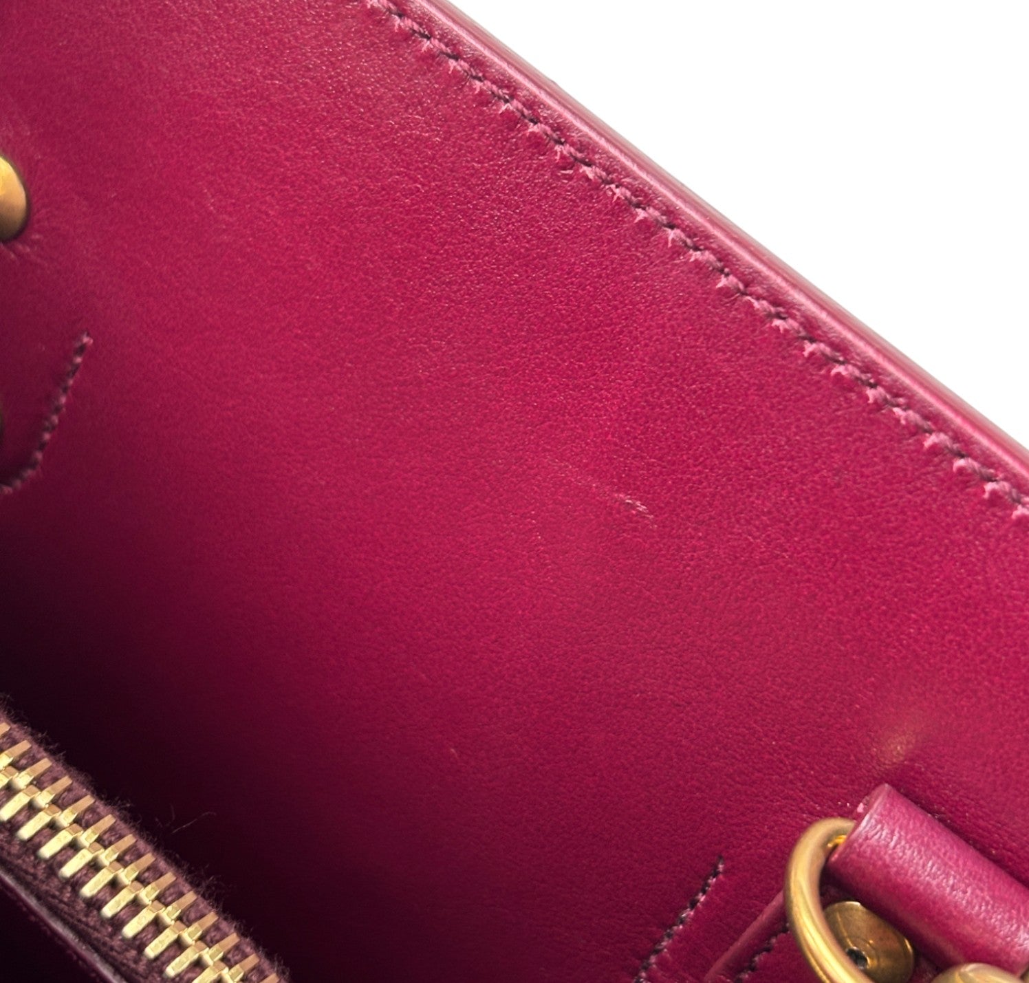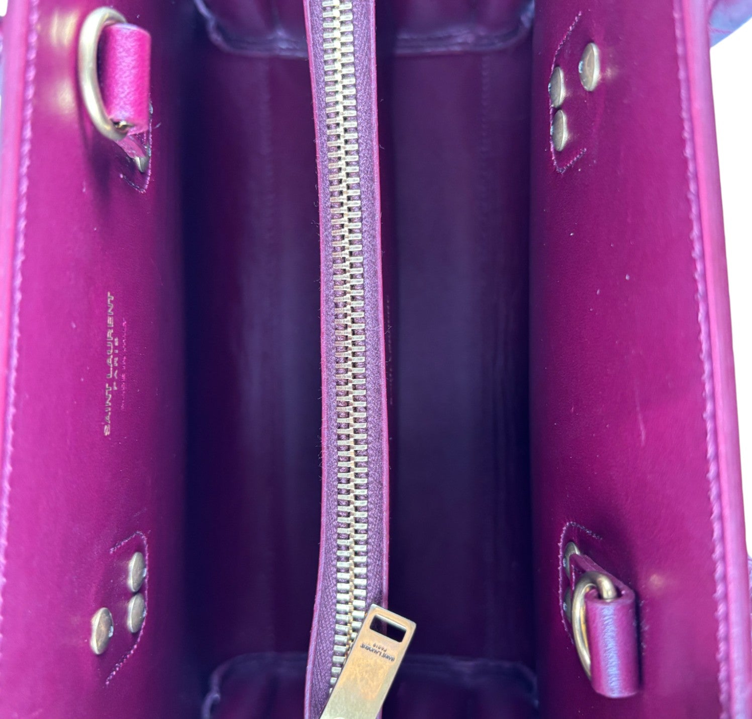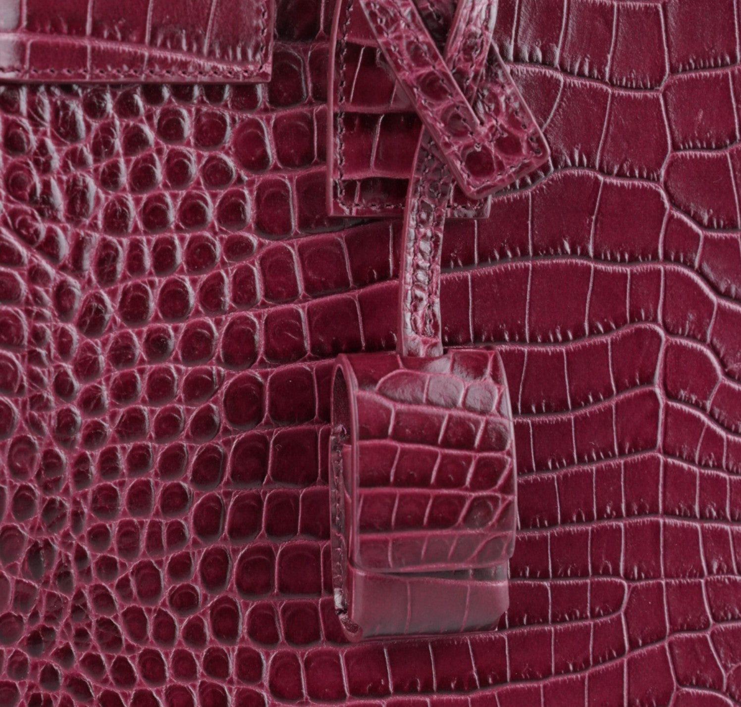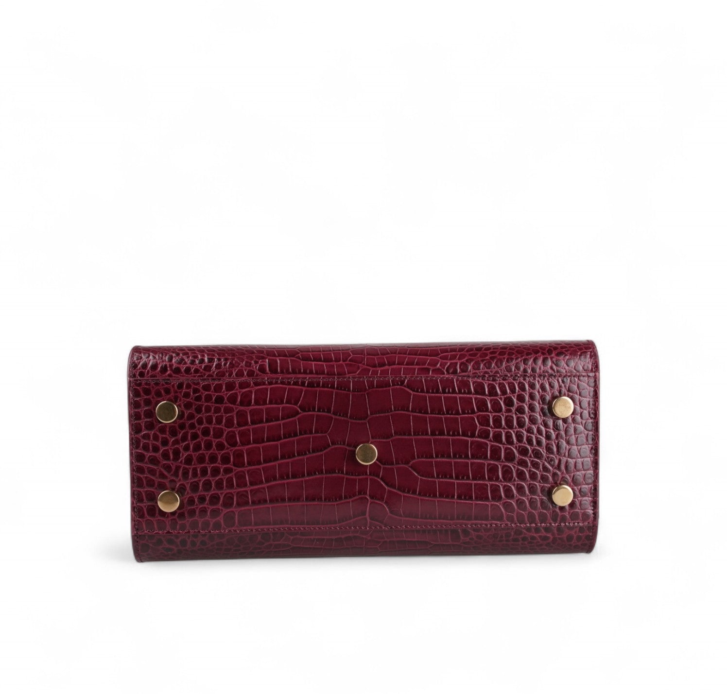 Borsa Saint Laurent, modello Sac de Jour, misura Baby in pelle effetto Coccodrillo tonalità Burgundy. Caratterizzata da linee strutturate e forma rigida. Doppi manici superiori e tracolla rimovibile e regolabile per l'indosso a spalla o crossbody. Interno spazioso con scomparti e zip centrale. Priva di chiusura superiore. Presenta qualche graffio interno dovuto al normale utilizzo ma si trova in ottimo stato complessivo. Un modello intramontabile, attualmente ancora presente nelle collezioni Saint Laurent, perfetto per completare look eleganti o daily chic.