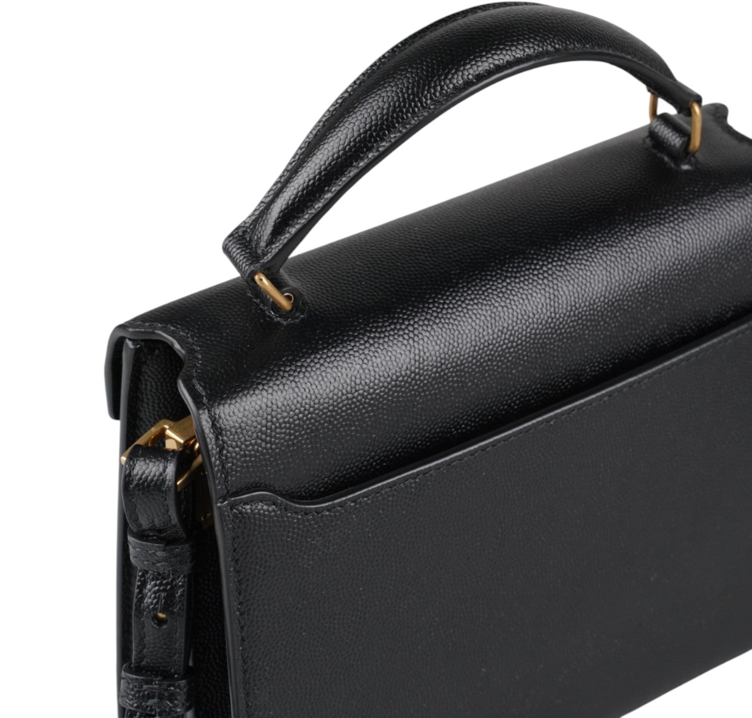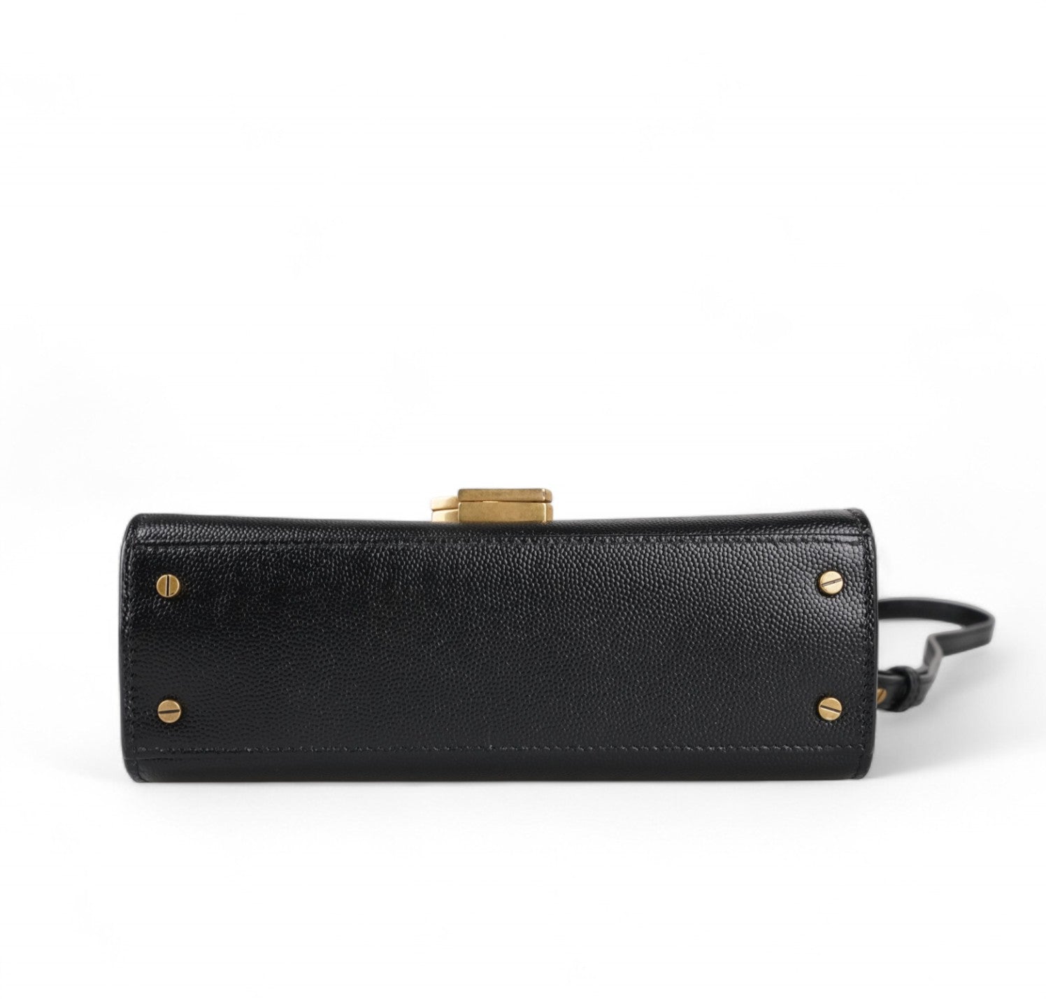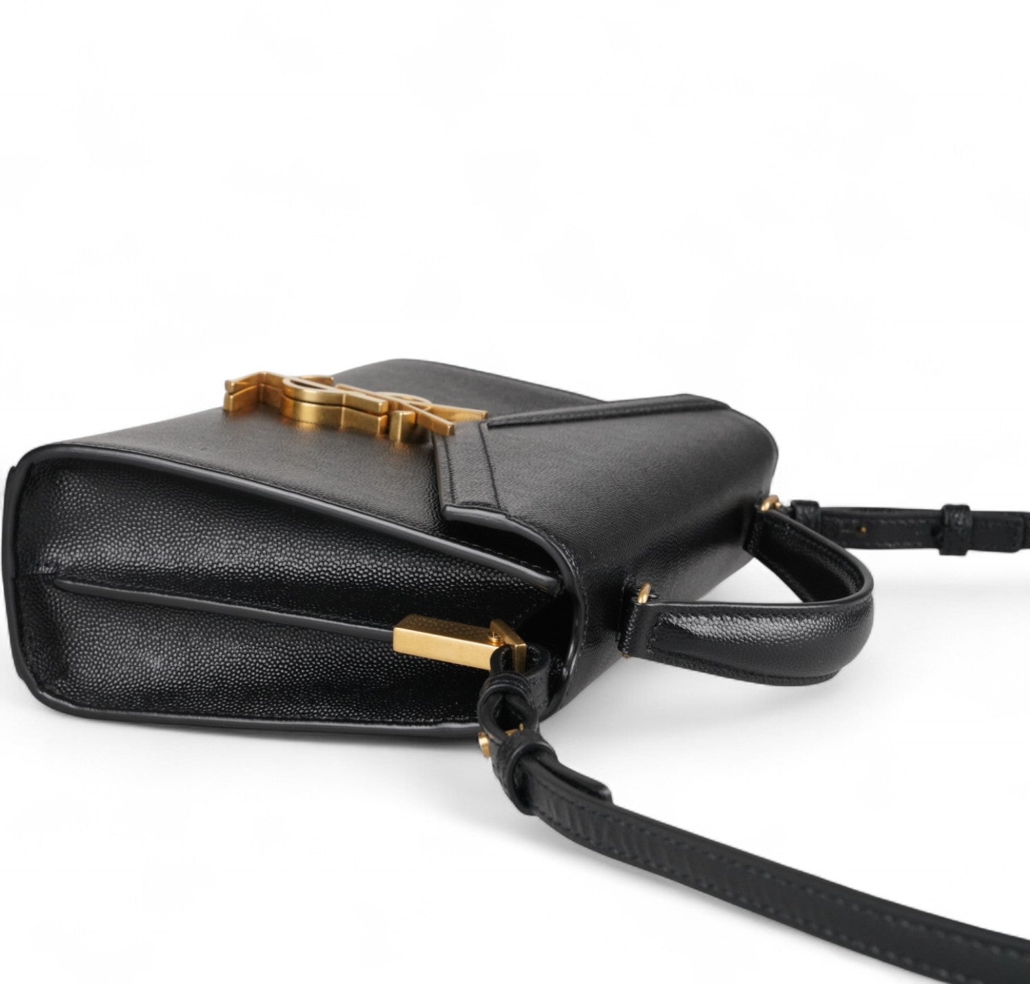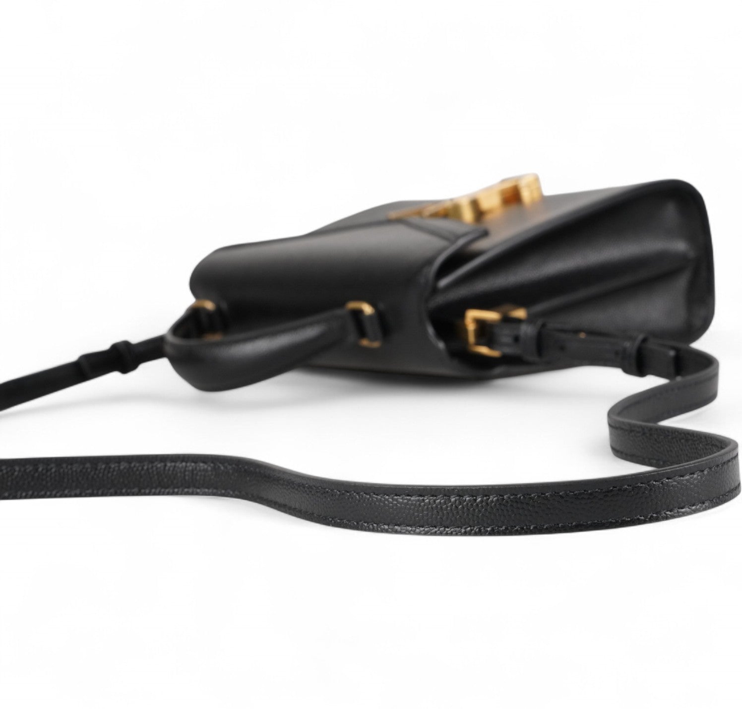 Borsa Saint Laurent, modello Cassandra, misura Mini, realizzata in pelle Nera con finiture in metallo dorato. Caratterizzata dall’iconico monogramma YSL frontale che funge anche da chiusura. Sotata di manico superiore e tracolla regolabile e removibile, che consente un doppio utilizzo: a mano o a spalla/crossbody. Interno compatto ma ben organizzato, con scomparti e tasca piatta. Modello perfetto per completare look eleganti e sofisticati. Condizioni pari al nuovo, potrebbe presentare micro segni di stoccaggio.