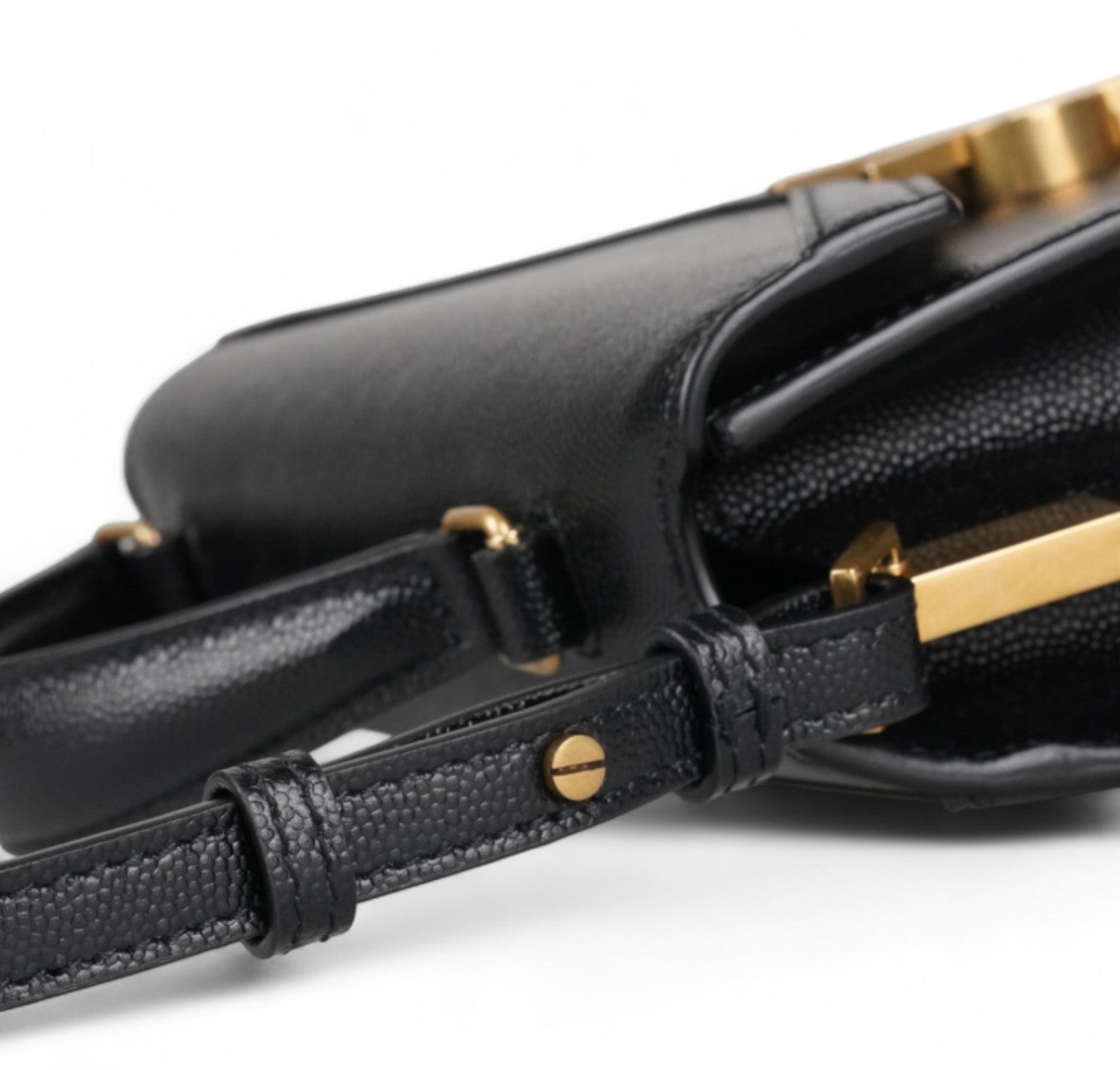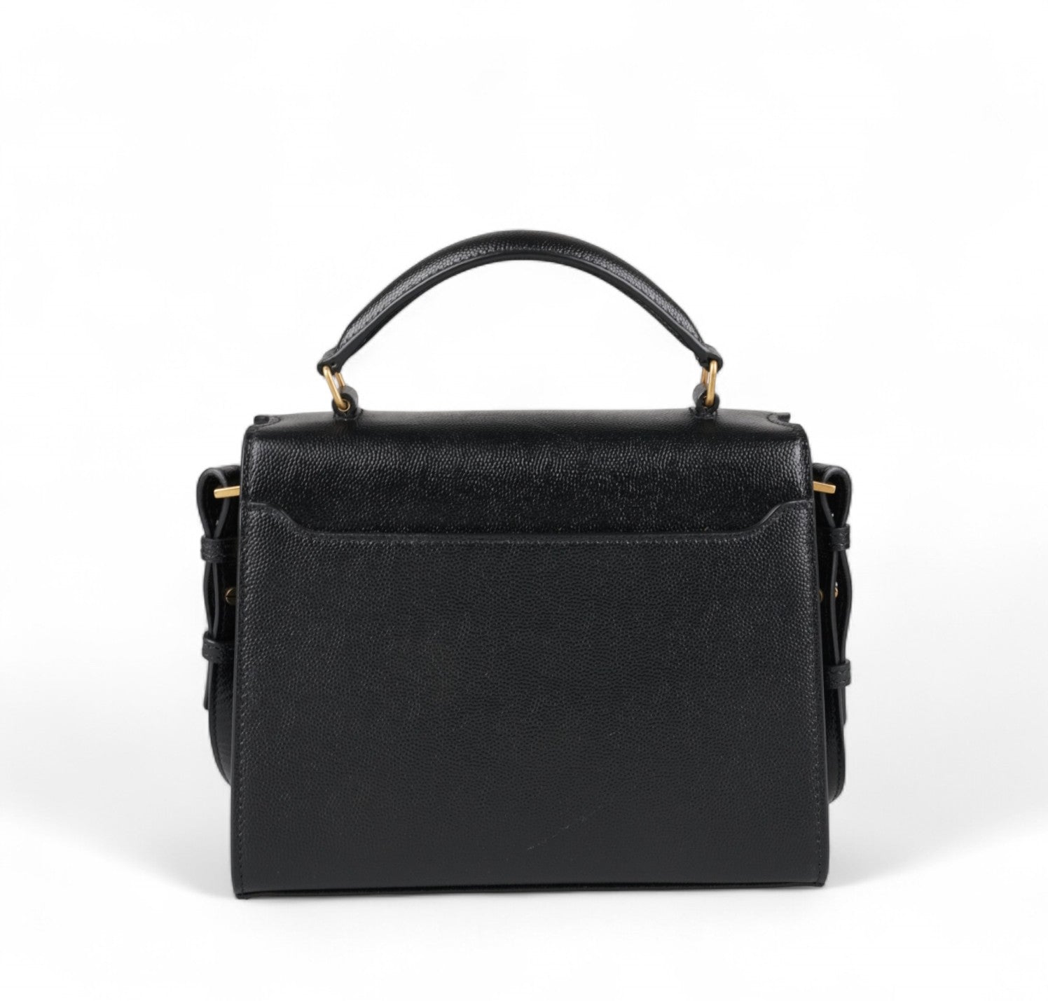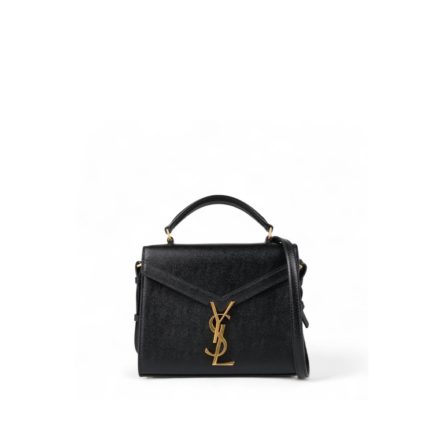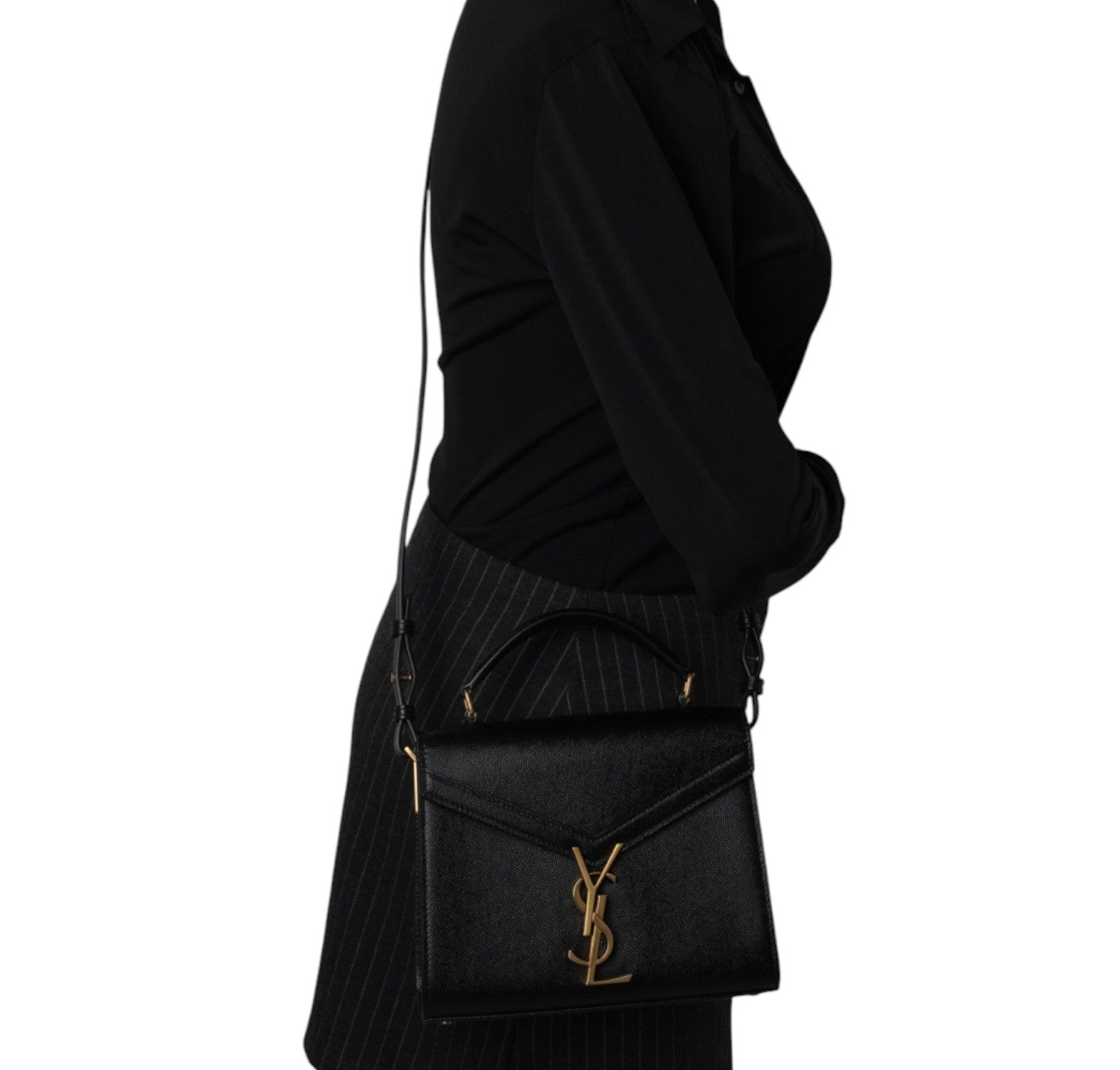 Borsa Saint Laurent, modello Cassandra, misura Mini, realizzata in pelle Nera con finiture in metallo dorato. Caratterizzata dall’iconico monogramma YSL frontale che funge anche da chiusura. Sotata di manico superiore e tracolla regolabile e removibile, che consente un doppio utilizzo: a mano o a spalla/crossbody. Interno compatto ma ben organizzato, con scomparti e tasca piatta. Modello perfetto per completare look eleganti e sofisticati. Condizioni pari al nuovo, potrebbe presentare micro segni di stoccaggio.