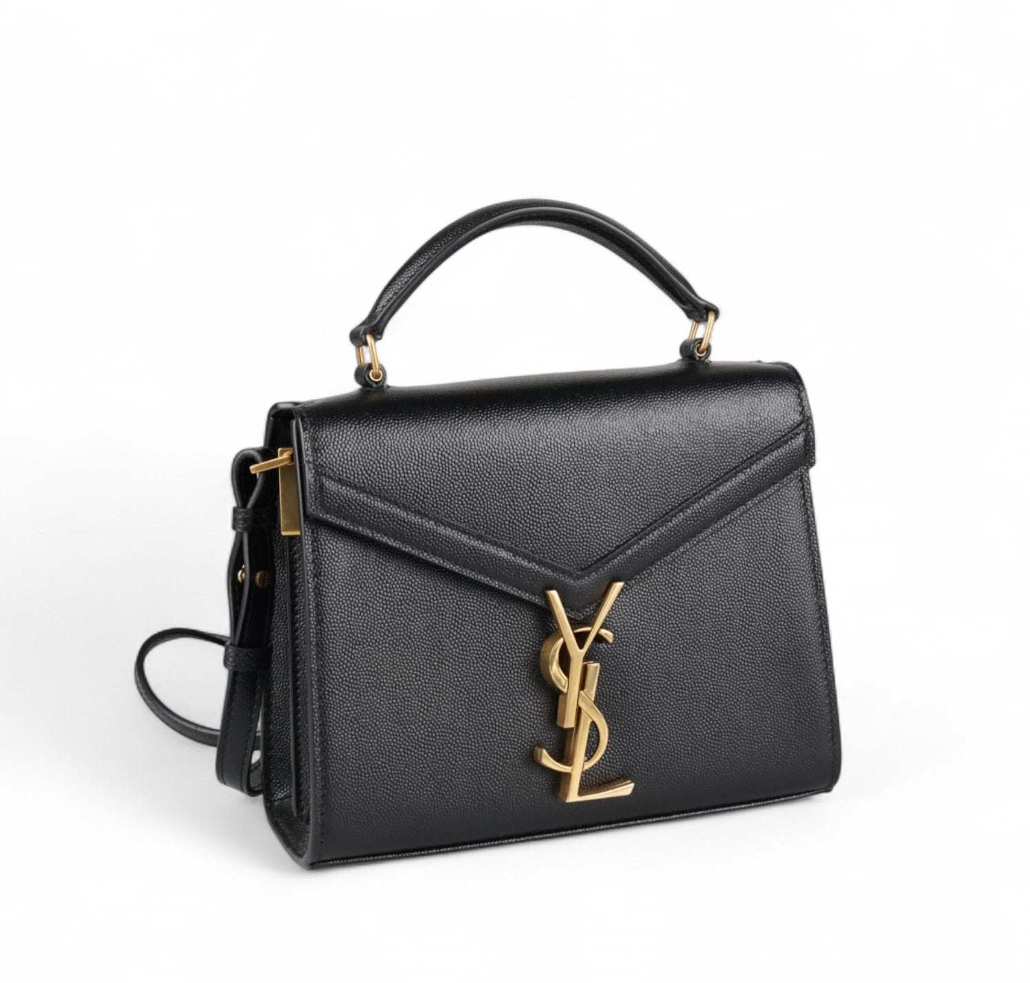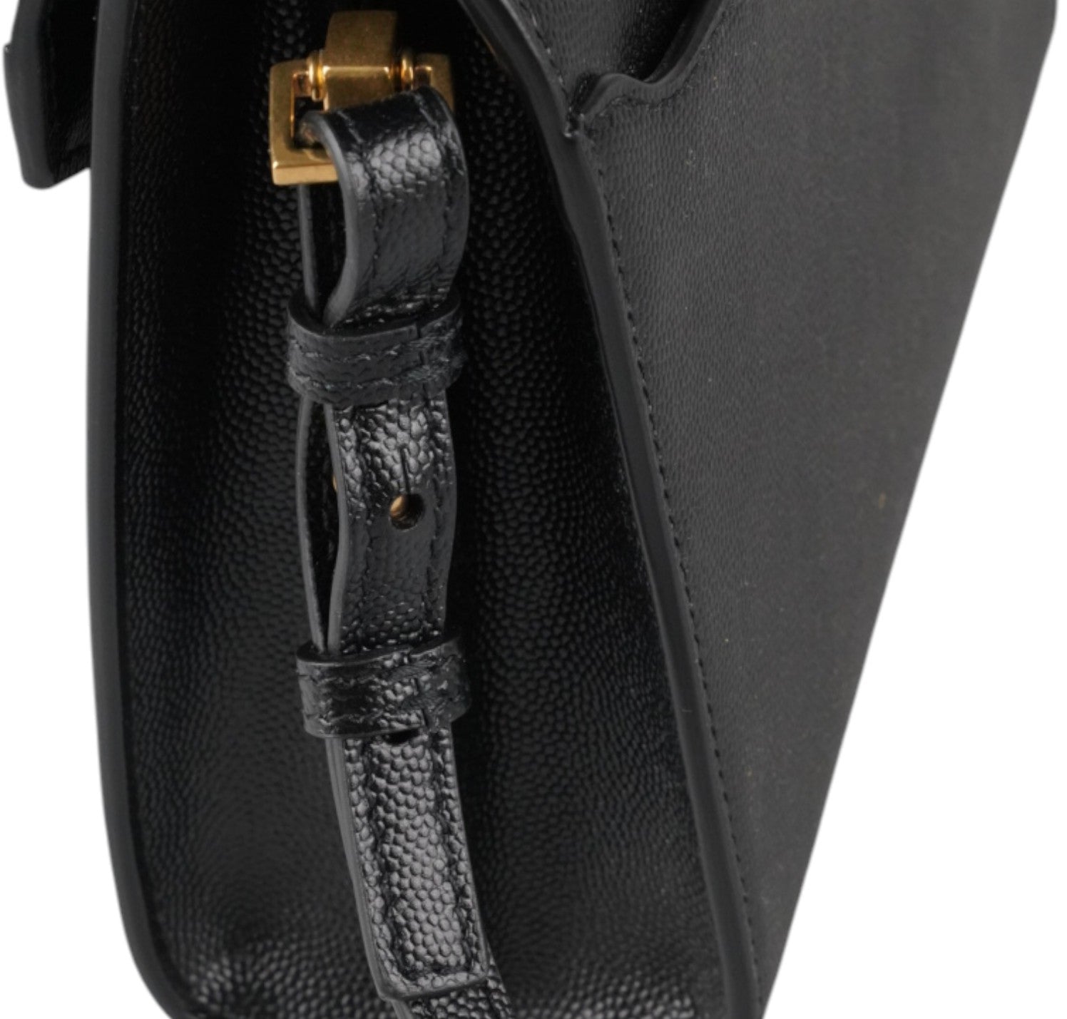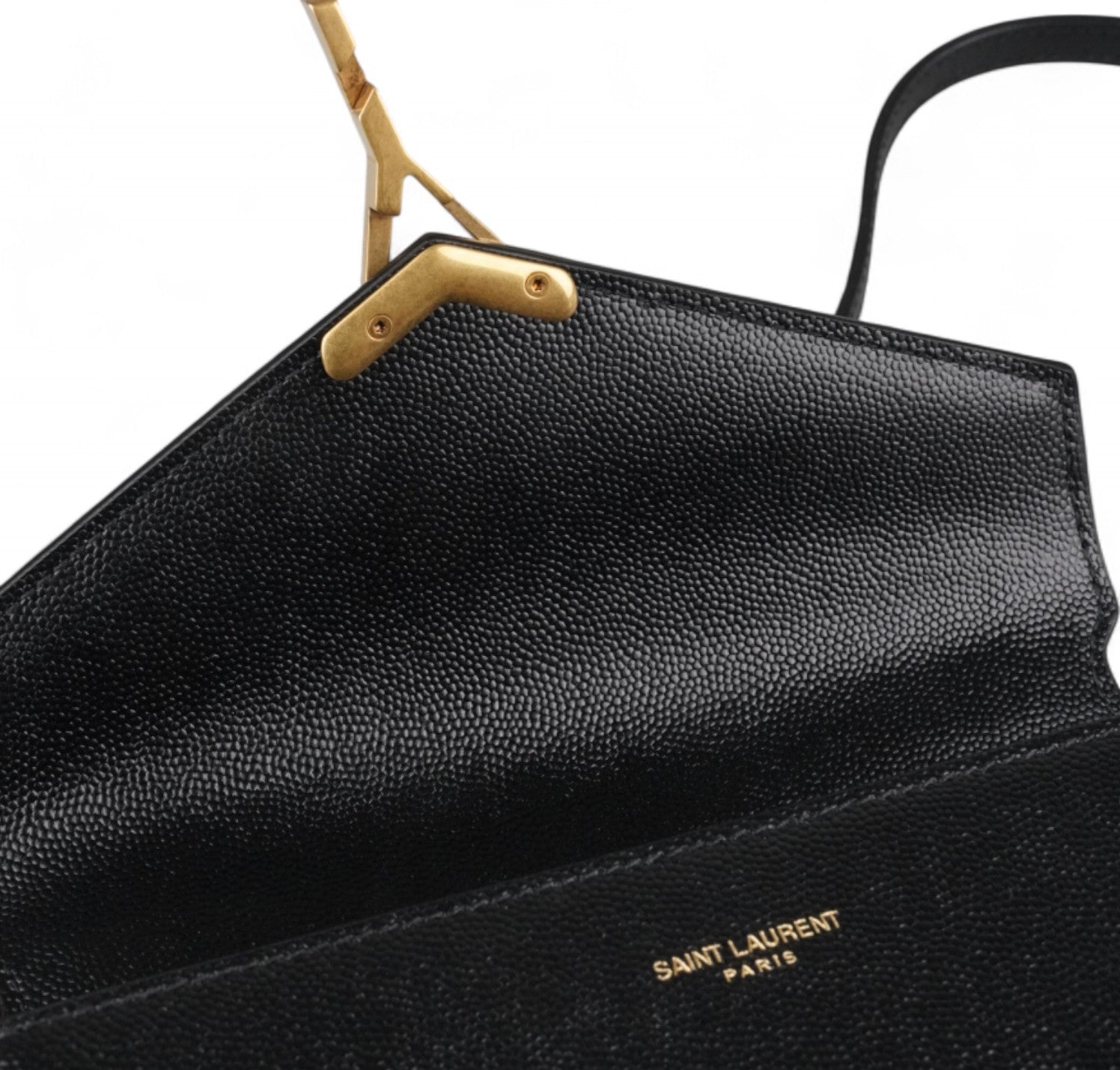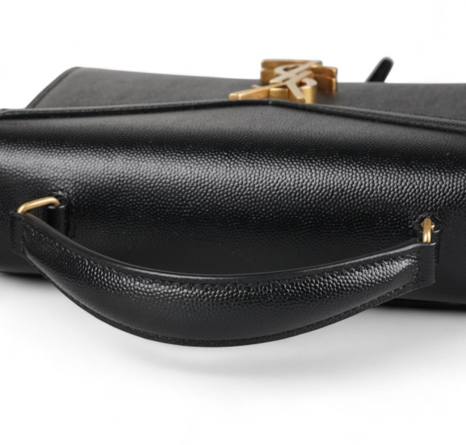 Borsa Saint Laurent, modello Cassandra, misura Mini, realizzata in pelle Nera con finiture in metallo dorato. Caratterizzata dall’iconico monogramma YSL frontale che funge anche da chiusura. Sotata di manico superiore e tracolla regolabile e removibile, che consente un doppio utilizzo: a mano o a spalla/crossbody. Interno compatto ma ben organizzato, con scomparti e tasca piatta. Modello perfetto per completare look eleganti e sofisticati. Condizioni pari al nuovo, potrebbe presentare micro segni di stoccaggio.