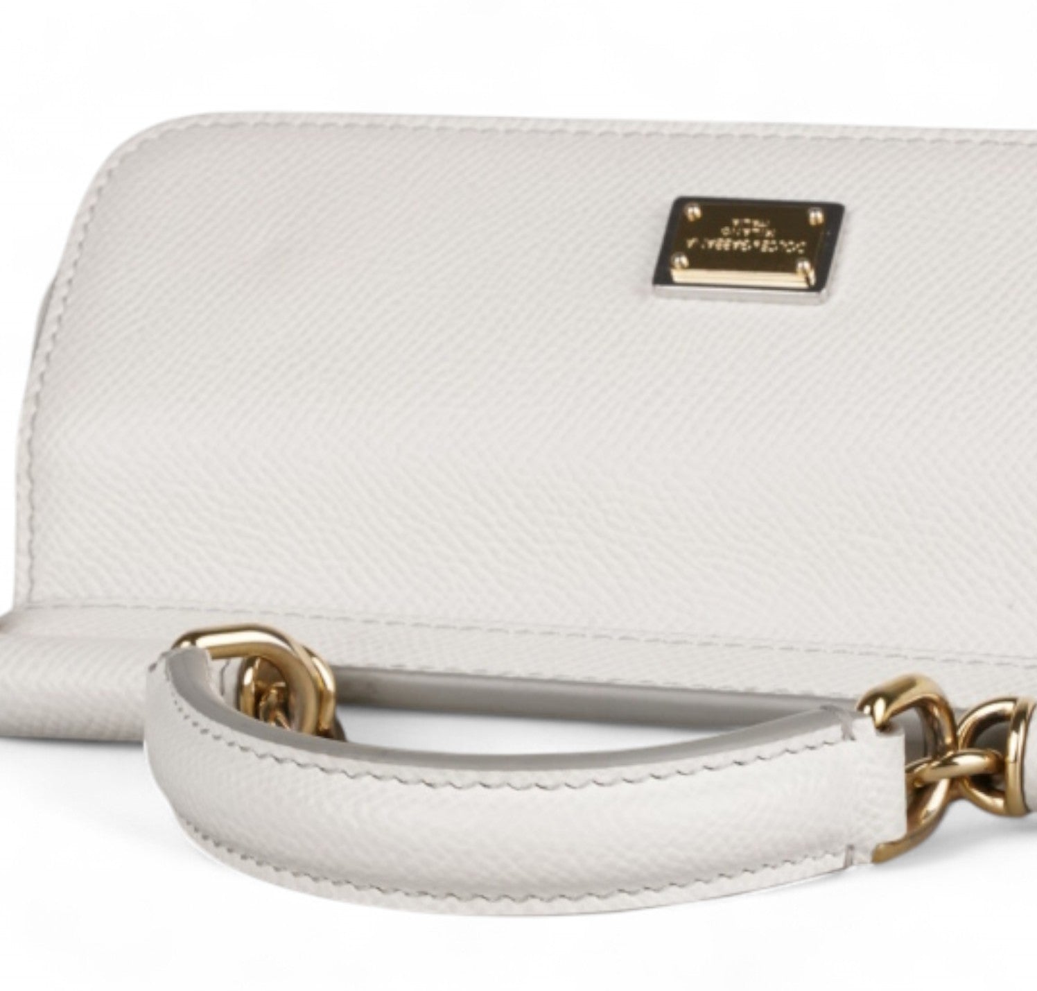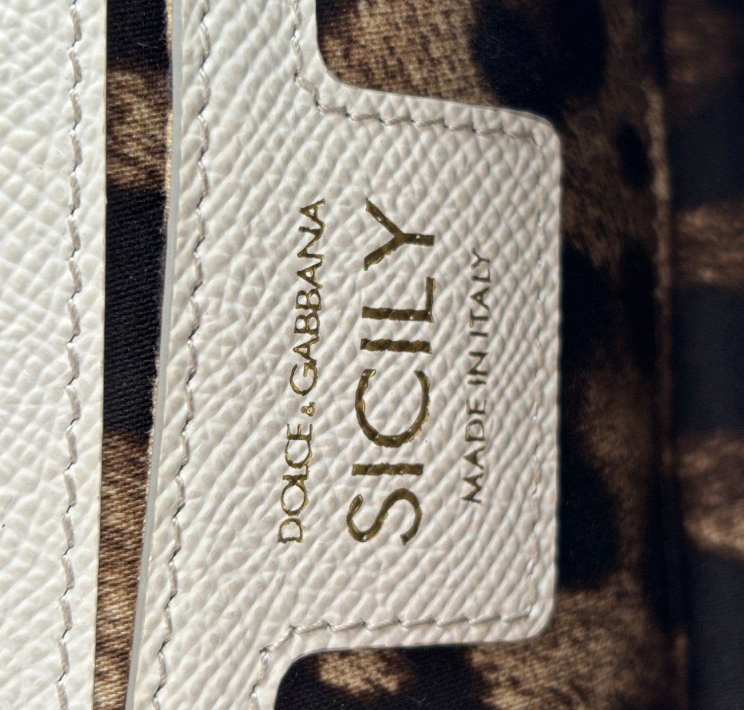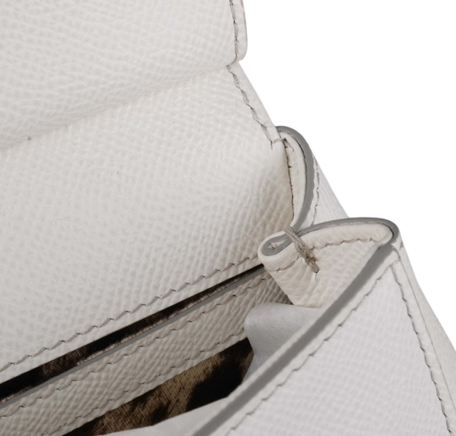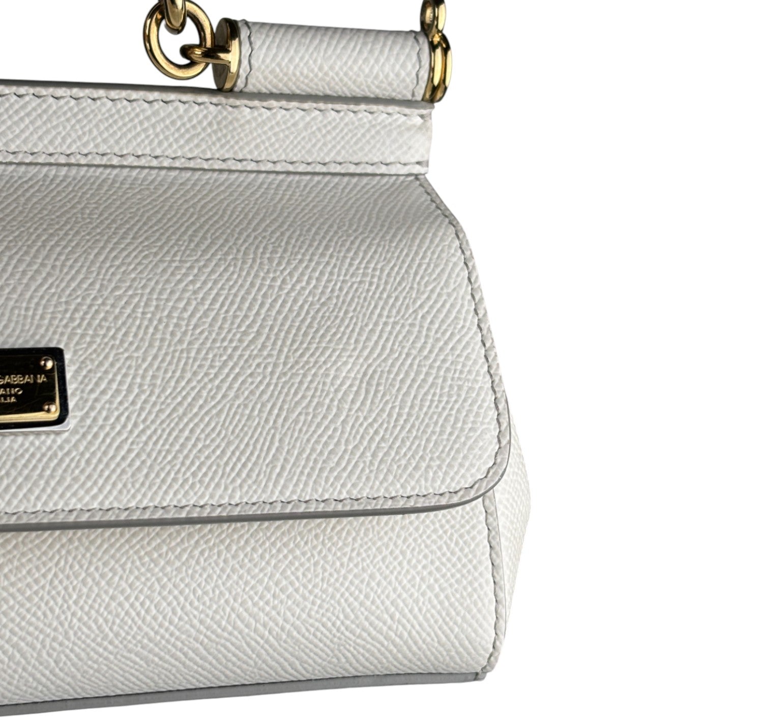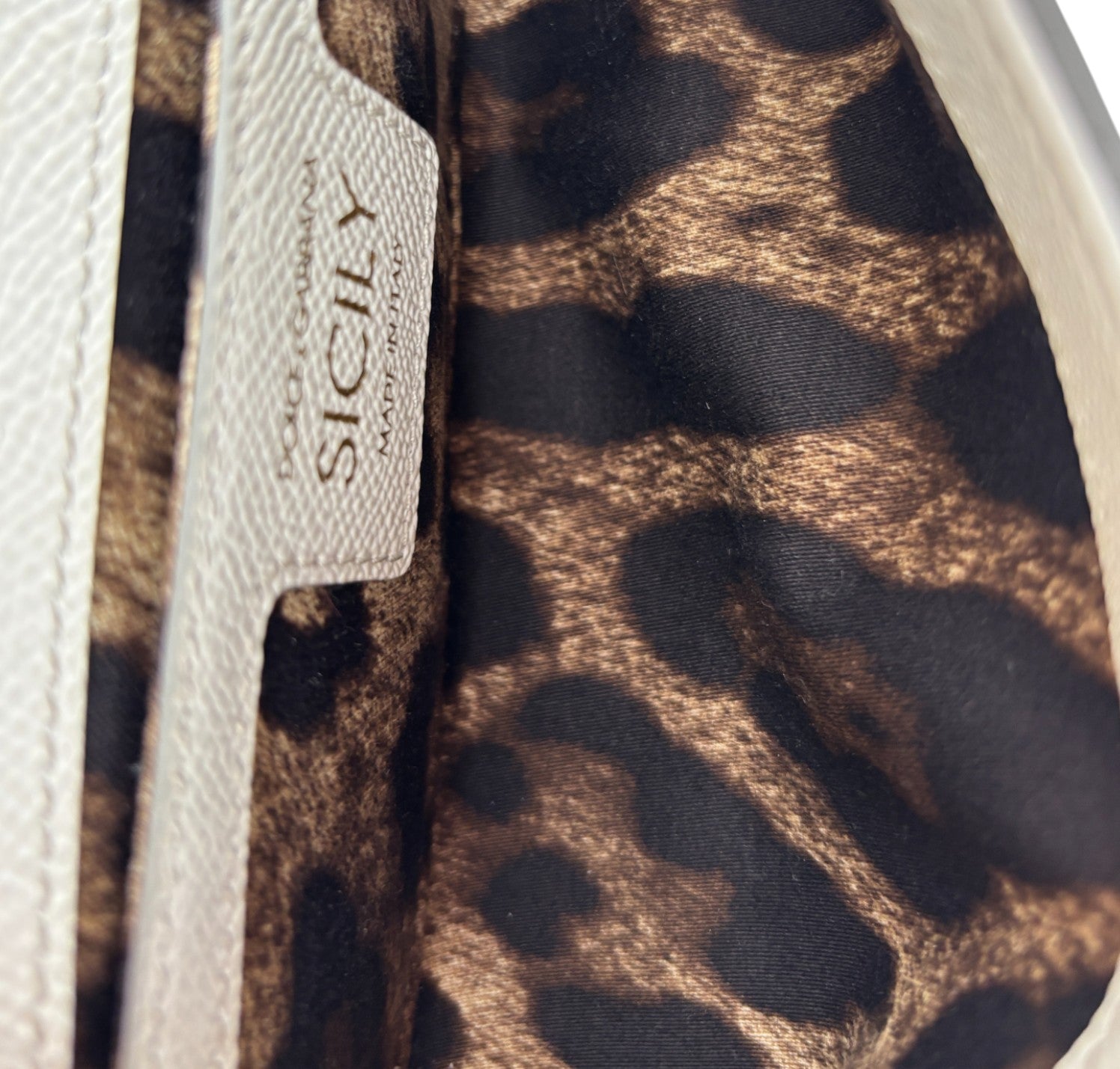 Borsa a mano Dolce&Gabbana, modello Sicily, misura Small realizzata in pelle Bianca. Metalleria color oro. Munita di tracolla regolabile ed amovibile. Targhetta logata bigalvanica su pattina frontale. Chiusura principale magnetica. Interno foderato in tessuto con stampa animalier, tasca piatta. Lievi segni d'uso, micro graffi. Lievi segni del tempo generali, piccoli segni di pressione pattina.