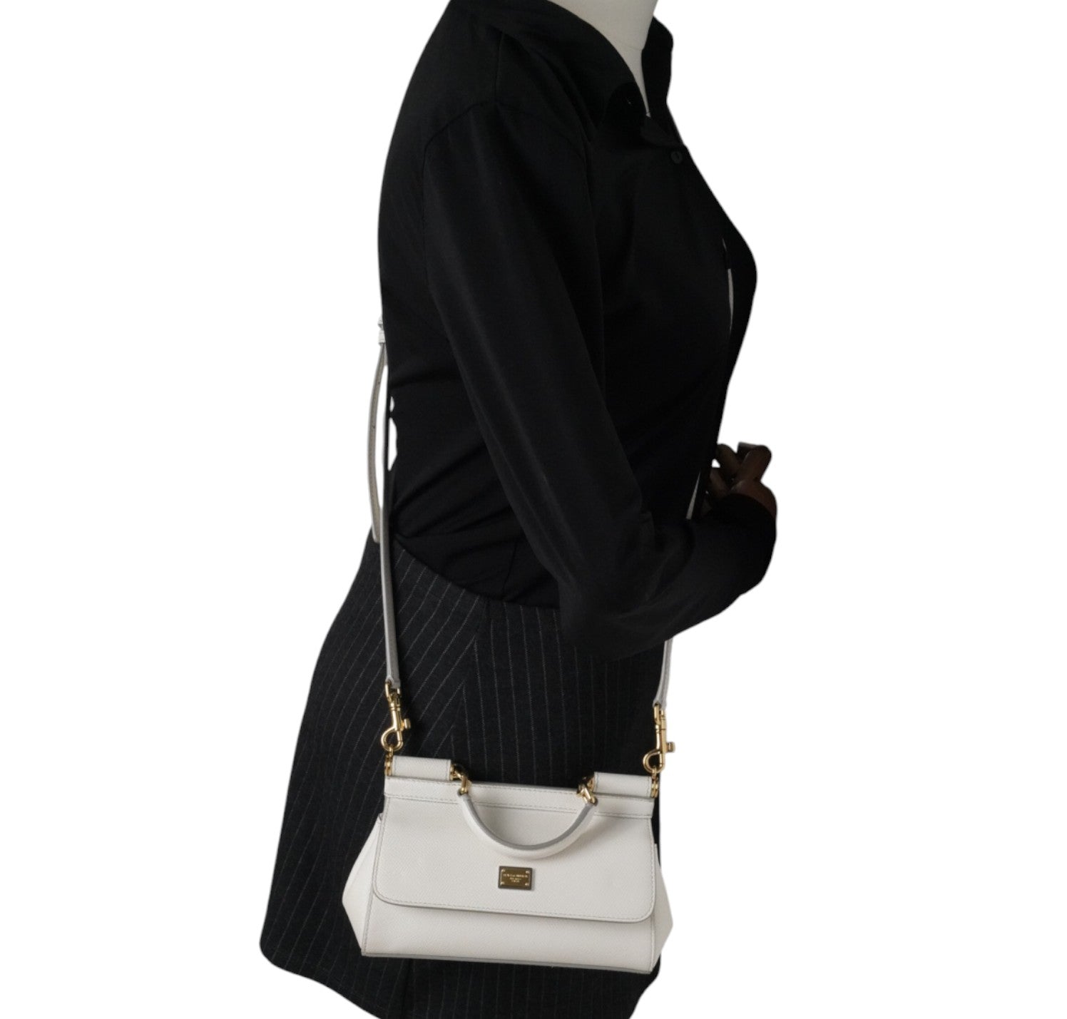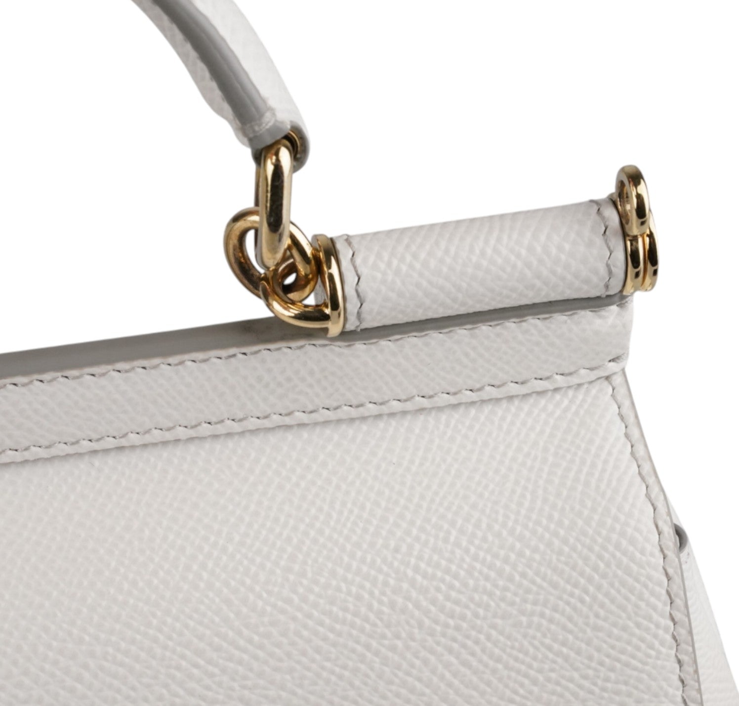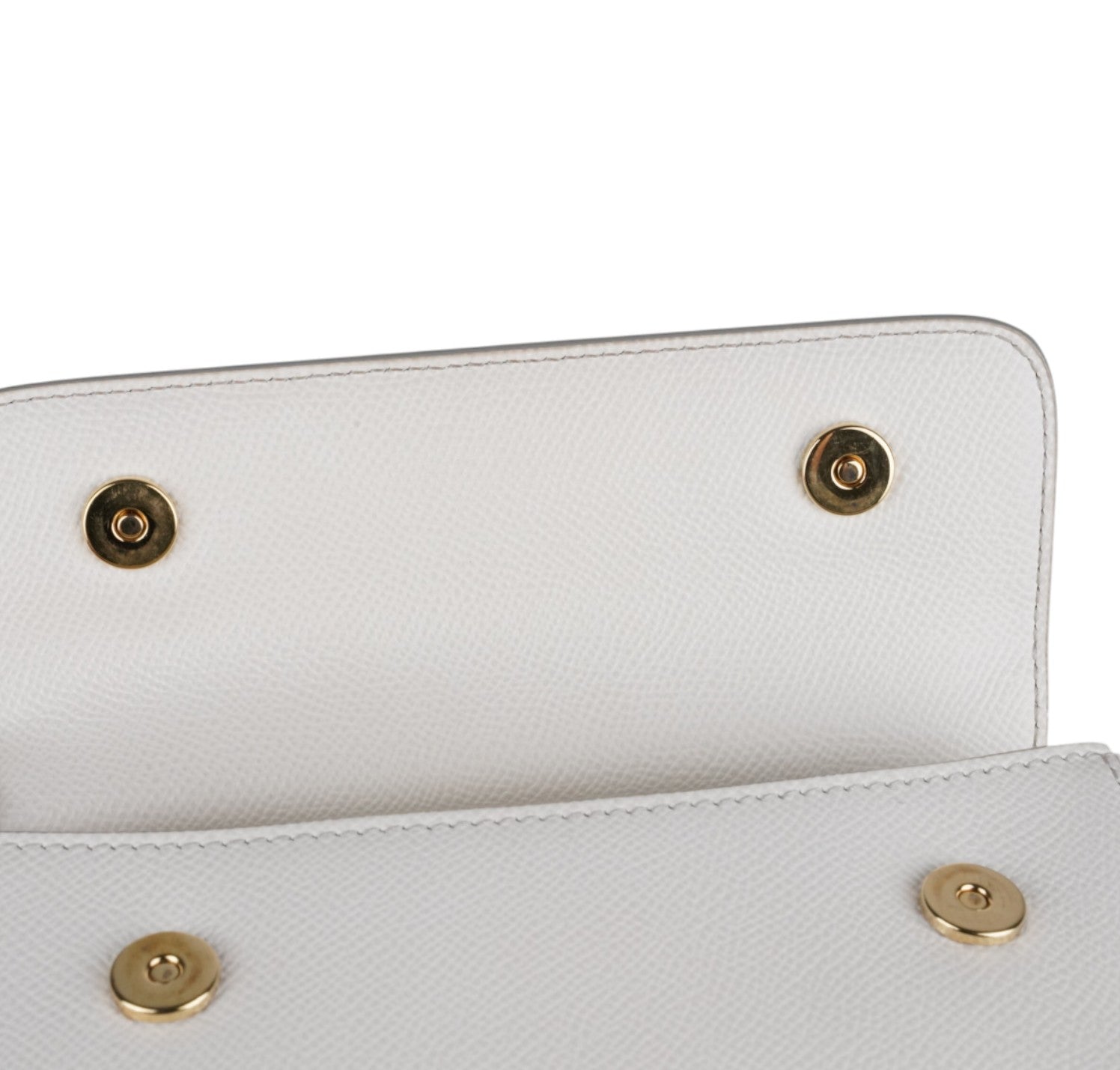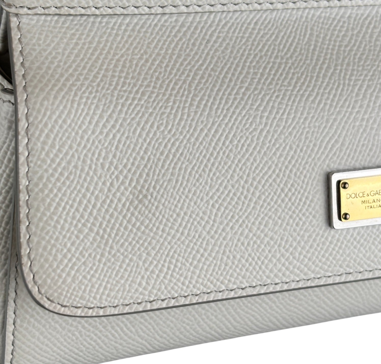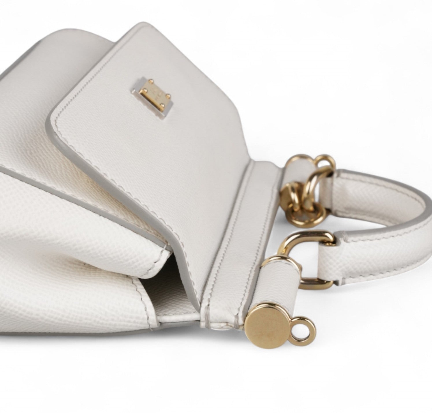 Borsa a mano Dolce&Gabbana, modello Sicily, misura Small realizzata in pelle Bianca. Metalleria color oro. Munita di tracolla regolabile ed amovibile. Targhetta logata bigalvanica su pattina frontale. Chiusura principale magnetica. Interno foderato in tessuto con stampa animalier, tasca piatta. Lievi segni d'uso, micro graffi. Lievi segni del tempo generali, piccoli segni di pressione pattina.