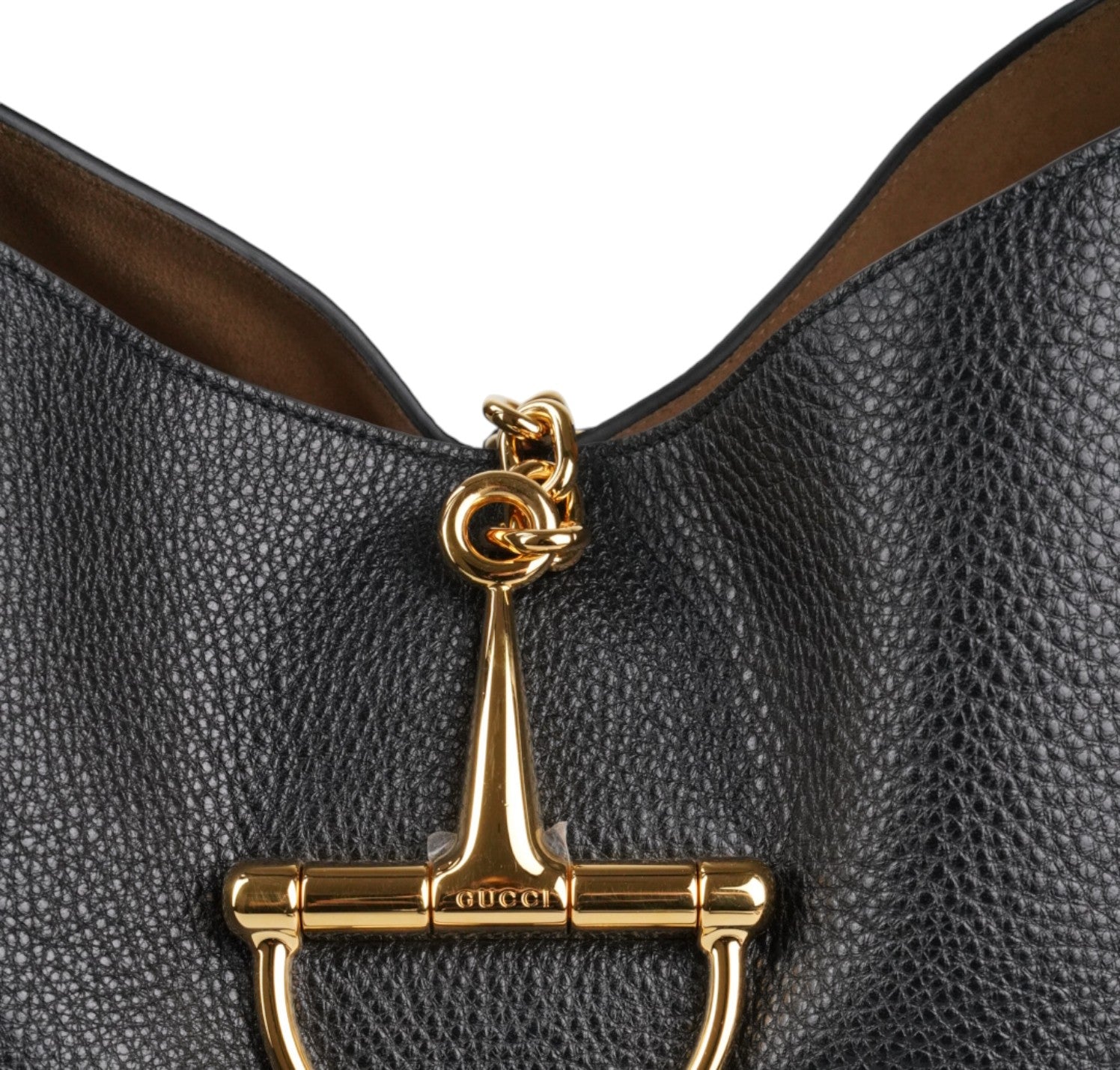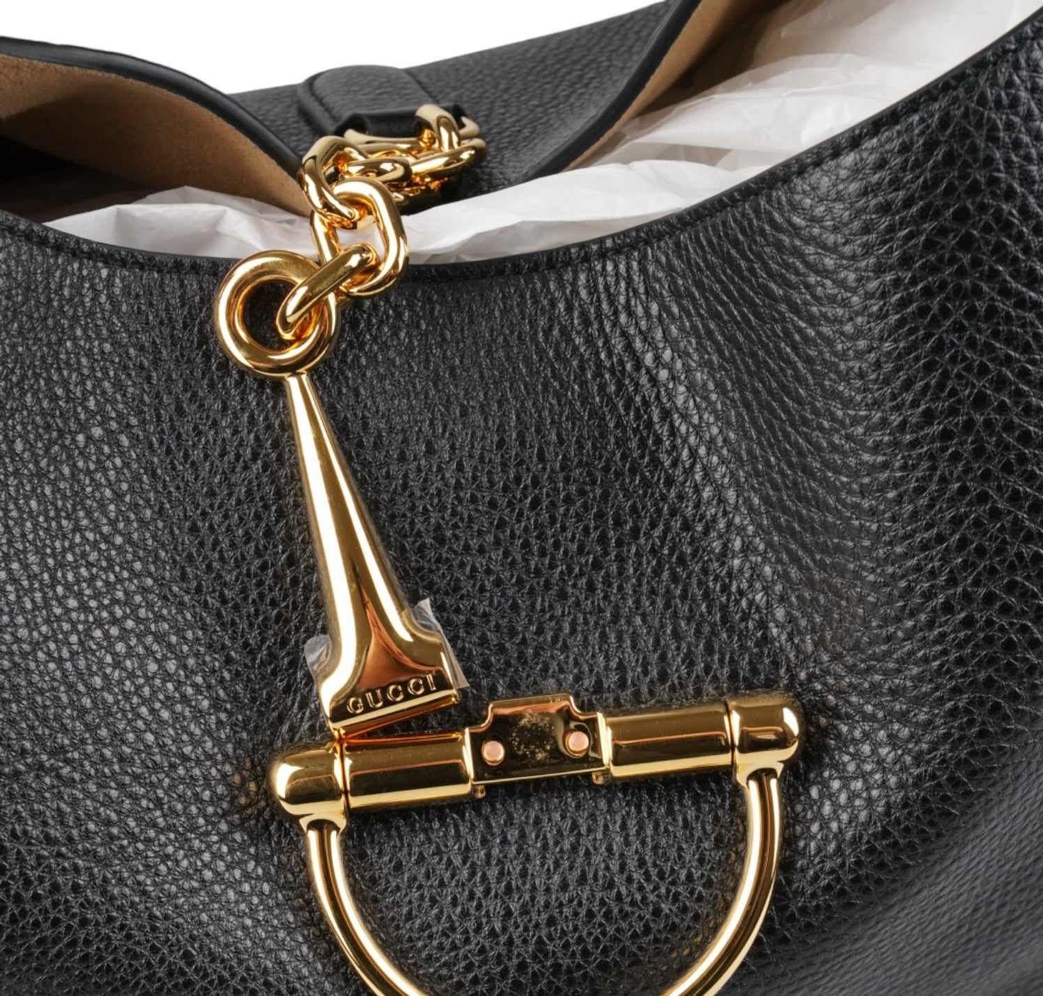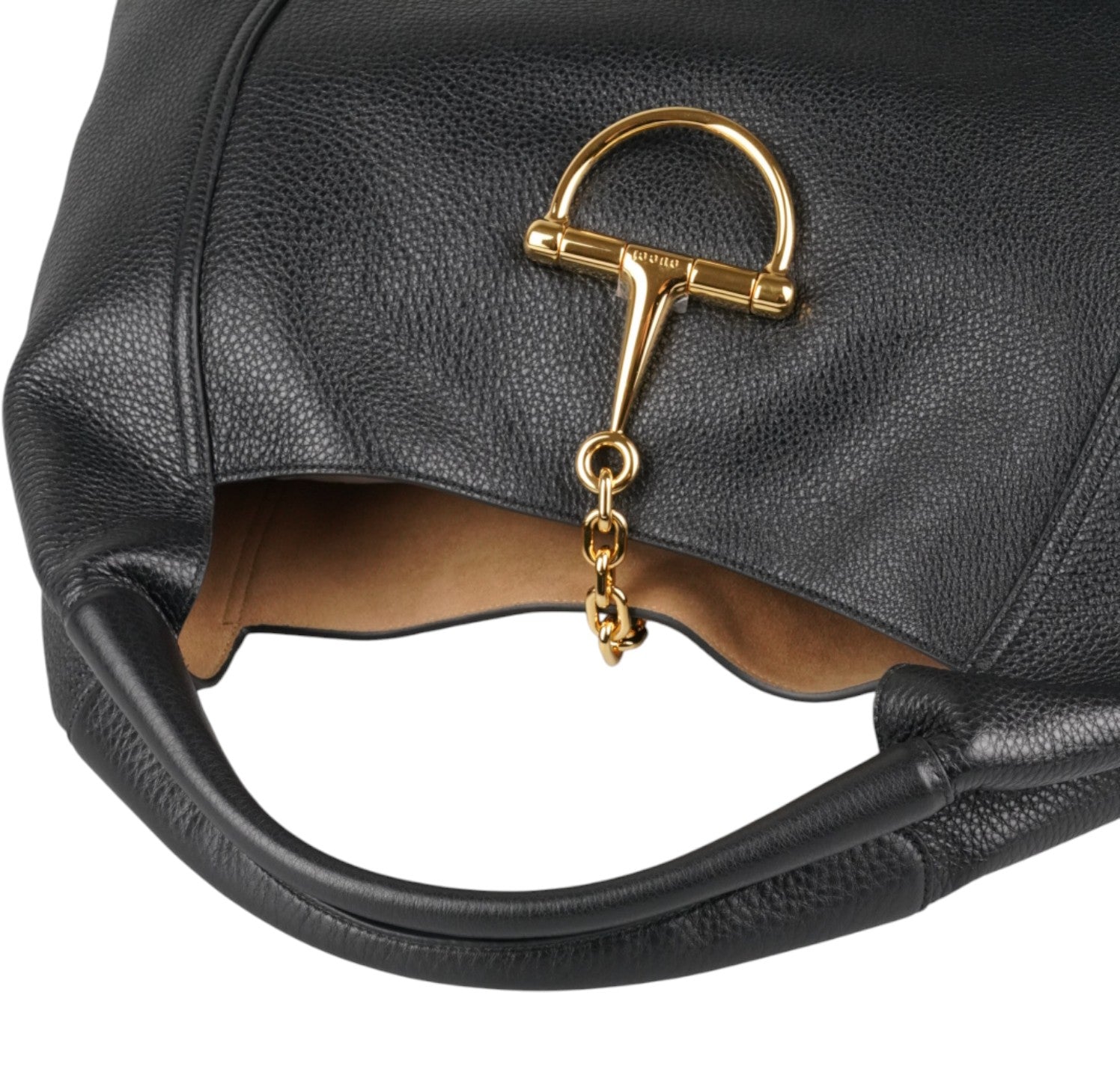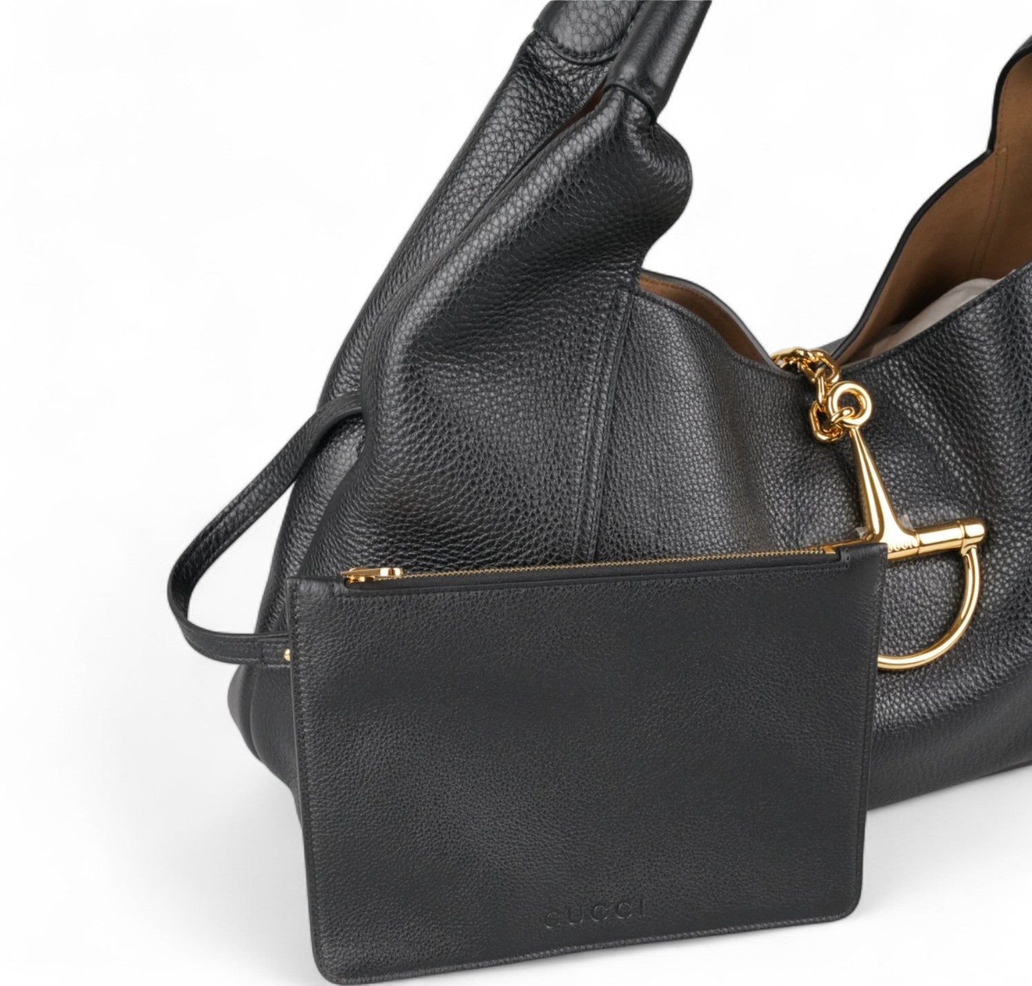 Borsa a spalla Gucci, modello Softbit realizzata in Pelle Granata (grainy) Nera con chiusura a mezza fibbia Horsebit oversize. Finiture in metallo dorato. Interno in microfibra marrone. Dotata di pochette interna removibile. Manici superiori per il trasporto a spalla o mano. Drop manici circa 20 cm. Modello nuova collezione, di produzione recente. Non presenta segni d'uso ma potrebbe comunque presentare micro segni di stoccaggio.