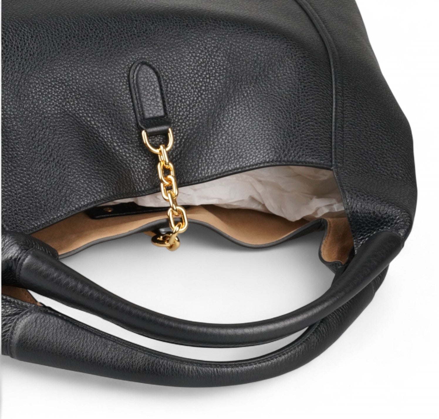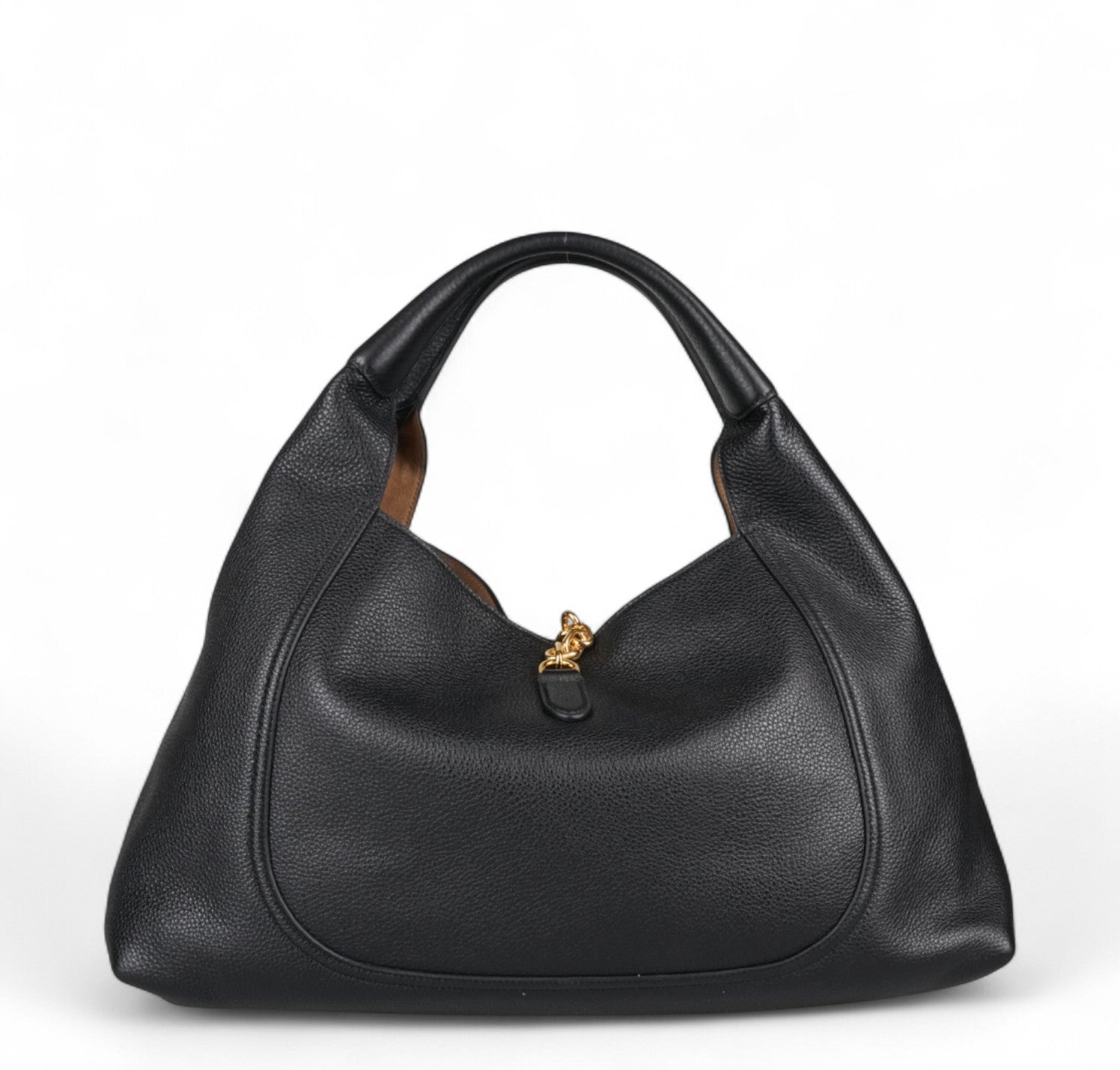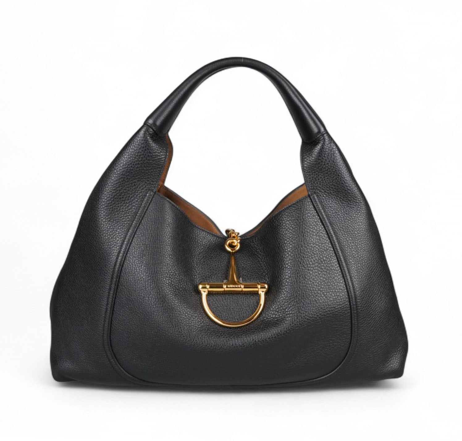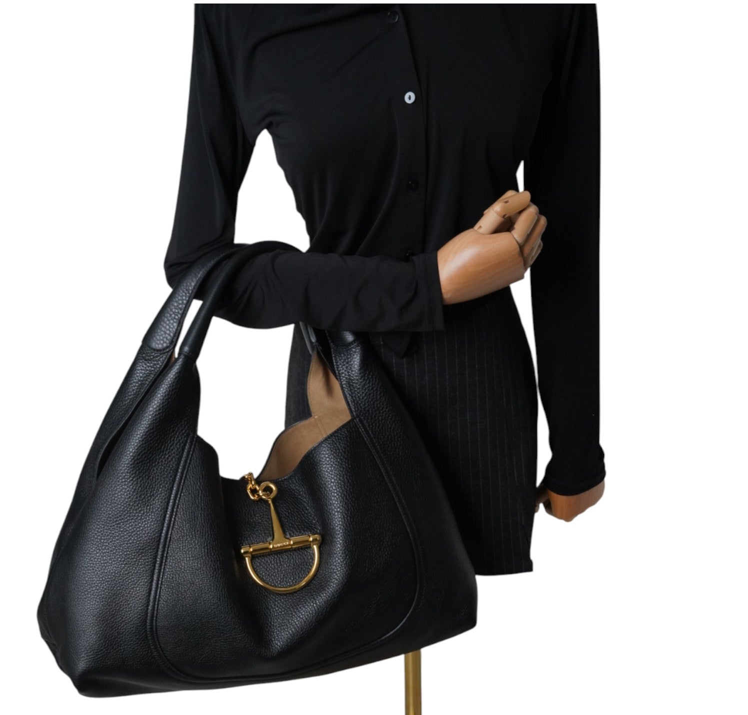 Borsa a spalla Gucci, modello Softbit realizzata in Pelle Granata (grainy) Nera con chiusura a mezza fibbia Horsebit oversize. Finiture in metallo dorato. Interno in microfibra marrone. Dotata di pochette interna removibile. Manici superiori per il trasporto a spalla o mano. Drop manici circa 20 cm. Modello nuova collezione, di produzione recente. Non presenta segni d'uso ma potrebbe comunque presentare micro segni di stoccaggio.
