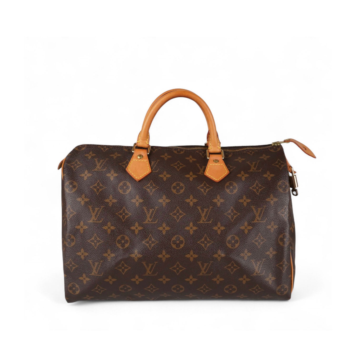Borsa Louis Vuitton, modello Speedy 35, realizzata in tela Monogram. Finiture in Vacchetta Naturale Mielate. Metalleria Color Oro. Chiusura superiore con zip. Munito lucchetto con chiave. Munita di manici superiori per il trasporto a mano o a braccio. Interno in tessuto, con tasca a bustina. Leggeri segni d'uso alla metalleria e sulla vacchetta. Lievi segni generali da utilizzo.