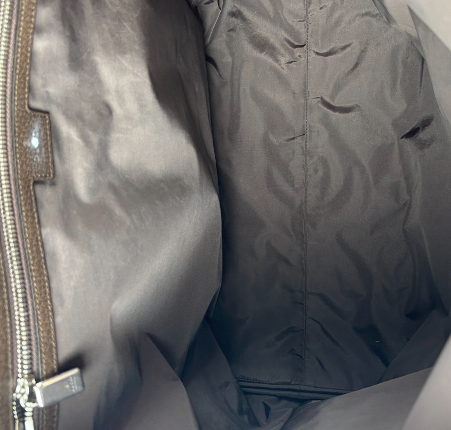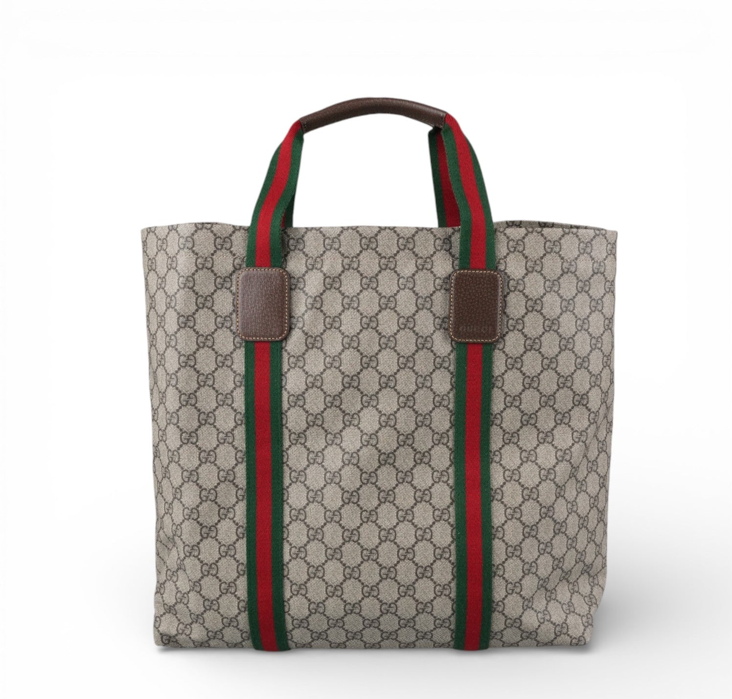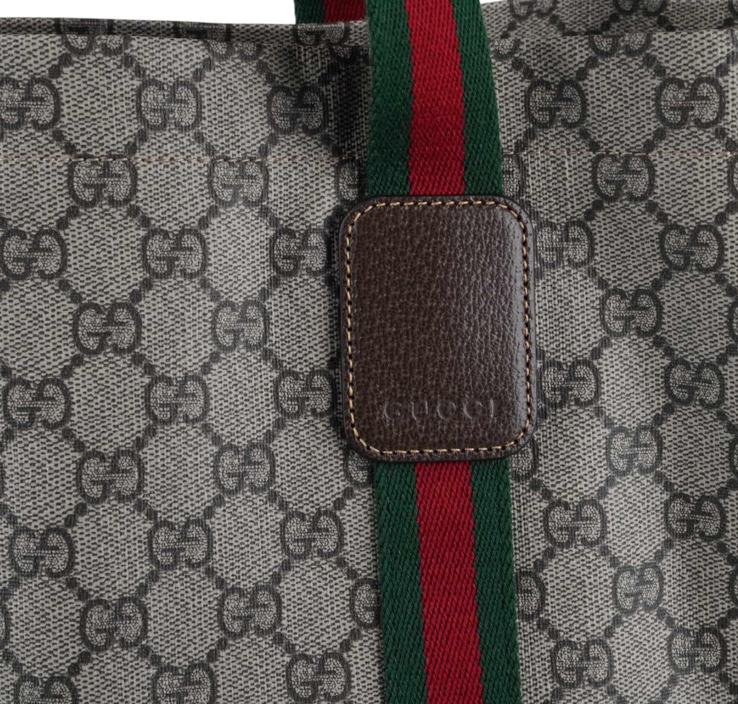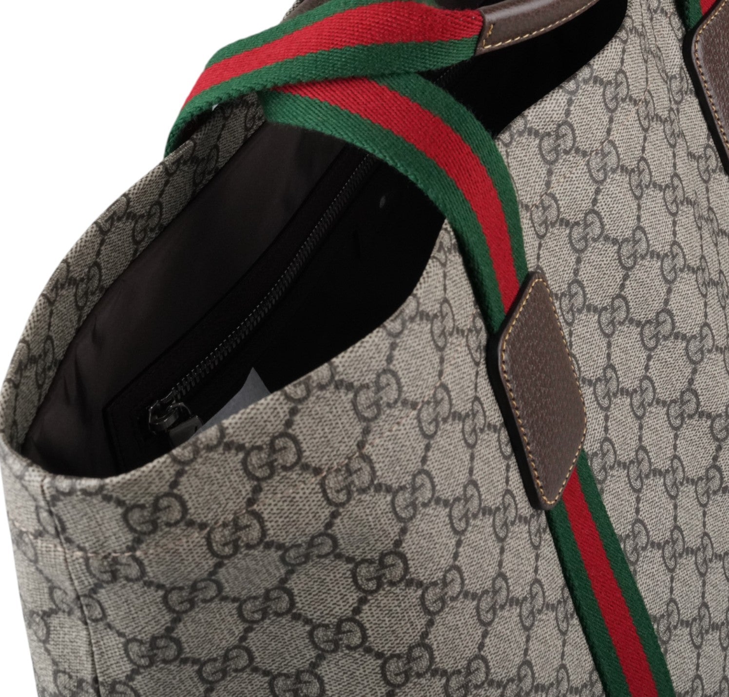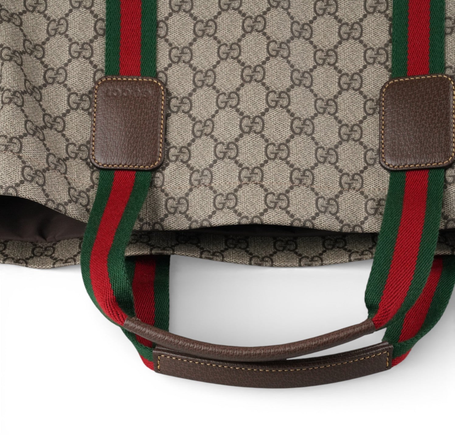 Tote Gucci, modello GG Tender, realizzata in tela GG Supreme beige/ebano con dettagli e profili in pelle marrone. Modello shopper capiente e leggero caratterizzato da fasce Web verde e rosso. Manici in nastro con impugnatura in pelle. Interno foderato in tessuto, tasca interna con zip per organizzare oggetti essenziali. Perfetta per l’uso quotidiano, lavoro o viaggio.