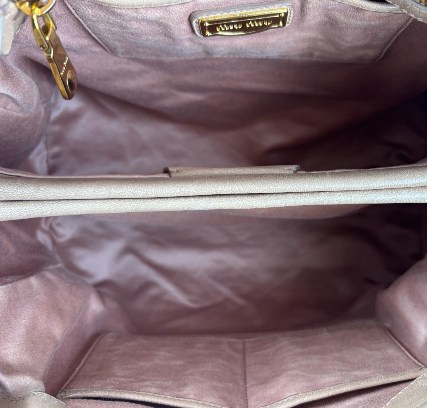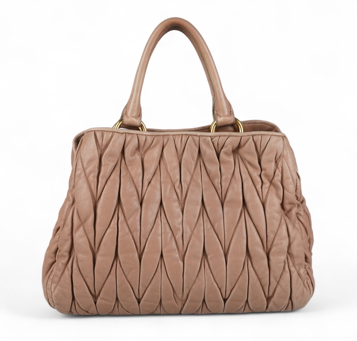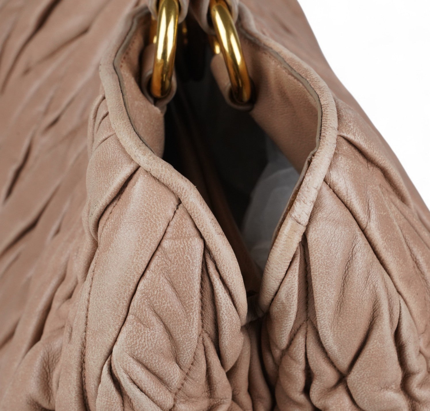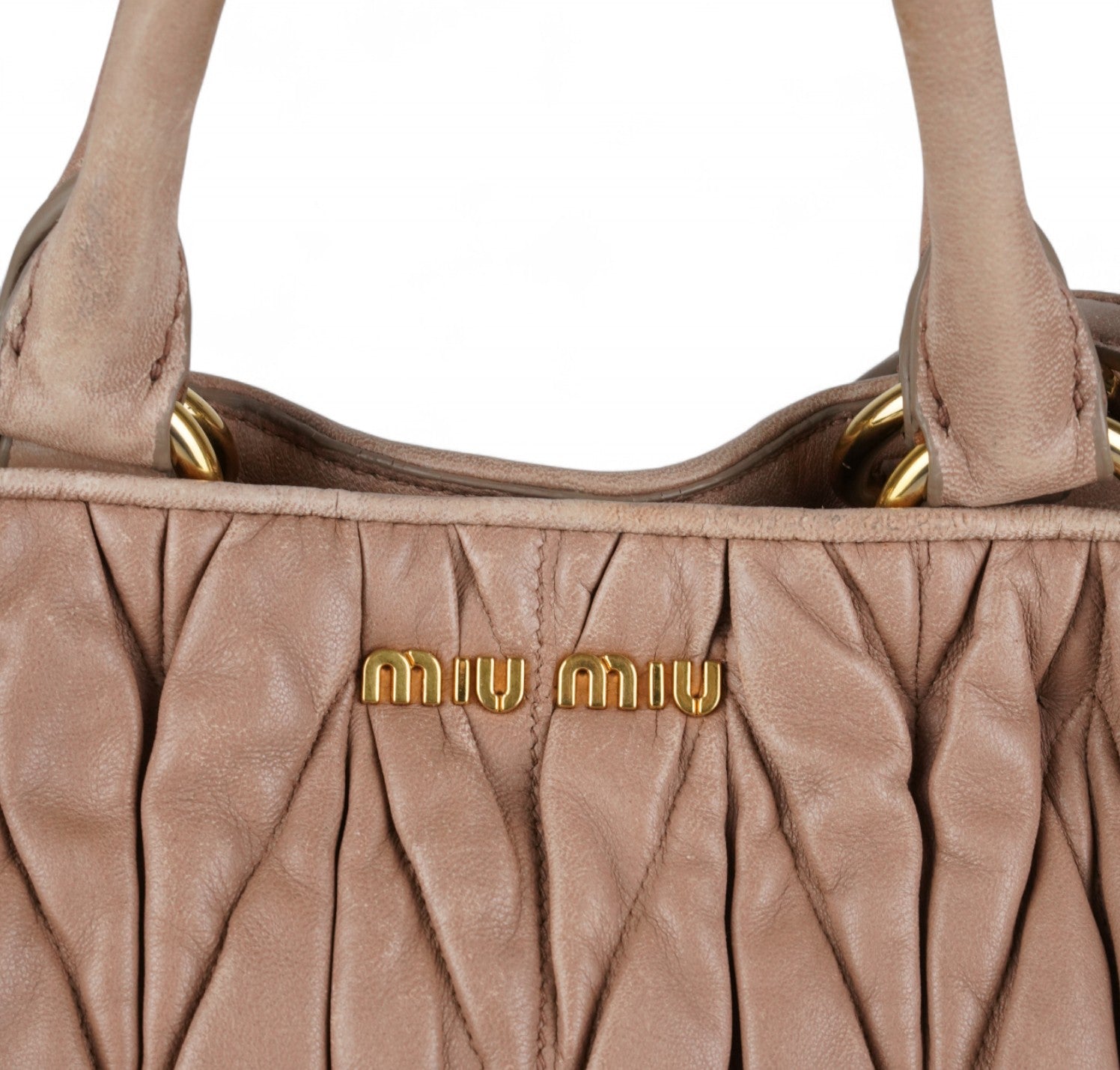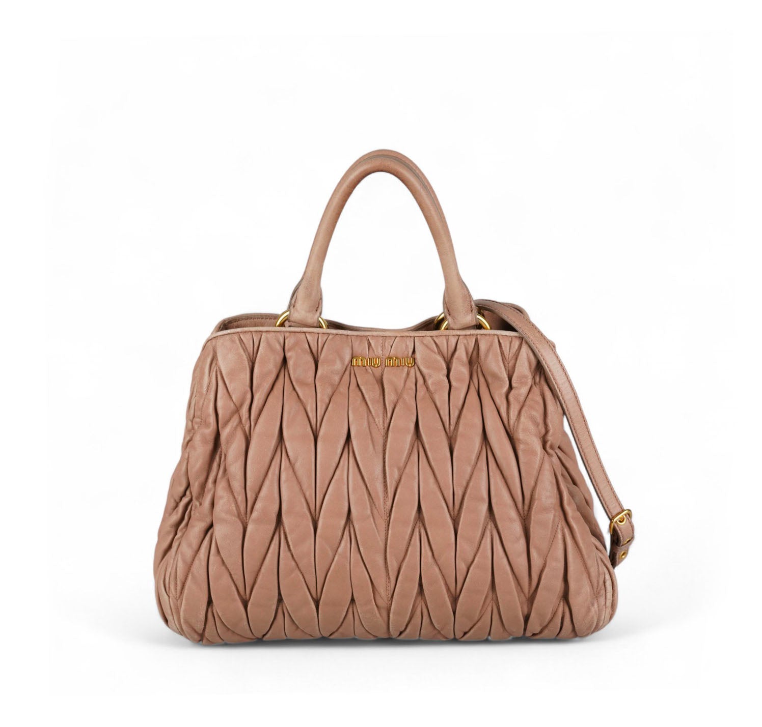 Borsa Miu Miu, modello Vintage 2Way , realizzata in morbida Pelle Matelassé color Cipria con iconica lavorazione trapuntata a motivo ondulato. Dotata di doppi manici arrotondati e tracolla regolabile e rimovibile in pelle per portabilità a mano o a spalla. Metalleria Oro. Interno foderato tono su tono, ampio e funzionale, ideale per un utilizzo quotidiano grazie alla capienza e alla morbidezza della struttura. Condizioni ottime con minimi segni d’uso generali.