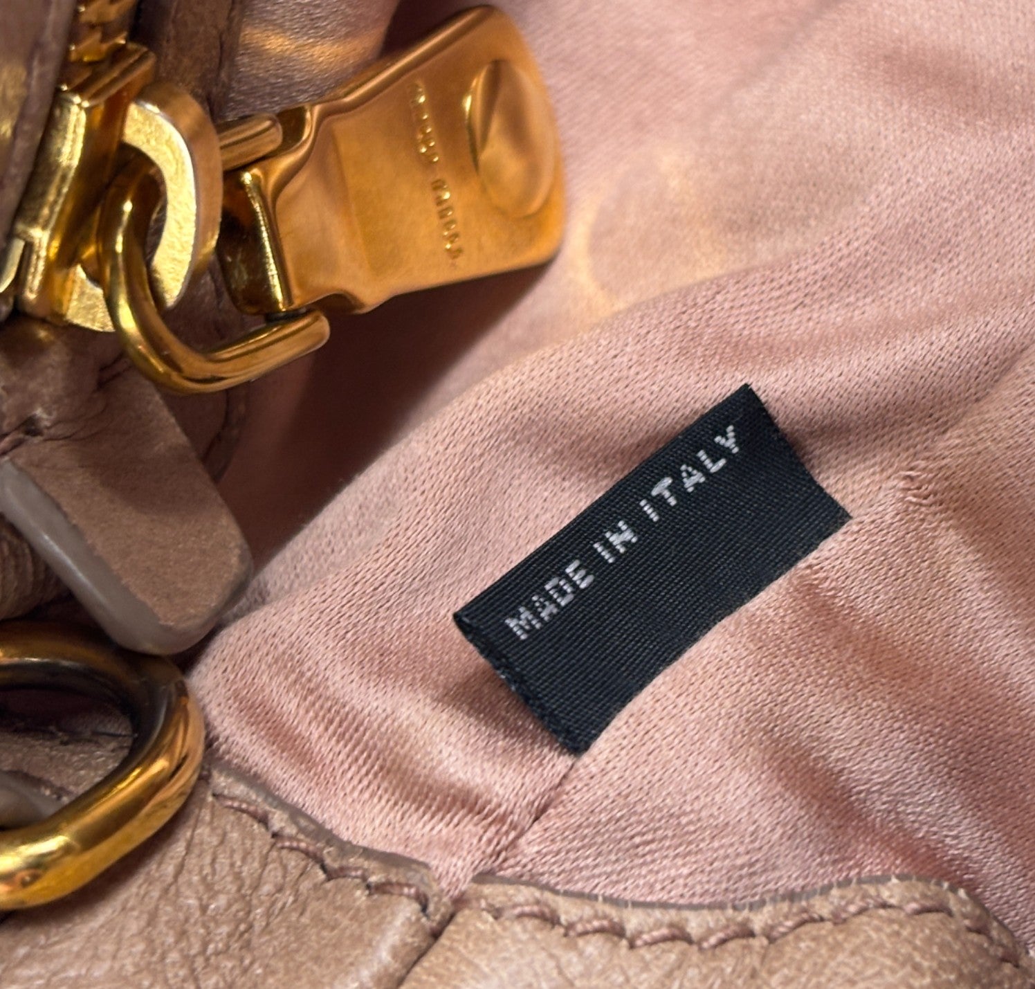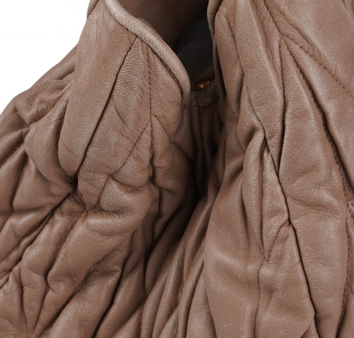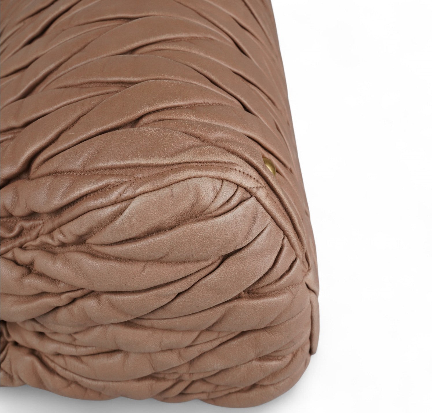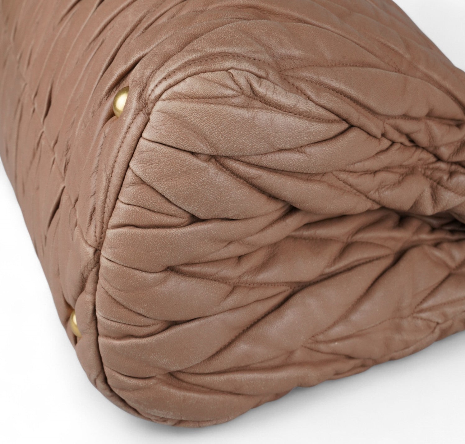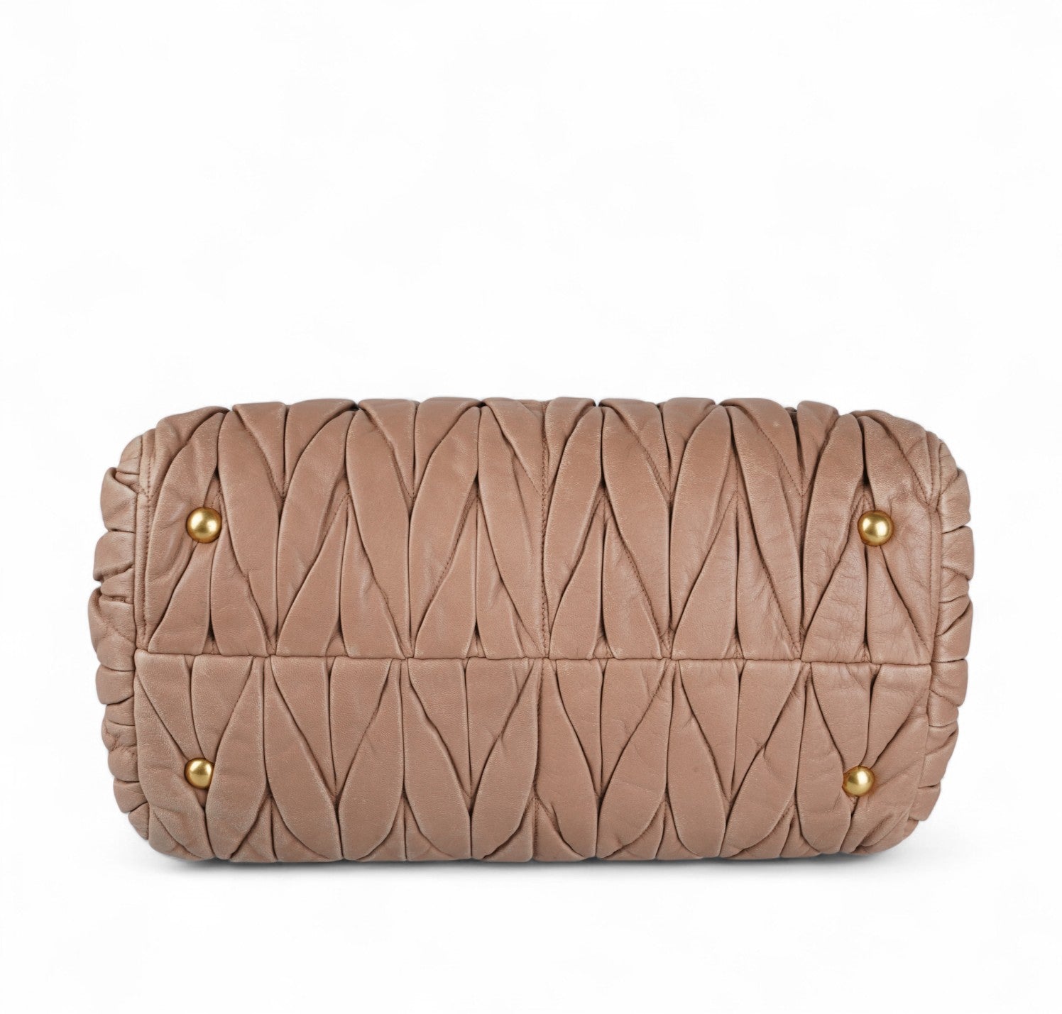 Borsa Miu Miu, modello Vintage 2Way , realizzata in morbida Pelle Matelassé color Cipria con iconica lavorazione trapuntata a motivo ondulato. Dotata di doppi manici arrotondati e tracolla regolabile e rimovibile in pelle per portabilità a mano o a spalla. Metalleria Oro. Interno foderato tono su tono, ampio e funzionale, ideale per un utilizzo quotidiano grazie alla capienza e alla morbidezza della struttura. Condizioni ottime con minimi segni d’uso generali.