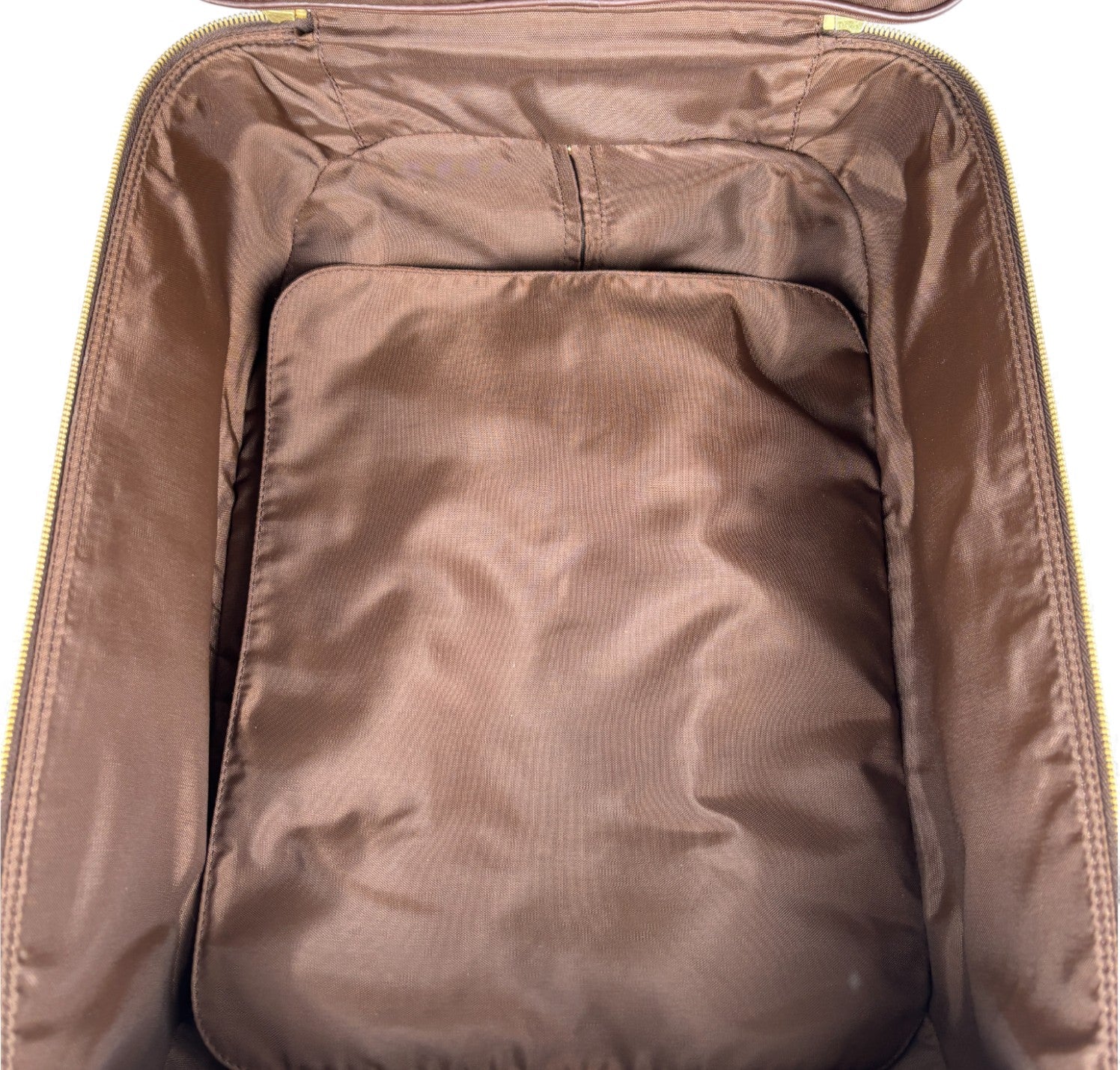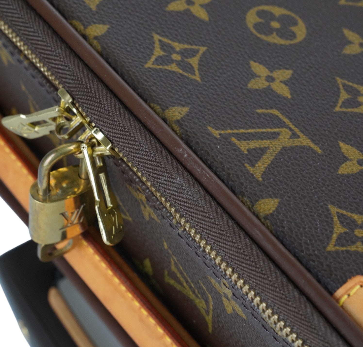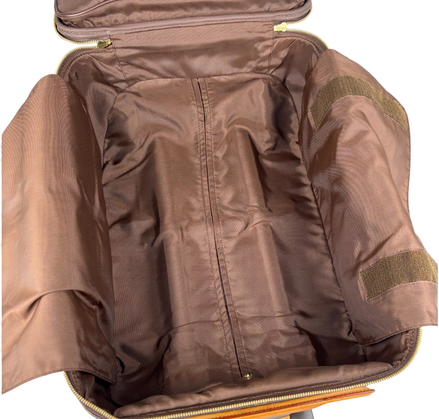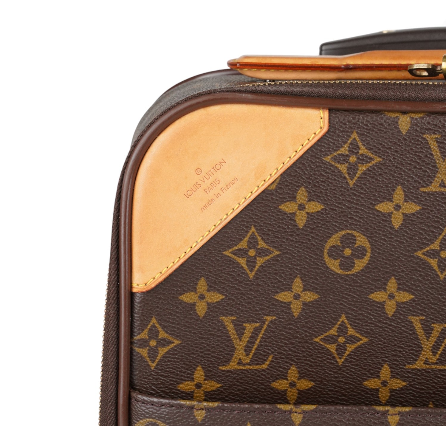 Louis Vuitton Trolley, Pégase model, size 45, made of Monogram Canvas. Natural cowhide finishing. Gold hardware. Fabric lined interior. External double slider zip closure. Large flat front pocket. Equipped with extractable top handle, cowhide top handle, Name Tag. In excellent condition, with slight signs of use on plastic plates.