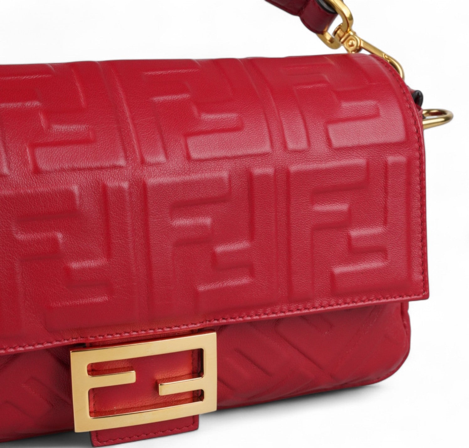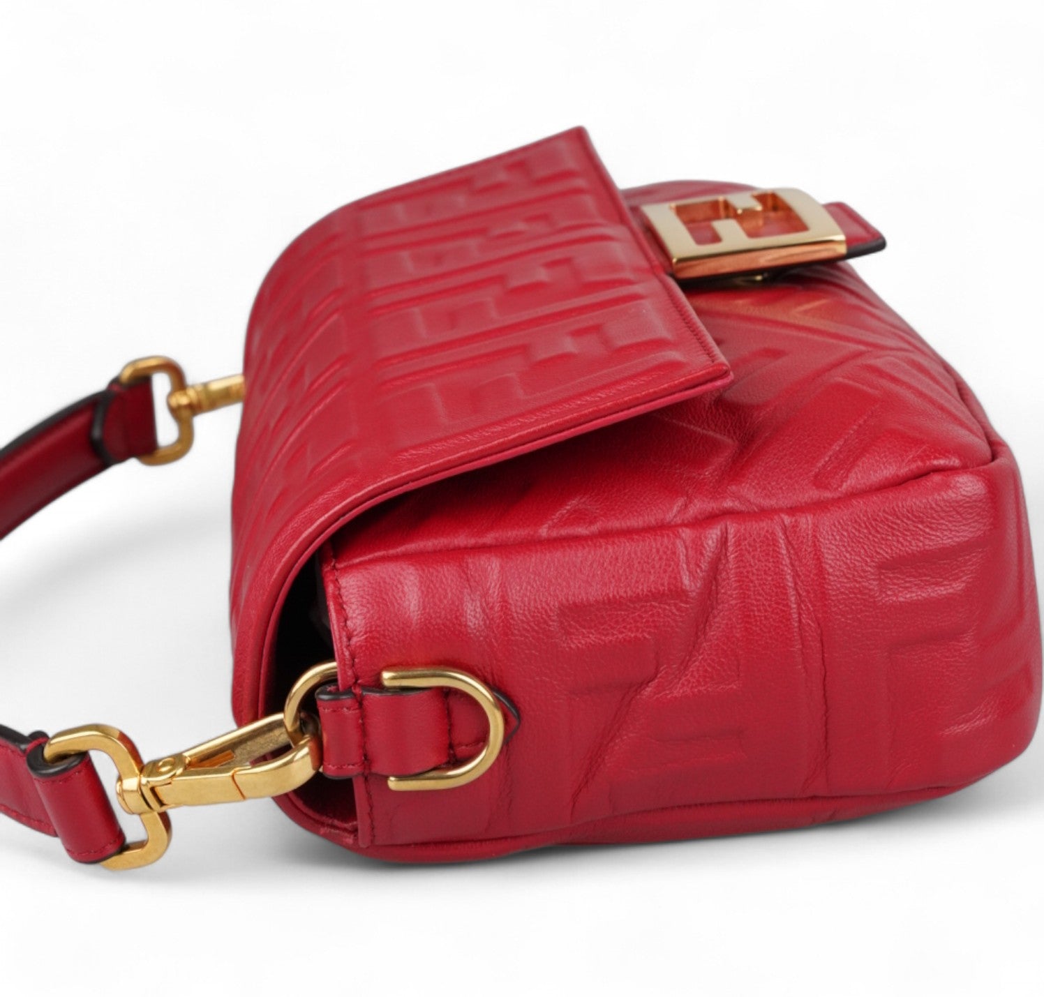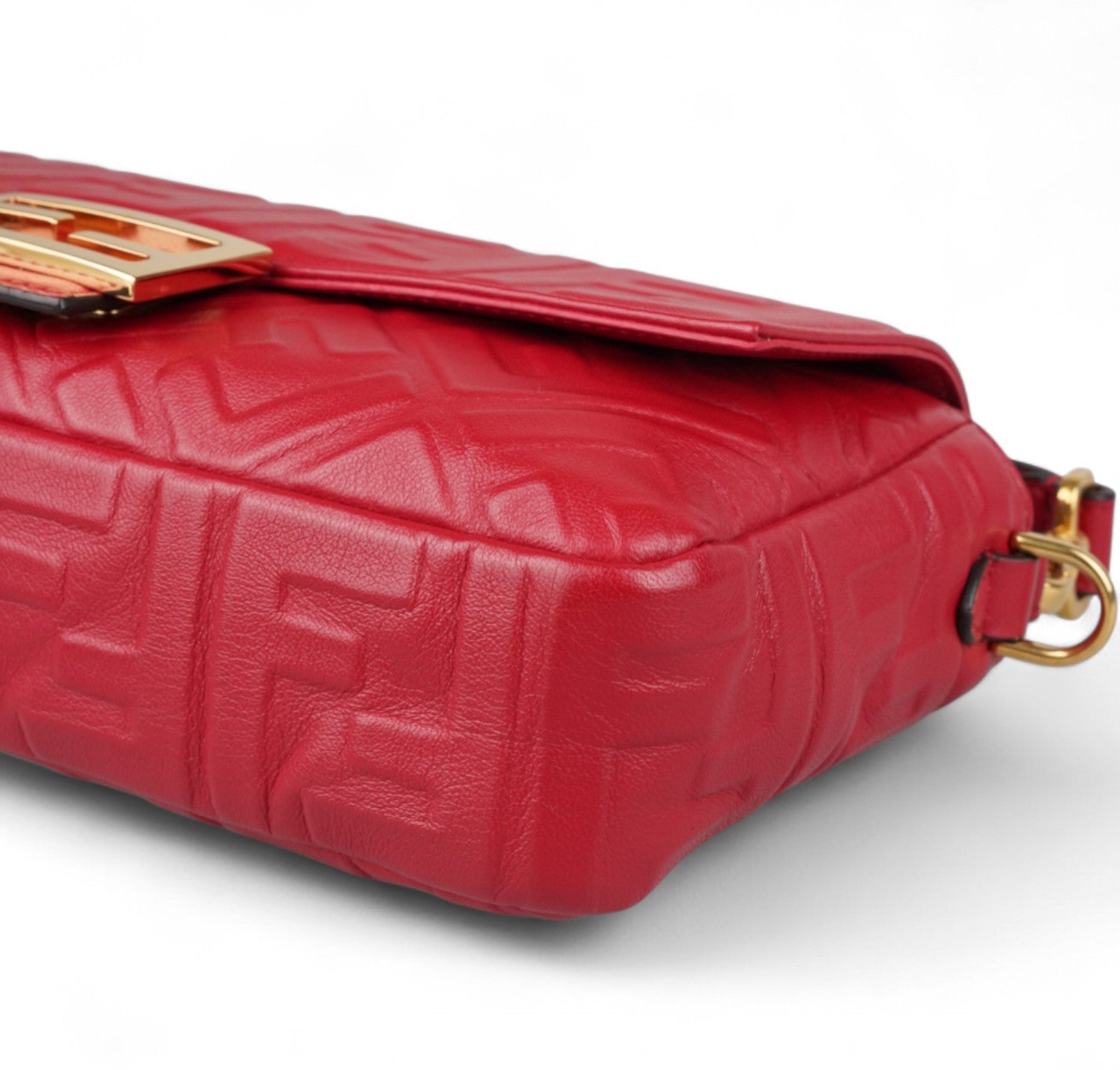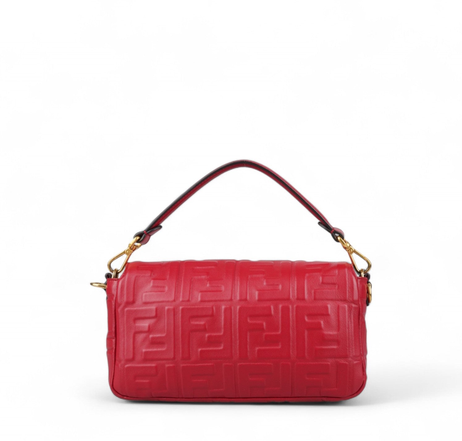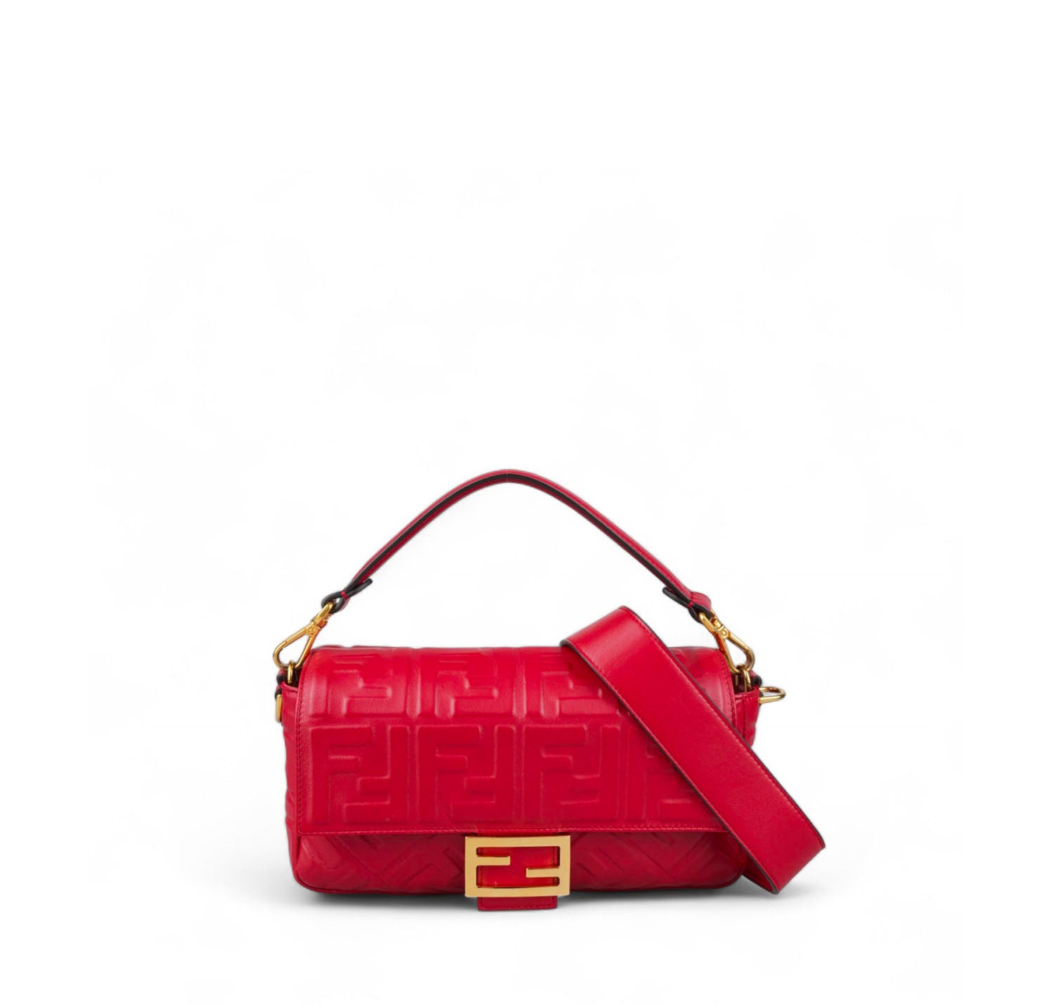 Fendi shoulder bag, Baguette model, medium size, made of soft Red Nappa embellished with embossed FF monogram. Gold-colored metalware. Magnetic closure on the front flap, featuring the iconic logo. Interior lined in black fabric, zip pocket. Two shoulder straps, both removable, to customize its use by hand or on the shoulder. Very light general signs.