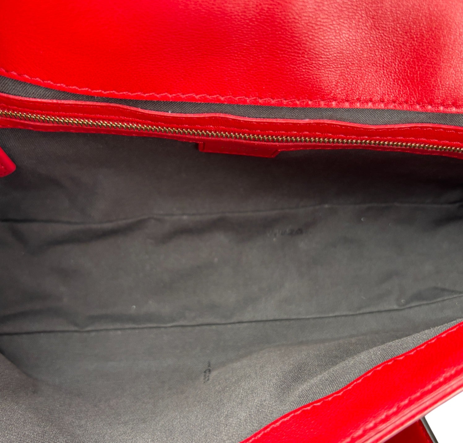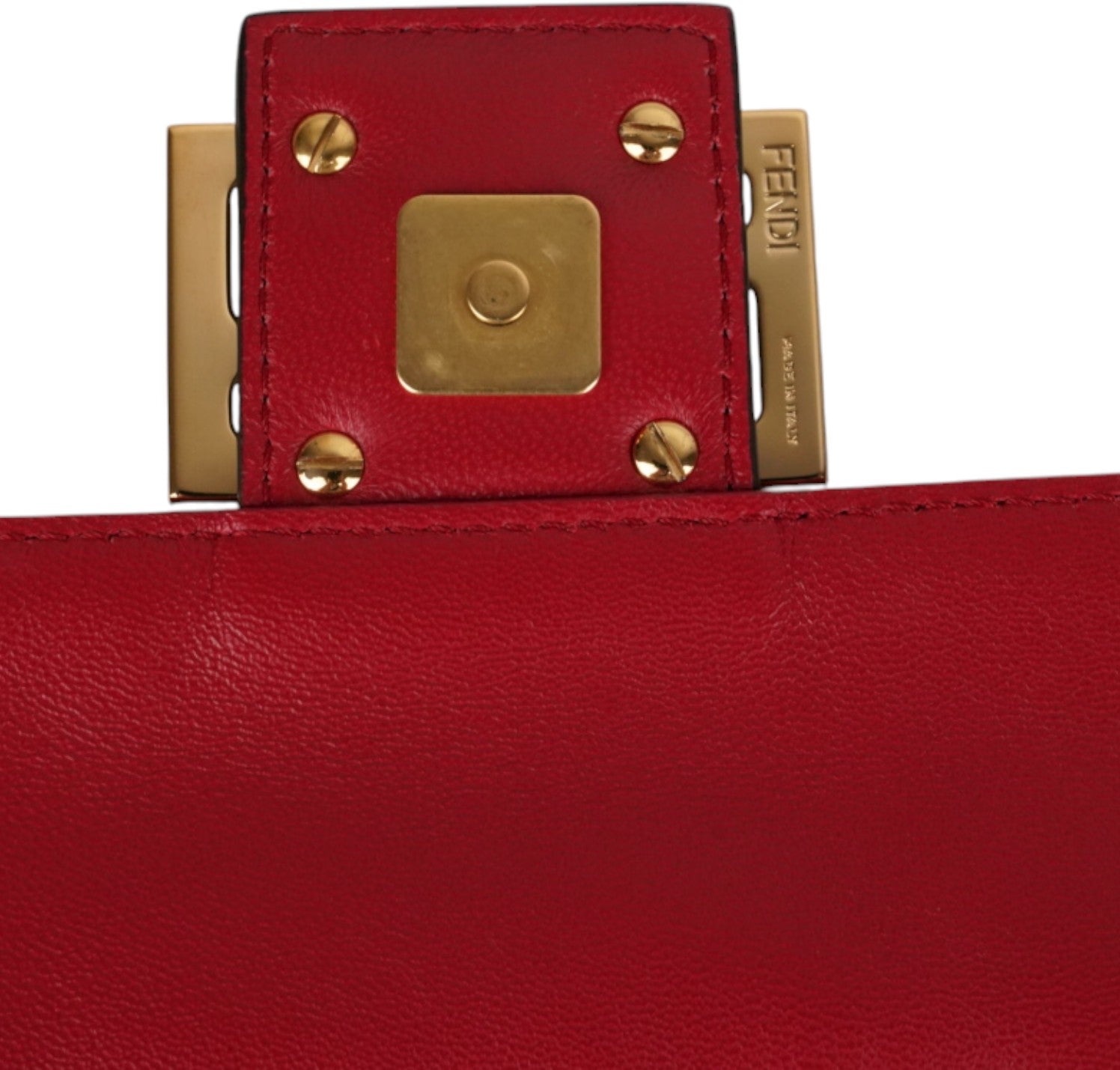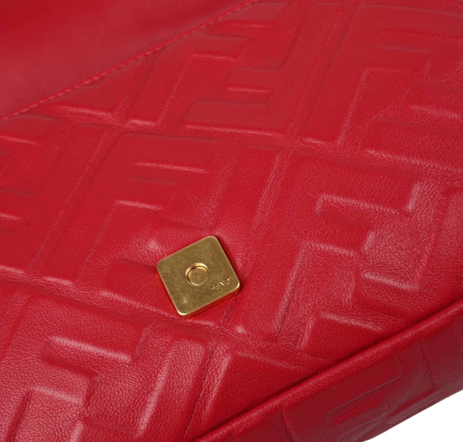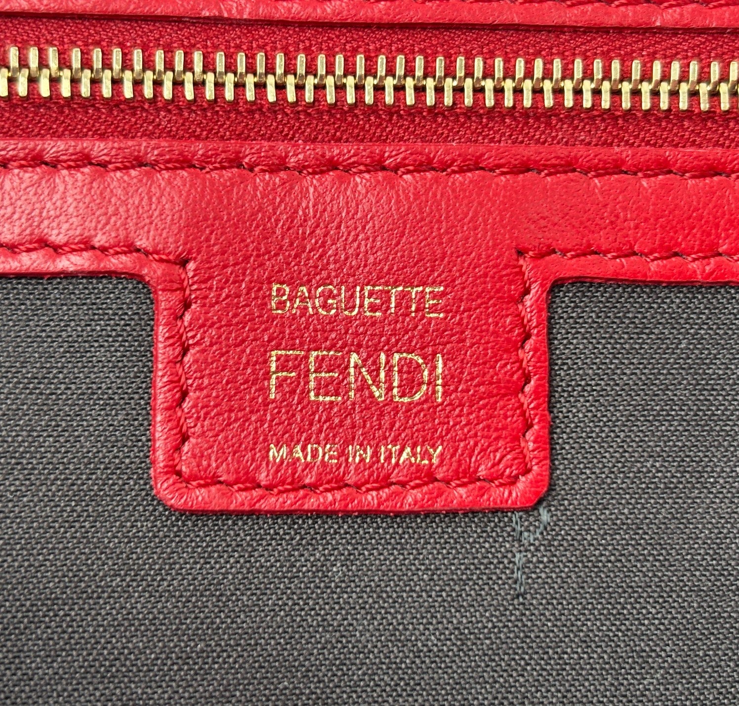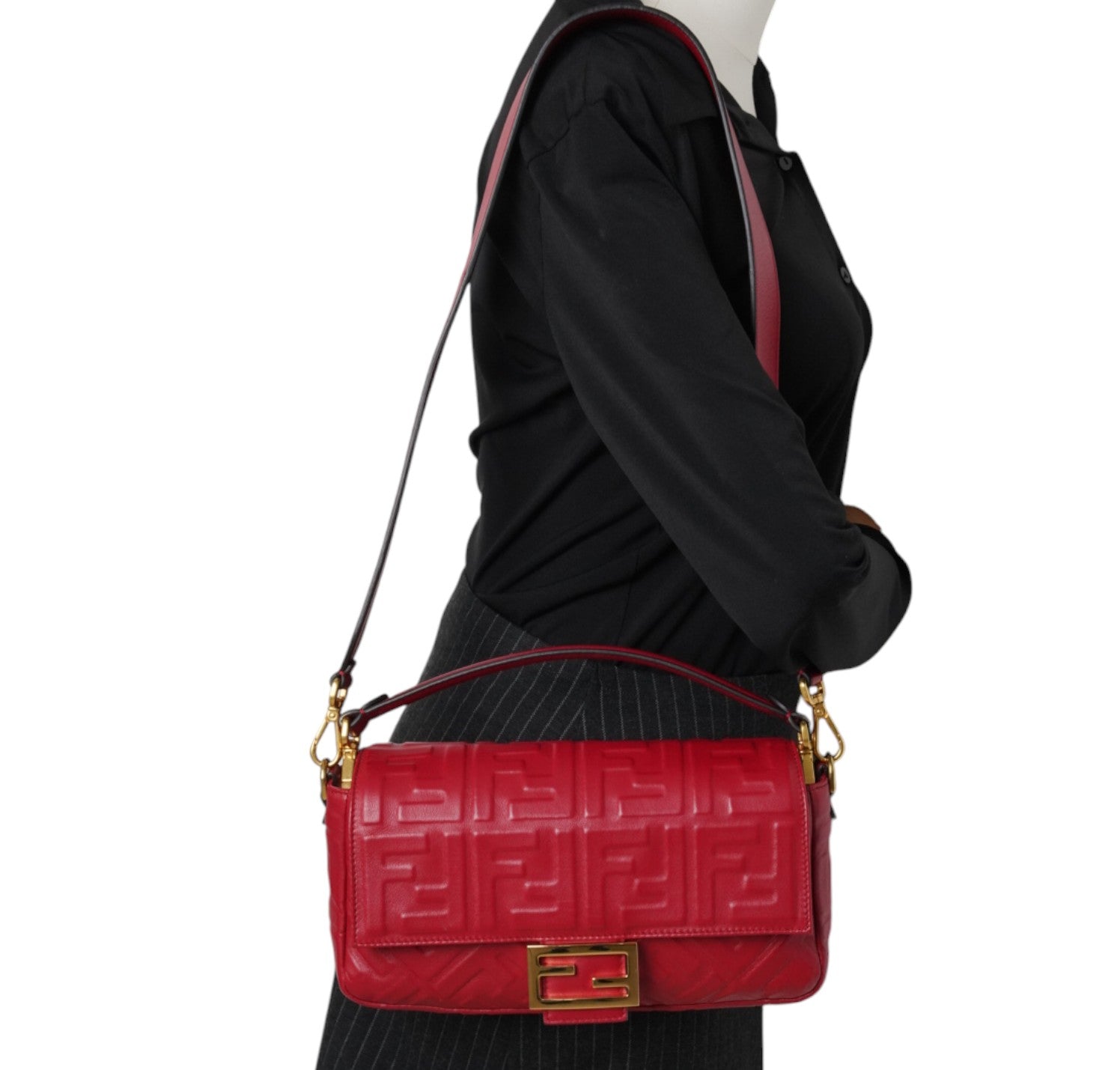 Fendi shoulder bag, Baguette model, medium size, made of soft Red Nappa embellished with embossed FF monogram. Gold-colored metalware. Magnetic closure on the front flap, featuring the iconic logo. Interior lined in black fabric, zip pocket. Two shoulder straps, both removable, to customize its use by hand or on the shoulder. Very light general signs.