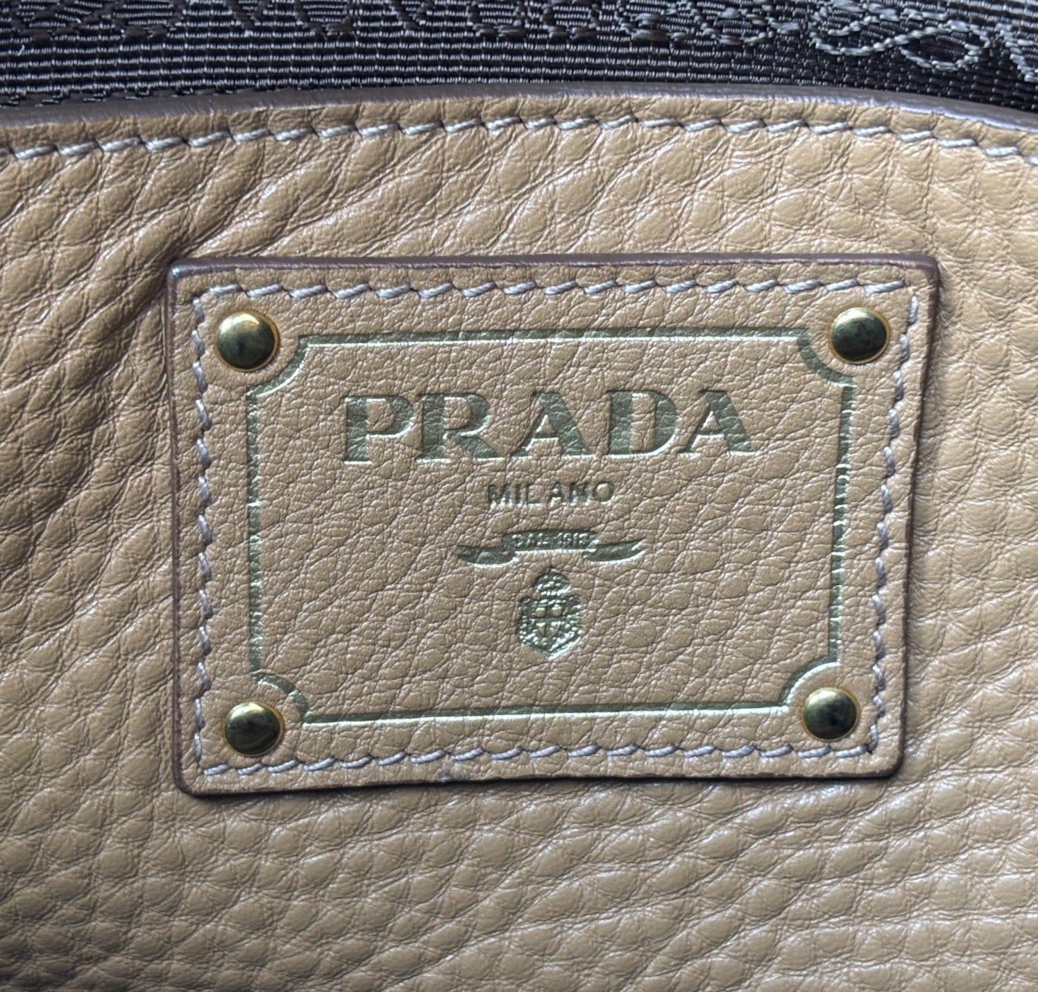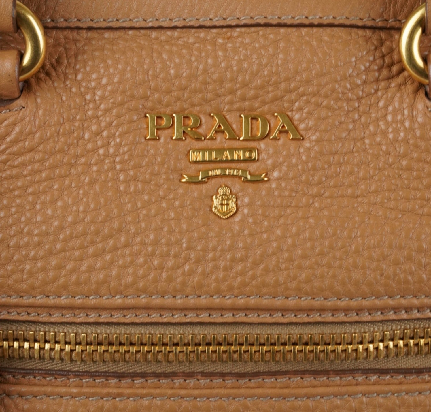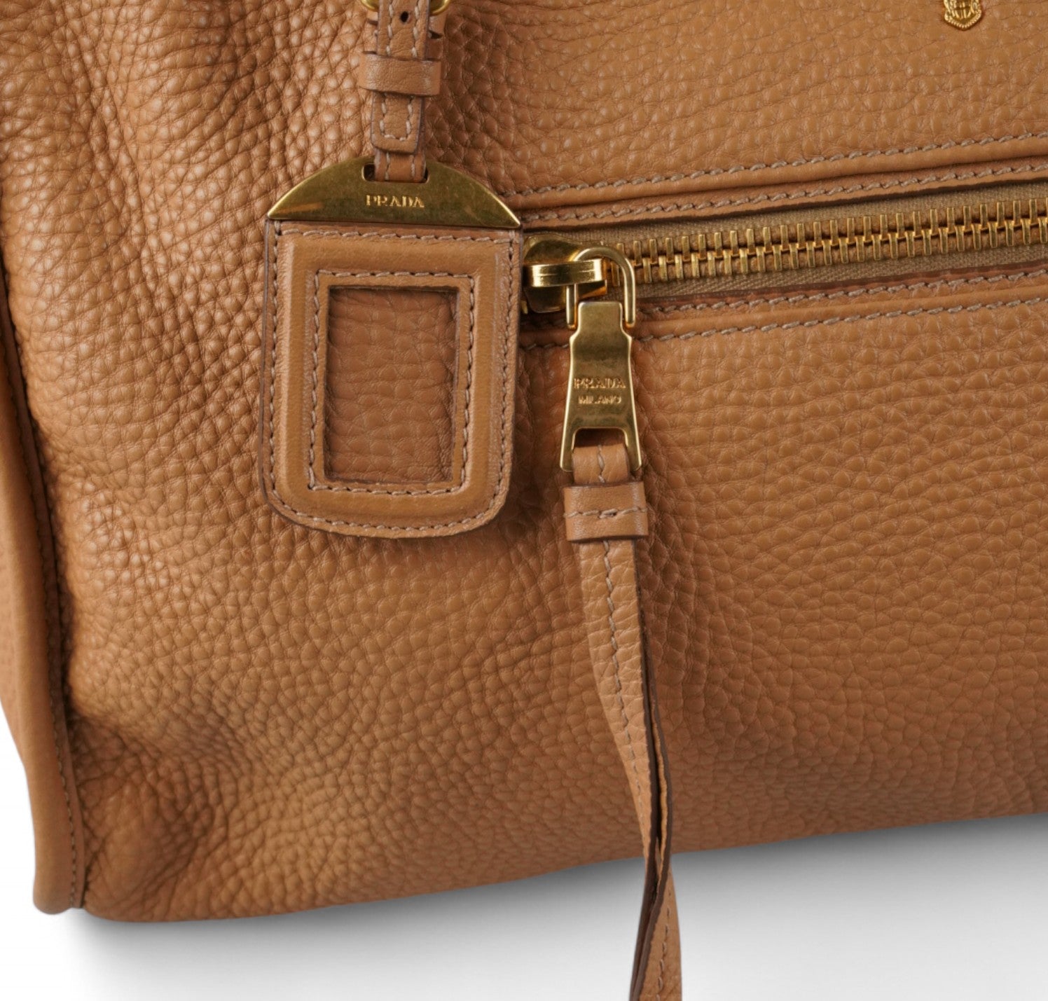 Borsa Prada, modello Bauletto Top Handle, realizzata in morbida pelle martellata Marrone Chiaro (indicata come Natural dal designer). Dotata di manici doppi per l'uso a mano. Chiusura superiore con zip, tasca frontale esterna e inserto portanome coordinato. Interno spazioso, foderato con tessuto logato e dotato di tasca con zip. Logo Prada metallico in rilievo sul fronte. Modello pratico e perfetto per l’uso quotidiano. Lievi segni del tempo generali. No tracolla.