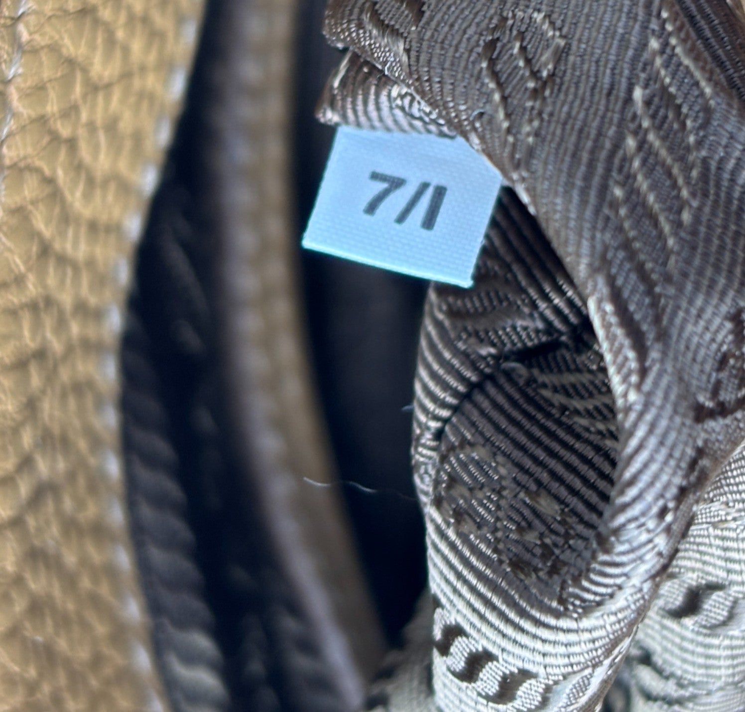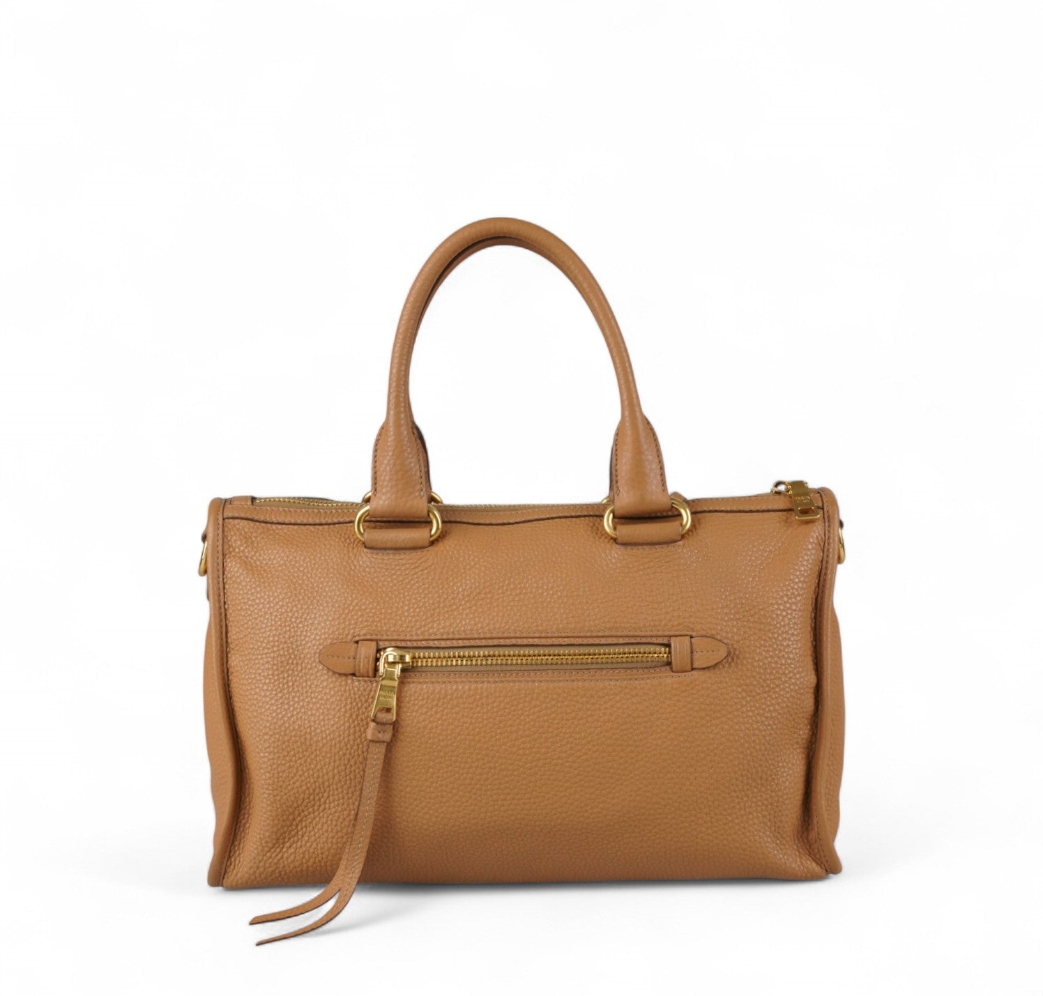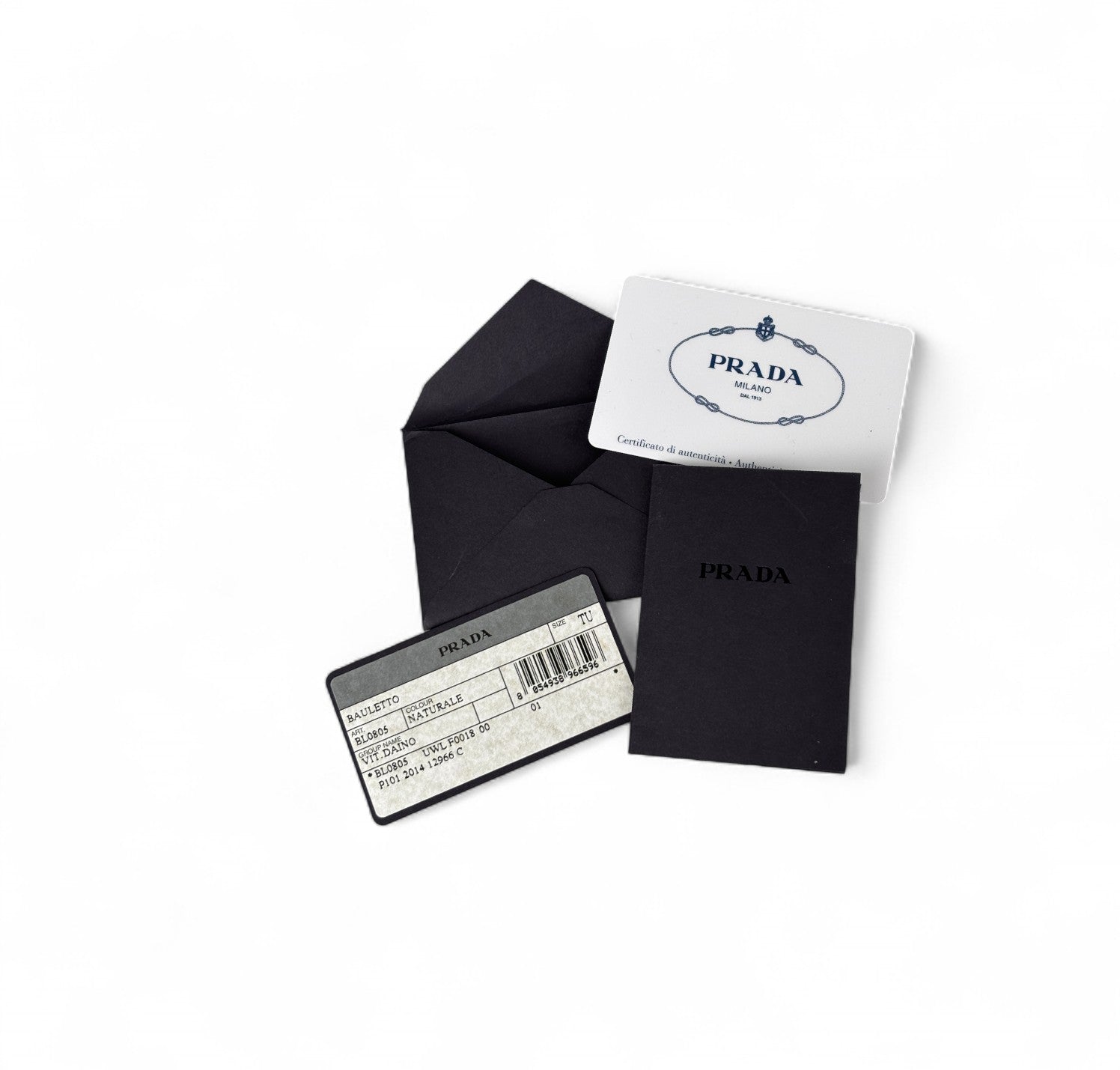 Borsa Prada, modello Bauletto Top Handle, realizzata in morbida pelle martellata Marrone Chiaro (indicata come Natural dal designer). Dotata di manici doppi per l'uso a mano. Chiusura superiore con zip, tasca frontale esterna e inserto portanome coordinato. Interno spazioso, foderato con tessuto logato e dotato di tasca con zip. Logo Prada metallico in rilievo sul fronte. Modello pratico e perfetto per l’uso quotidiano. Lievi segni del tempo generali. No tracolla.
