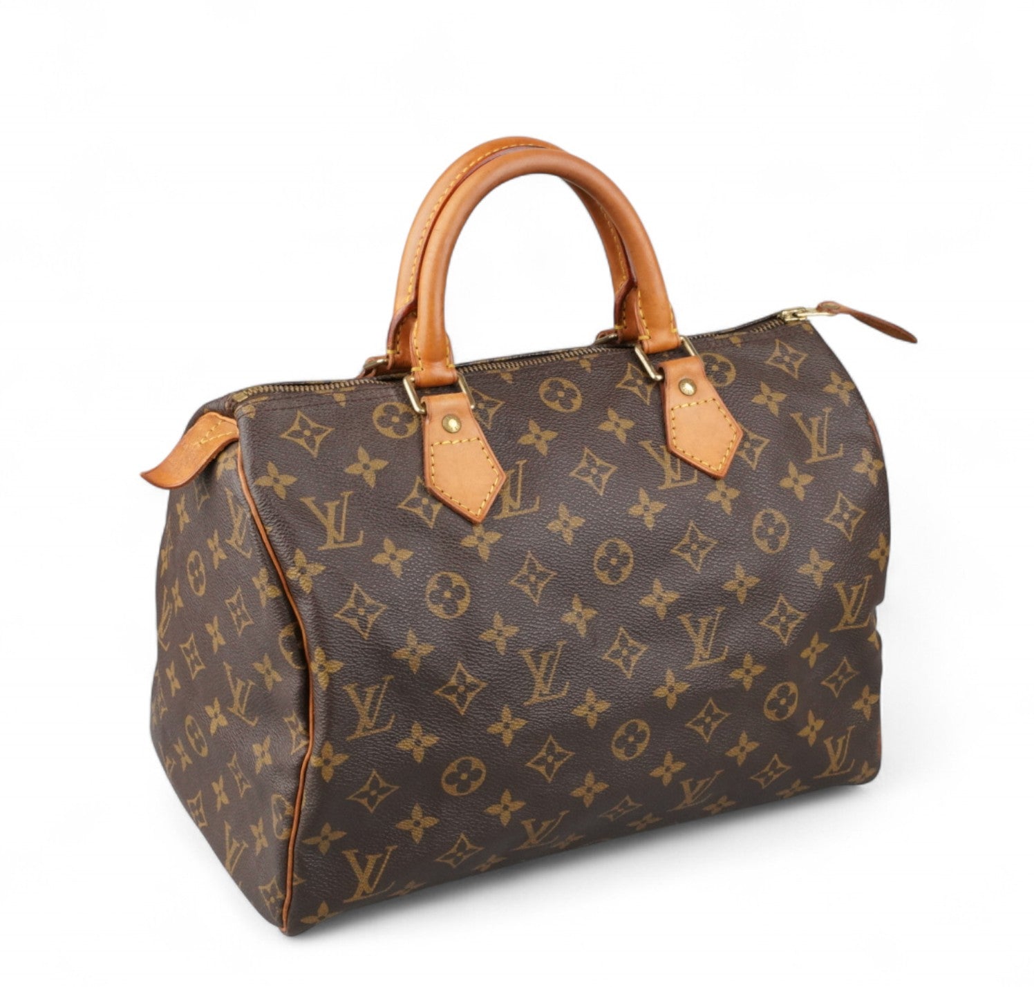 Borsa Louis Vuitton, modello Speedy, misura 30, realizzata in Tela Monogram. Finiture in Vacchetta naturale color Miele. Metalleria Ottone Dorato. Interno foderato in Tessuto, tasca a bustina. Chiusura superiore con cerniera e tirante. Doppi manici superiori per il trasporto a mano. Lievi segni del tempo generali. Leggeri segni al tirante. Aloni e segni d'uso su vacchetta, bordini, interno e generali. Segni d'uso alla metalleria.