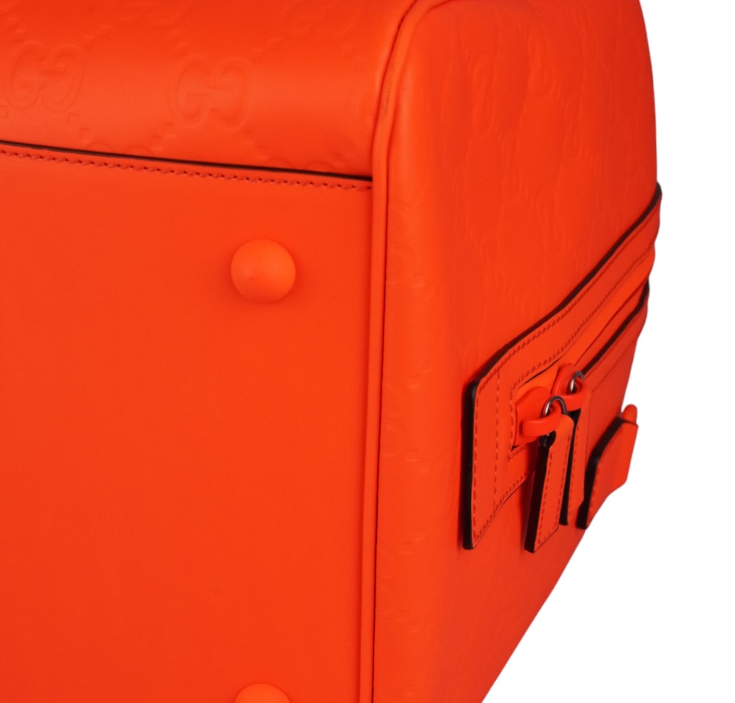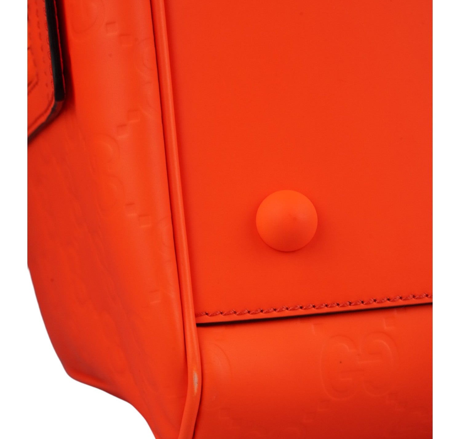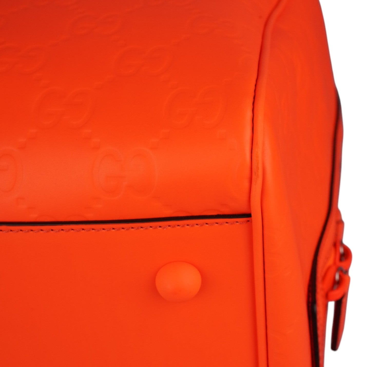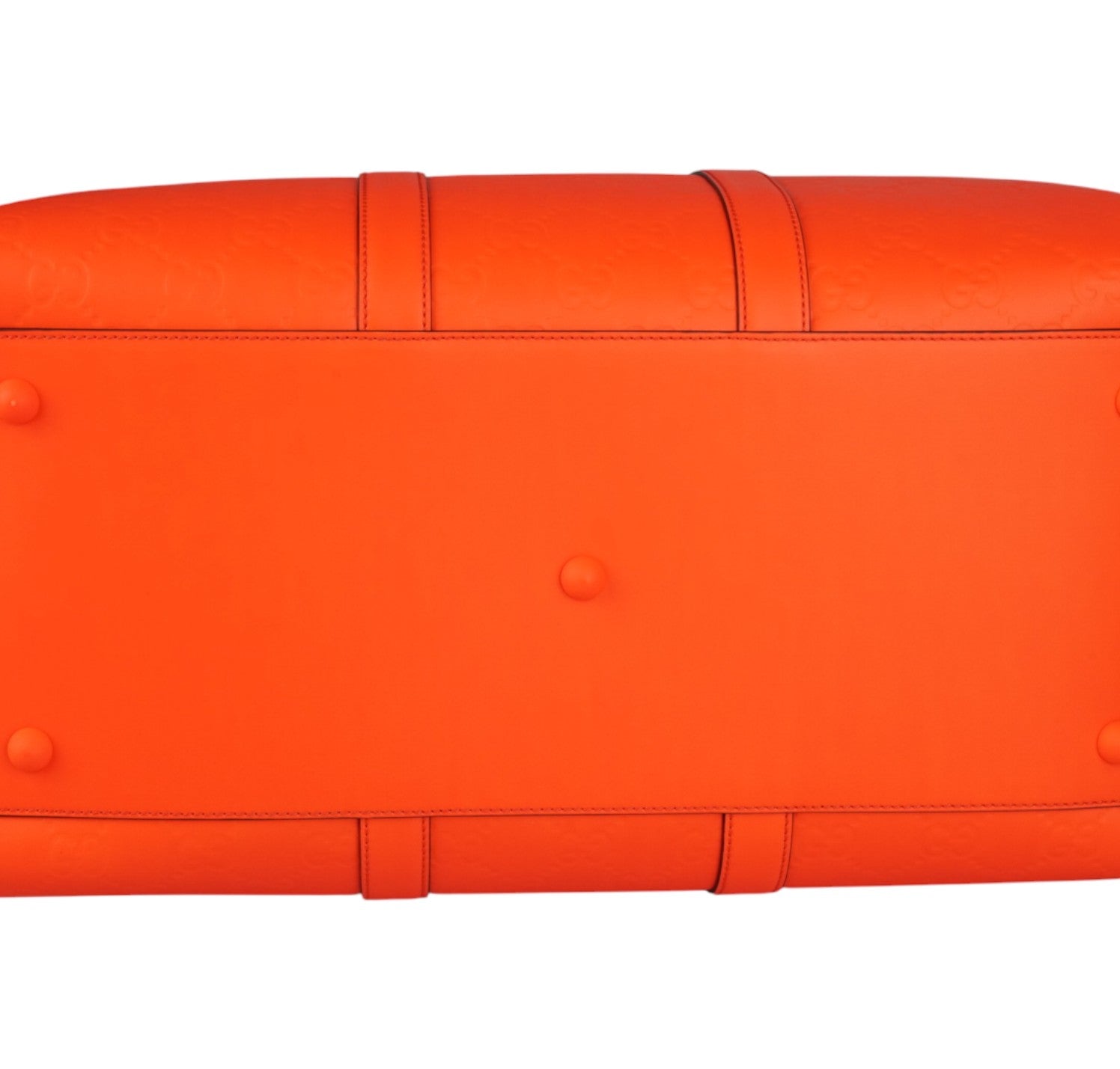 Borsa da viaggio Gucci della linea Edge, realizzata in materiale effetto Gomma Matte color Arancio Fluo, con motivo GG embossed tono su tono. La nuova linea richiama grinta ed energia ed offre un design essenziale in cui il materiale innovativo incontra flessibilità e stile che non passa inosservato. Dotata di manici arrotondati, tracolla regolabile in tessuto e inserti in pelle coordinata. Chiusura superiore con zip, base dotata di piedini protettivi. Interno ampio e funzionale. Ideale per chi è alla ricerca di un mix tra sportività, carattere intenso e personalità distintiva. L'articolo è inutilizzato ma presenta segni di stoccaggio alla base.