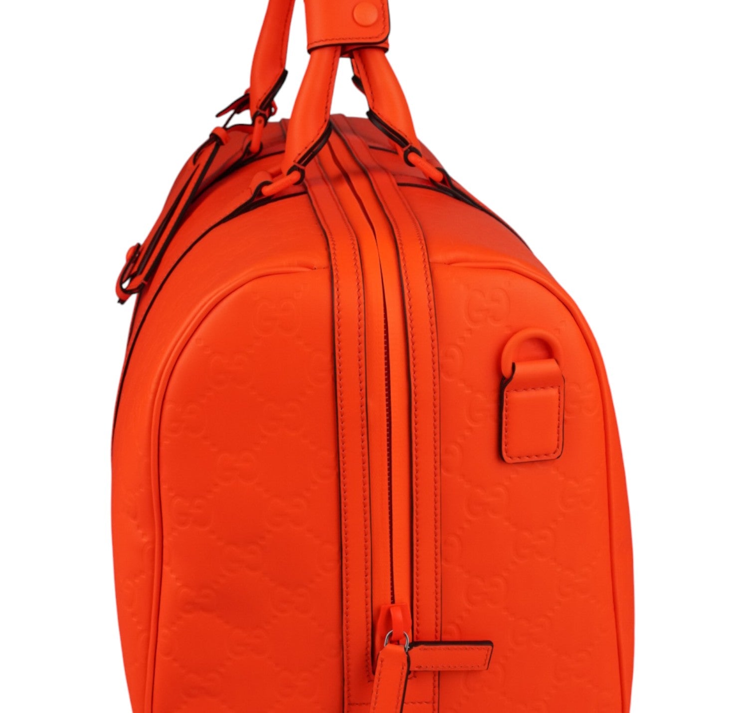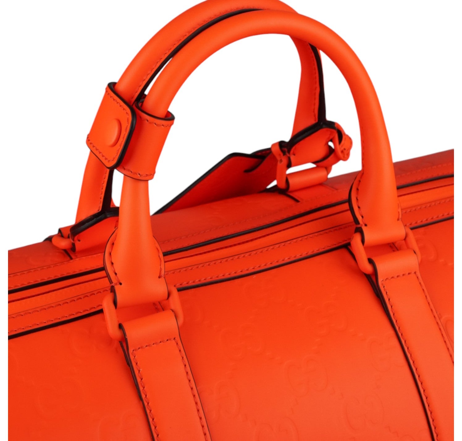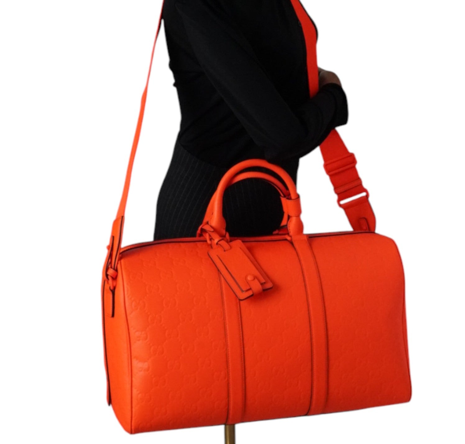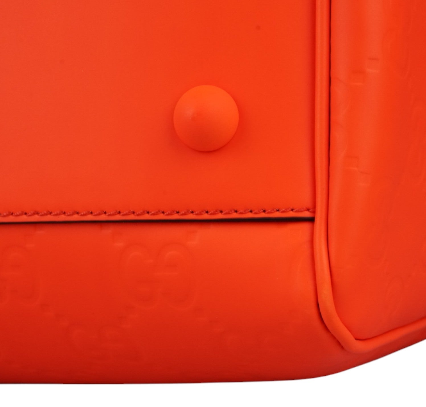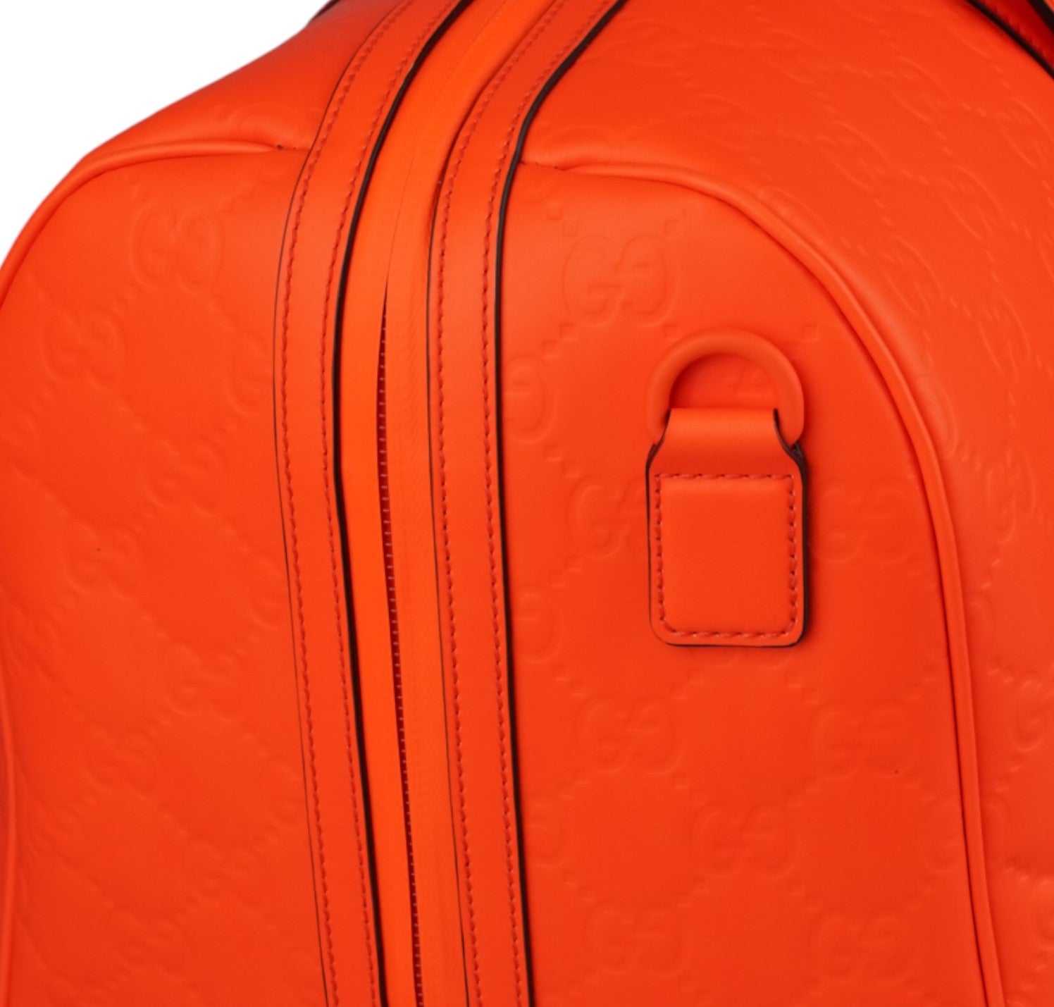 Borsa da viaggio Gucci della linea Edge, realizzata in materiale effetto Gomma Matte color Arancio Fluo, con motivo GG embossed tono su tono. La nuova linea richiama grinta ed energia ed offre un design essenziale in cui il materiale innovativo incontra flessibilità e stile che non passa inosservato. Dotata di manici arrotondati, tracolla regolabile in tessuto e inserti in pelle coordinata. Chiusura superiore con zip, base dotata di piedini protettivi. Interno ampio e funzionale. Ideale per chi è alla ricerca di un mix tra sportività, carattere intenso e personalità distintiva. L'articolo è inutilizzato ma presenta segni di stoccaggio alla base.