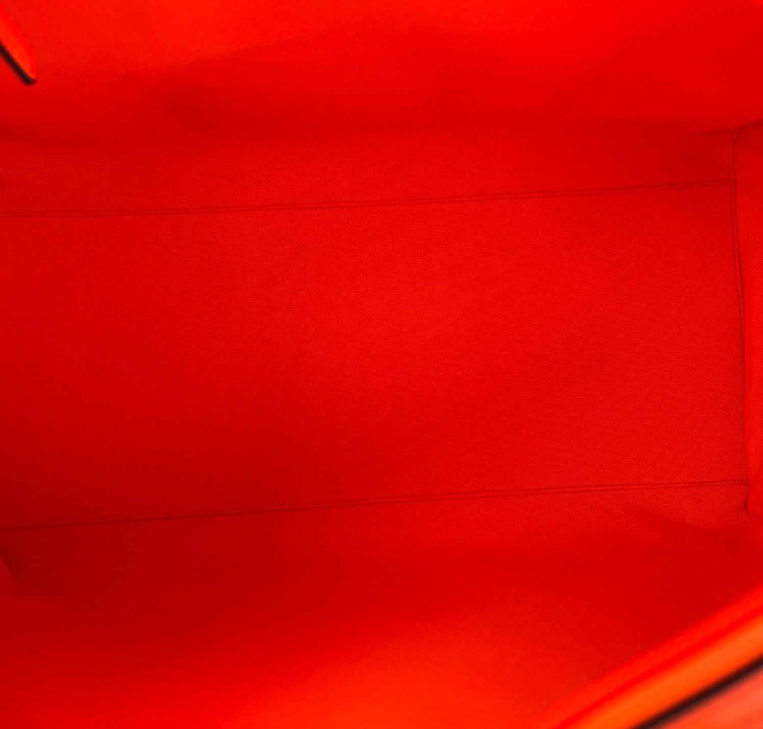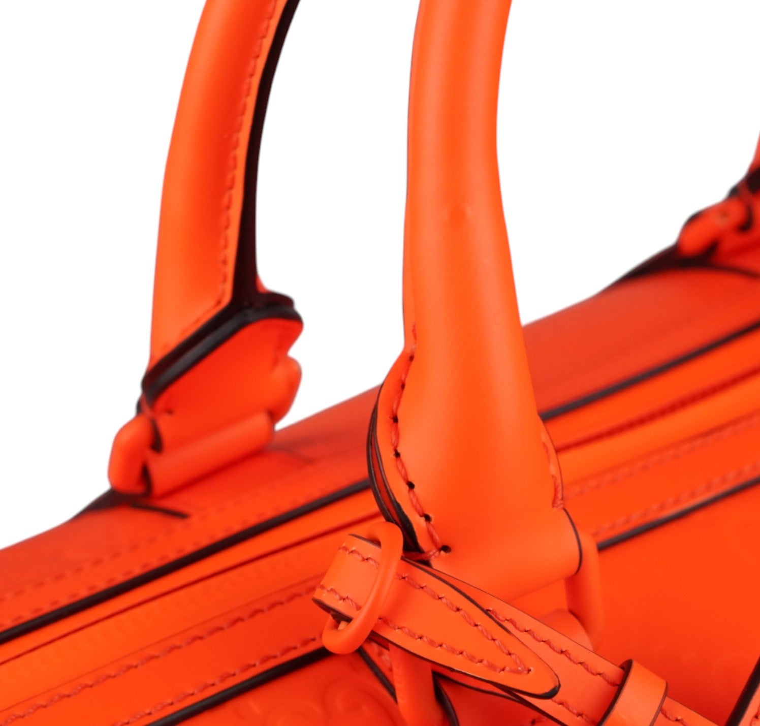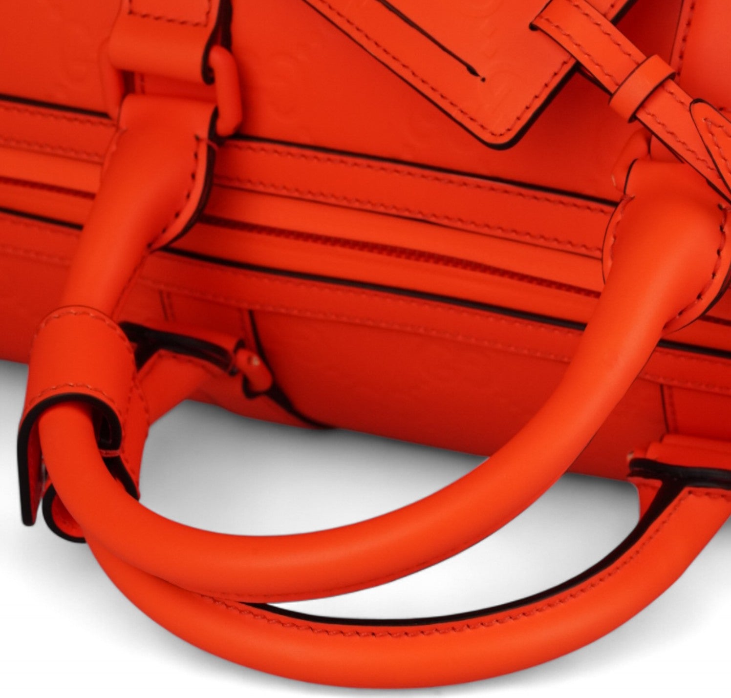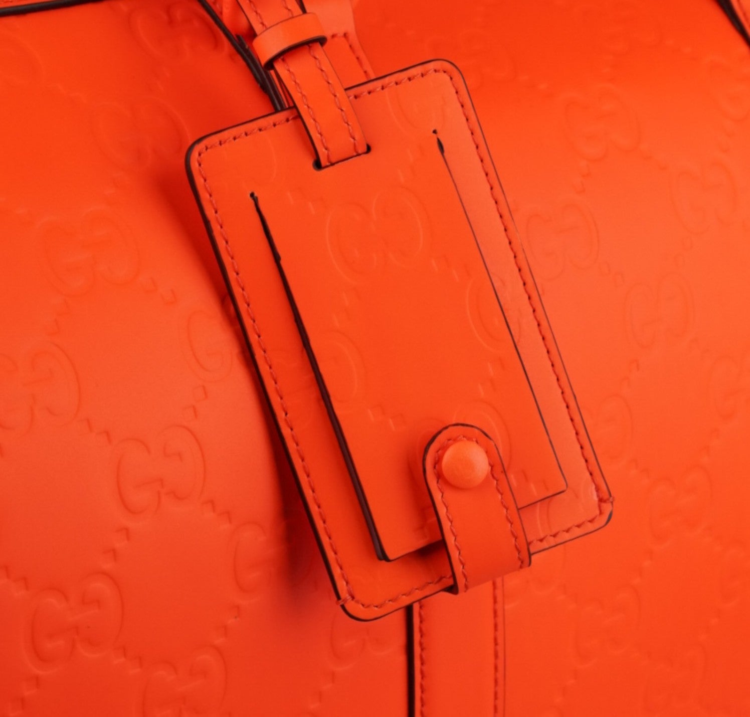 Borsa da viaggio Gucci della linea Edge, realizzata in materiale effetto Gomma Matte color Arancio Fluo, con motivo GG embossed tono su tono. La nuova linea richiama grinta ed energia ed offre un design essenziale in cui il materiale innovativo incontra flessibilità e stile che non passa inosservato. Dotata di manici arrotondati, tracolla regolabile in tessuto e inserti in pelle coordinata. Chiusura superiore con zip, base dotata di piedini protettivi. Interno ampio e funzionale. Ideale per chi è alla ricerca di un mix tra sportività, carattere intenso e personalità distintiva. L'articolo è inutilizzato ma presenta segni di stoccaggio alla base.