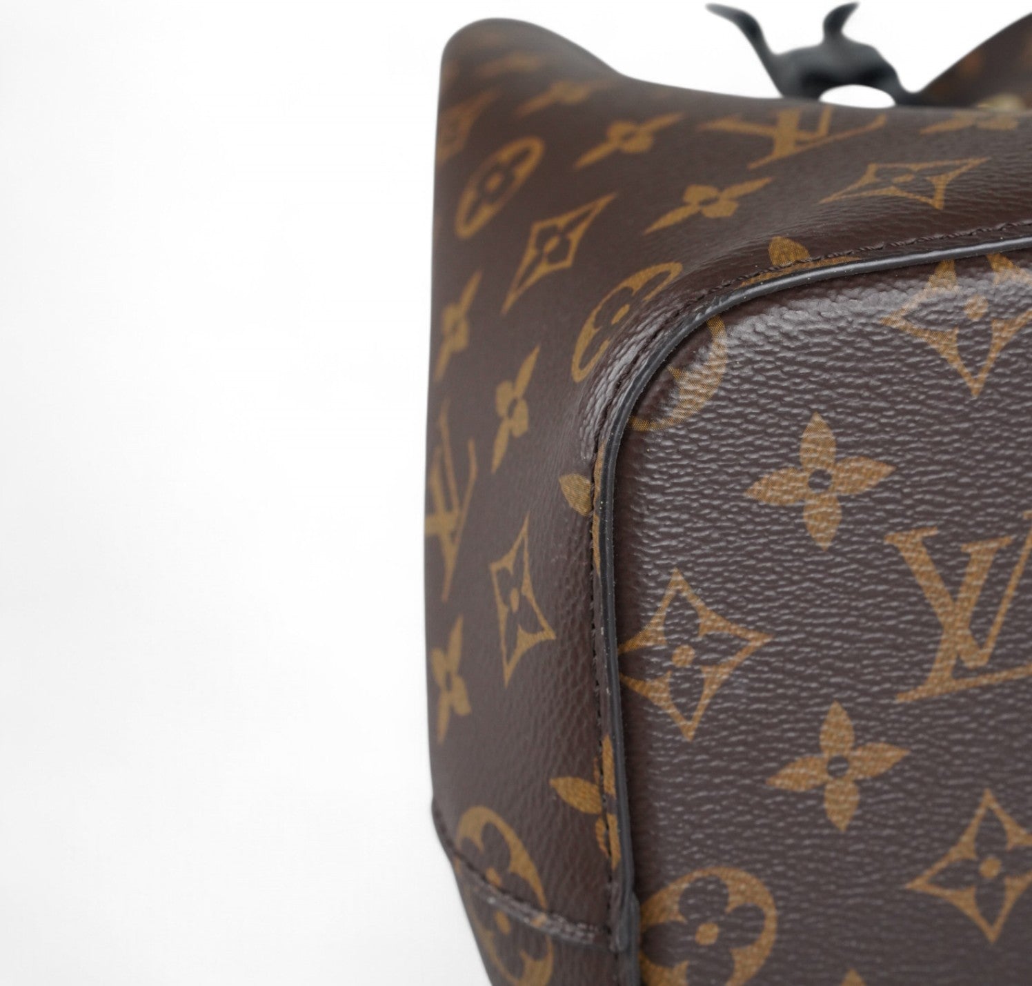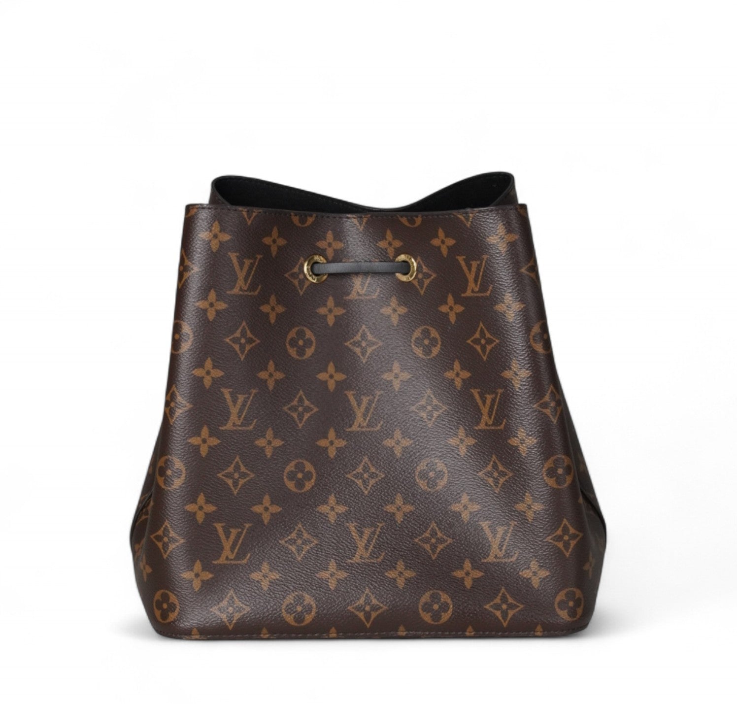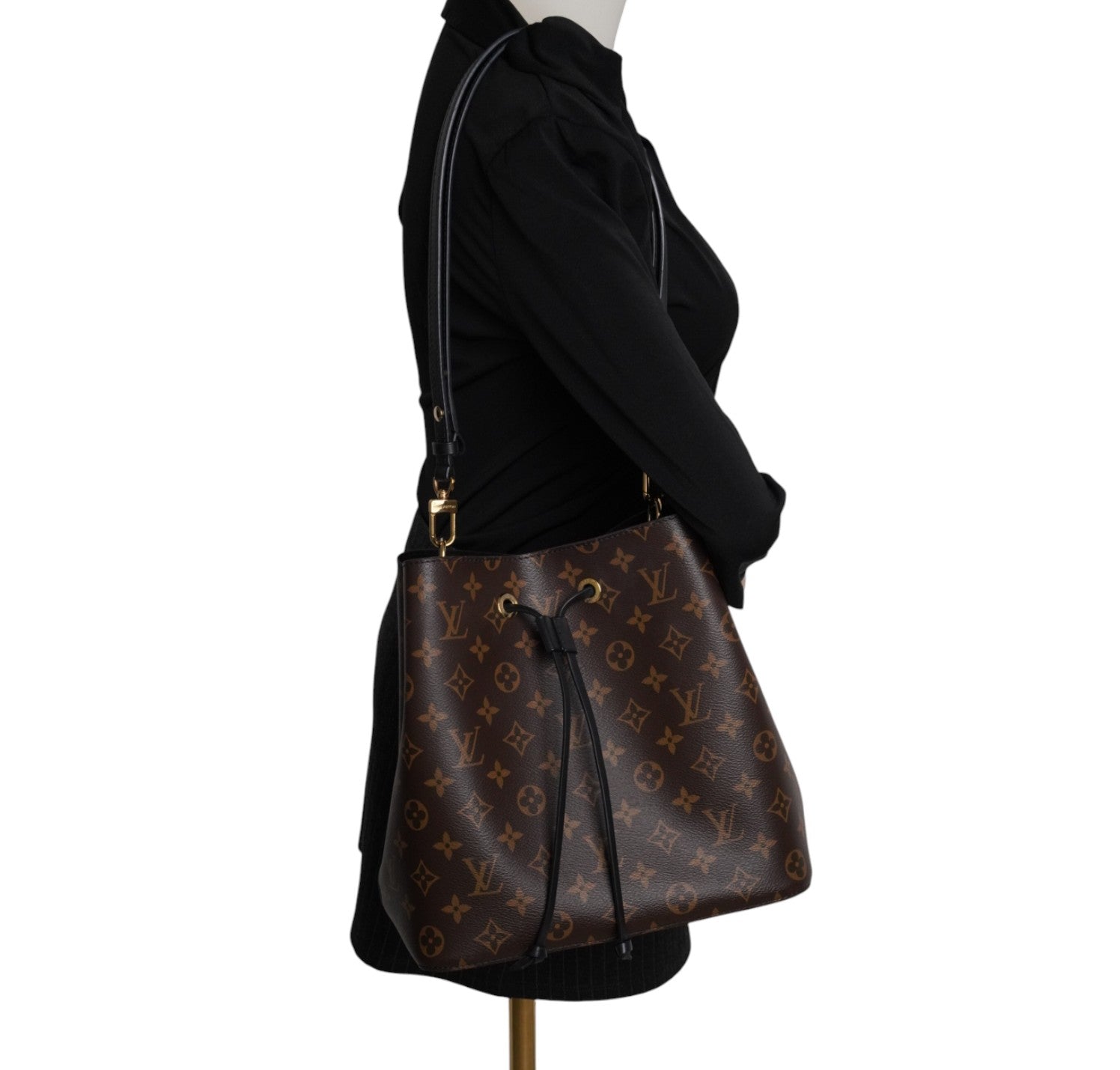 Louis Vuitton bucket bag, NéoNoé model, made of Monogram Canvas. Leather finishings Black . Gold Brass Hardware. Black microfiber lining, divided into two compartments by a flat central pocket with zip. Top closure with drawstring. Equipped with a removable and adjustable shoulder strap to customize its use. It is in excellent general condition, with minimal signs of aging.
