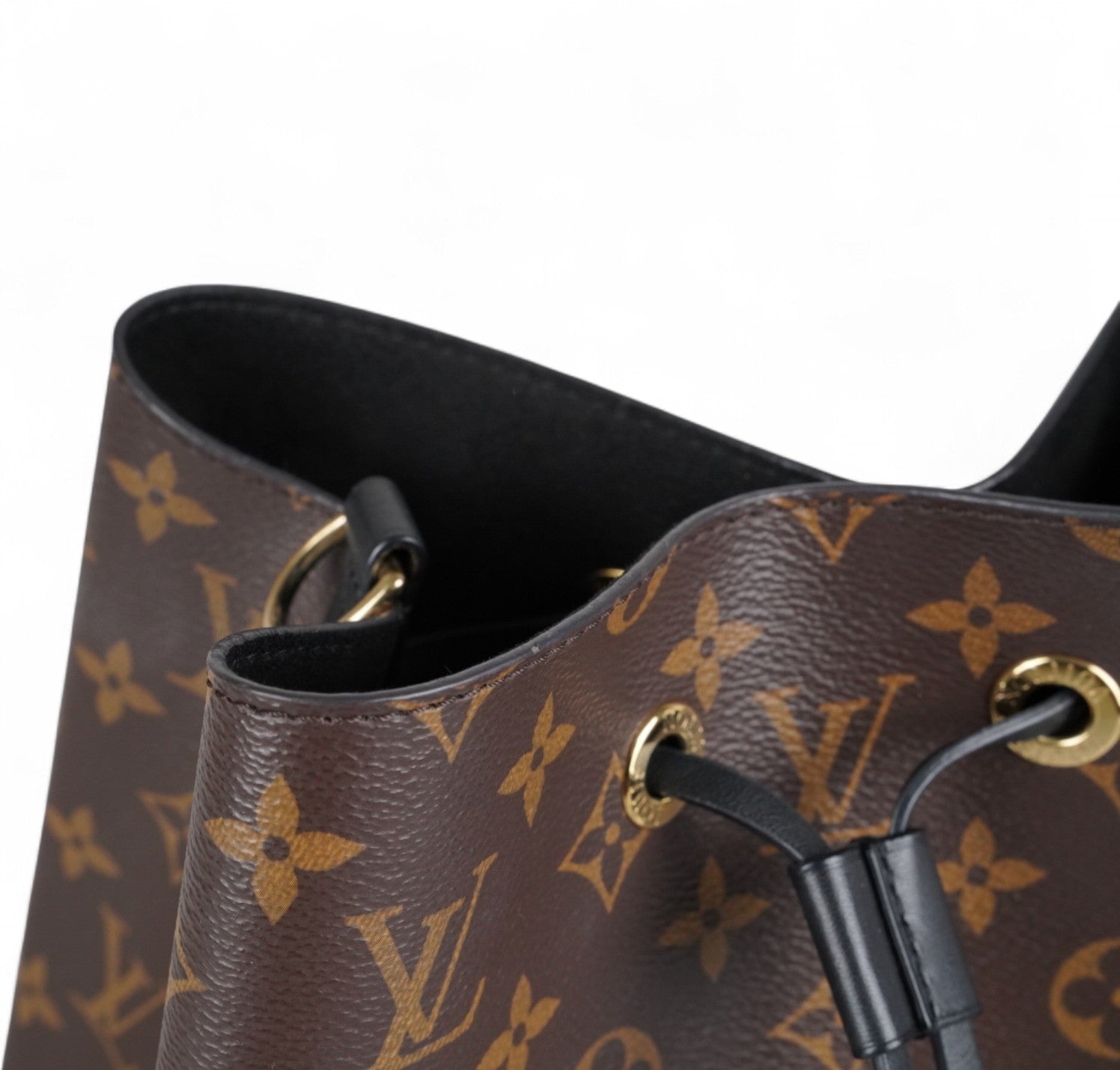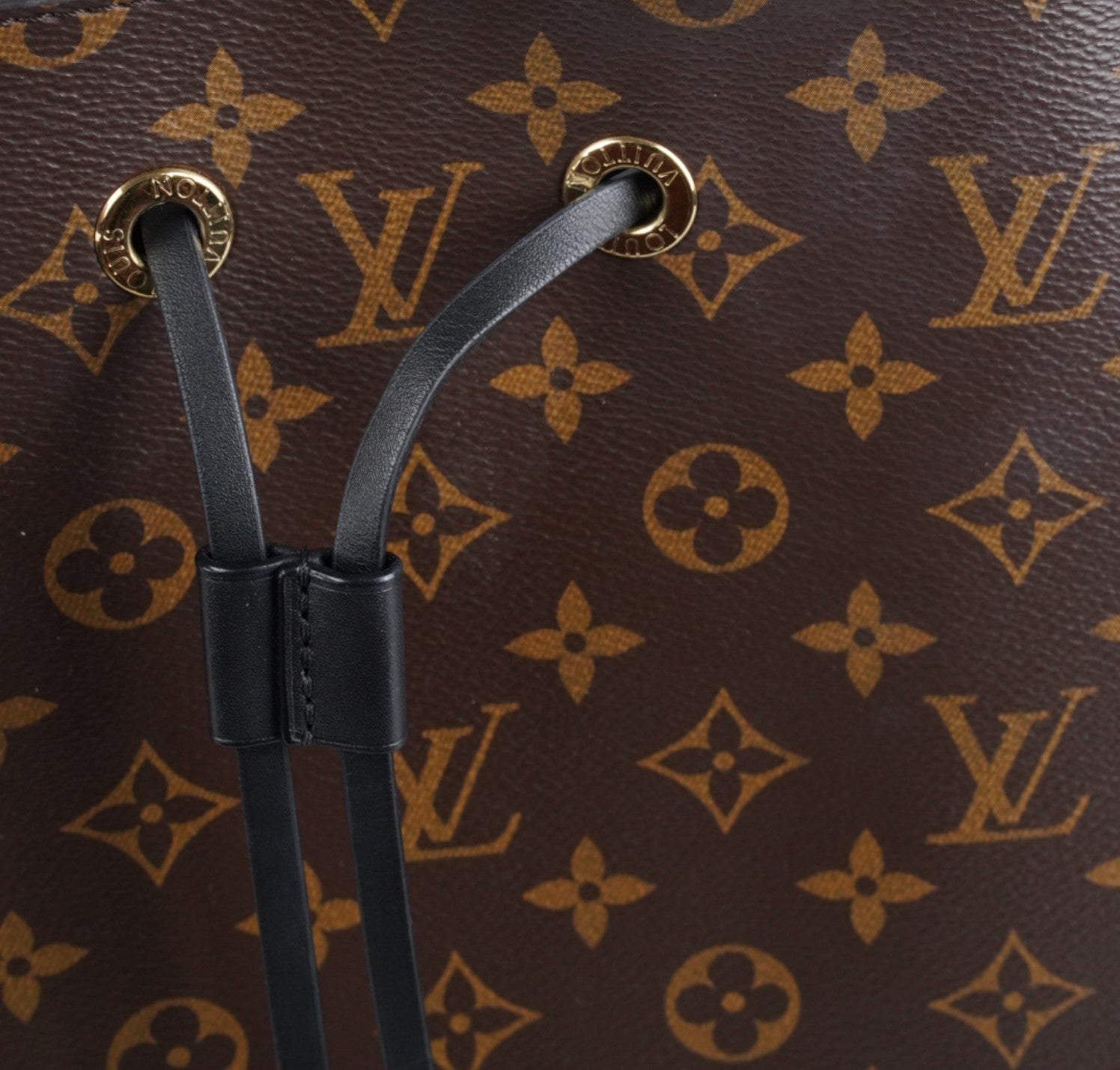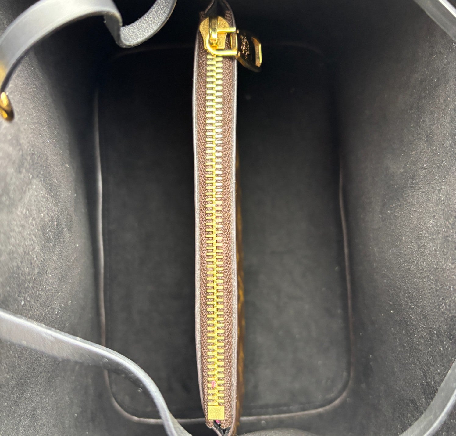 Louis Vuitton bucket bag, NéoNoé model, made of Monogram Canvas. Leather finishings Black . Gold Brass Hardware. Black microfiber lining, divided into two compartments by a flat central pocket with zip. Top closure with drawstring. Equipped with a removable and adjustable shoulder strap to customize its use. It is in excellent general condition, with minimal signs of aging.