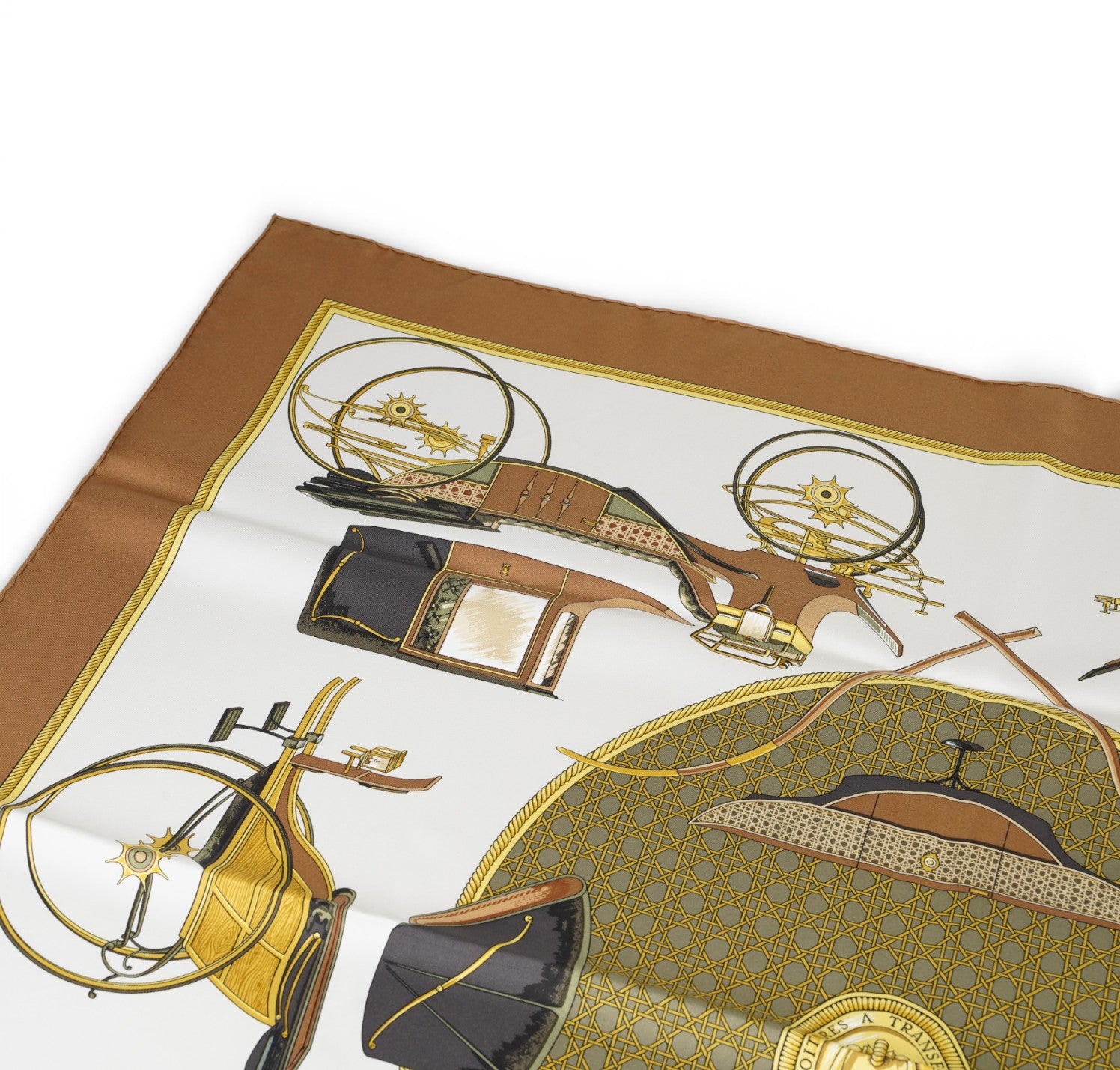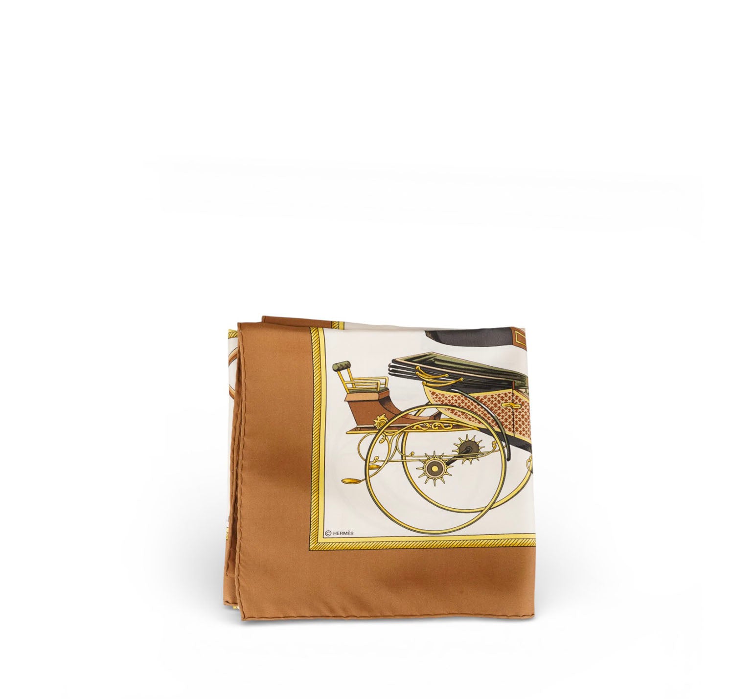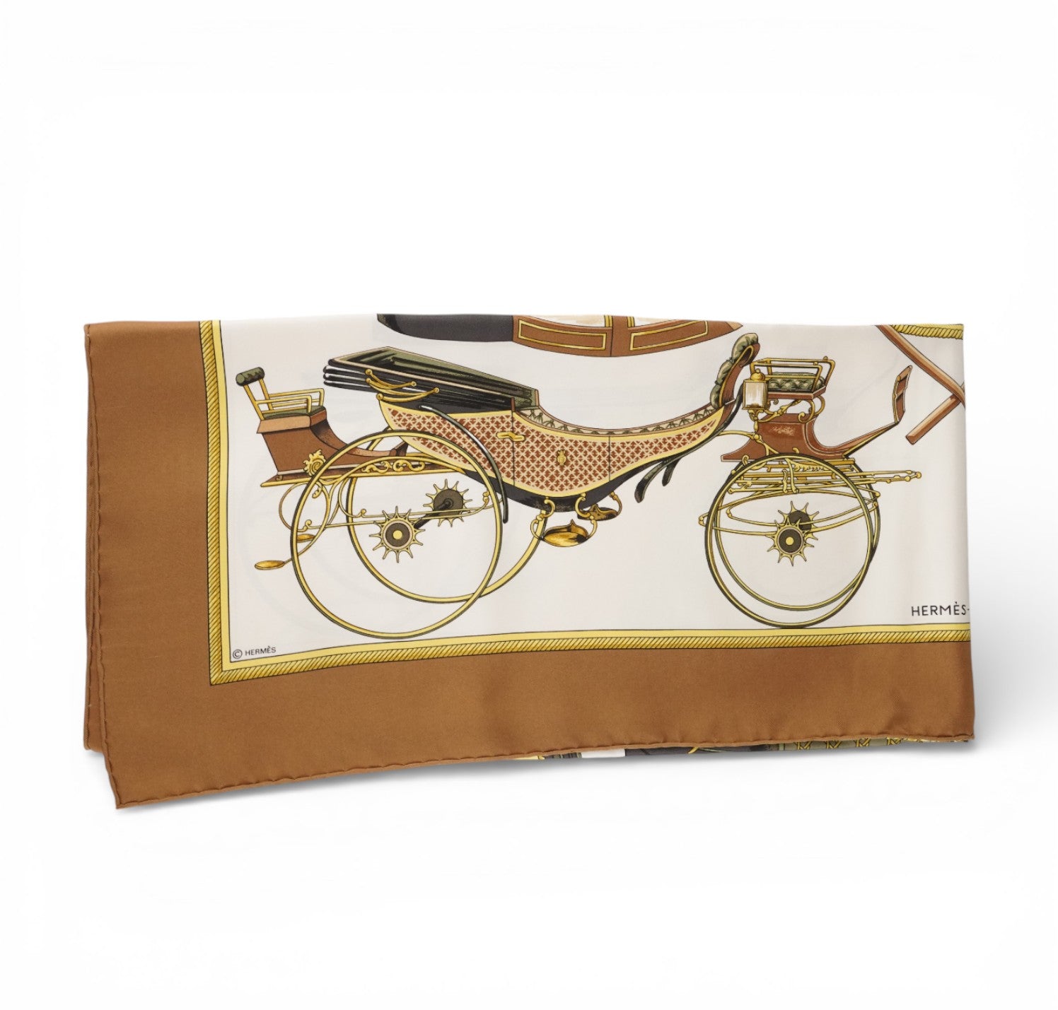 Foulard Hermès carré 90 in seta 100%, modello Les Voitures à Transformation, con stampa a tema carrozze ed elementi equesti nei toni del marrone, oro, beige e avorio, bordo a contrasto e finitura arrotolata a mano. Formato versatile perfetto da indossare al collo, sui capelli o come accessorio per borse. Condizioni eccellenti. Sottoposto già a pulizia a secco professionale, per delle condizioni pari al nuovo. Retail attuale: circa €450.