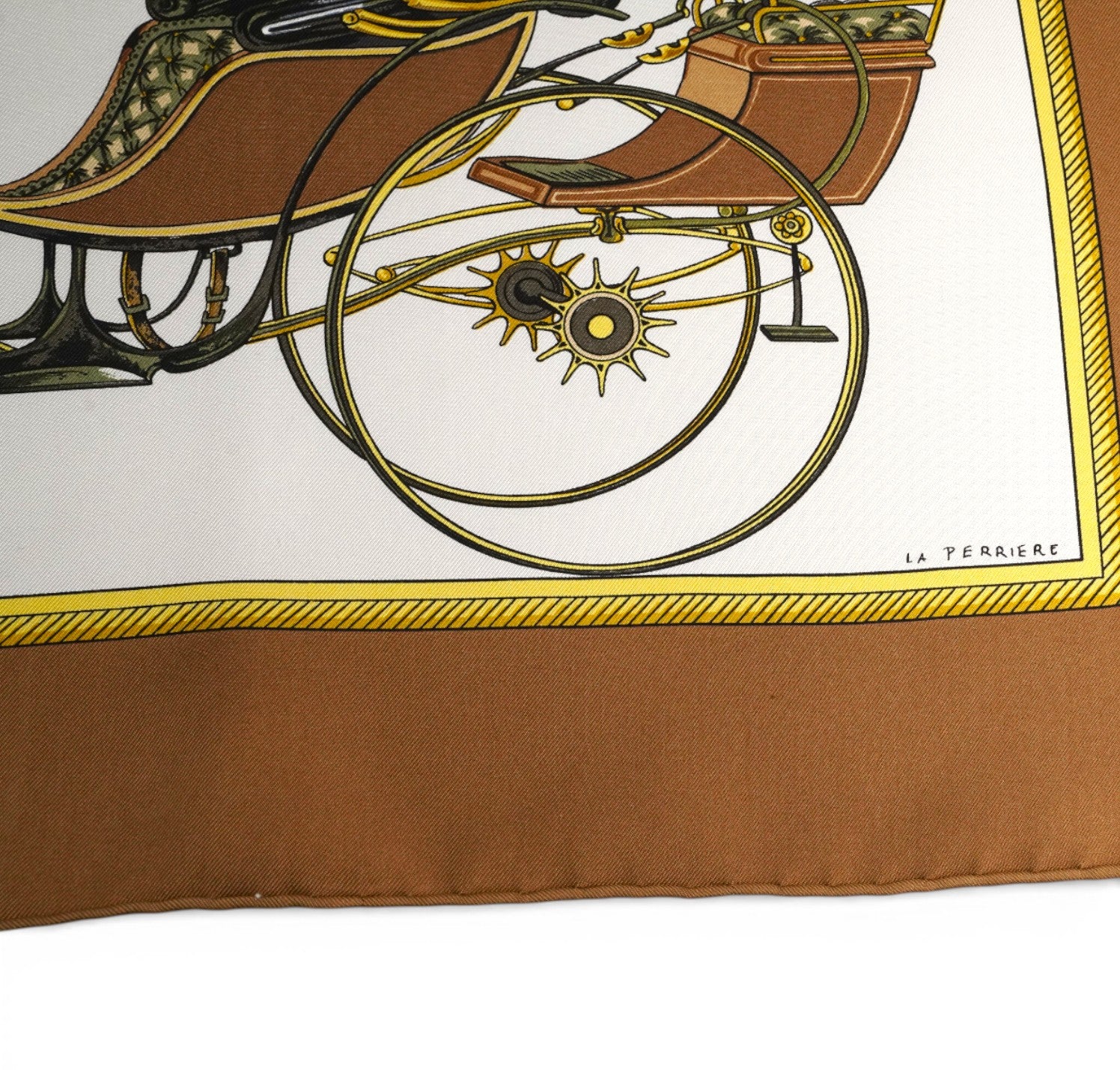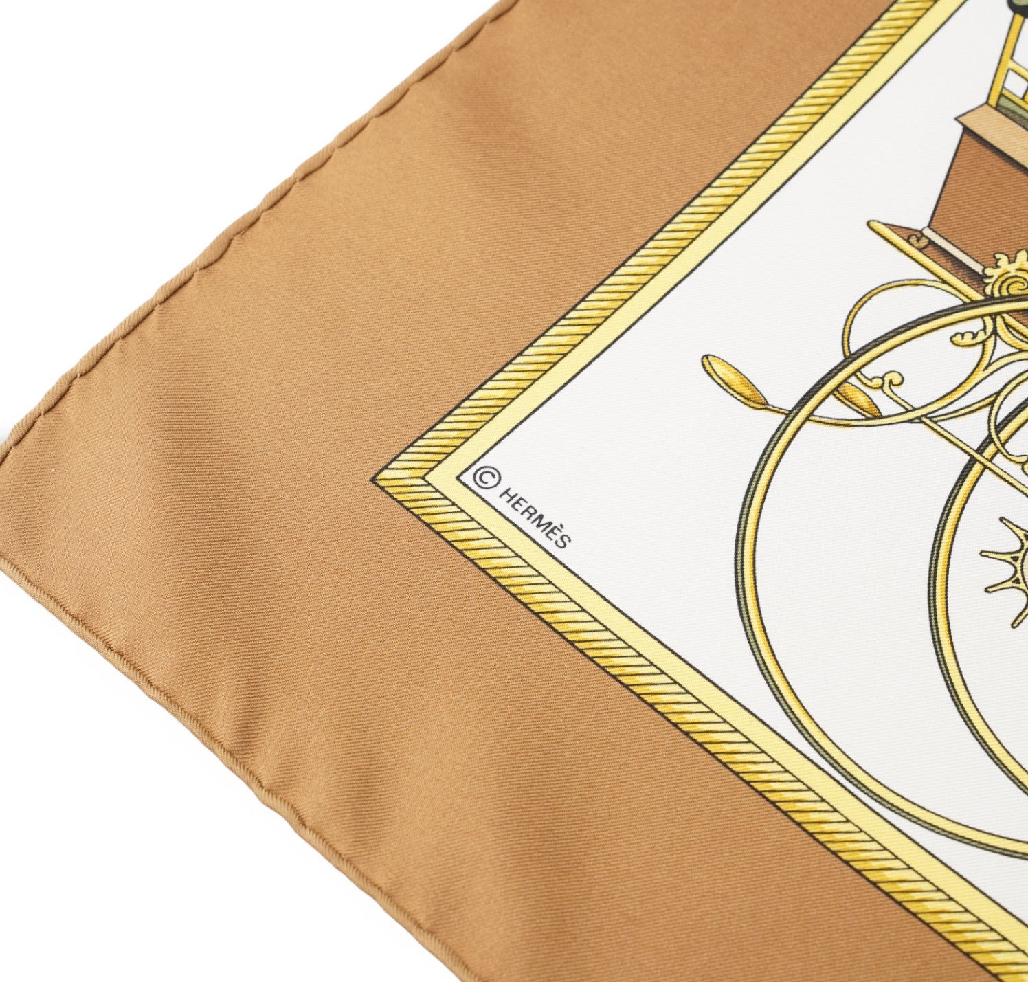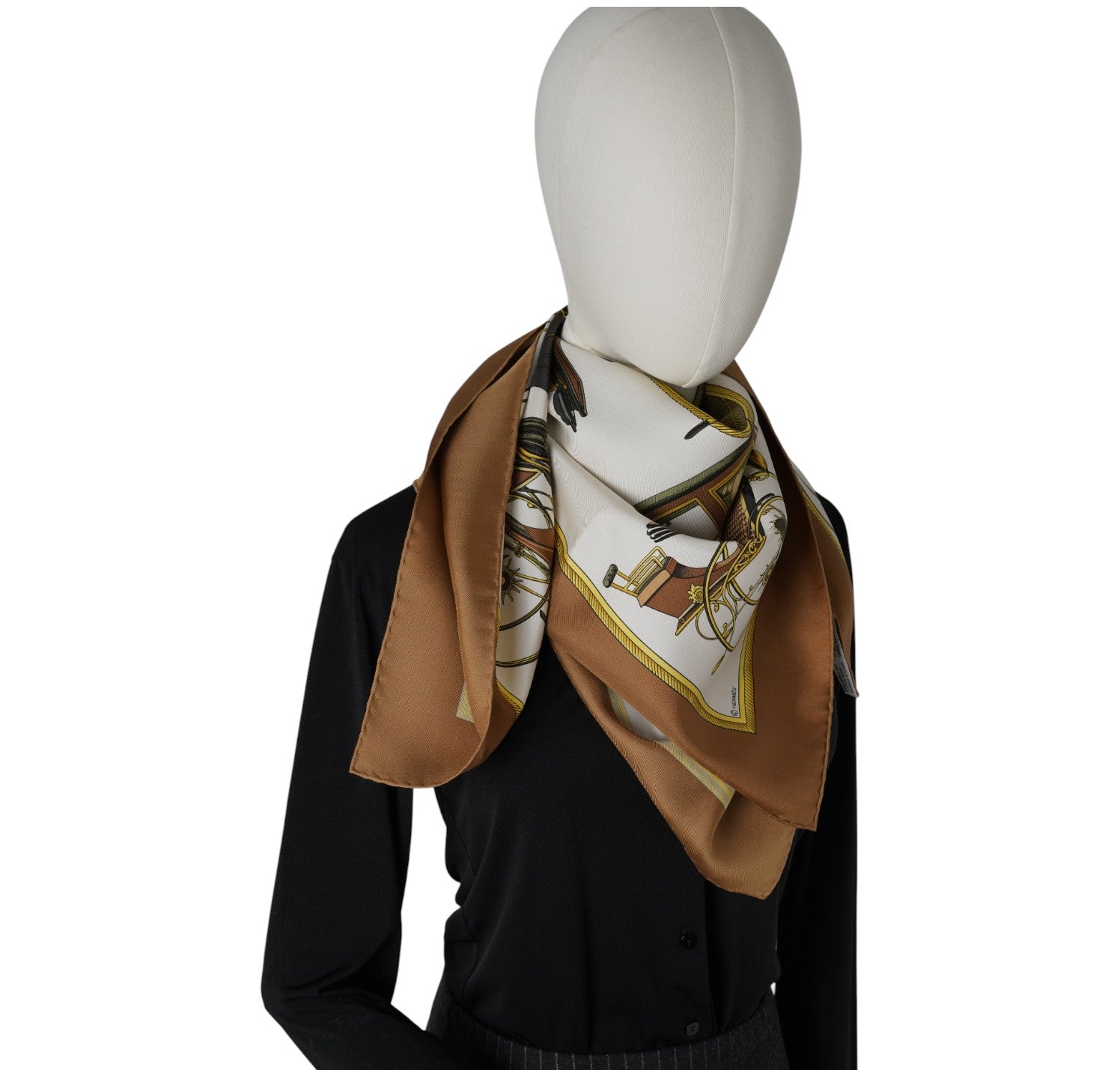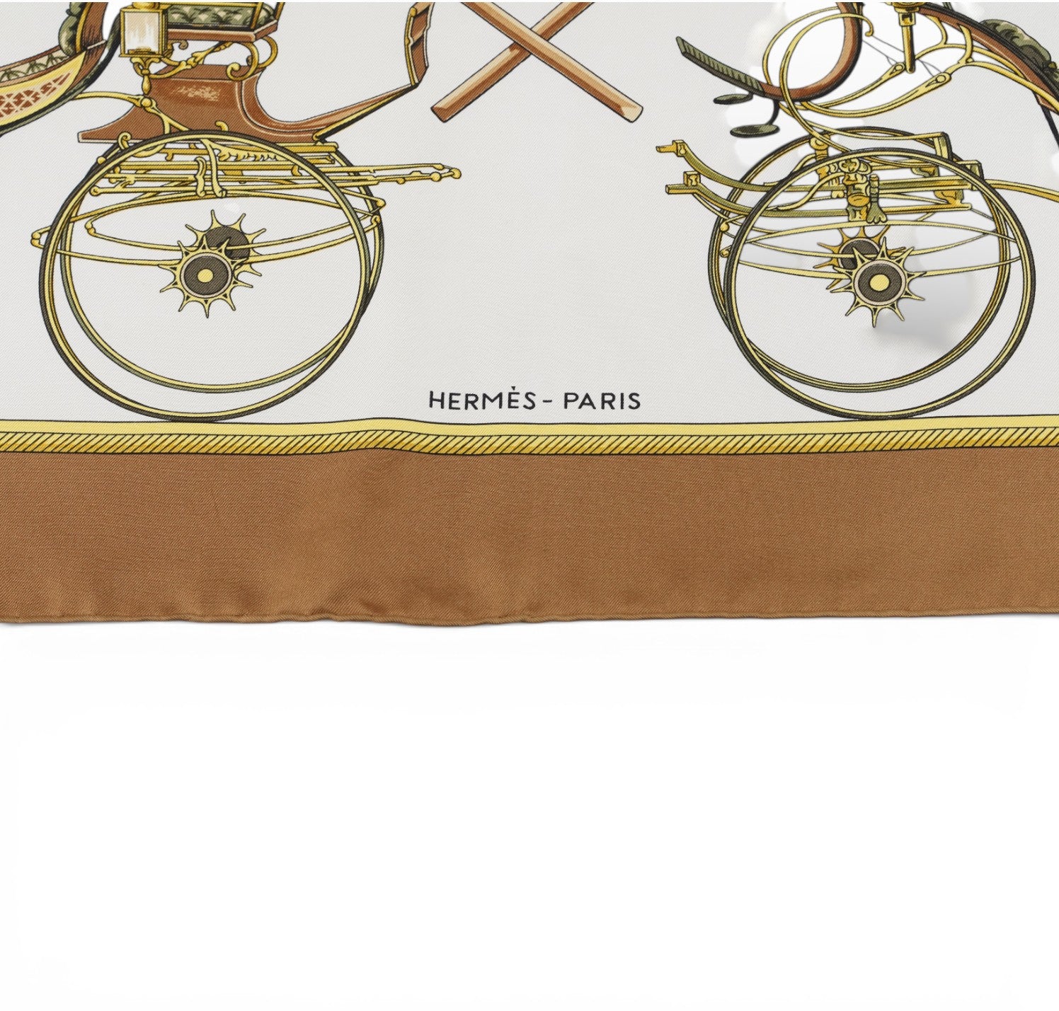 Foulard Hermès carré 90 in seta 100%, modello Les Voitures à Transformation, con stampa a tema carrozze ed elementi equesti nei toni del marrone, oro, beige e avorio, bordo a contrasto e finitura arrotolata a mano. Formato versatile perfetto da indossare al collo, sui capelli o come accessorio per borse. Condizioni eccellenti. Sottoposto già a pulizia a secco professionale, per delle condizioni pari al nuovo. Retail attuale: circa €450.